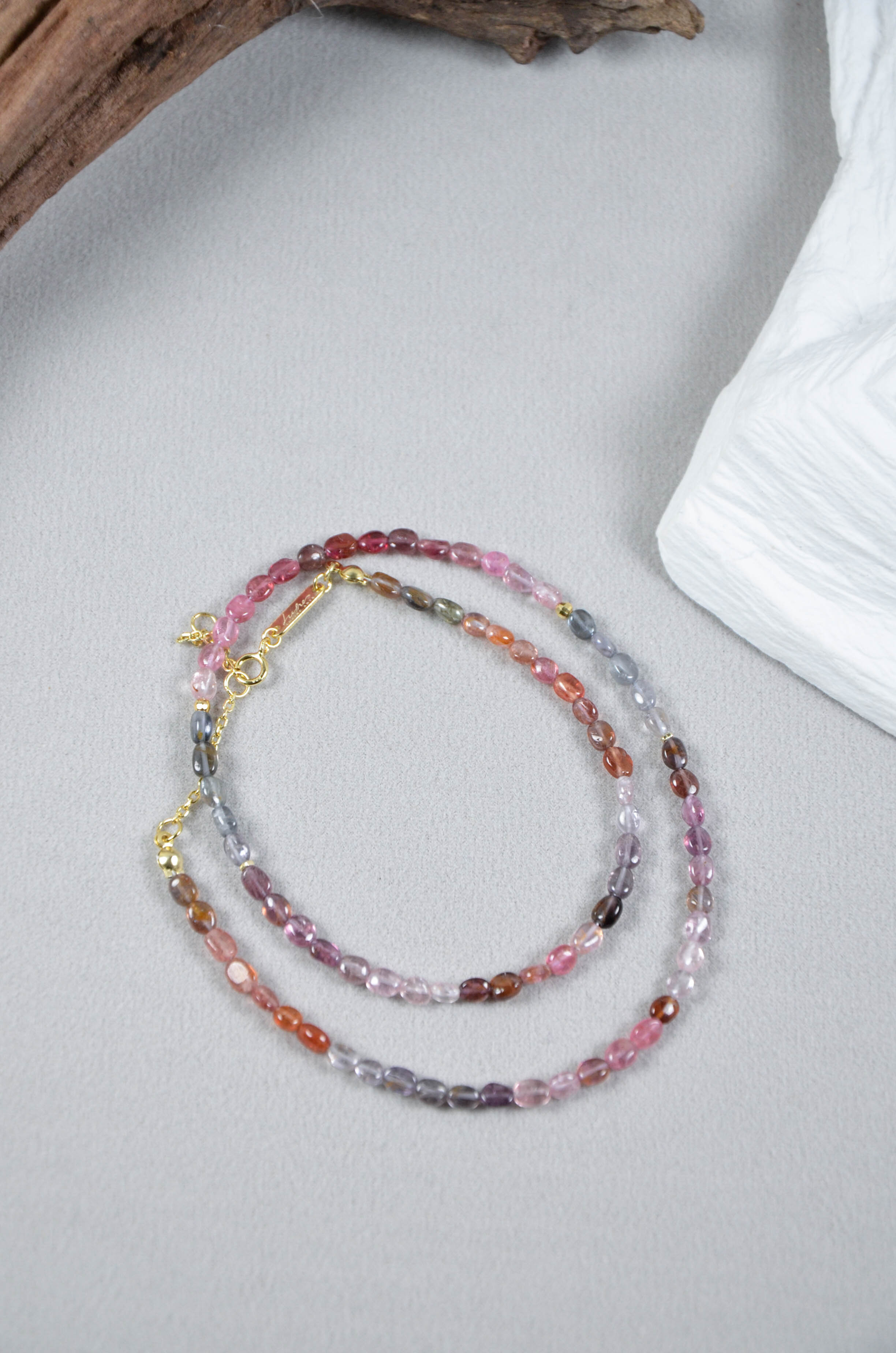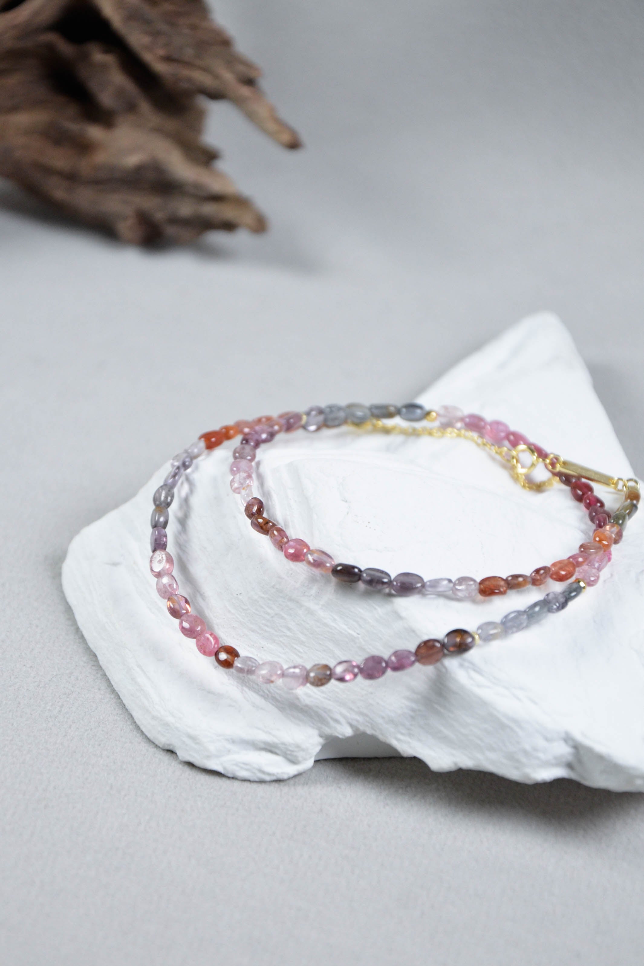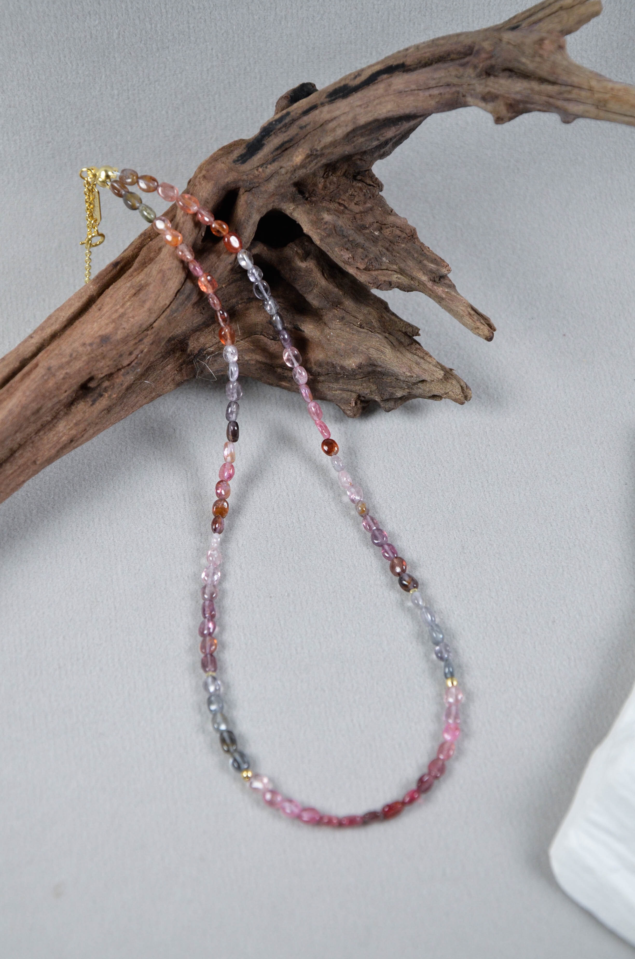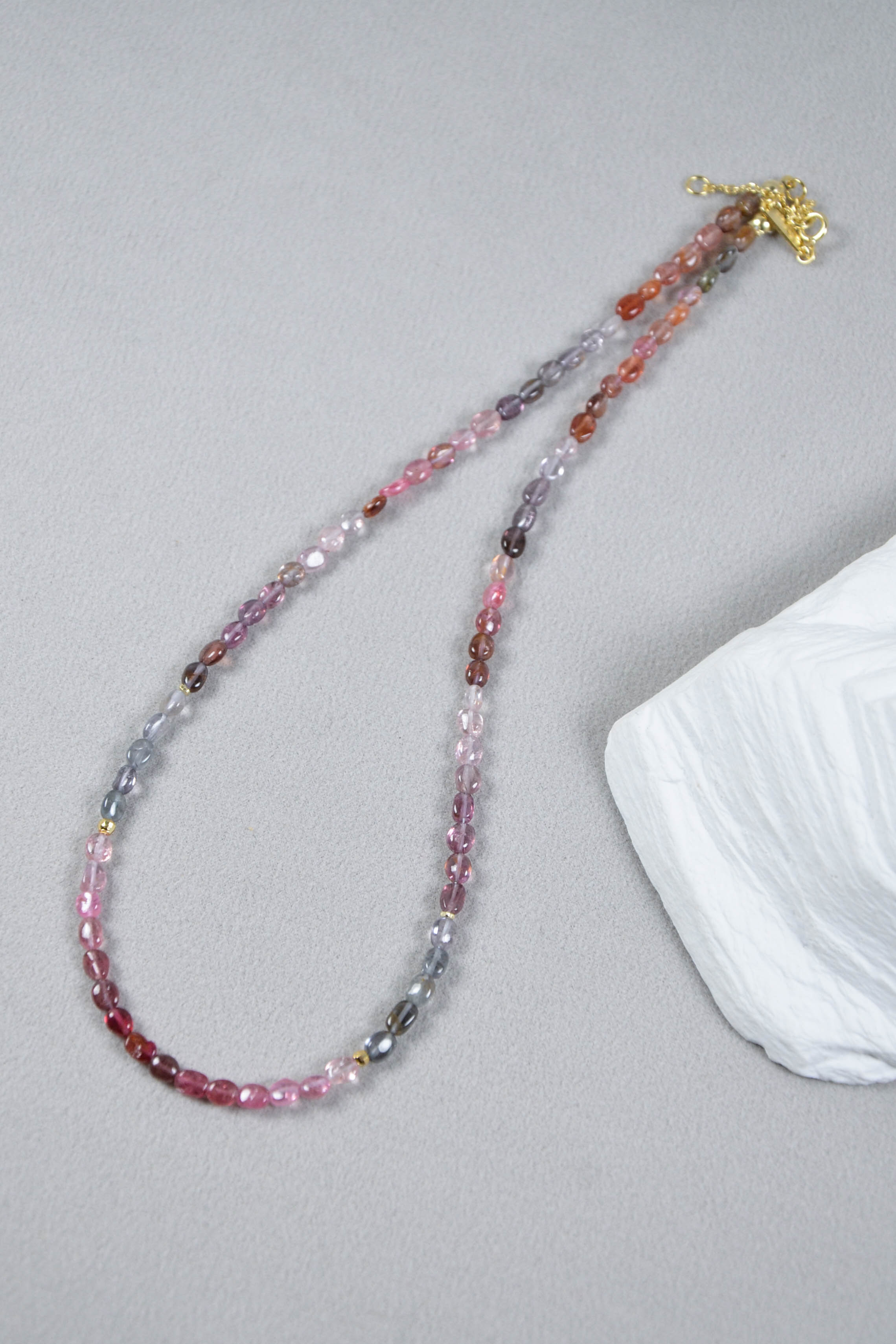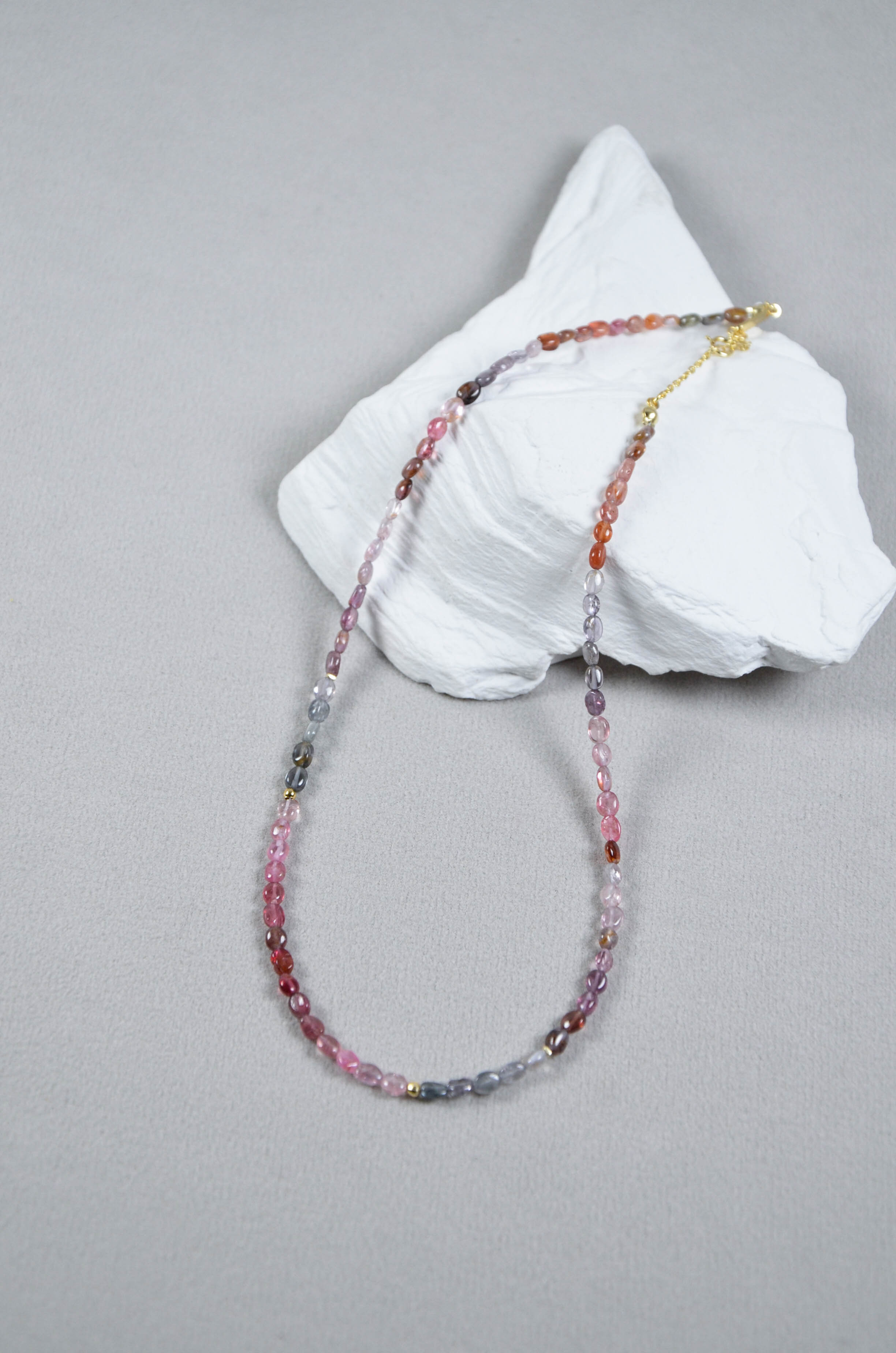 淡いピンクからグレー、パープル、レッドへと移ろうように彩られた、マルチカラースピネルのネックレス。ひと粒ごとに異なる色と透明感が織りなす表情は、まるで夕暮れの空や心の情景を映すかのようです。光の角度によって繊細にきらめき、身につけるたびに新しい表情を見せてくれます。
