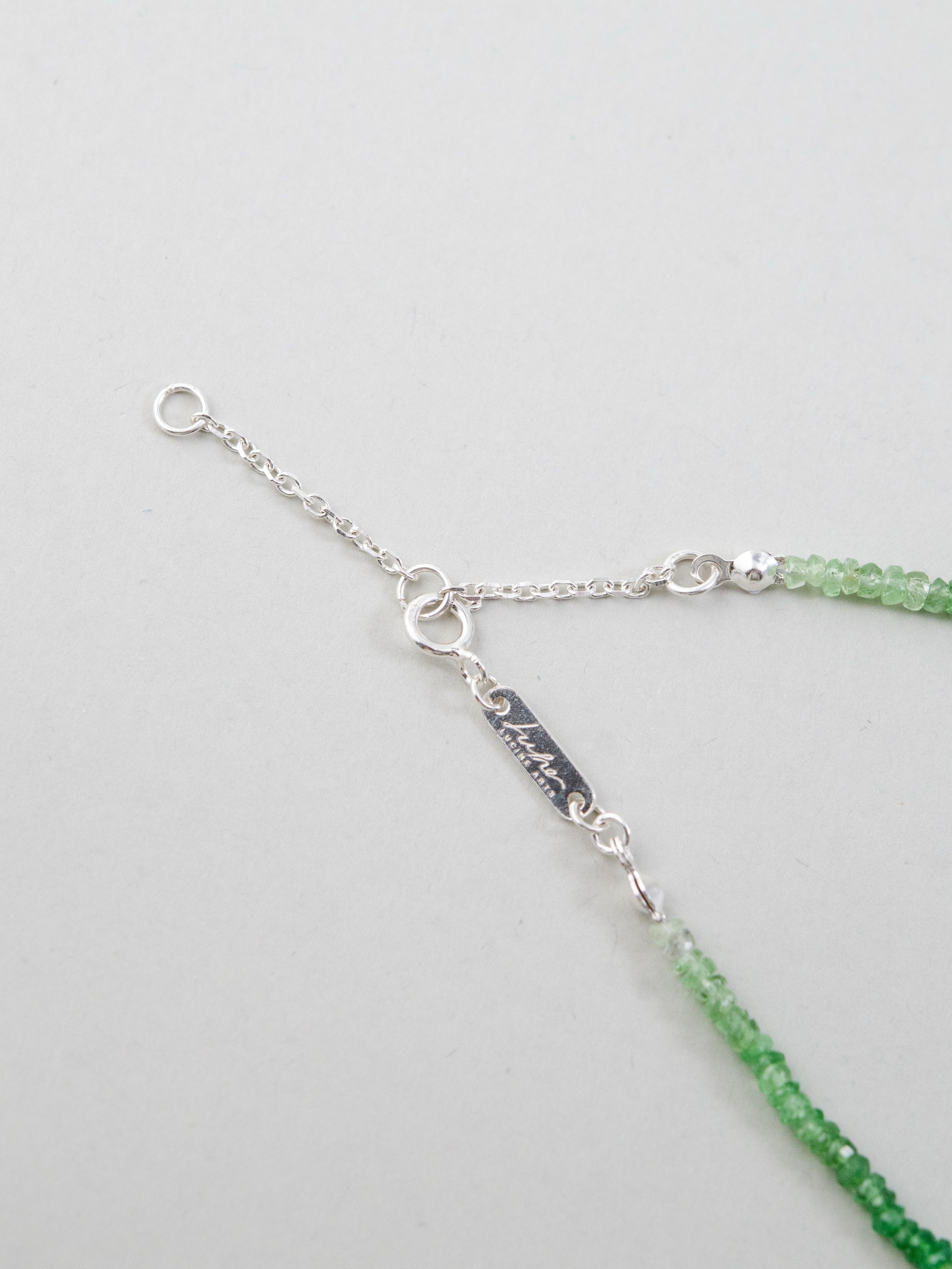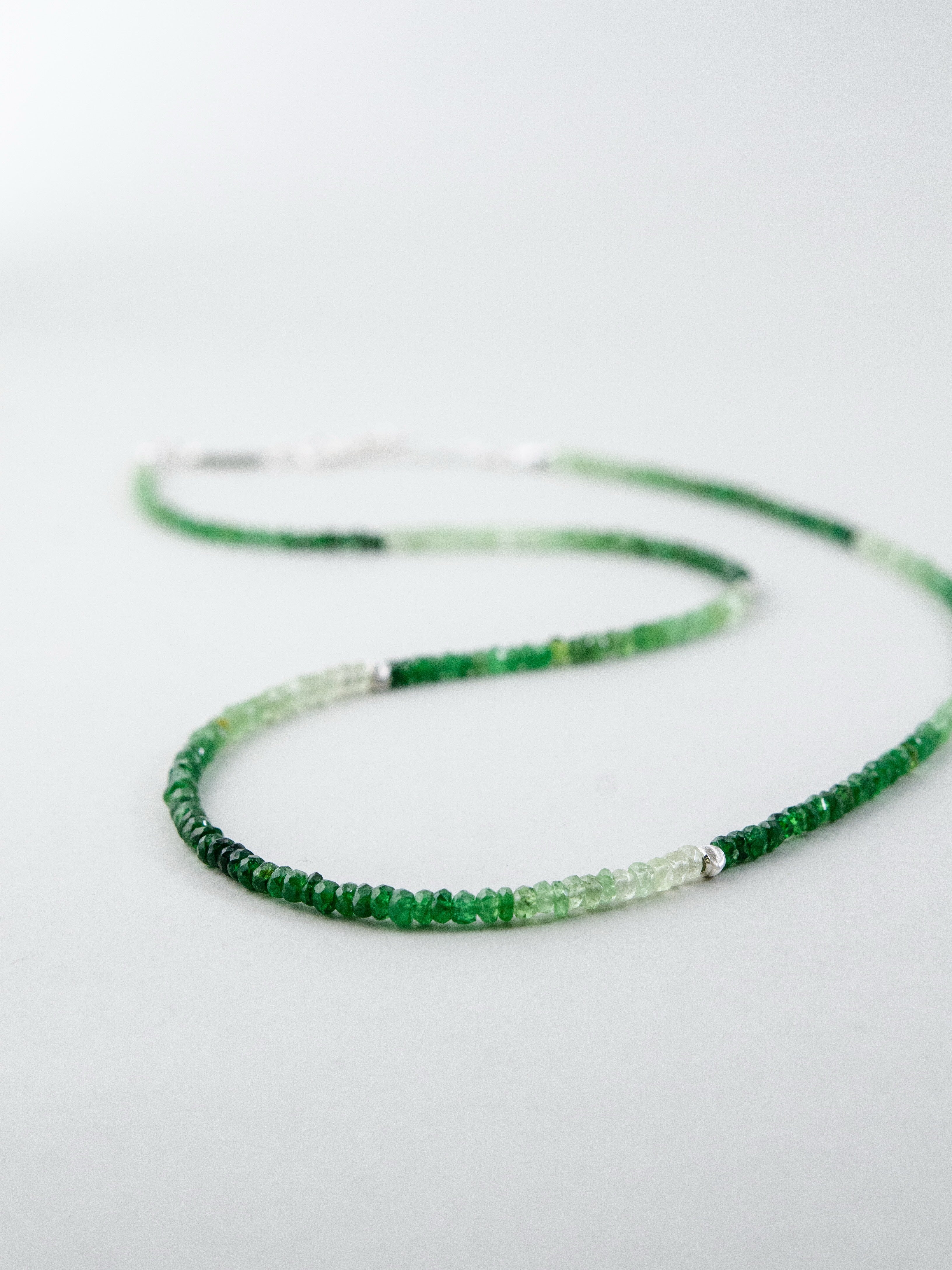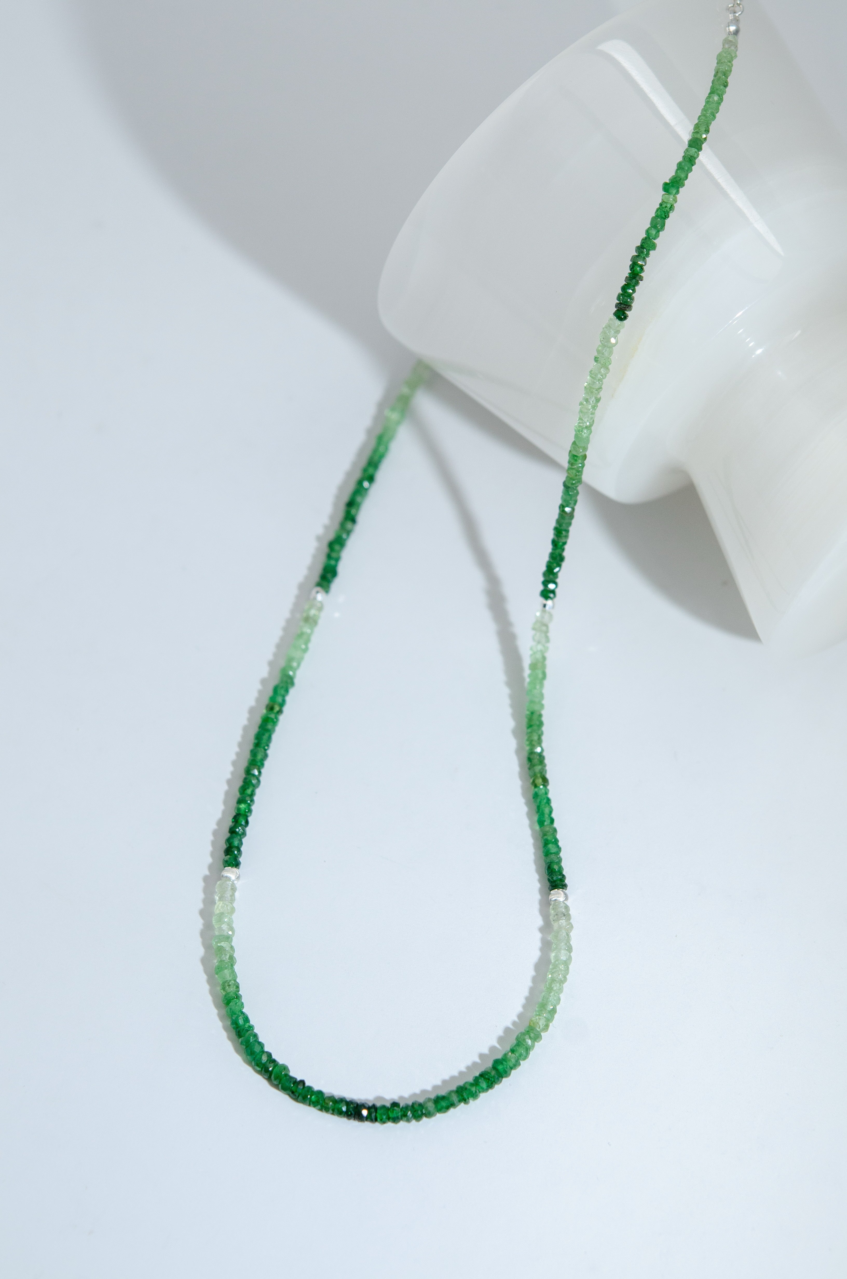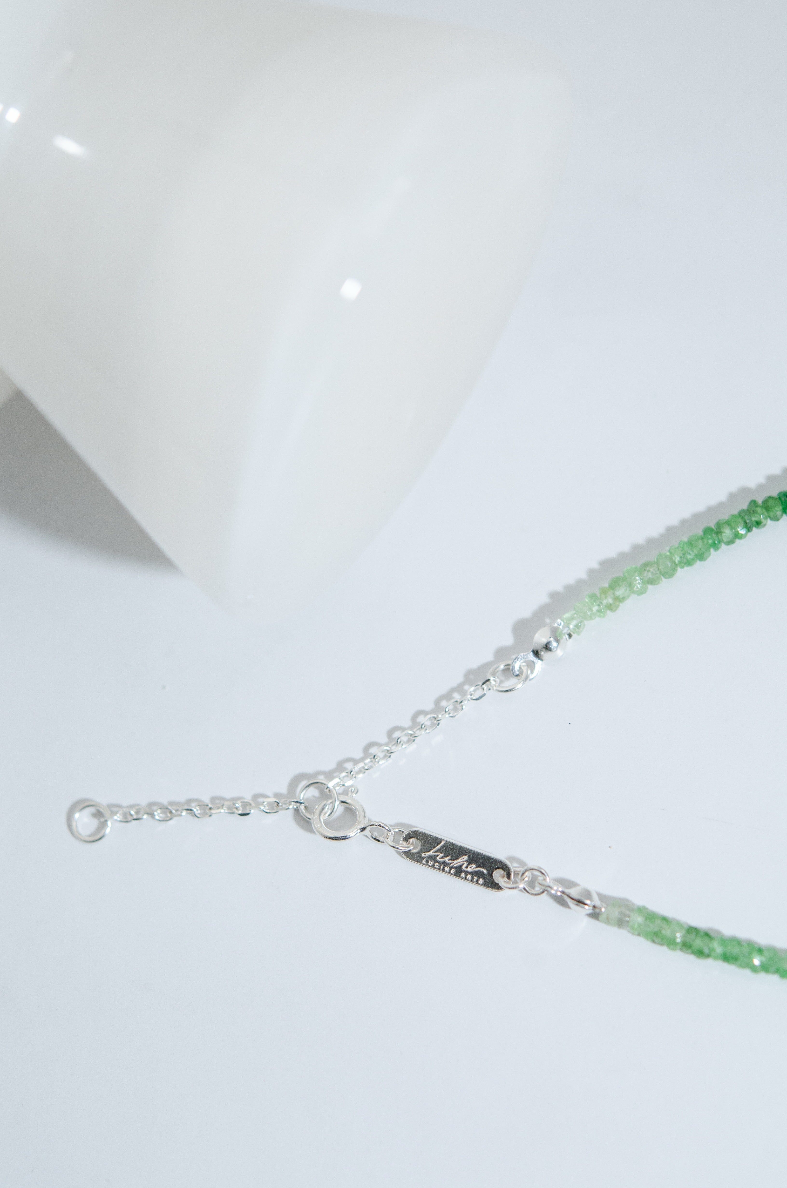 清らかで鮮やかなグリーンが印象的なツァボライトを主役にしたネックレス。生命力と成長を象徴するツァボライトは、身に着ける人の心を穏やかに整え、前向きなエネルギーを与えてくれます。シンプルで洗練されたデザインの中に、朝露に濡れた森のような瑞々しさと自然の息吹を感じられる一本です。