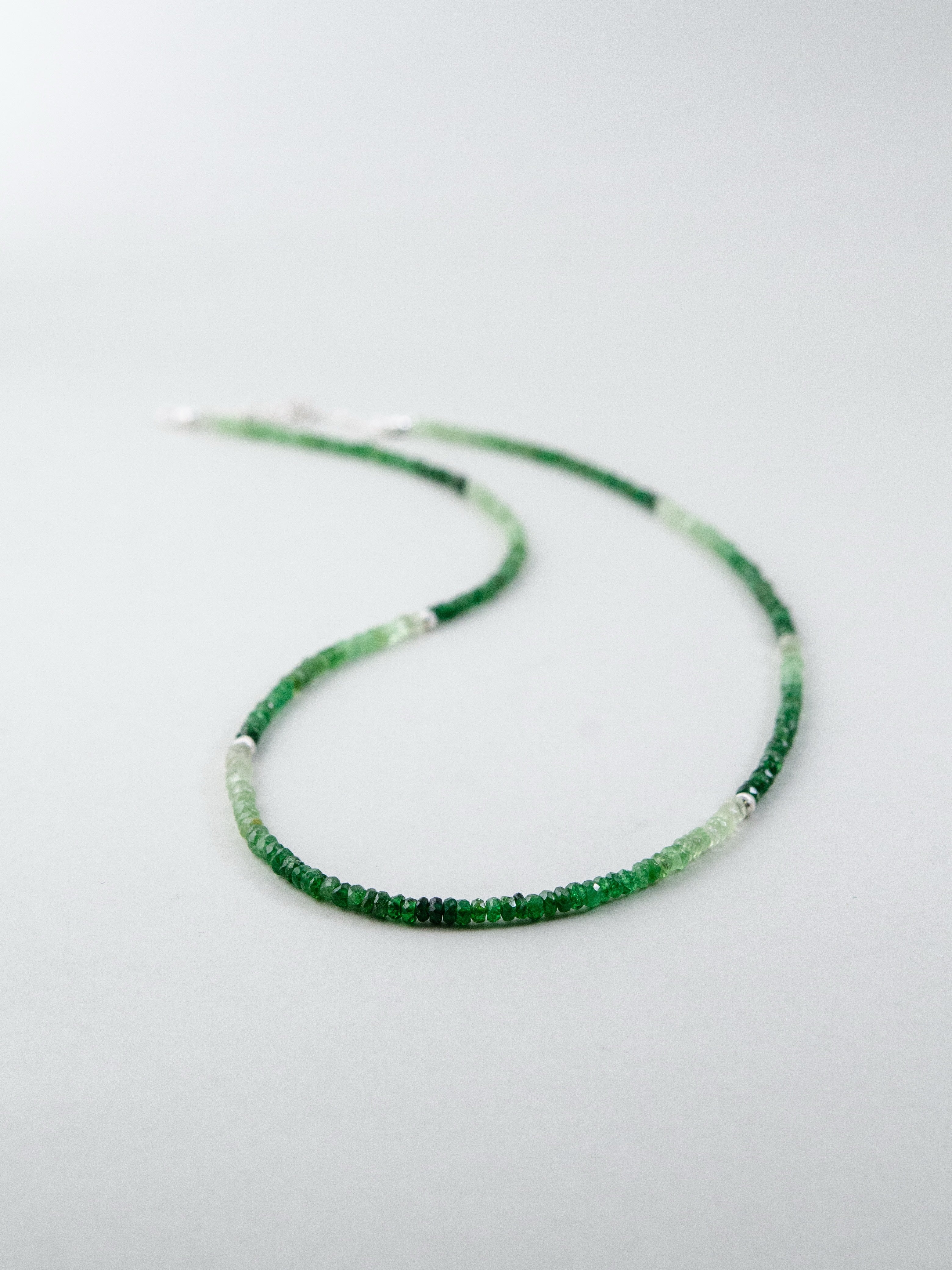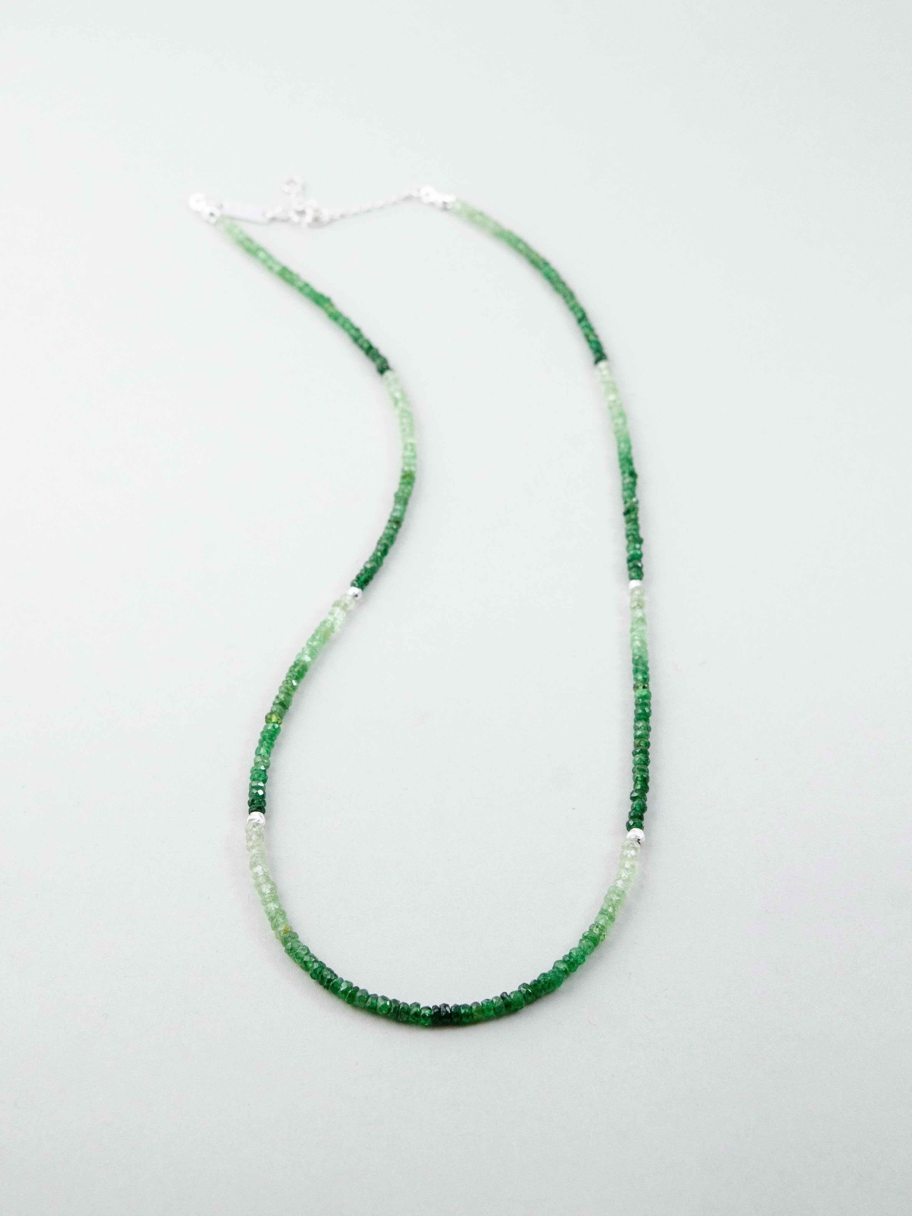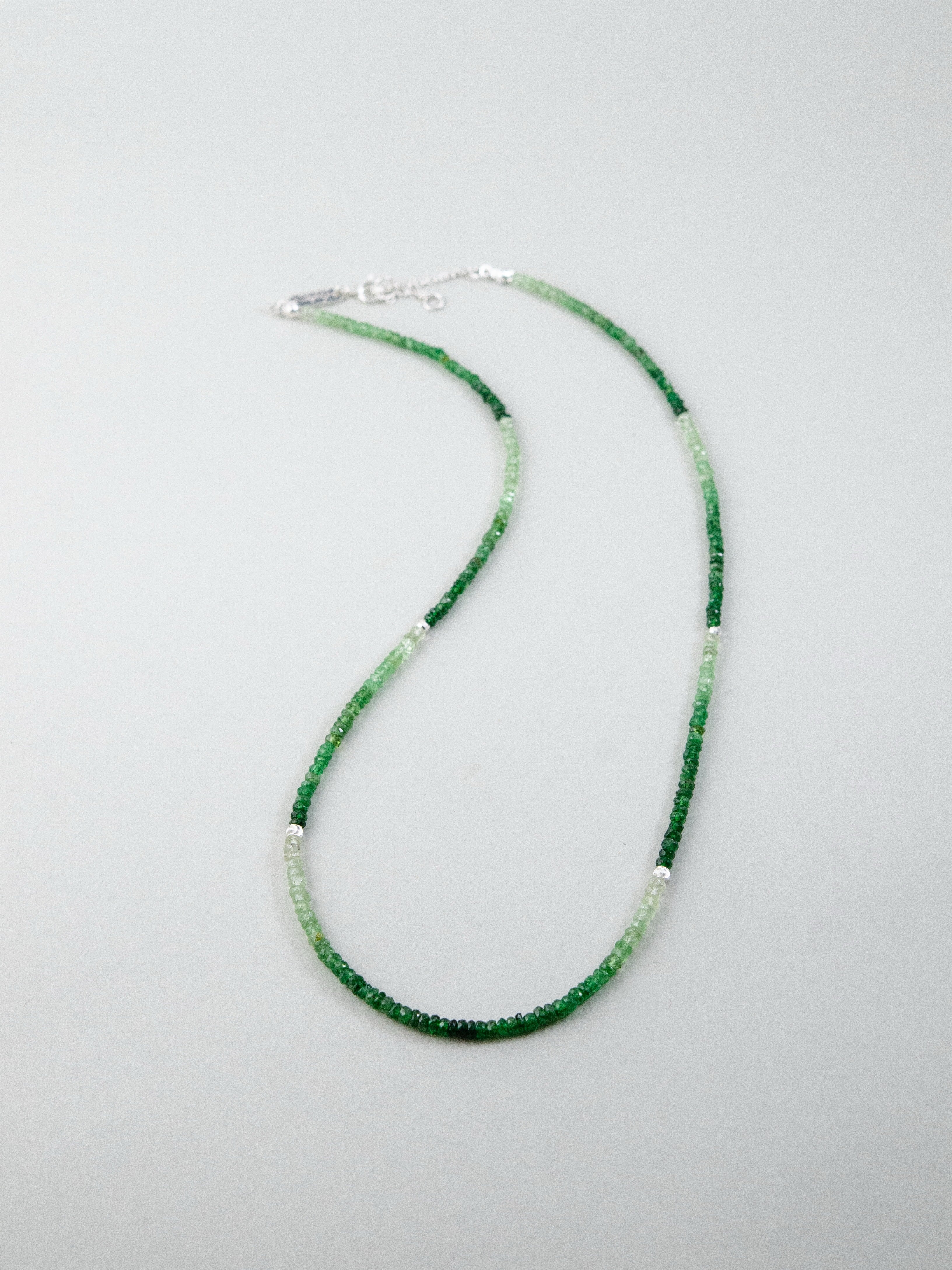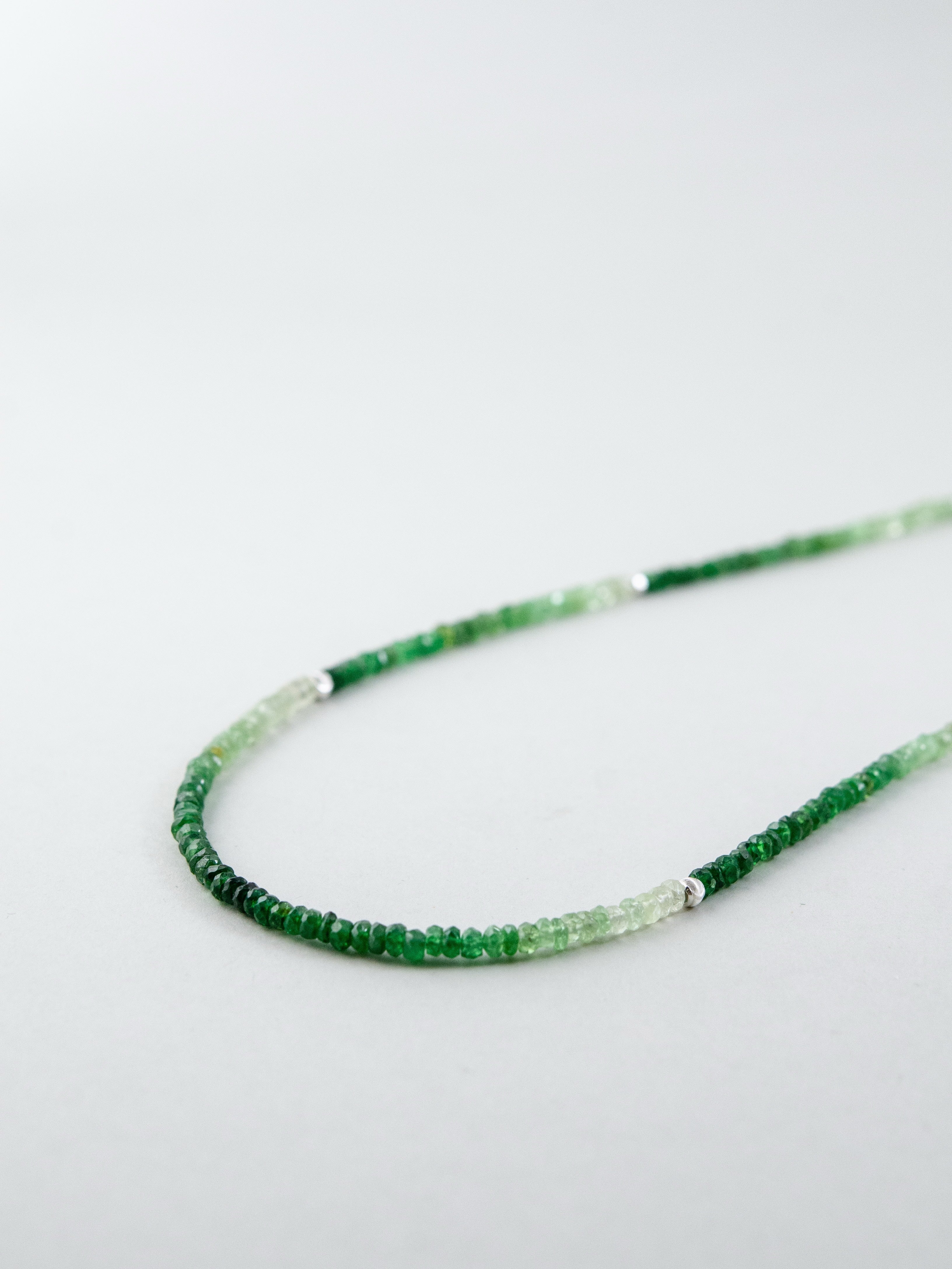 清らかで鮮やかなグリーンが印象的なツァボライトを主役にしたネックレス。生命力と成長を象徴するツァボライトは、身に着ける人の心を穏やかに整え、前向きなエネルギーを与えてくれます。シンプルで洗練されたデザインの中に、朝露に濡れた森のような瑞々しさと自然の息吹を感じられる一本です。