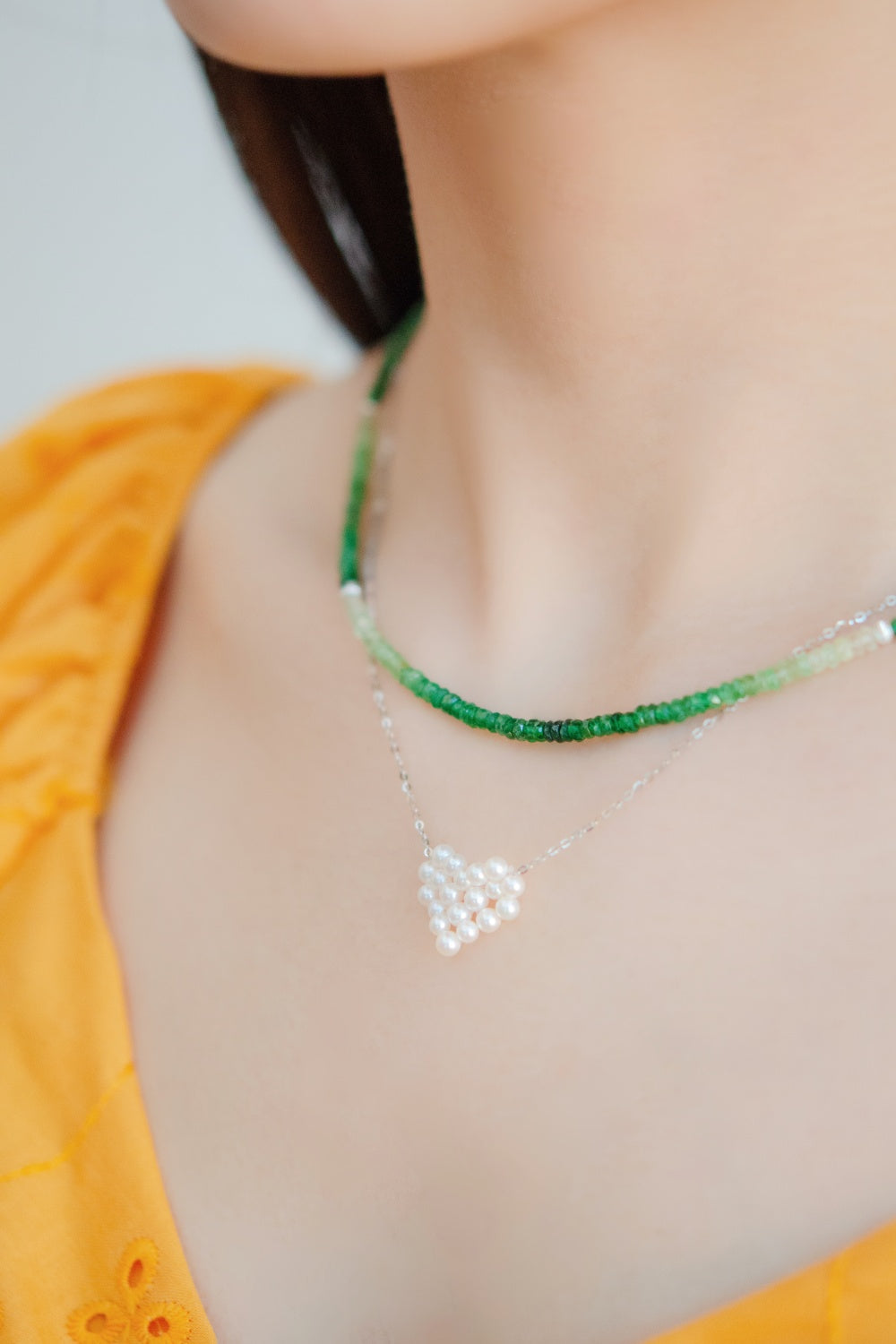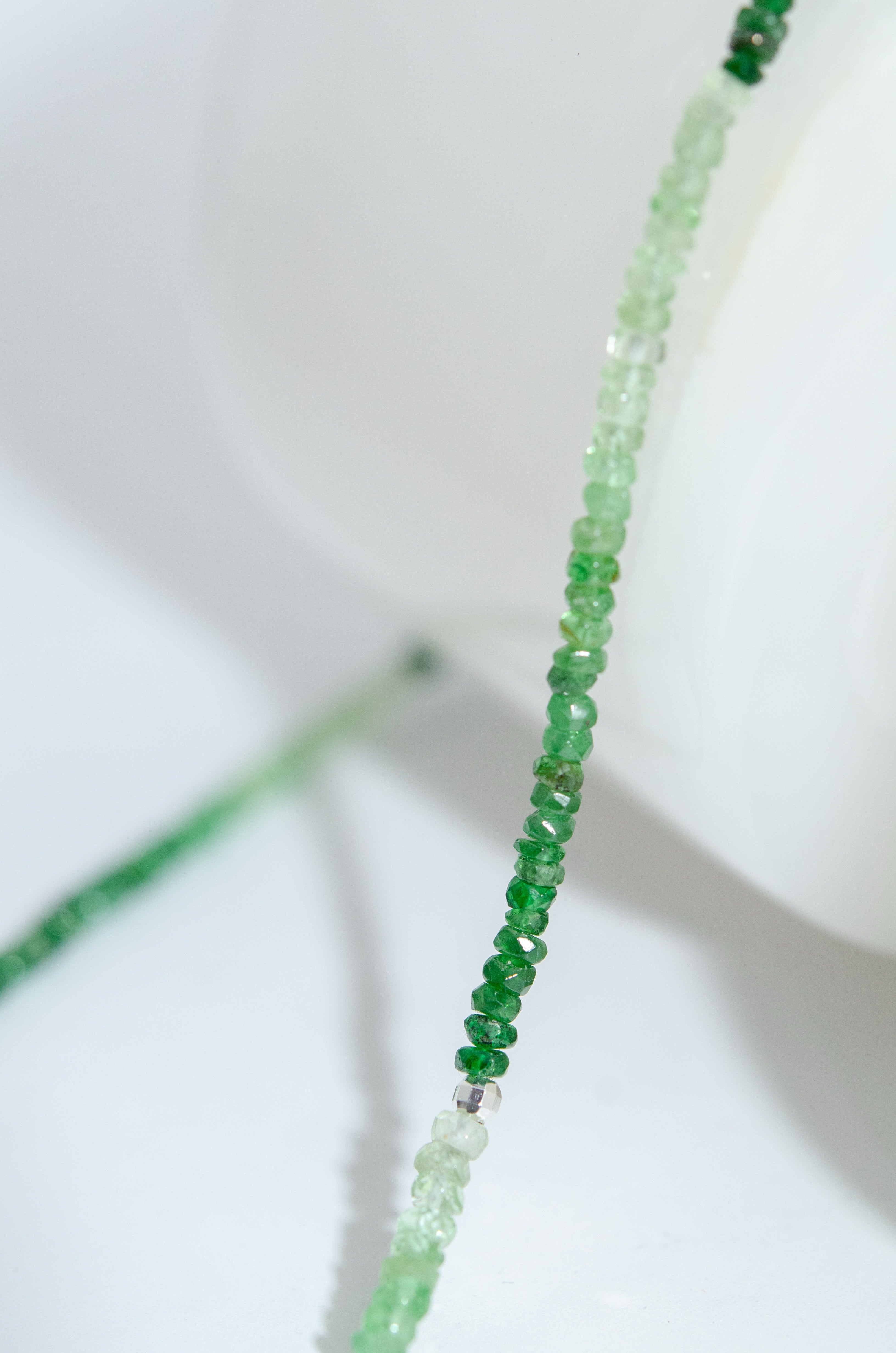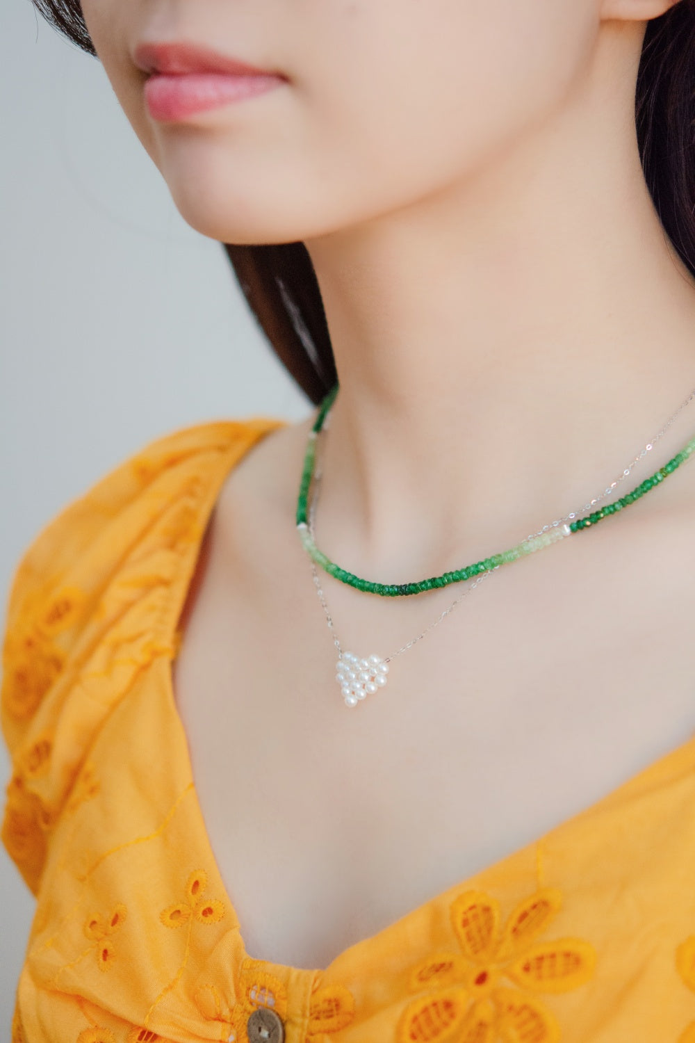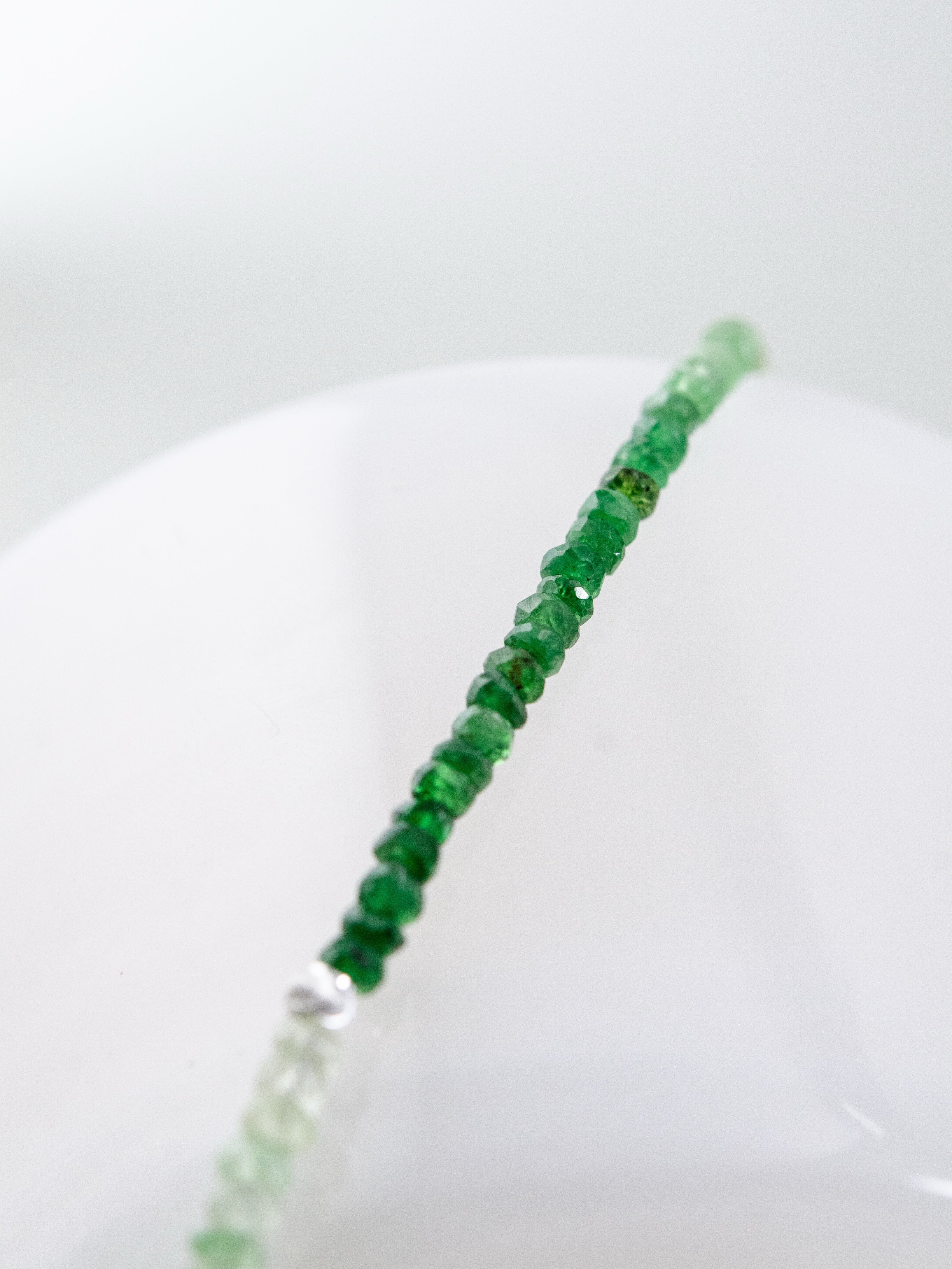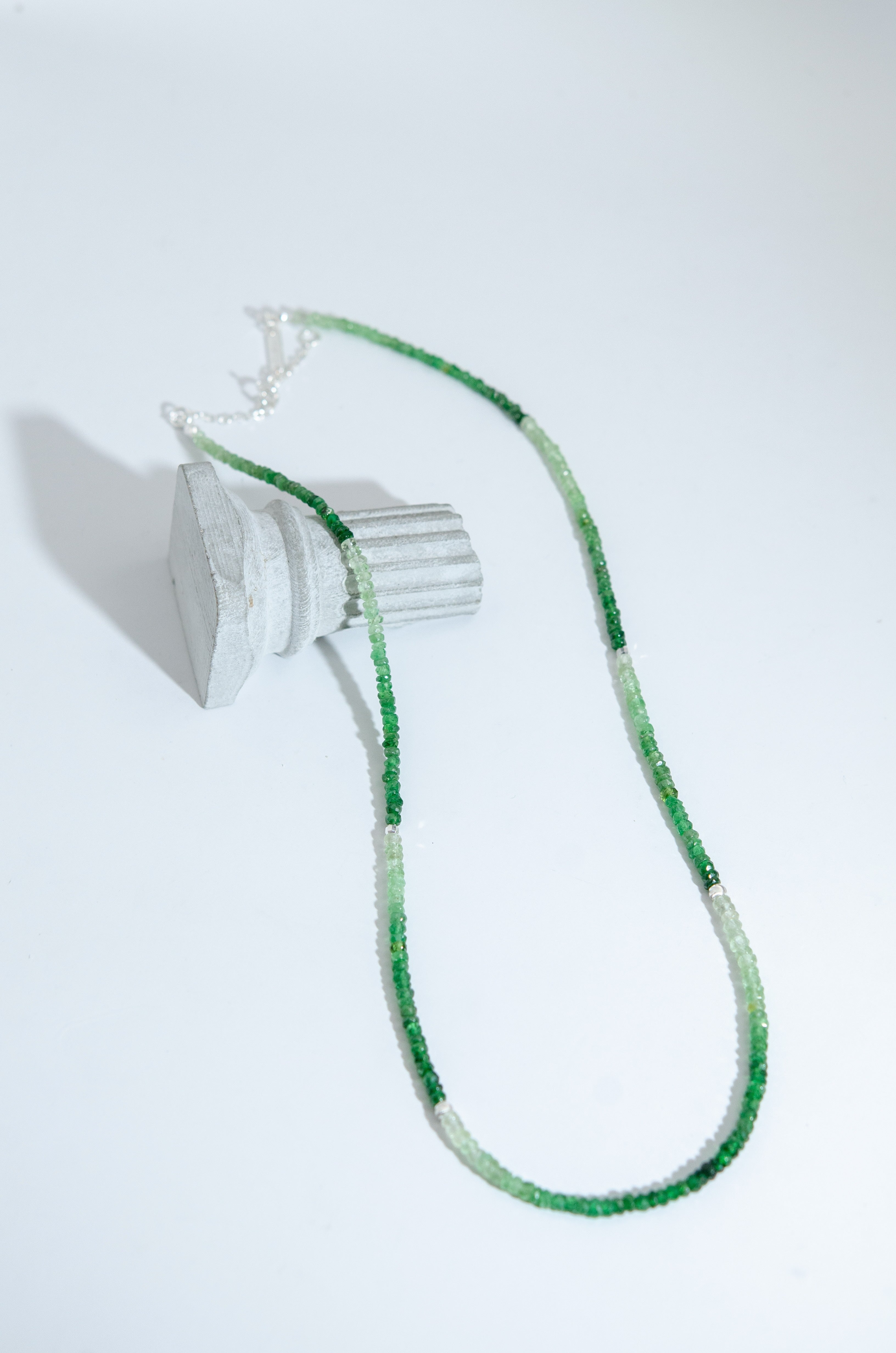 清らかで鮮やかなグリーンが印象的なツァボライトを主役にしたネックレス。生命力と成長を象徴するツァボライトは、身に着ける人の心を穏やかに整え、前向きなエネルギーを与えてくれます。シンプルで洗練されたデザインの中に、朝露に濡れた森のような瑞々しさと自然の息吹を感じられる一本です。