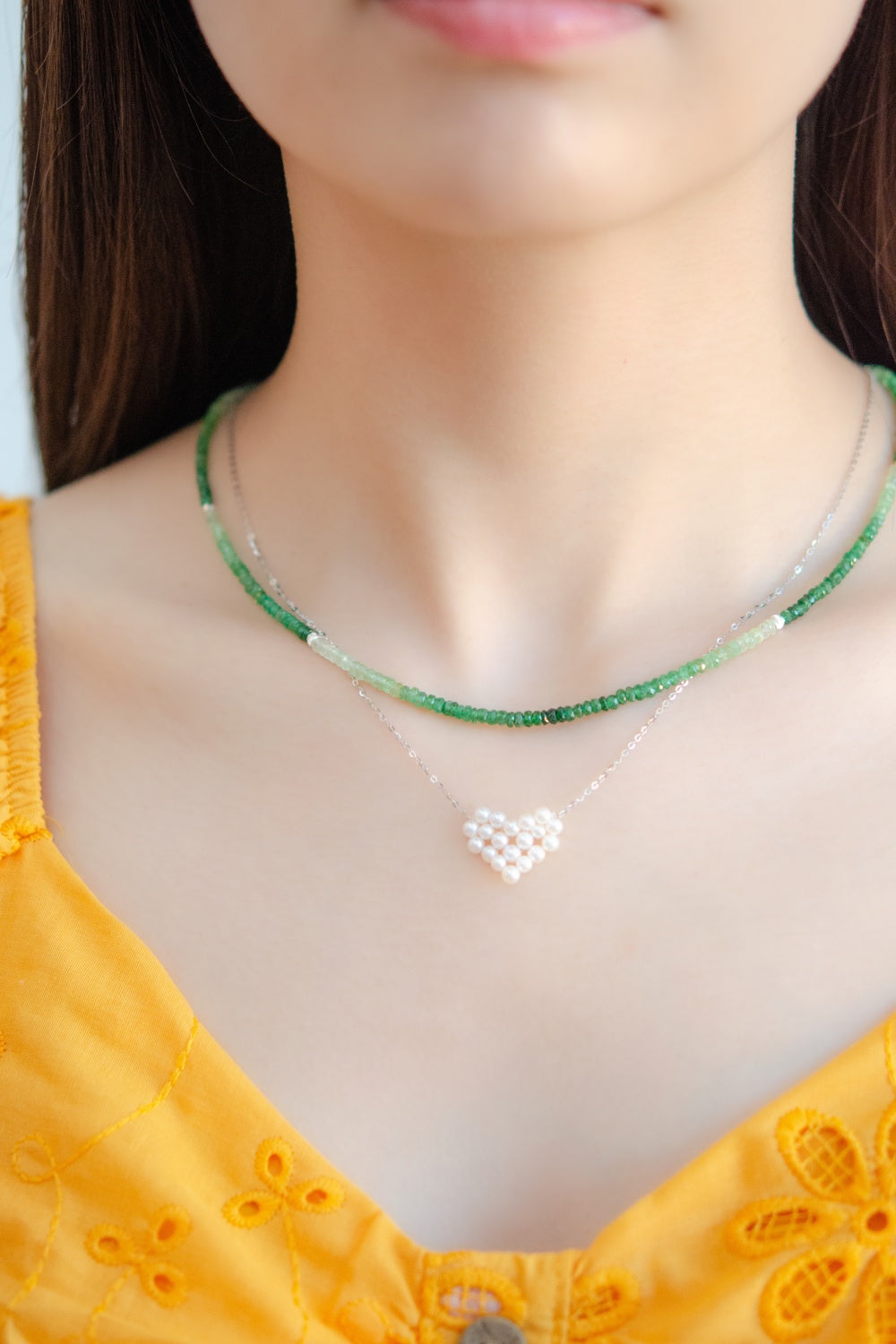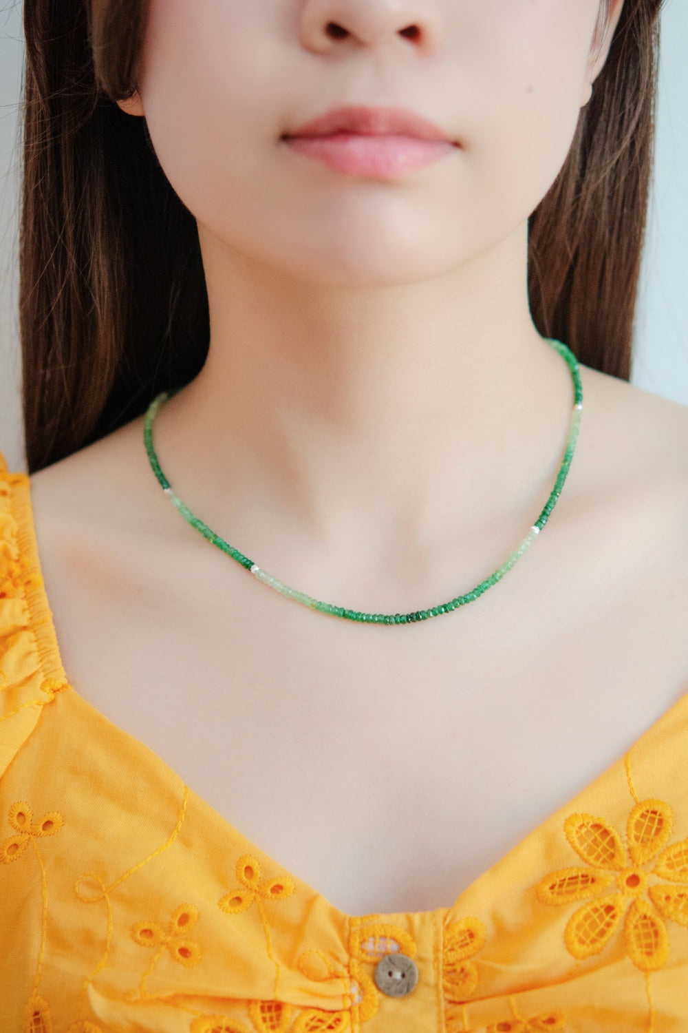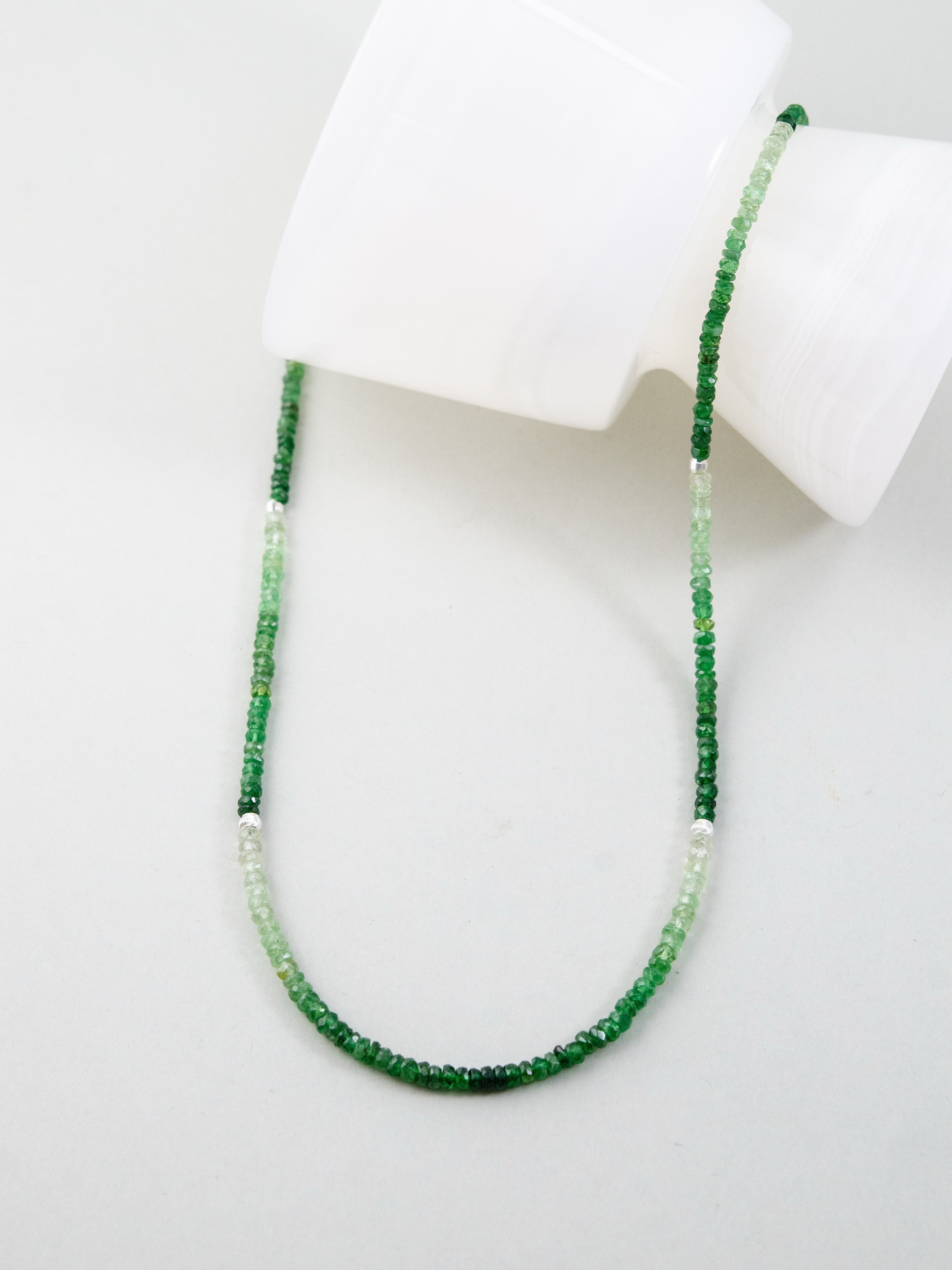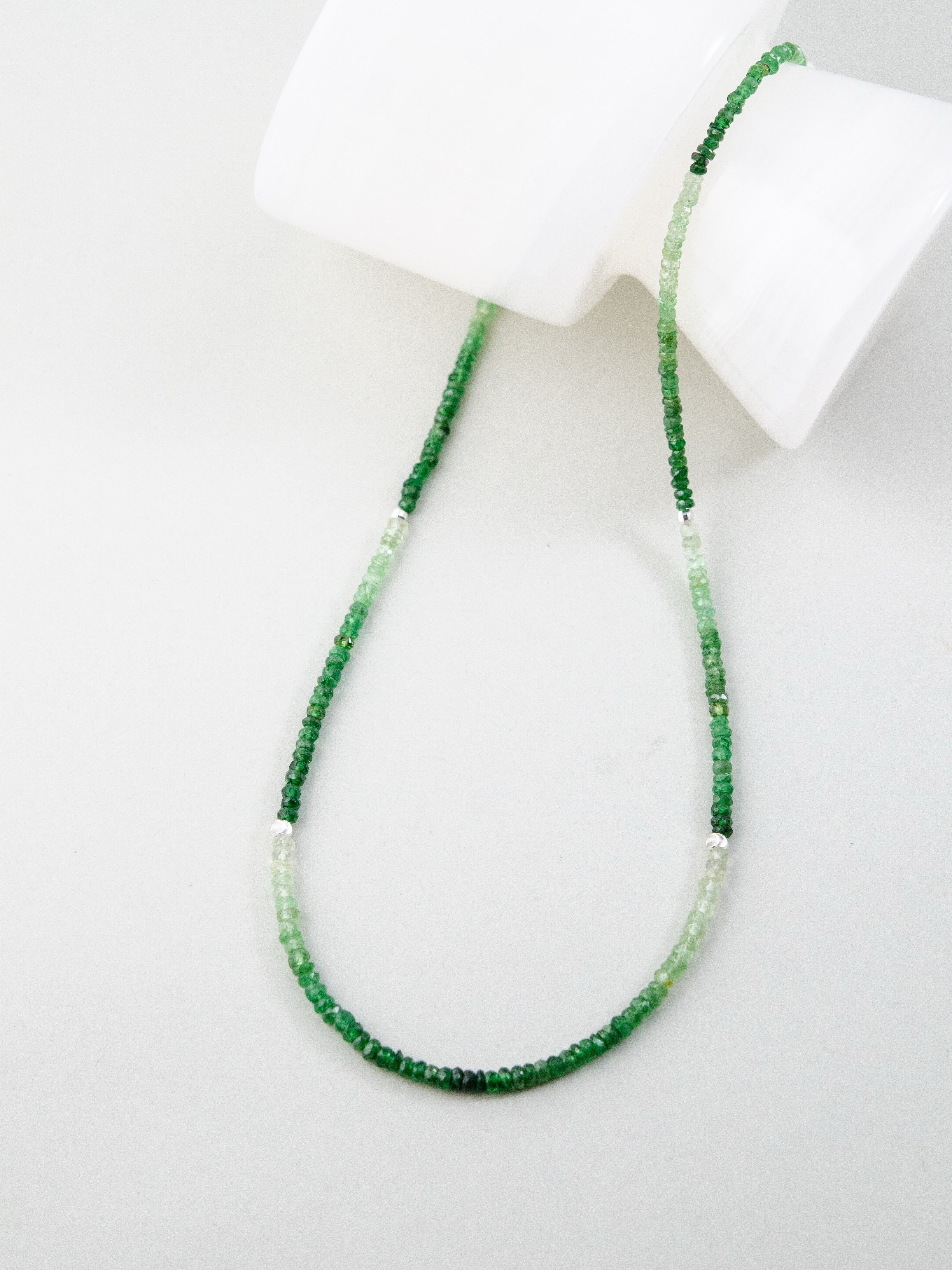 清らかで鮮やかなグリーンが印象的なツァボライトを主役にしたネックレス。生命力と成長を象徴するツァボライトは、身に着ける人の心を穏やかに整え、前向きなエネルギーを与えてくれます。シンプルで洗練されたデザインの中に、朝露に濡れた森のような瑞々しさと自然の息吹を感じられる一本です。