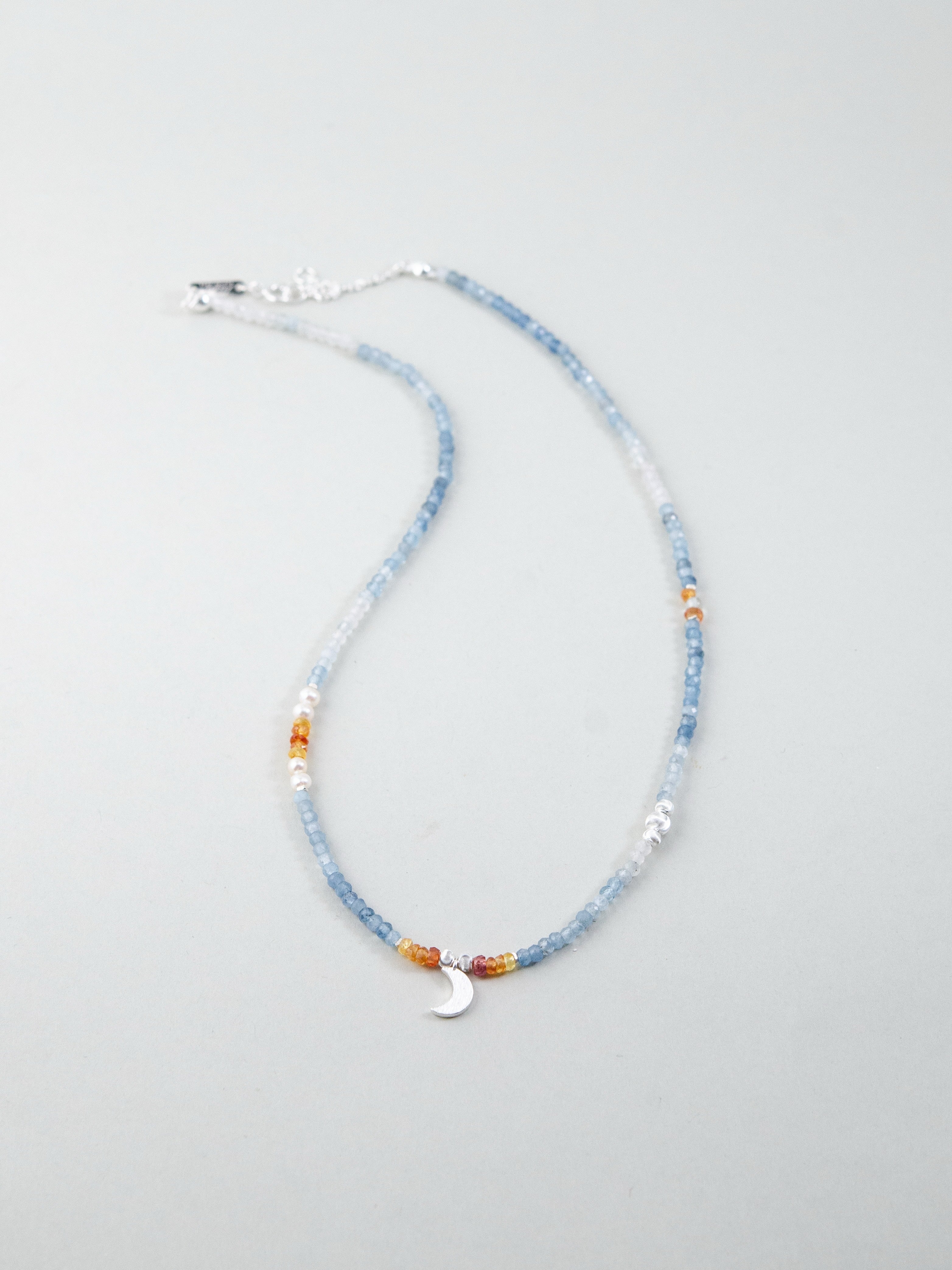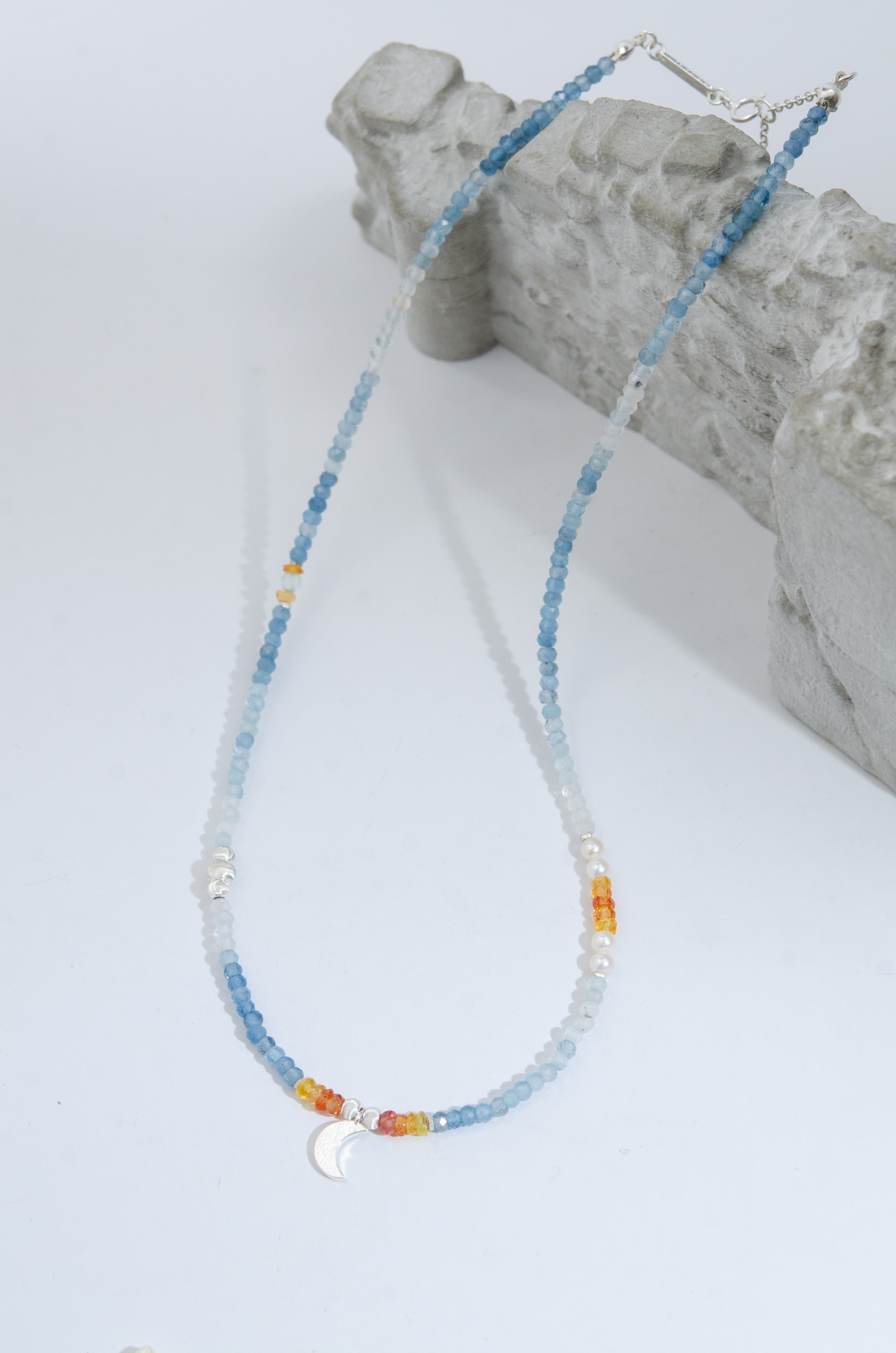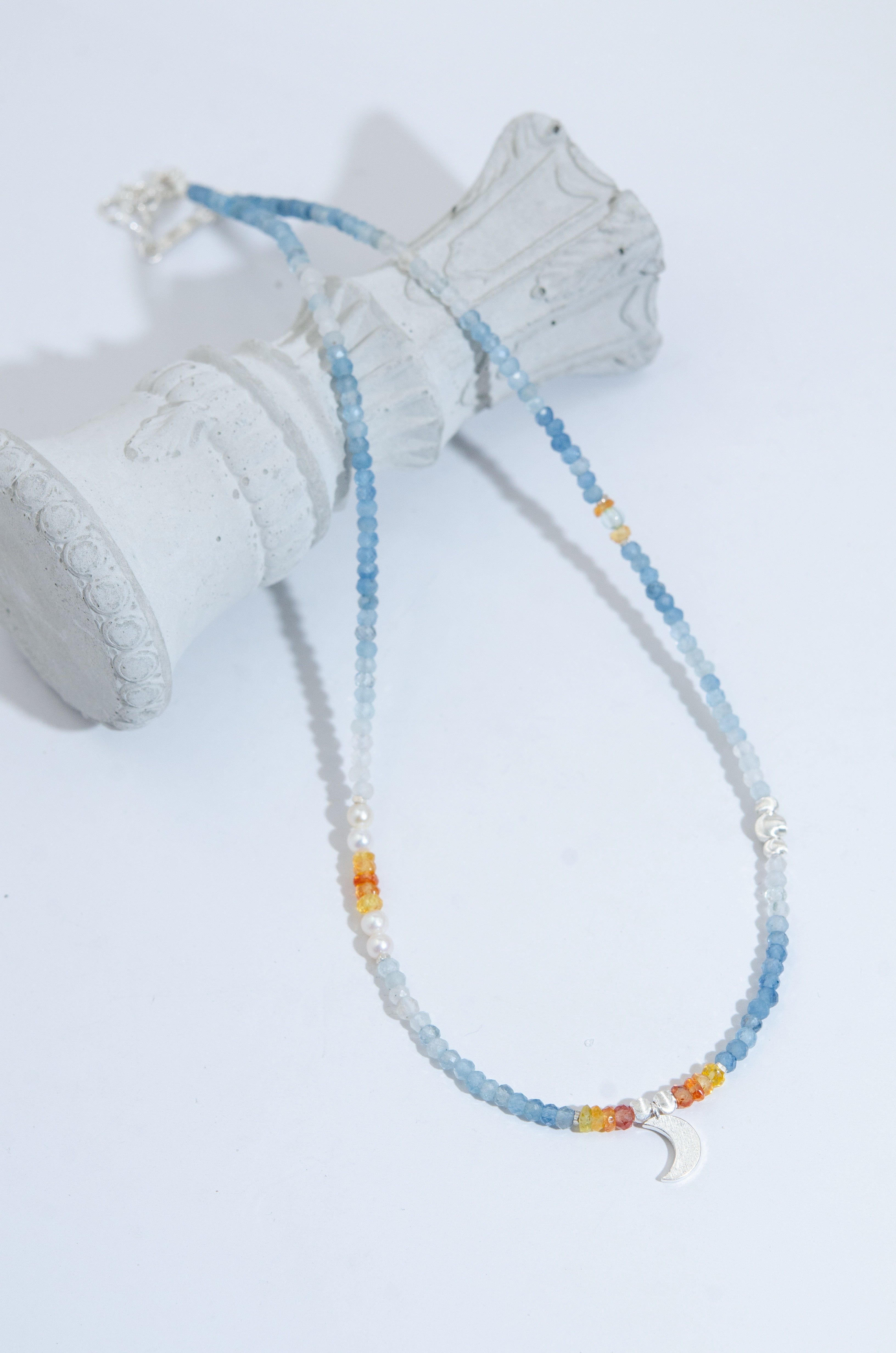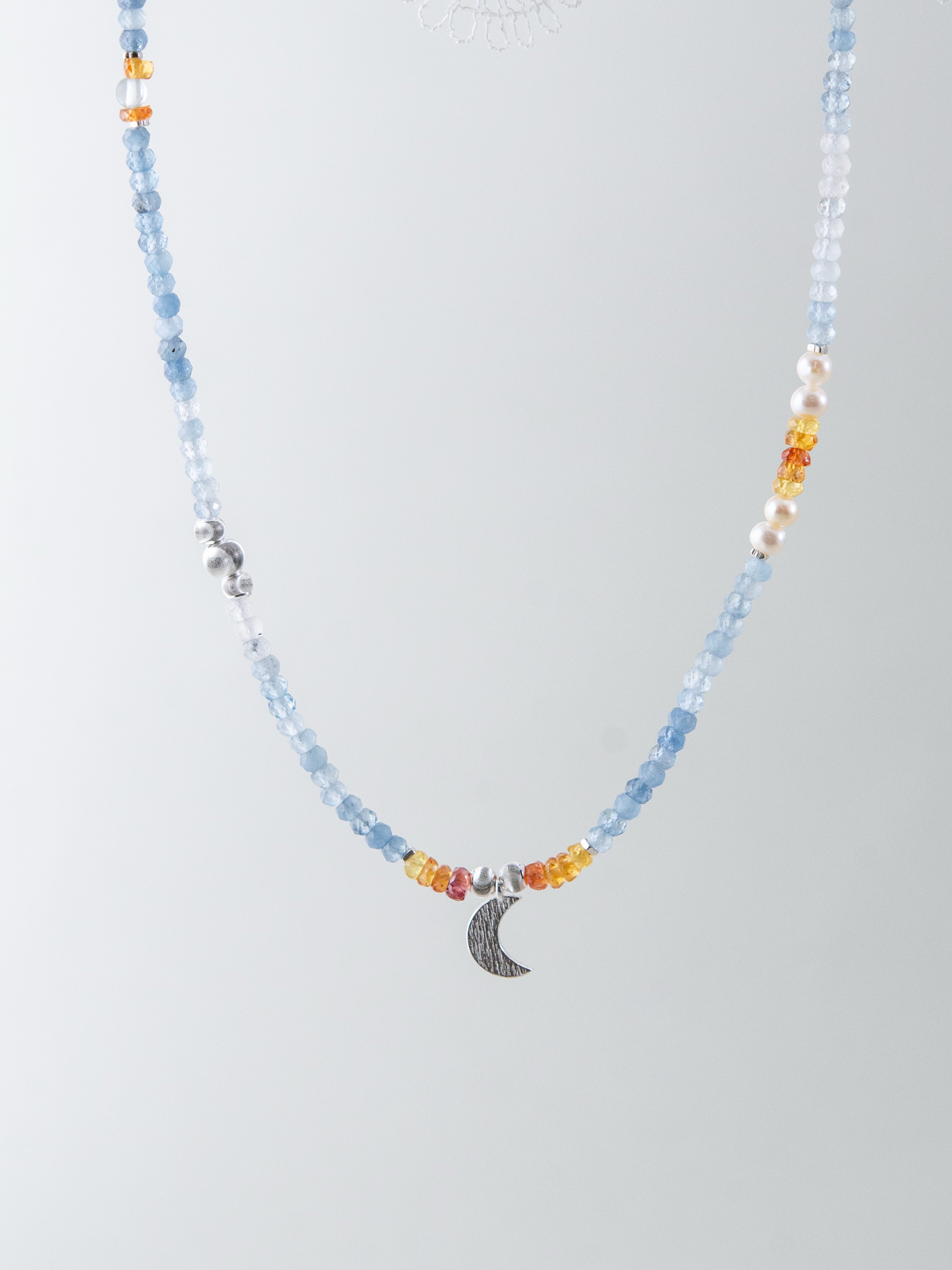 夜明けの海辺をイメージした、透明感あふれるアクアマリンとイエローサファイアのネックレス。澄んだブルーが静かな海を、やわらかなイエローが朝日の光を思わせ、胸元に穏やかな輝きを添えます。シルバーの三日月チャームがゆらめき、夜と朝の境界を照らすような幻想的なデザインに仕上げました。