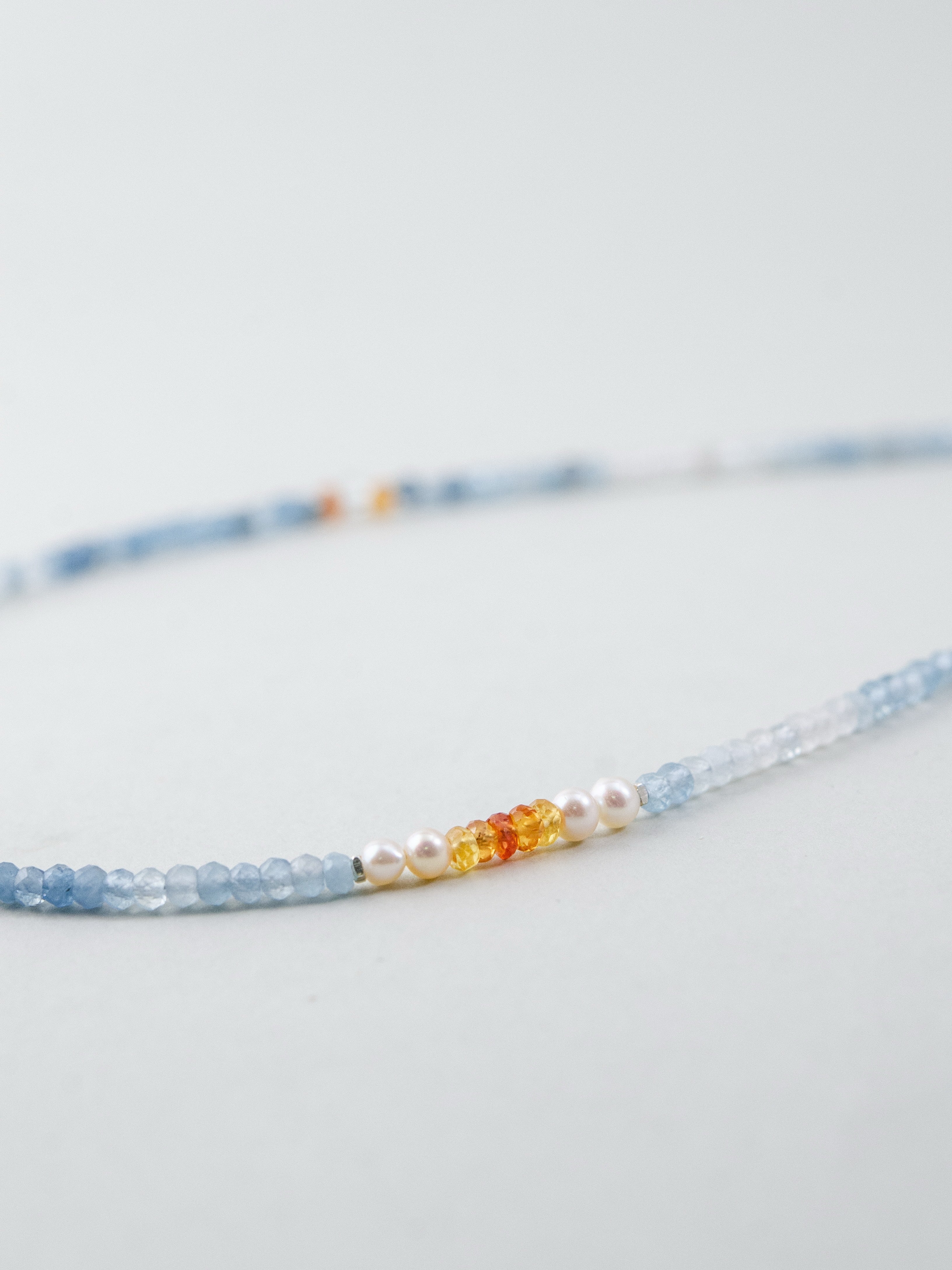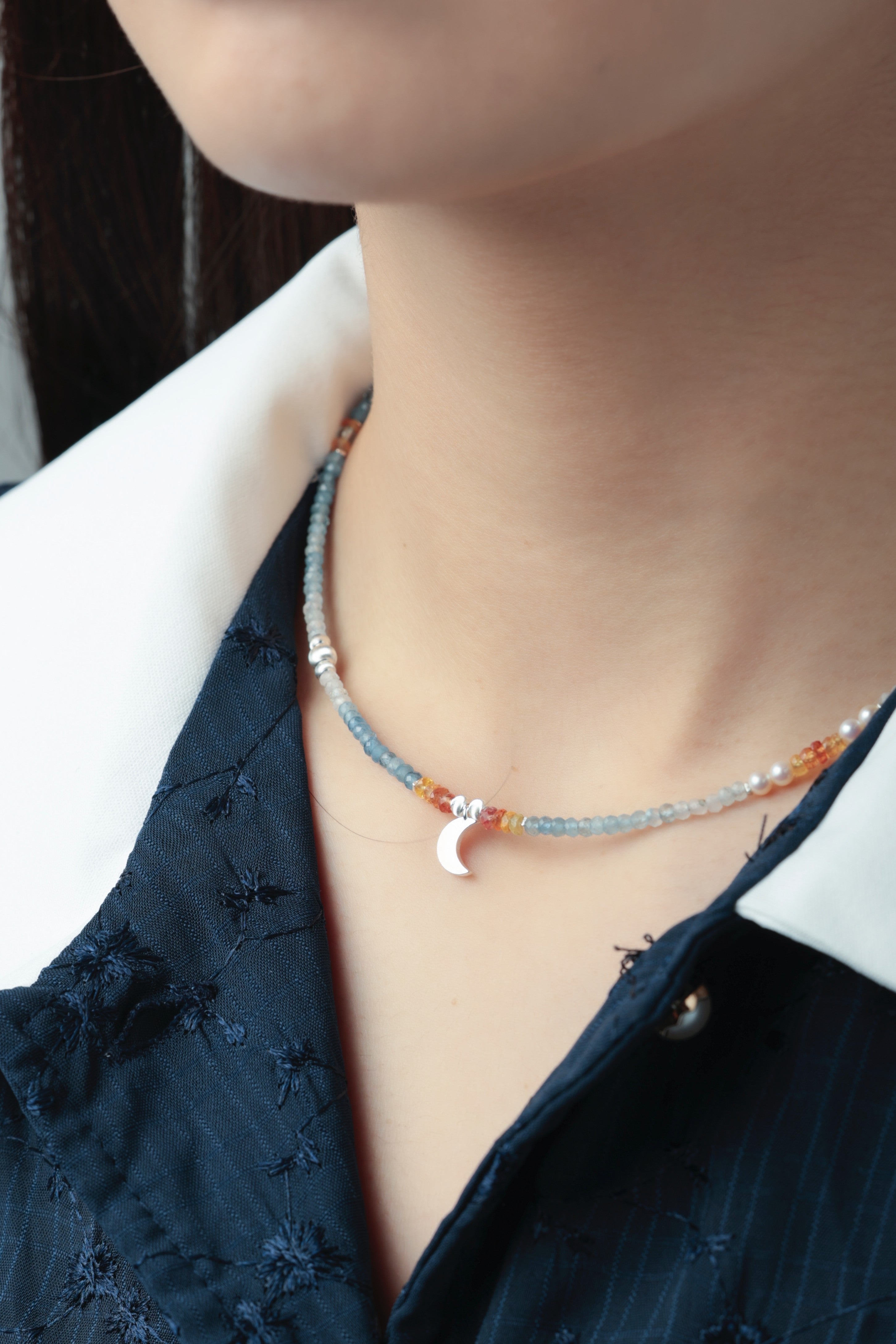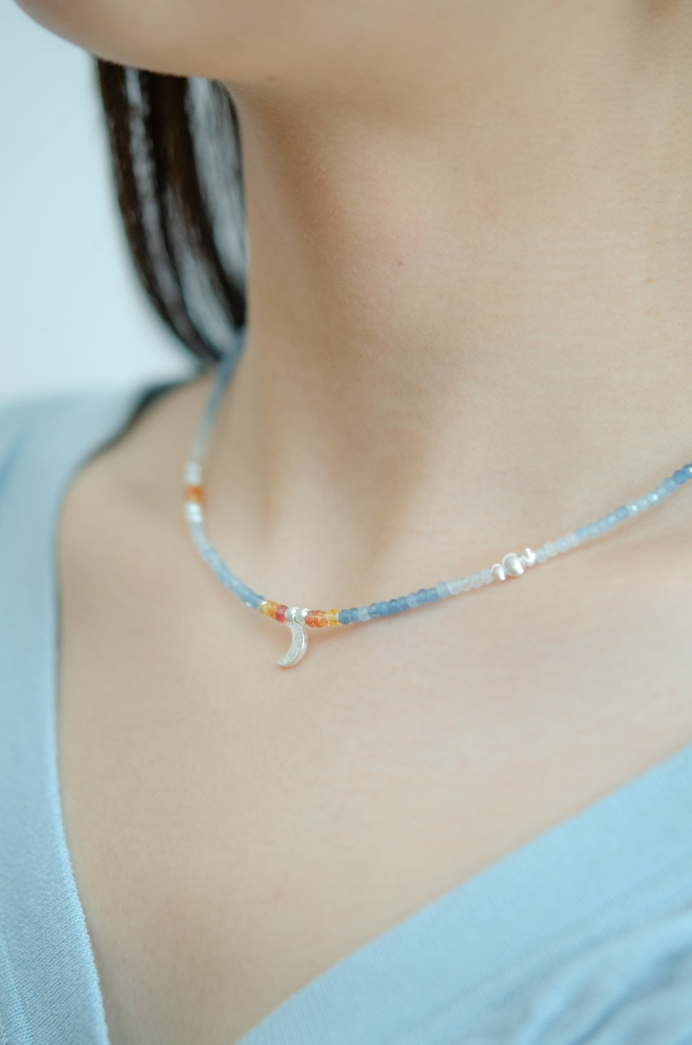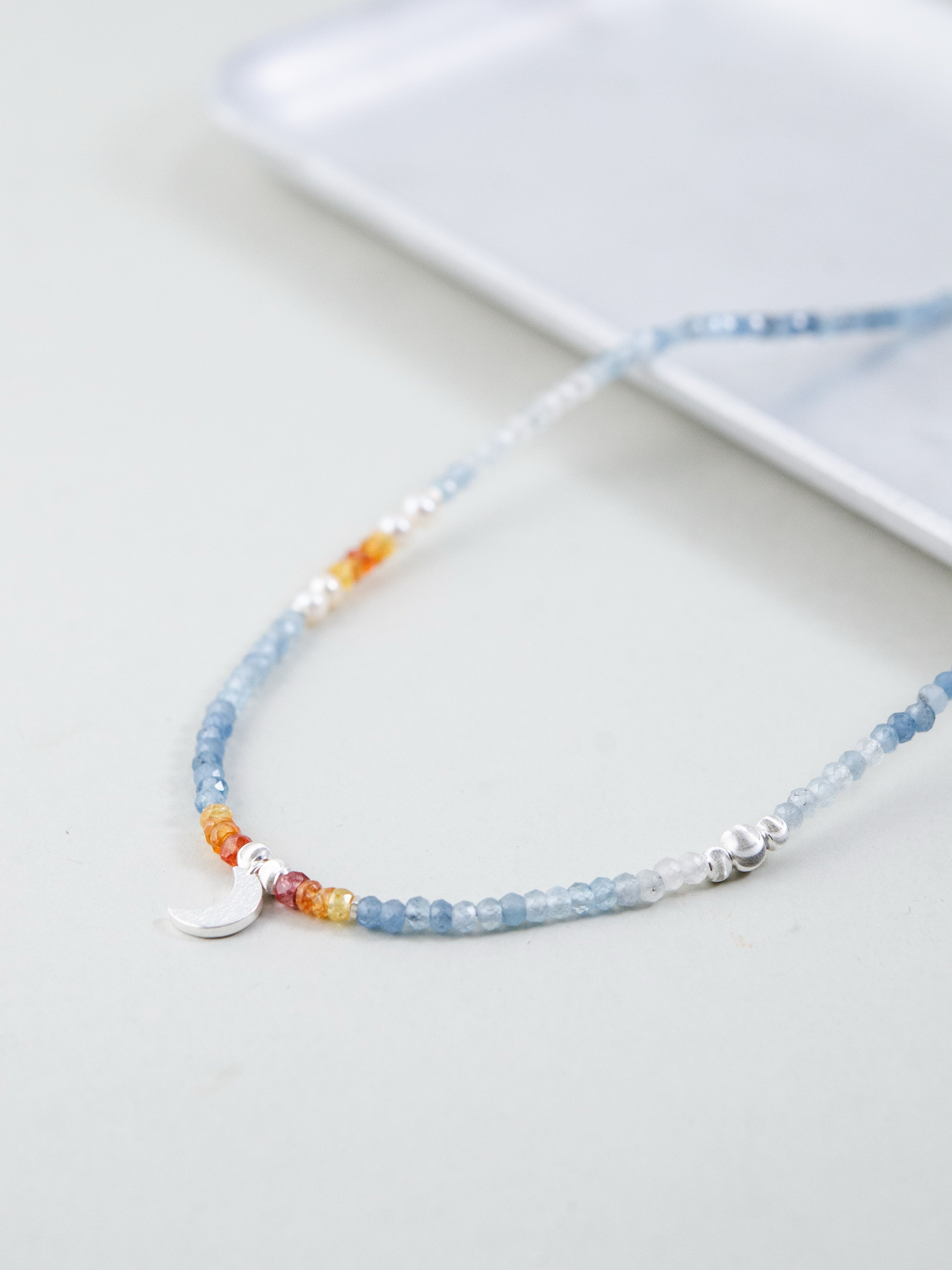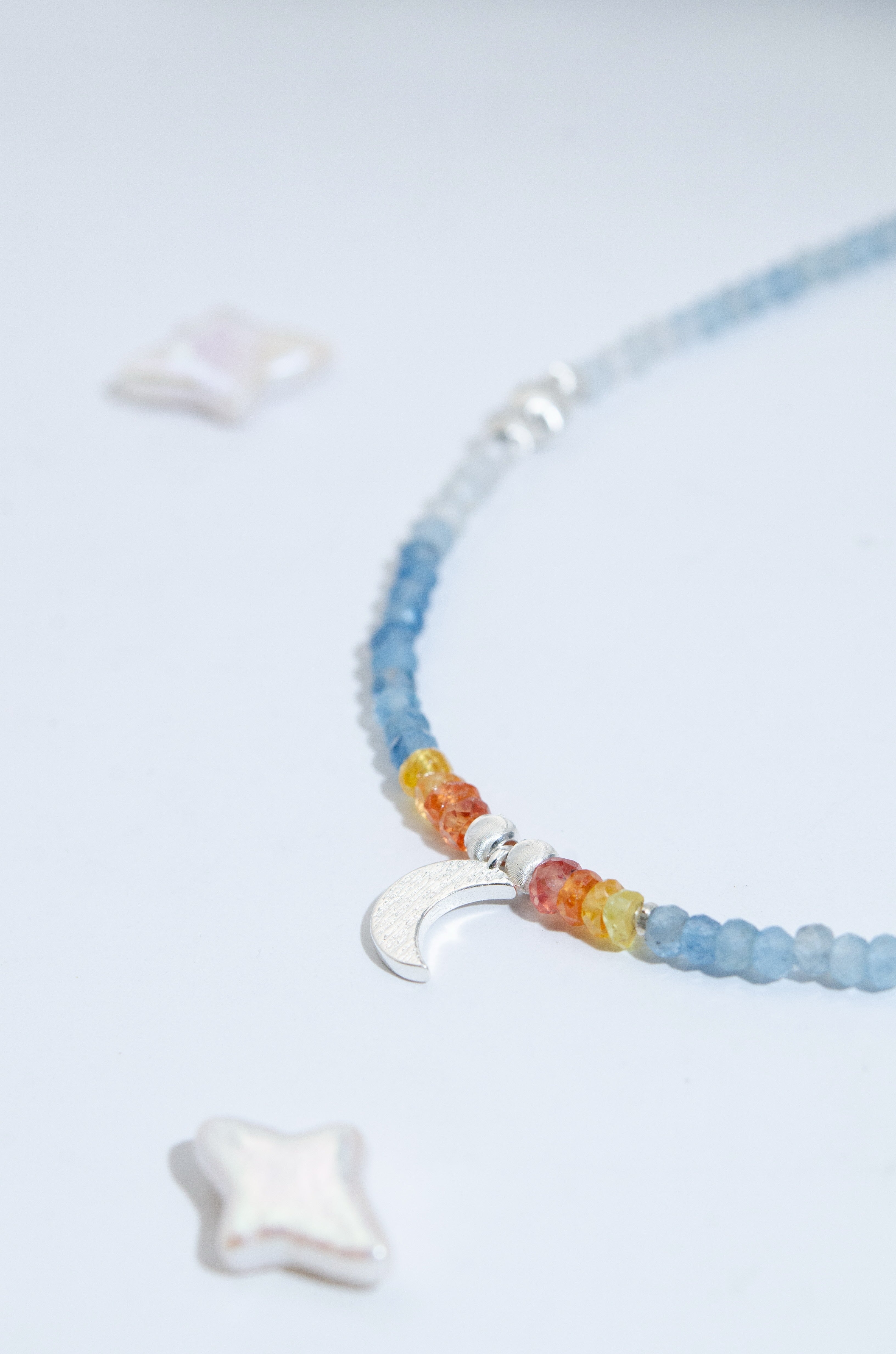 夜明けの海辺をイメージした、透明感あふれるアクアマリンとイエローサファイアのネックレス。澄んだブルーが静かな海を、やわらかなイエローが朝日の光を思わせ、胸元に穏やかな輝きを添えます。シルバーの三日月チャームがゆらめき、夜と朝の境界を照らすような幻想的なデザインに仕上げました。