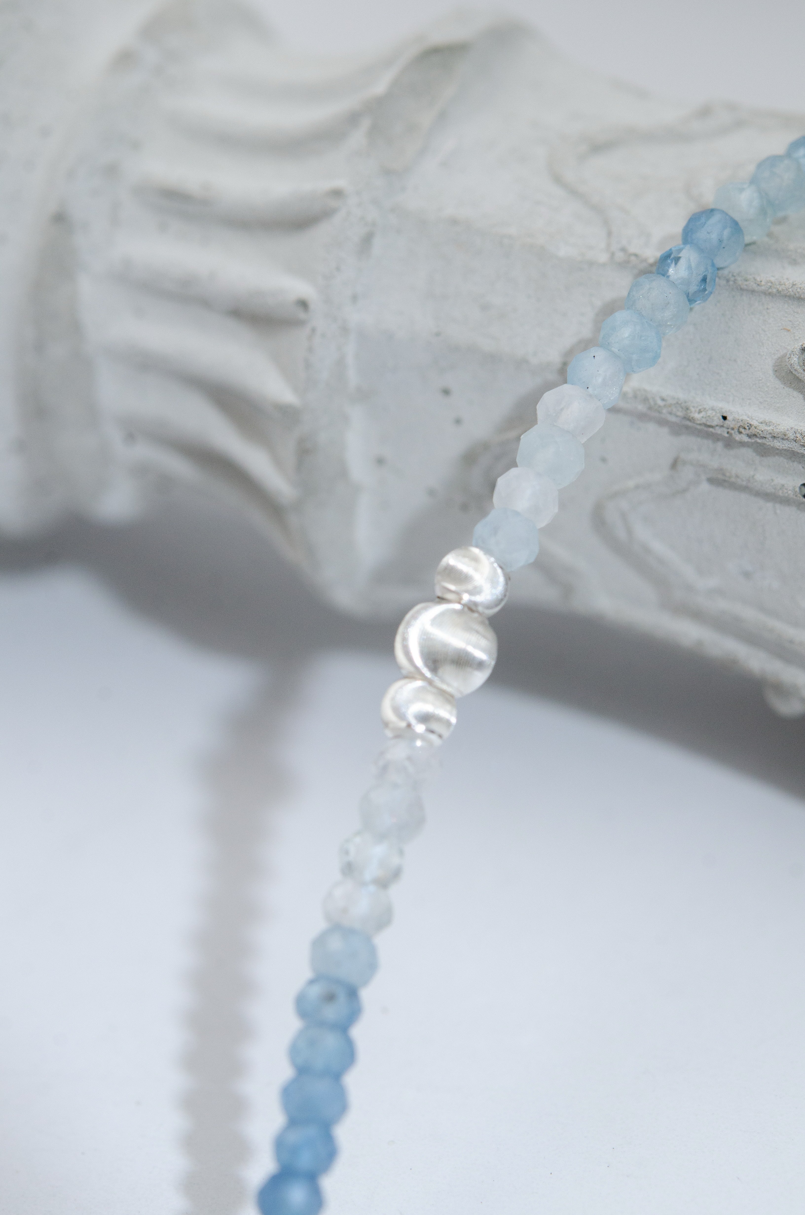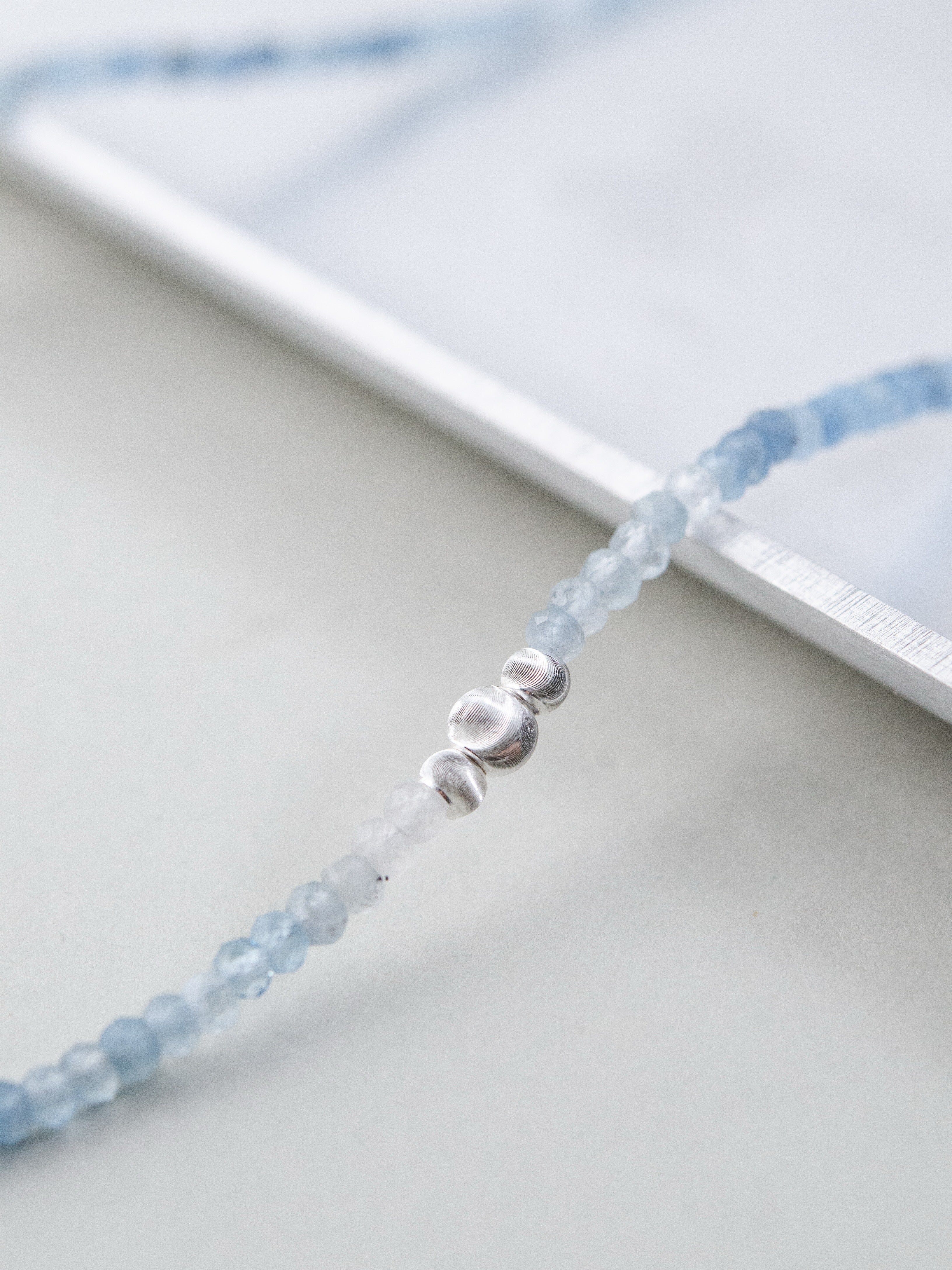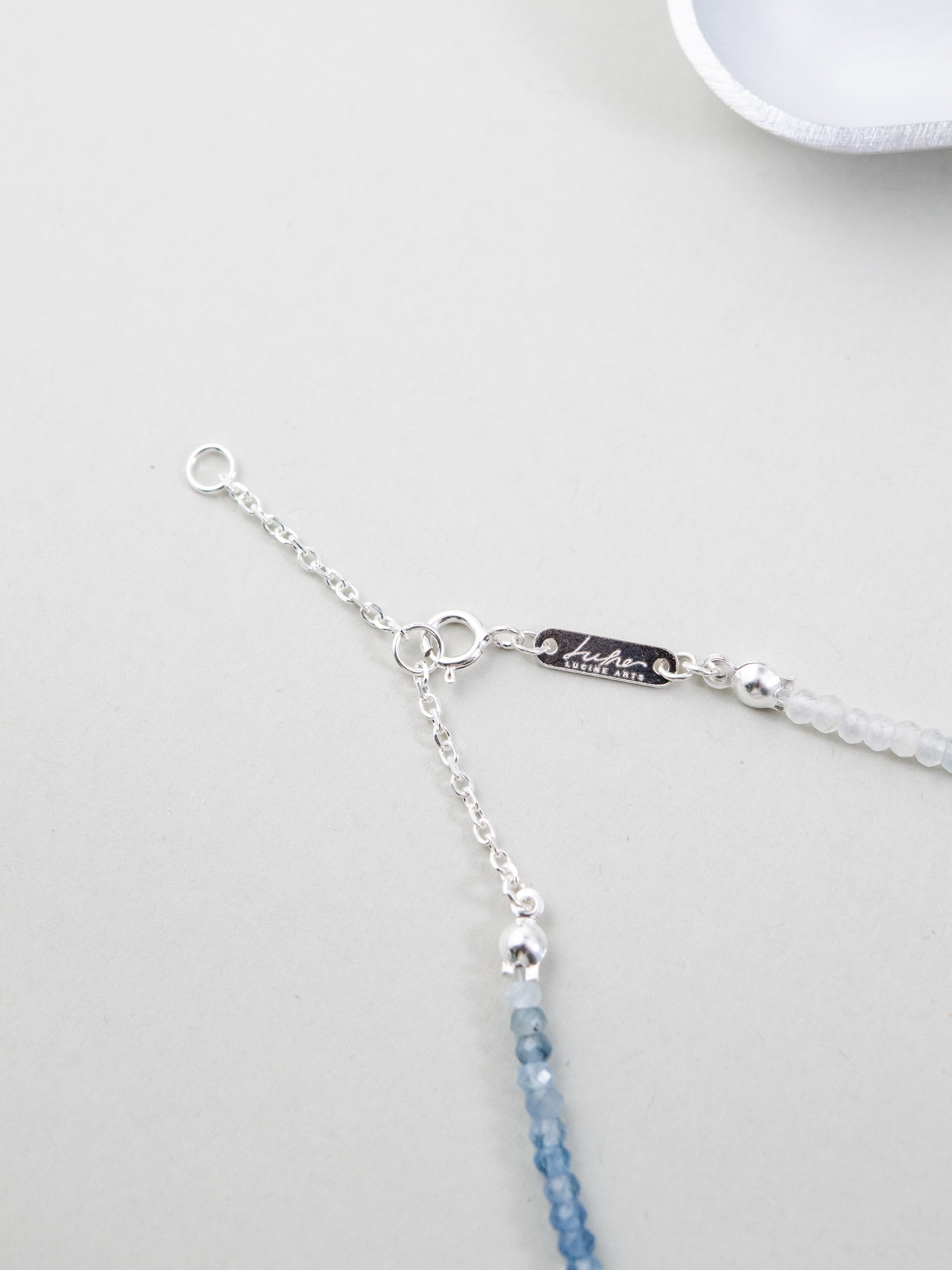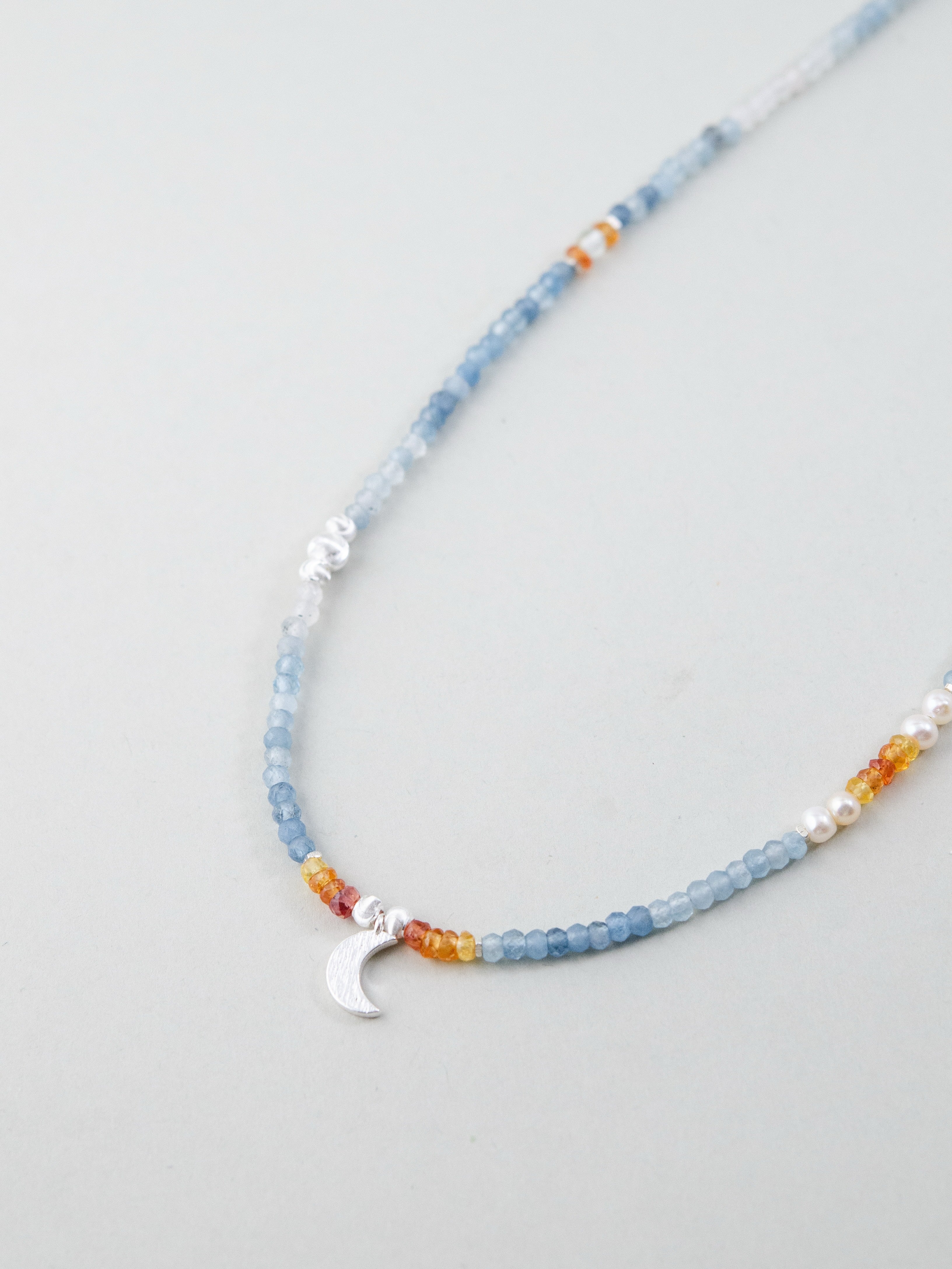夜明けの海辺をイメージした、透明感あふれるアクアマリンとイエローサファイアのネックレス。澄んだブルーが静かな海を、やわらかなイエローが朝日の光を思わせ、胸元に穏やかな輝きを添えます。シルバーの三日月チャームがゆらめき、夜と朝の境界を照らすような幻想的なデザインに仕上げました。