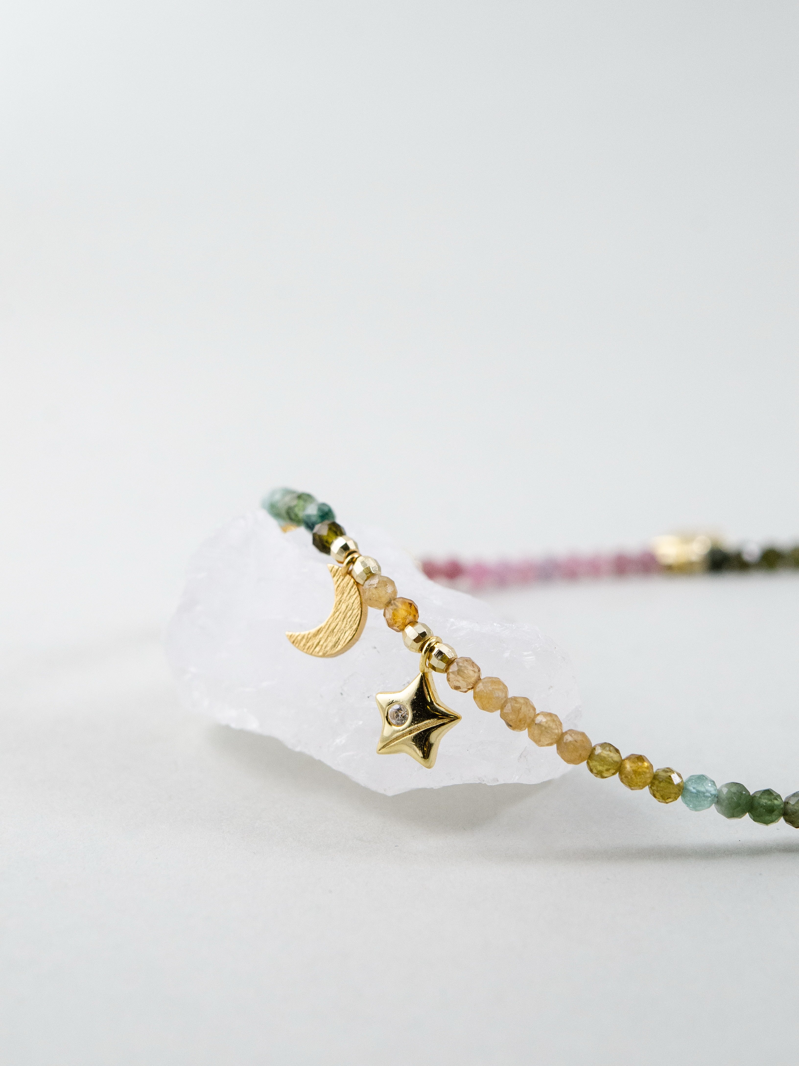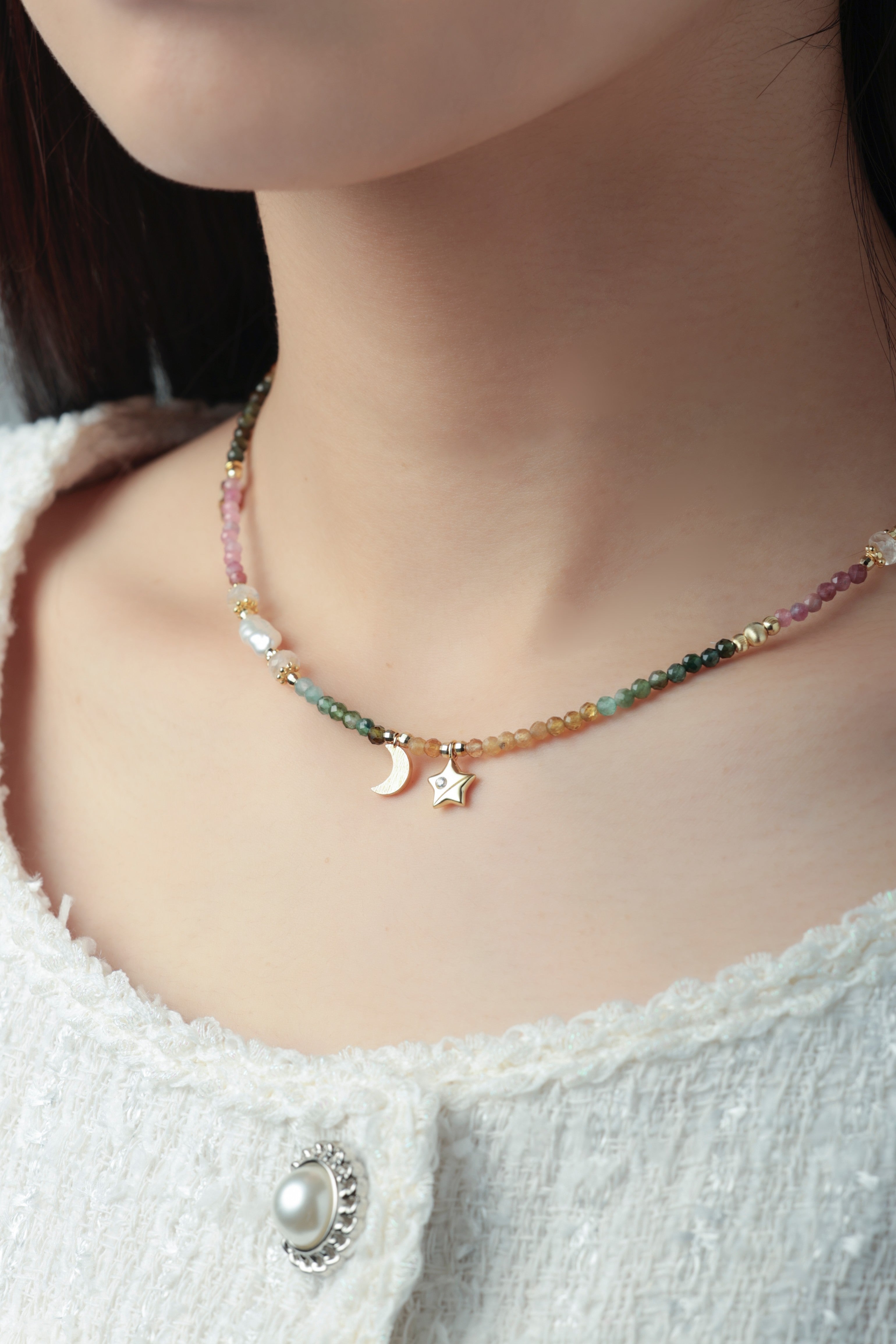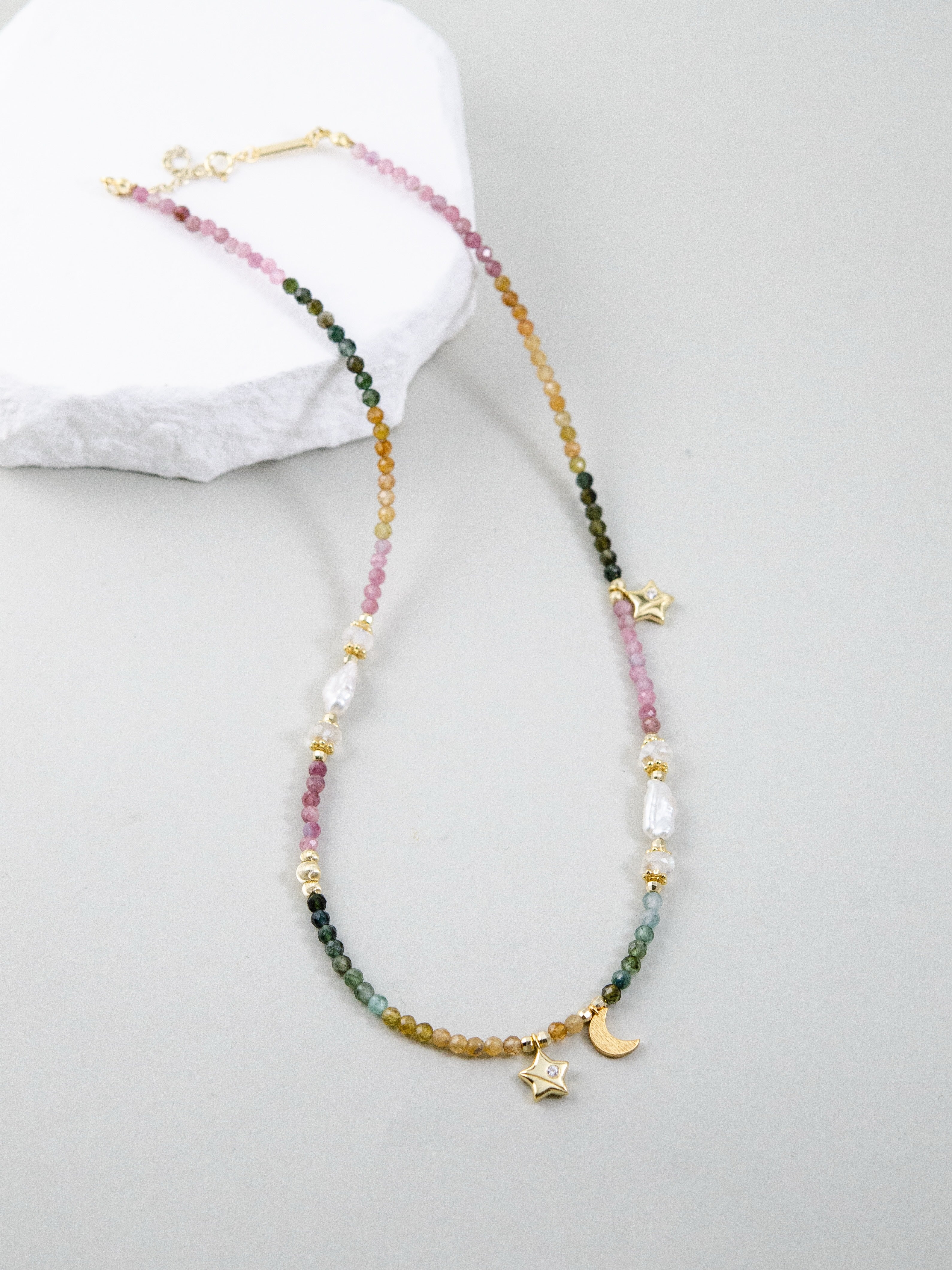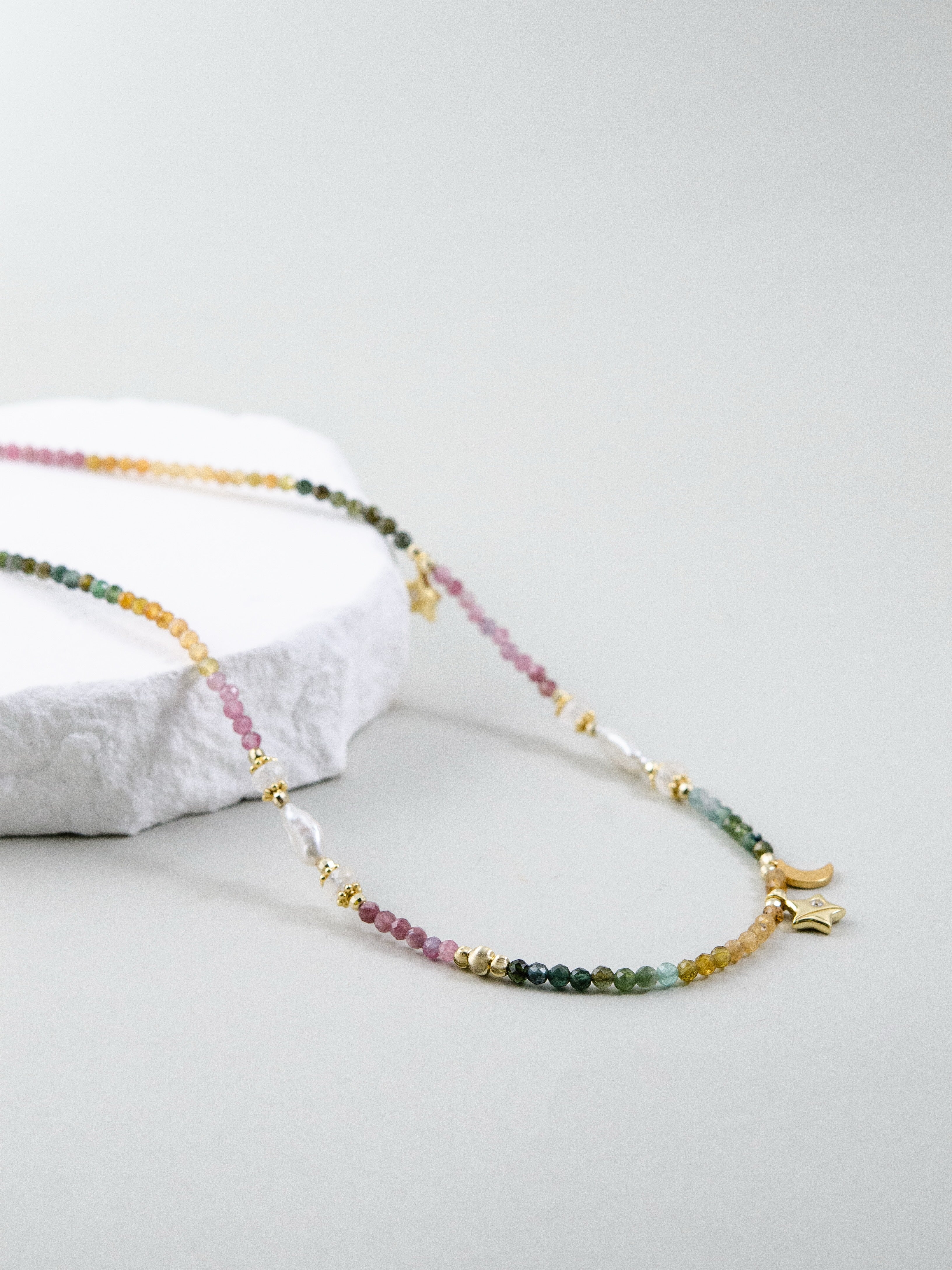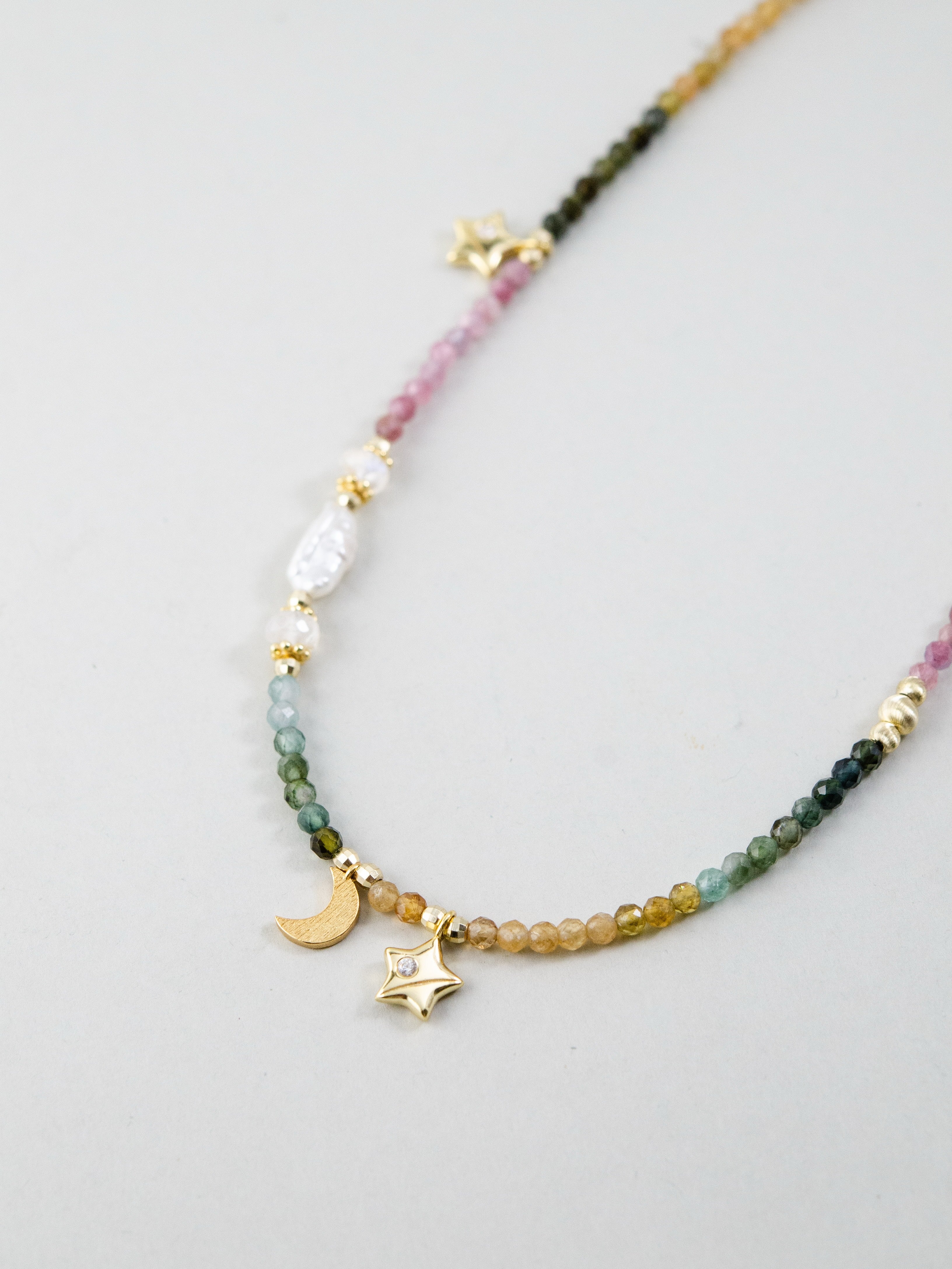 カラフルな天然トルマリンと淡水パールの組み合わせで、優しく豊かな色彩を楽しめます。星や月のチャームが揺れるたびにファンタジックな雰囲気を演出。色・感情・物語性を兼ね備えた、癒し系アクセサリーです。
