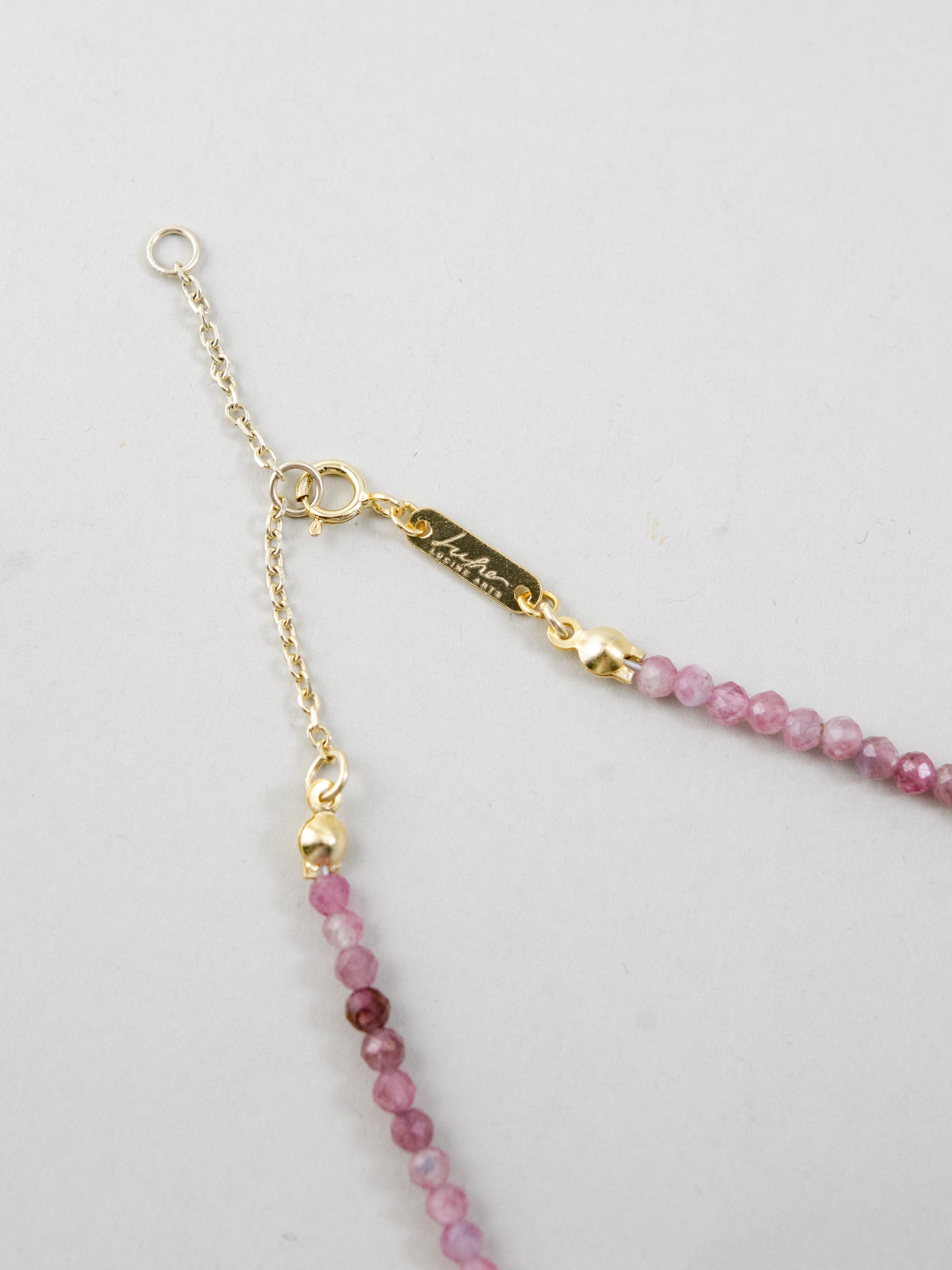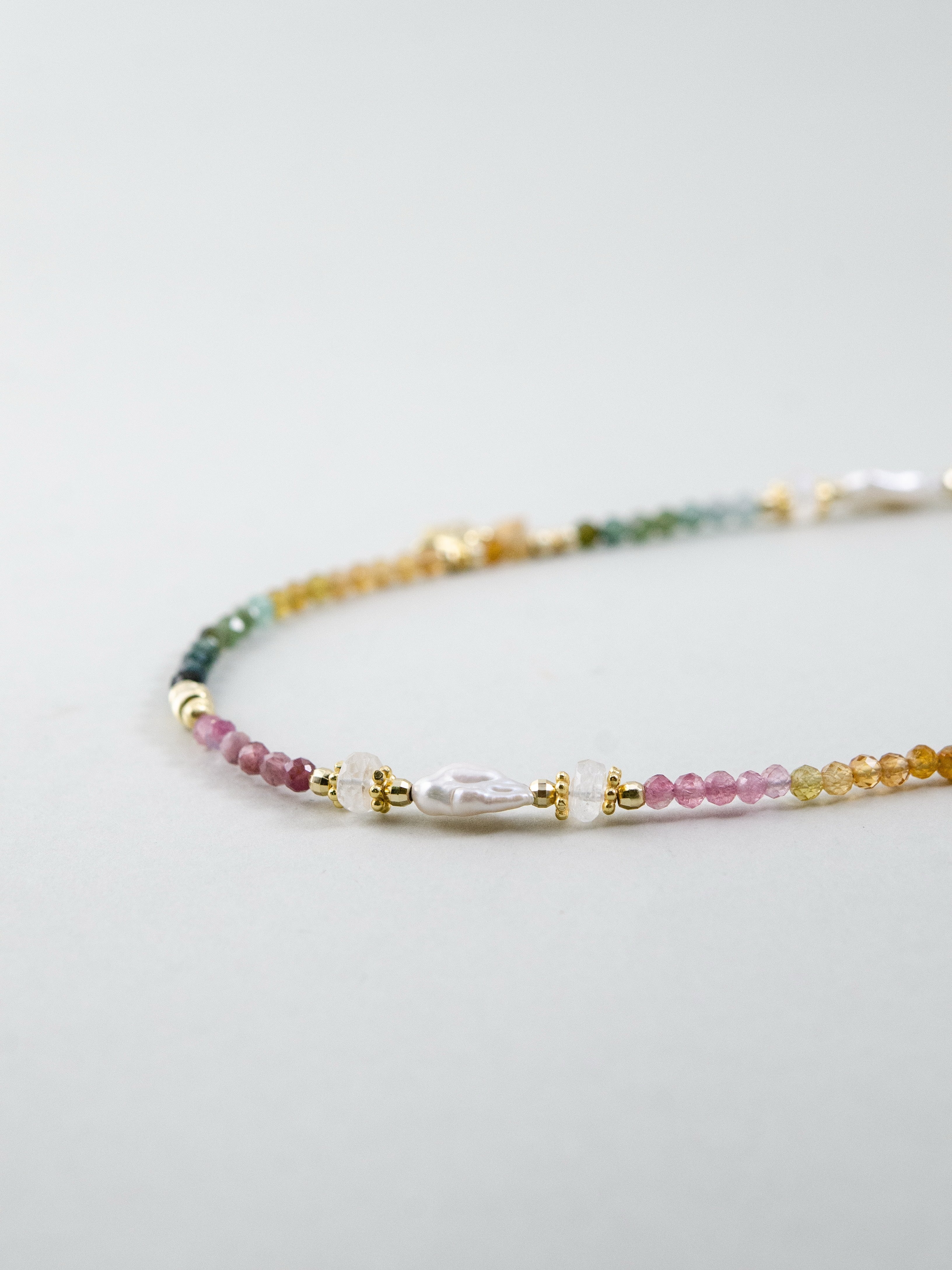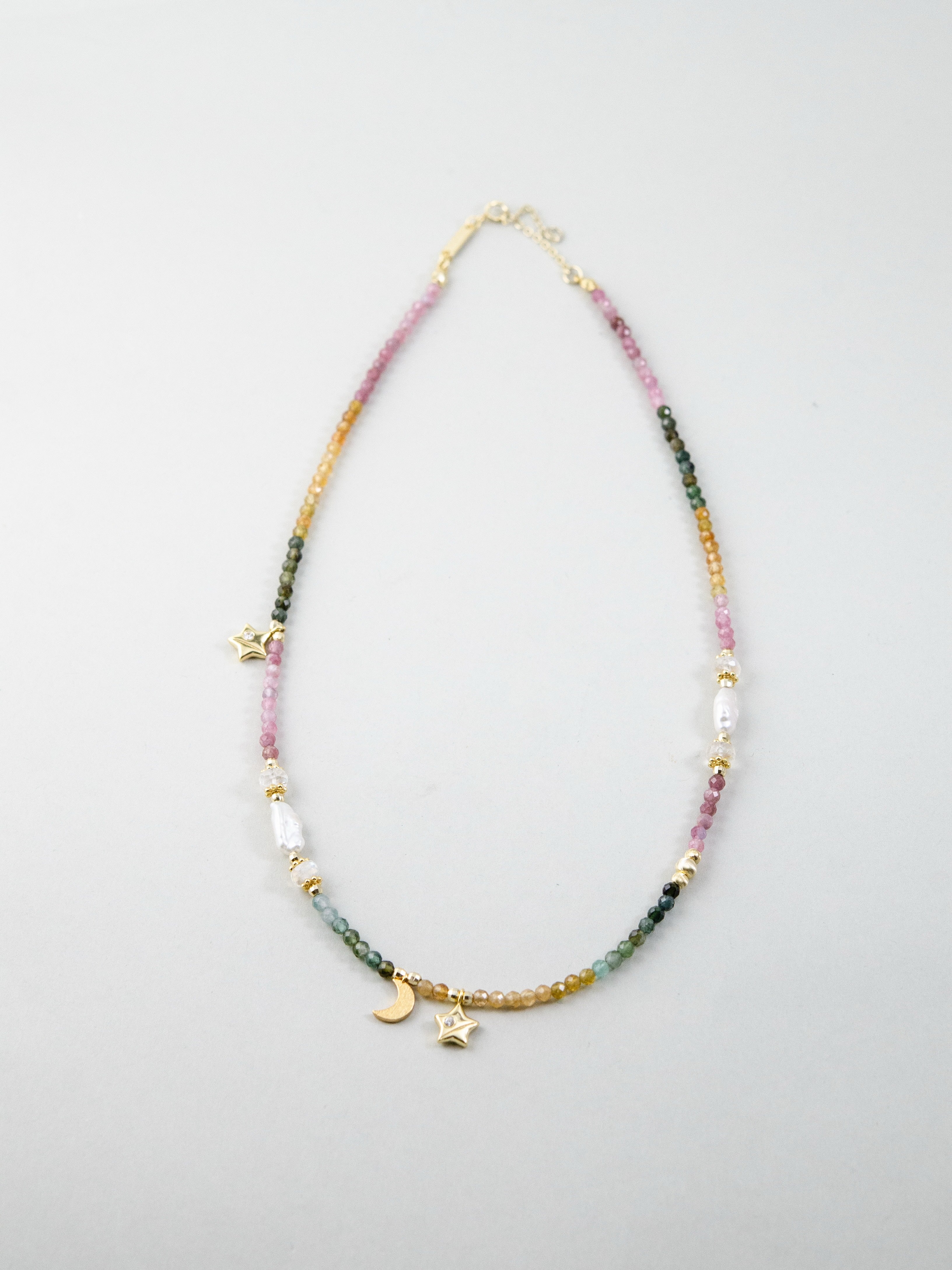 カラフルなトルマリンをベースに、ユニークな形の淡水パールと月・星・イニシャルのチャームを組み合わせた、遊び心あふれるネックレスです。夜空のような輝きと、どこか懐かしさを感じさせるやさしい色合いが胸元でやさしく揺れ、「色と願いを紡ぐ」というテーマのもと、日常に小さなときめきを届けてくれます。