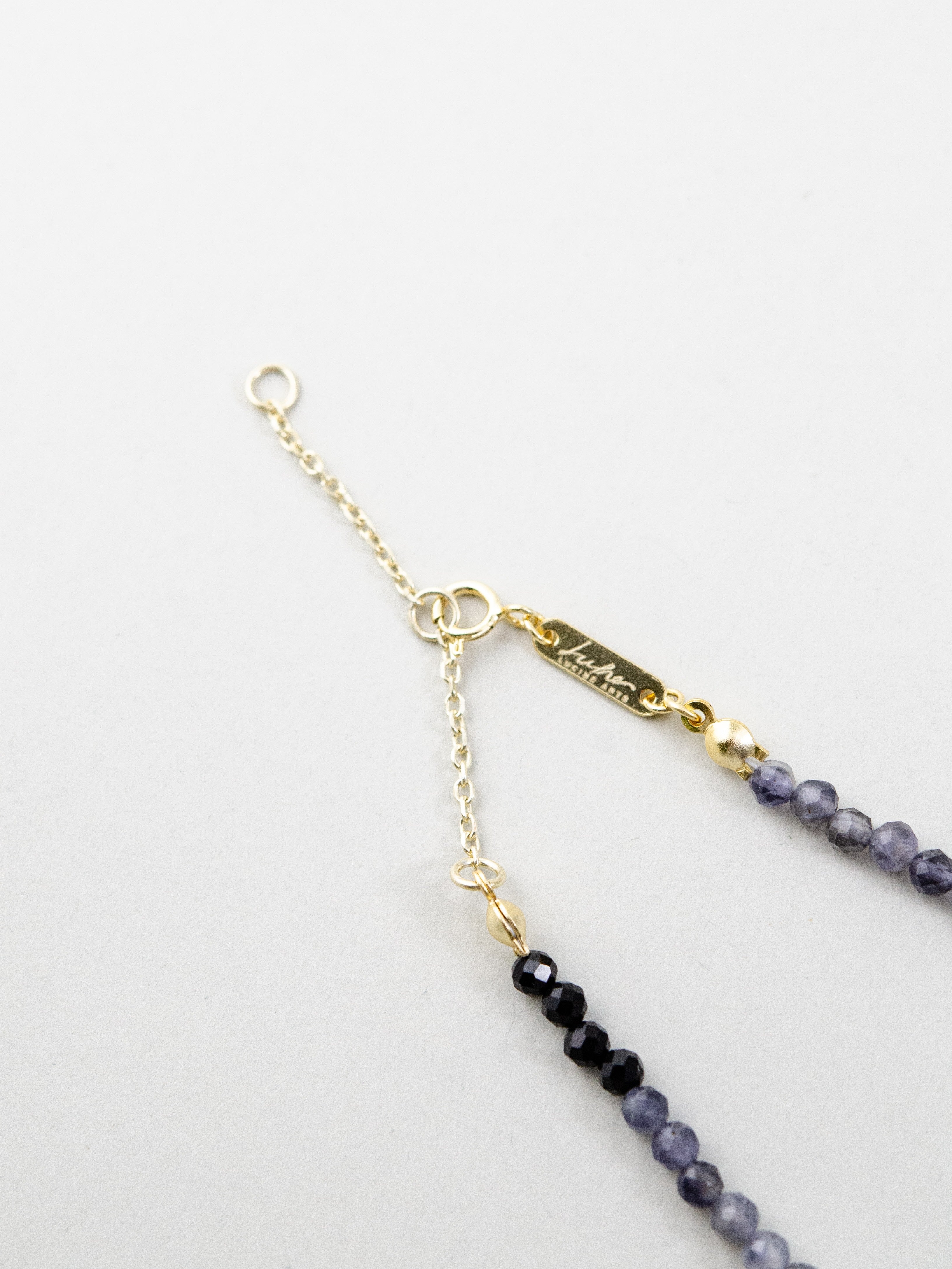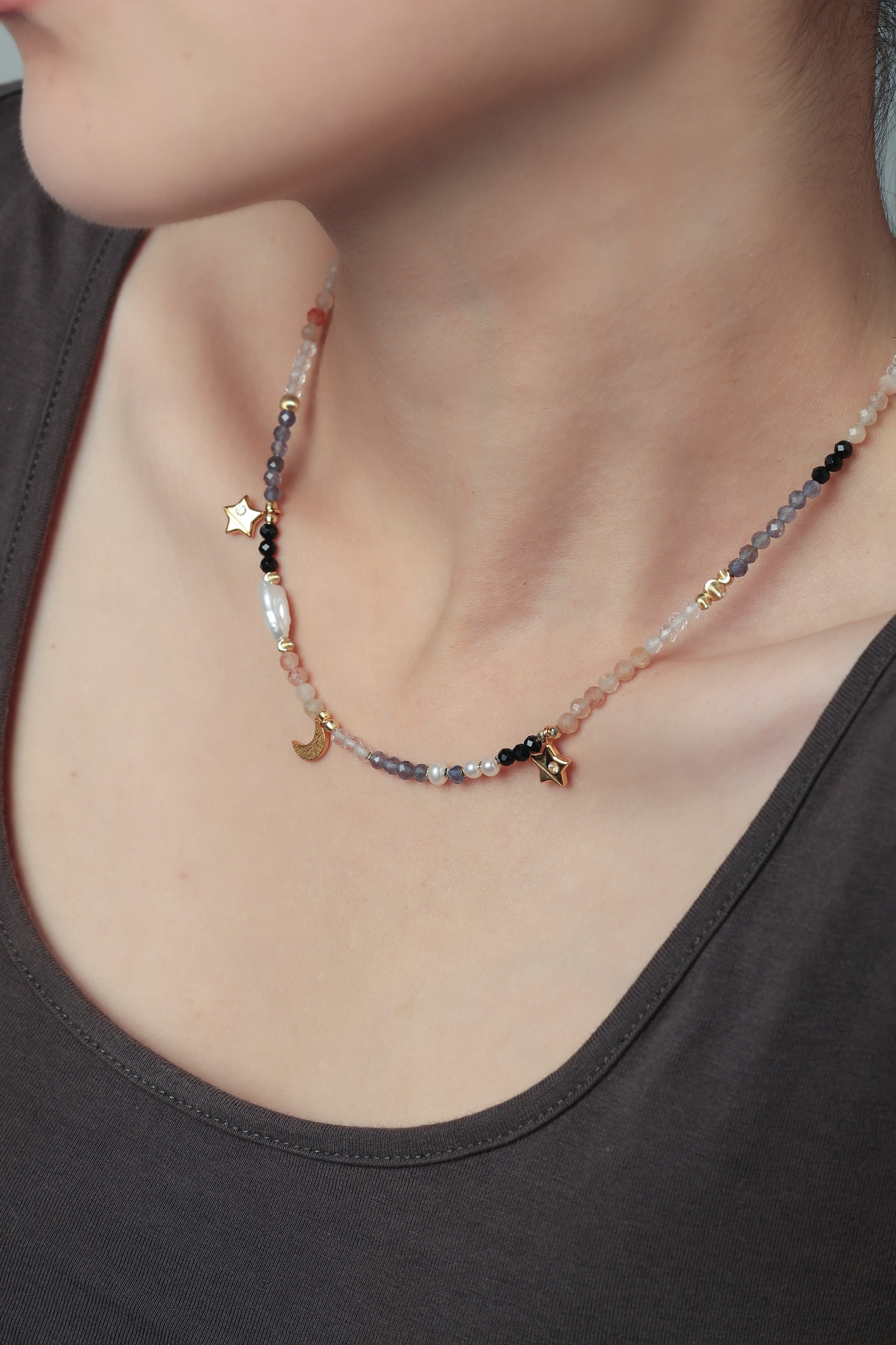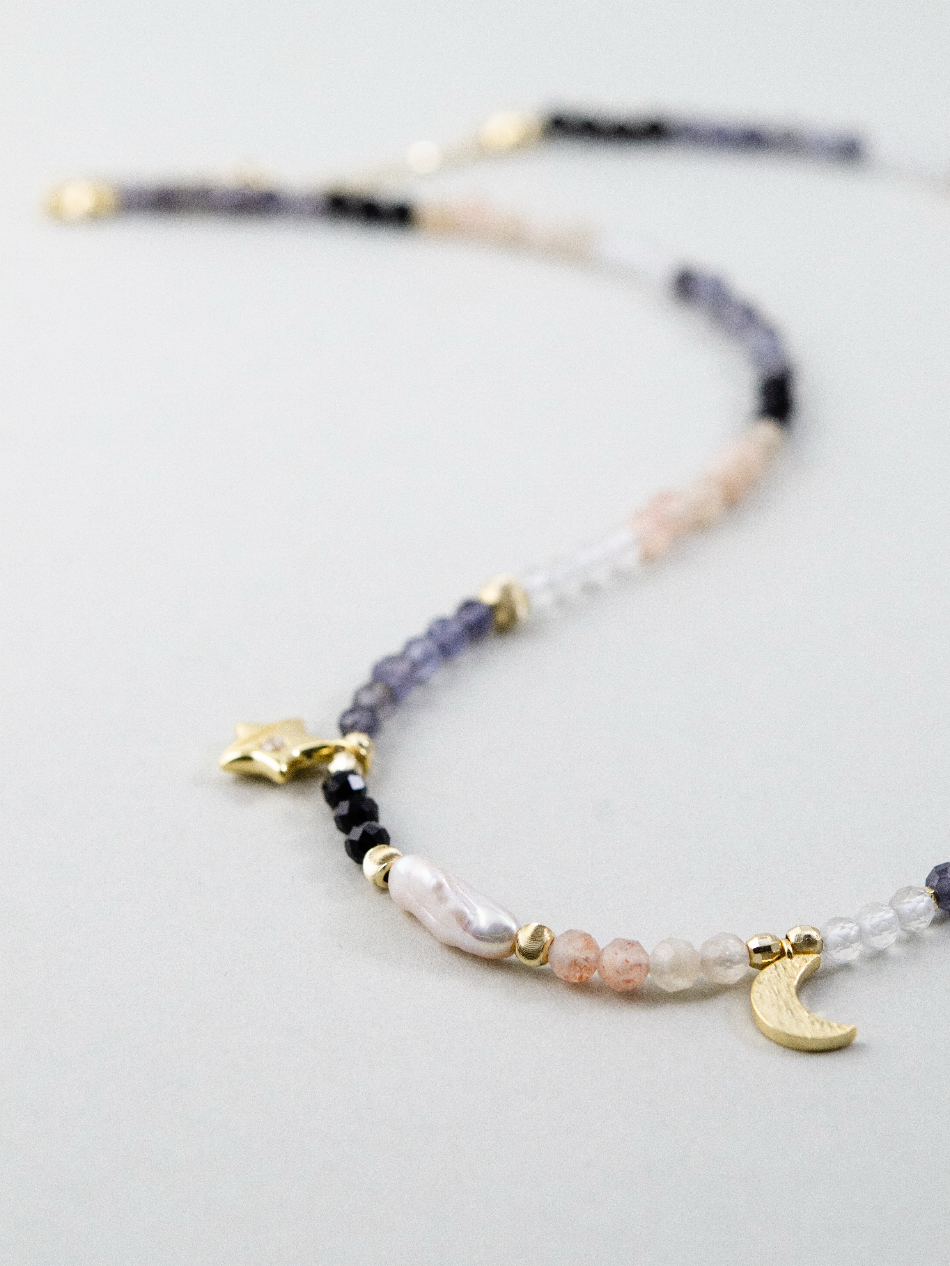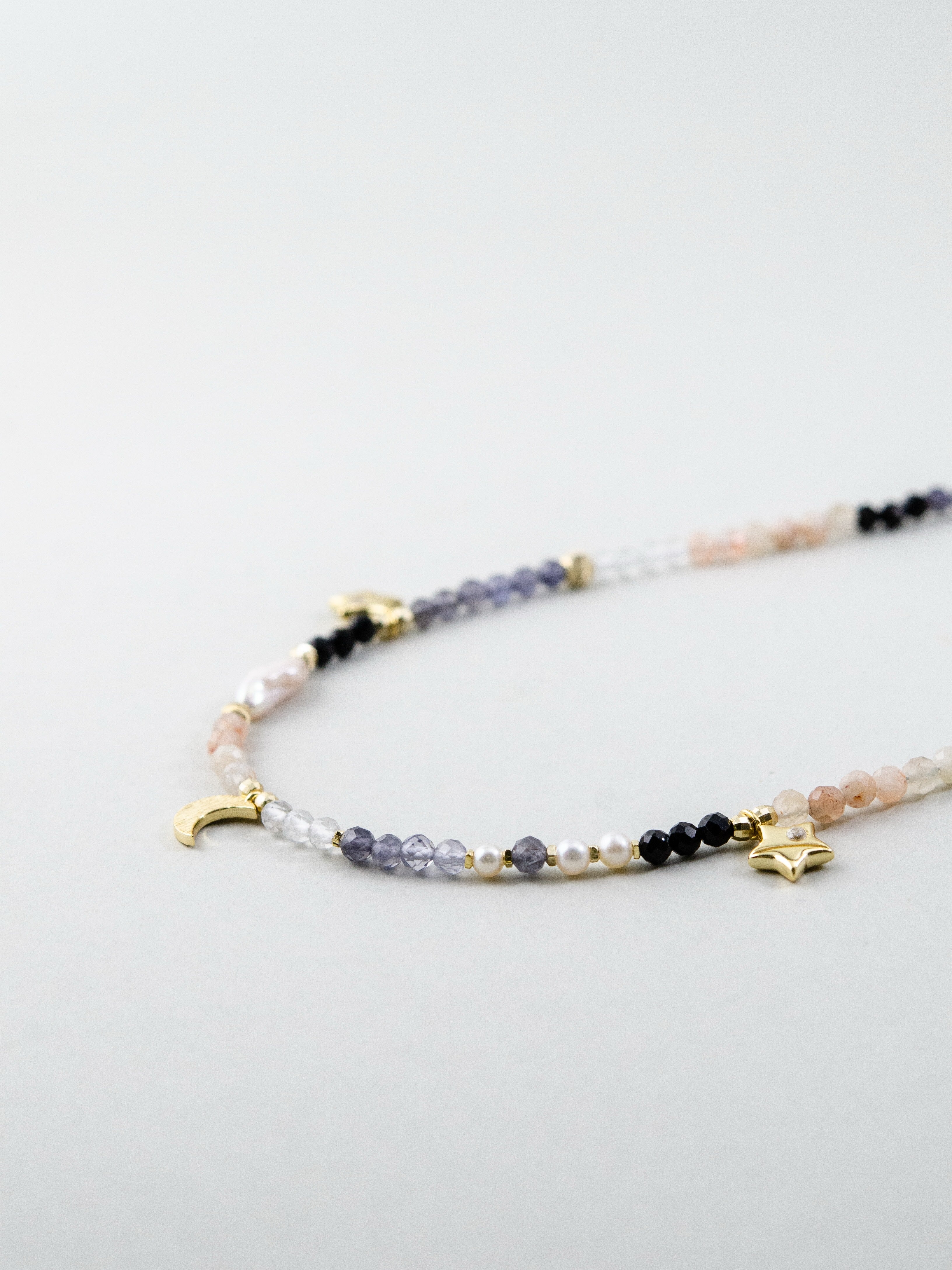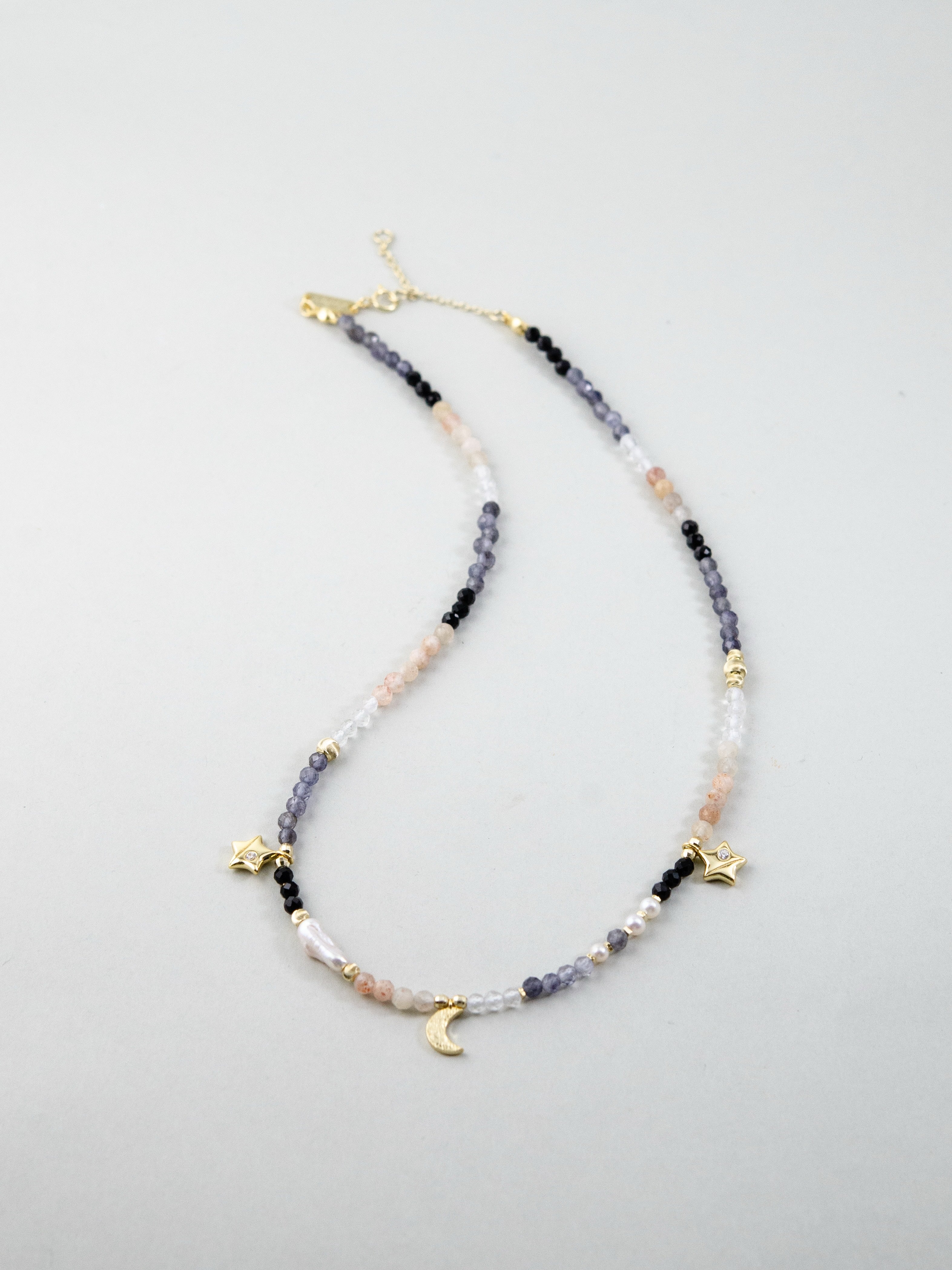 澄んだ水晶をベースに、内なる直感を導くアイオライトと、やさしい愛の波動を持つインカローズを組み合わせたネックレスです。星や月のチャームがさりげなく煌めき、まるで夜空に輝く星々のよう。静けさと優しさを引き出す、心を守るお守りジュエリーです。