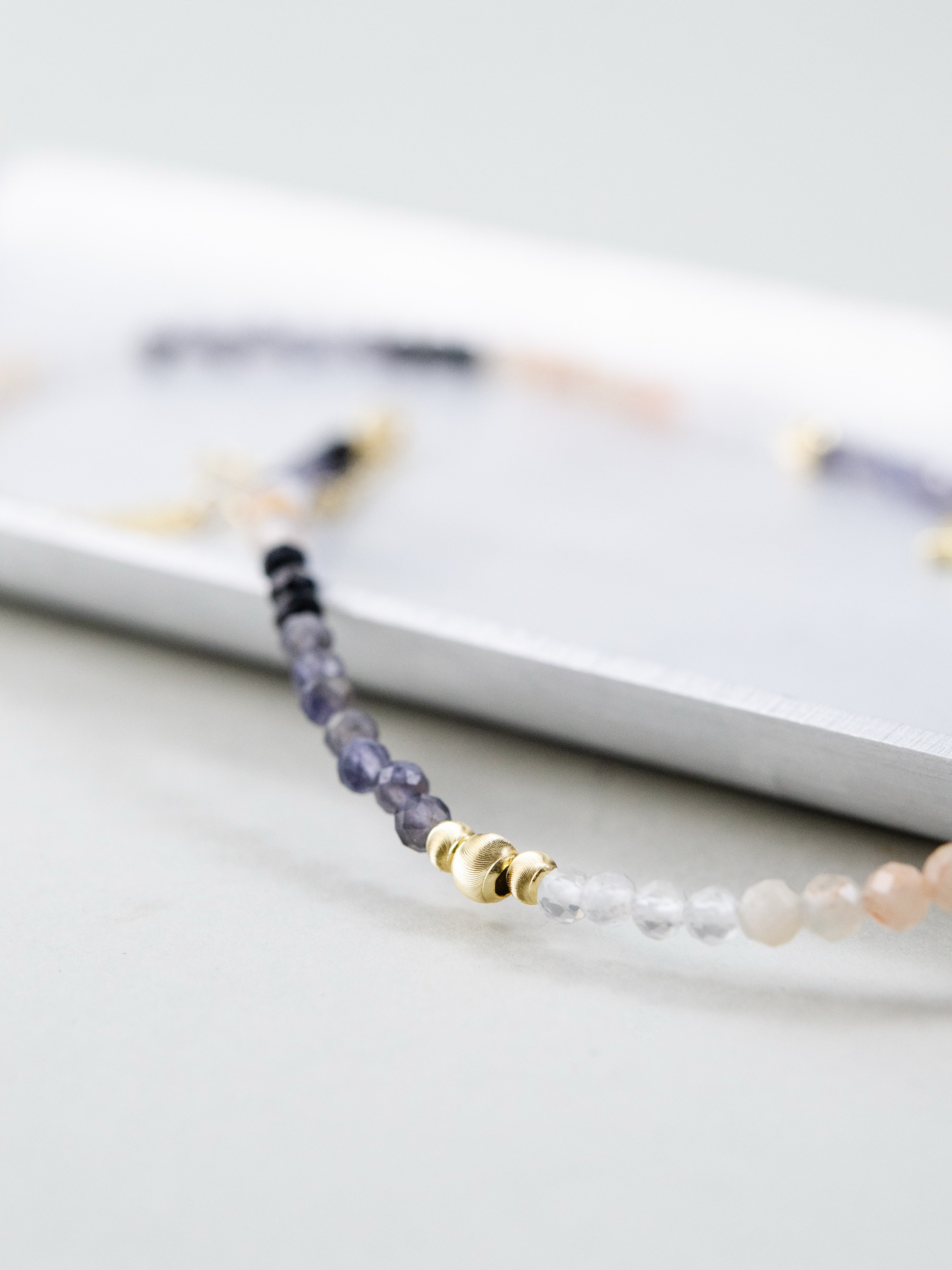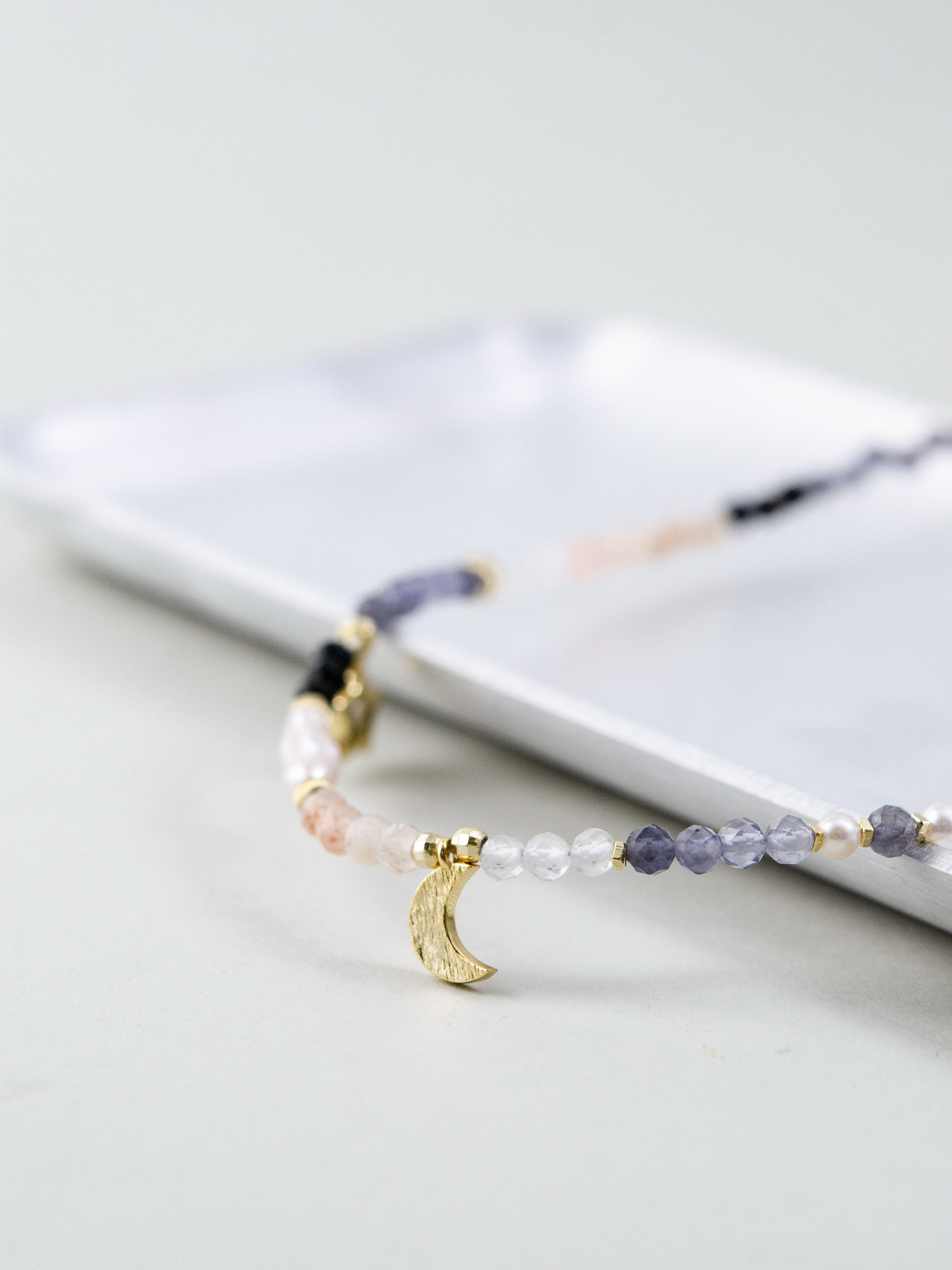 アイオライトが直感力と冷静な判断をサポートし、インカローズが愛と優しさを引き出して人間関係を円滑に。ゴールドの月&星チャームがアクセントとなり、神秘的で華やかな雰囲気を演出。日常から特別なシーンまで幅広く活躍する一本です。