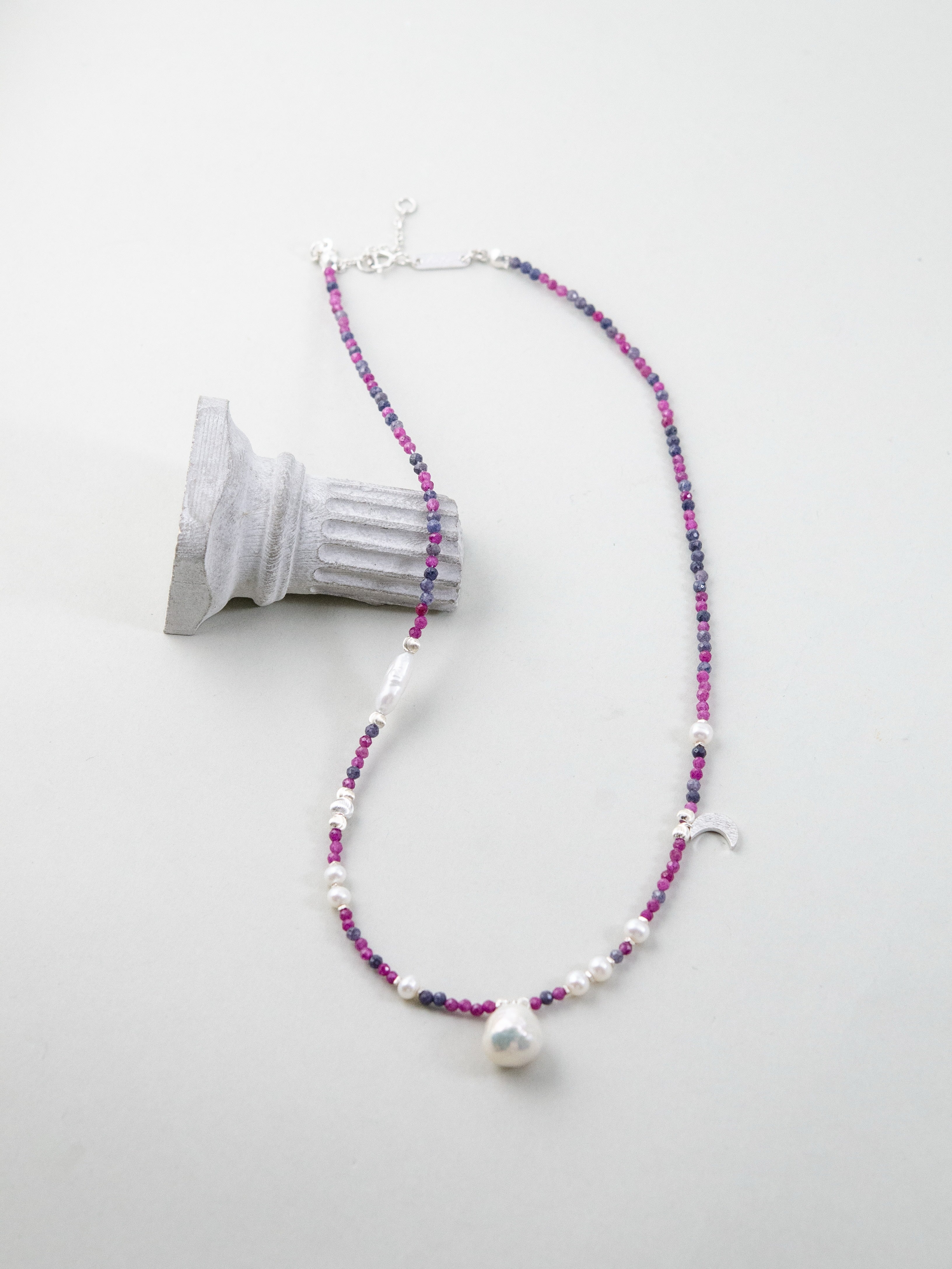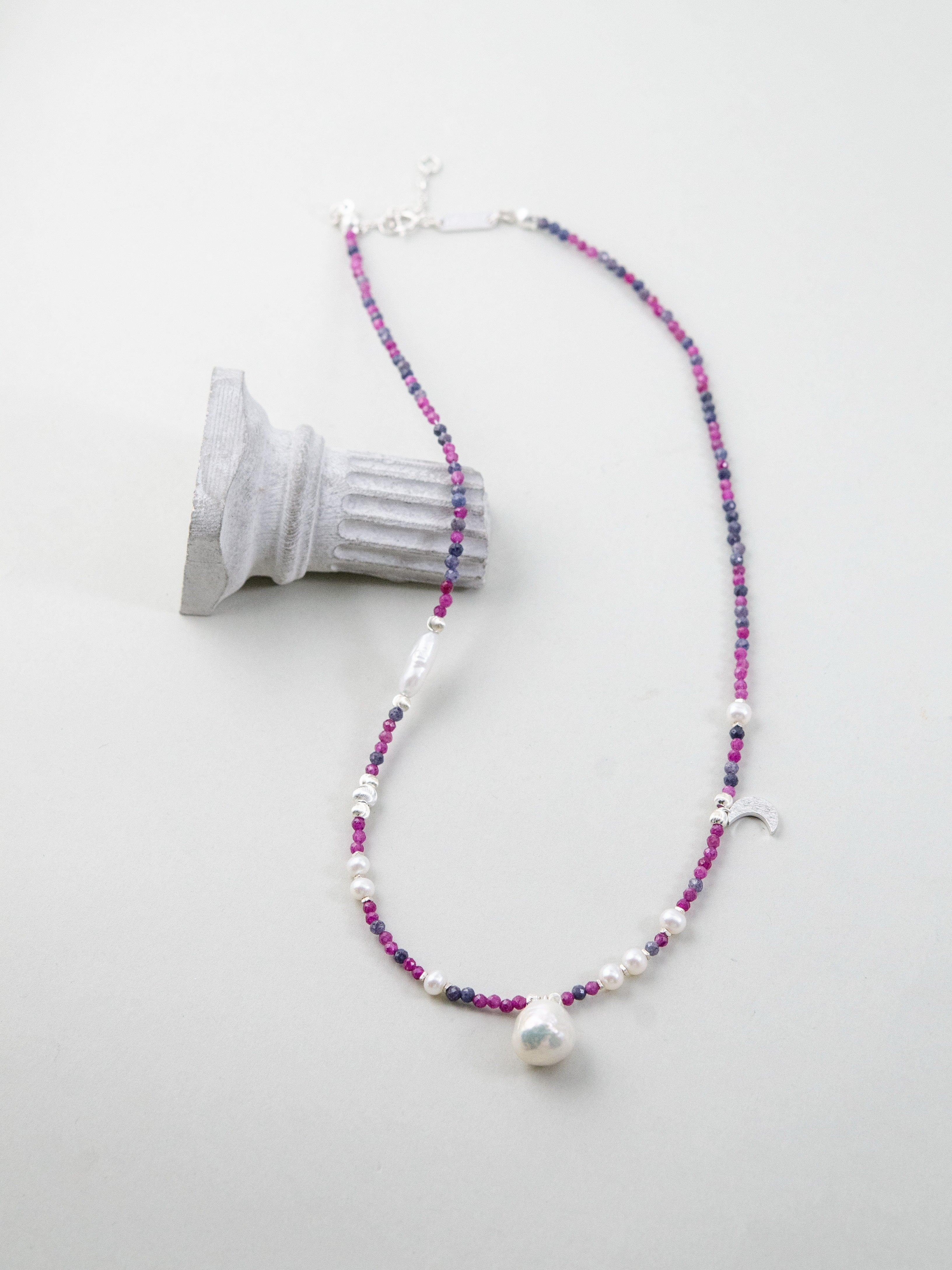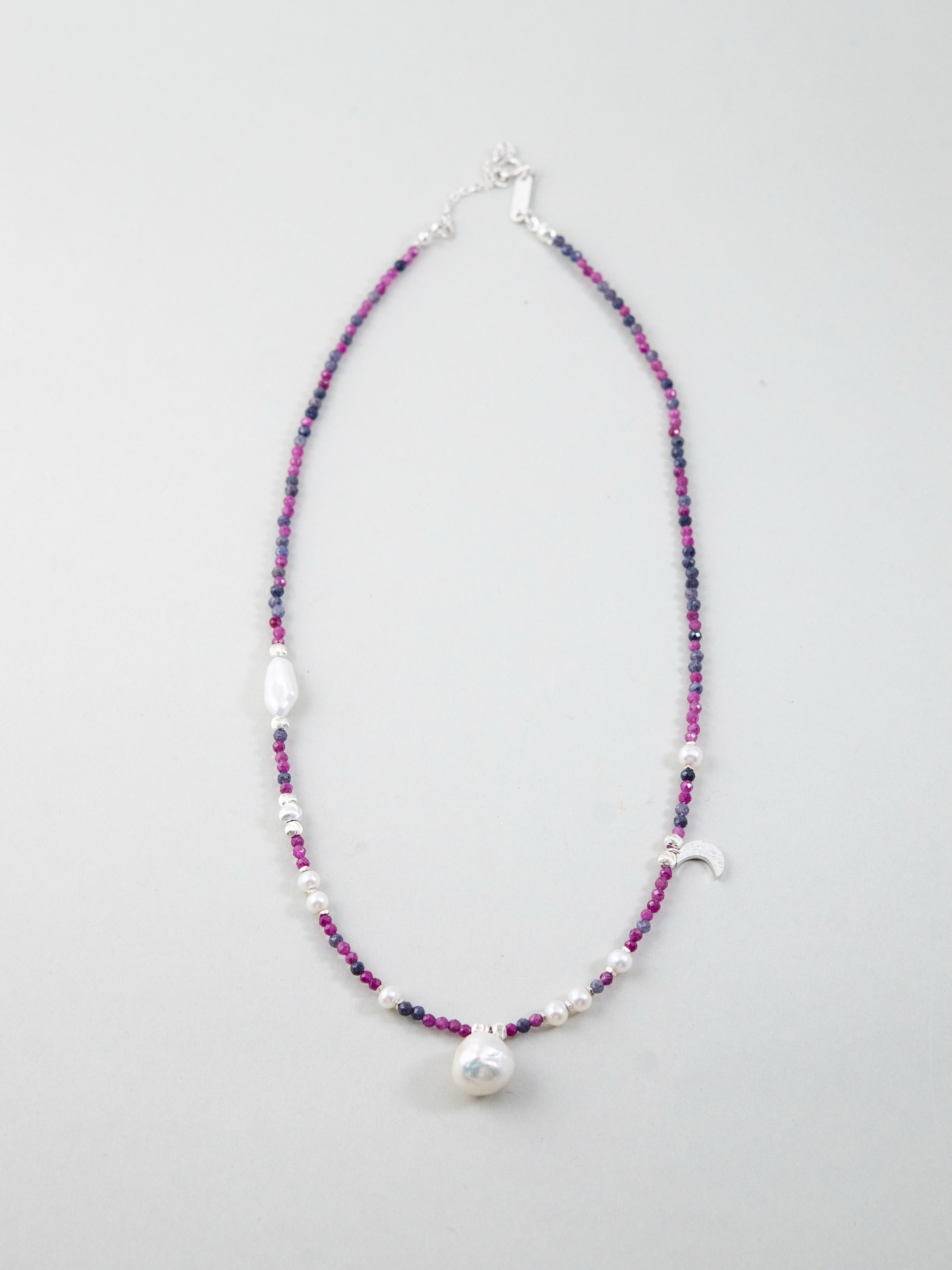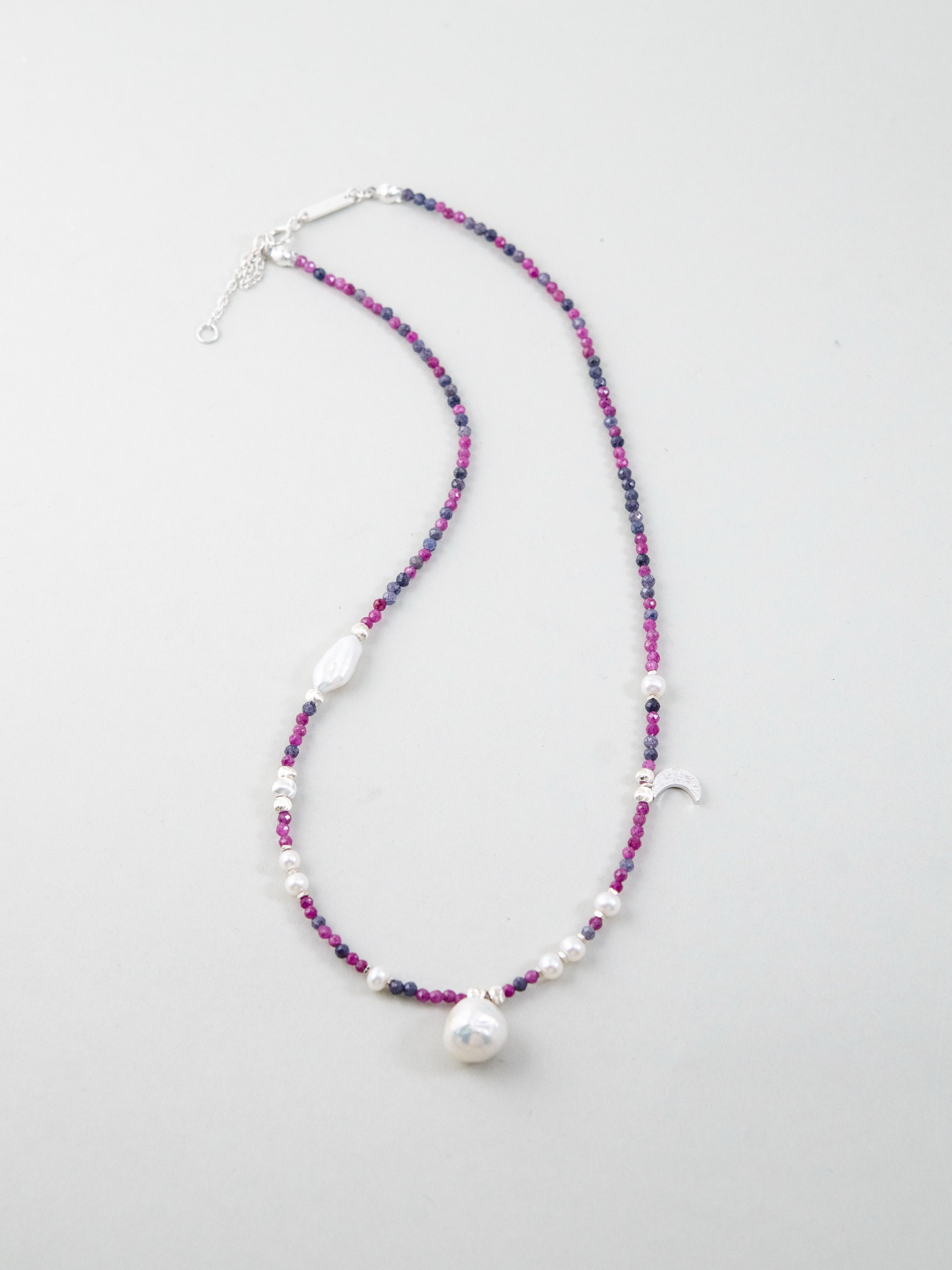 赤とブルーが交差するバイカラーサファイアを贅沢に使用したネックレスです。小粒パールとシルバームーンチャームをあわせ、夜空のような幻想的な雰囲気を演出。上品さと個性を兼ね備え、デイリーから特別なシーンまで幅広く活躍します。