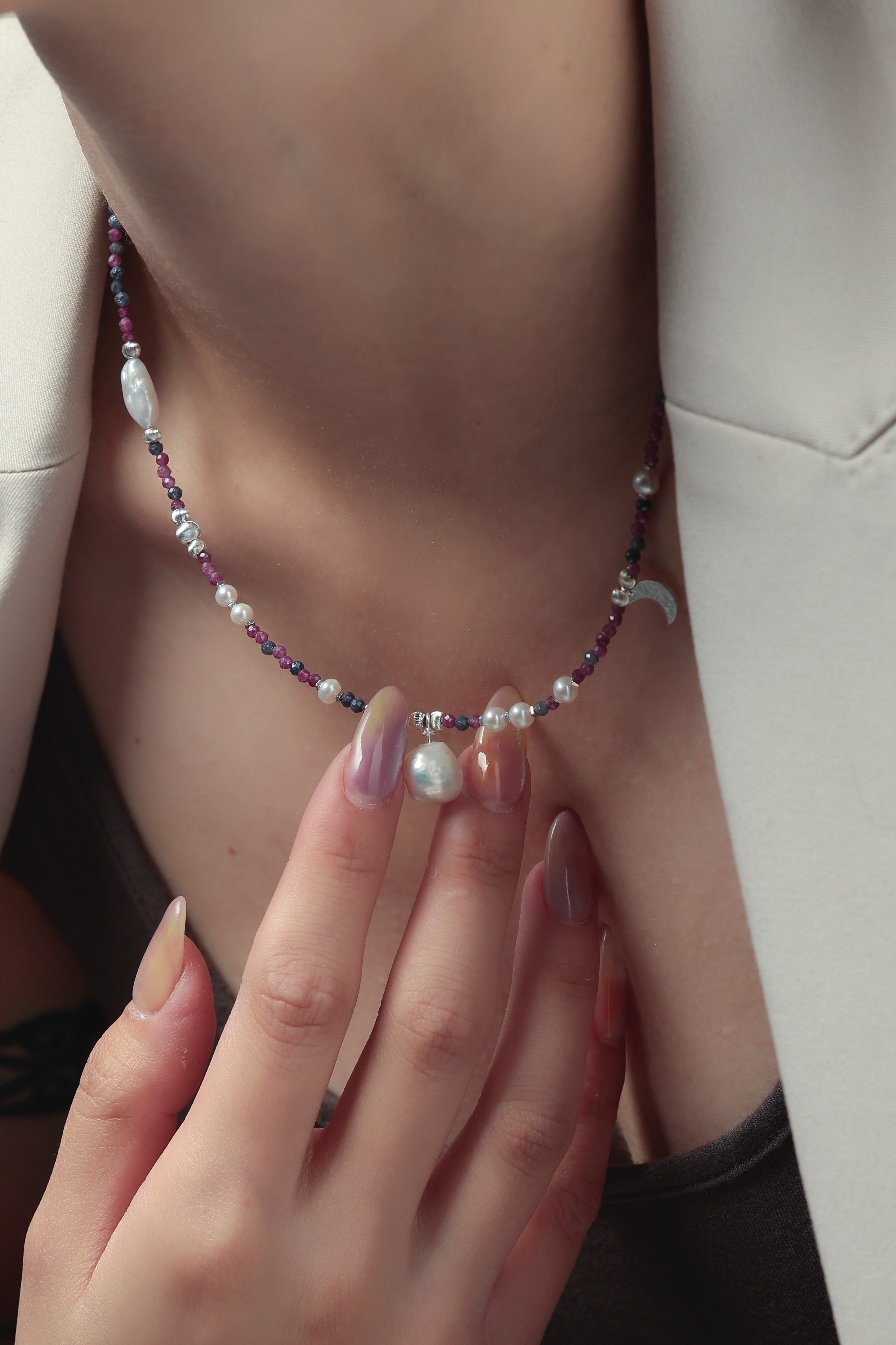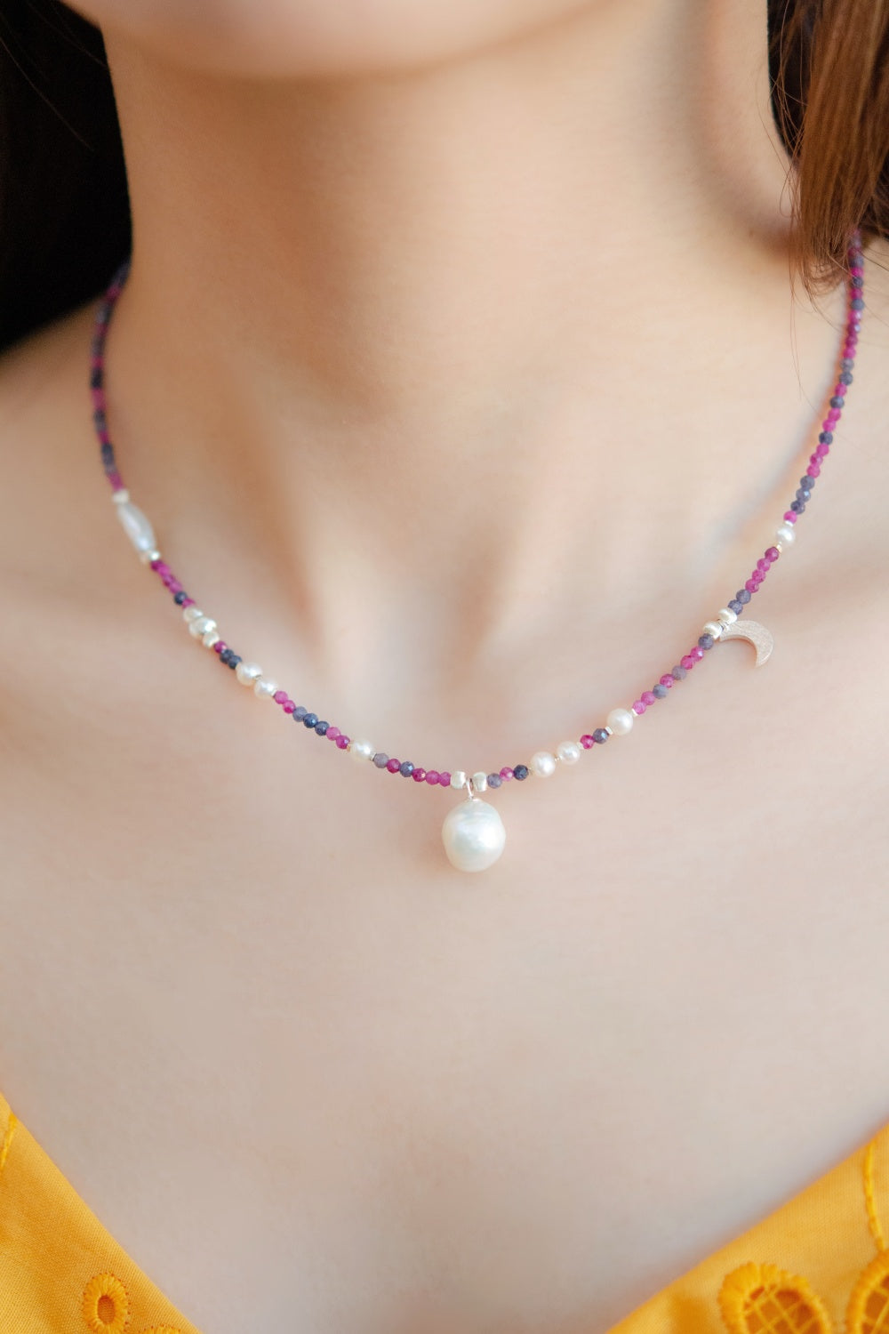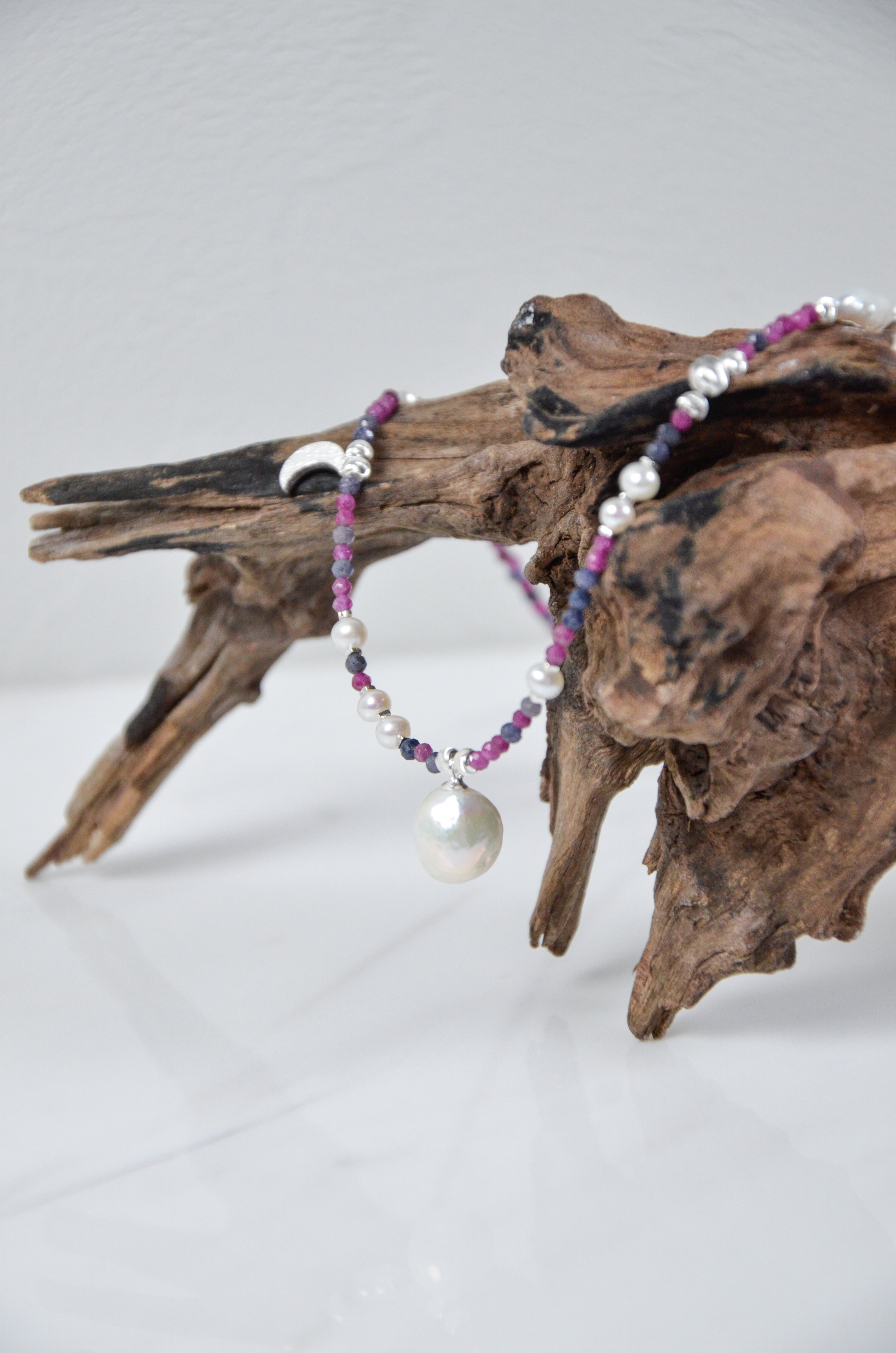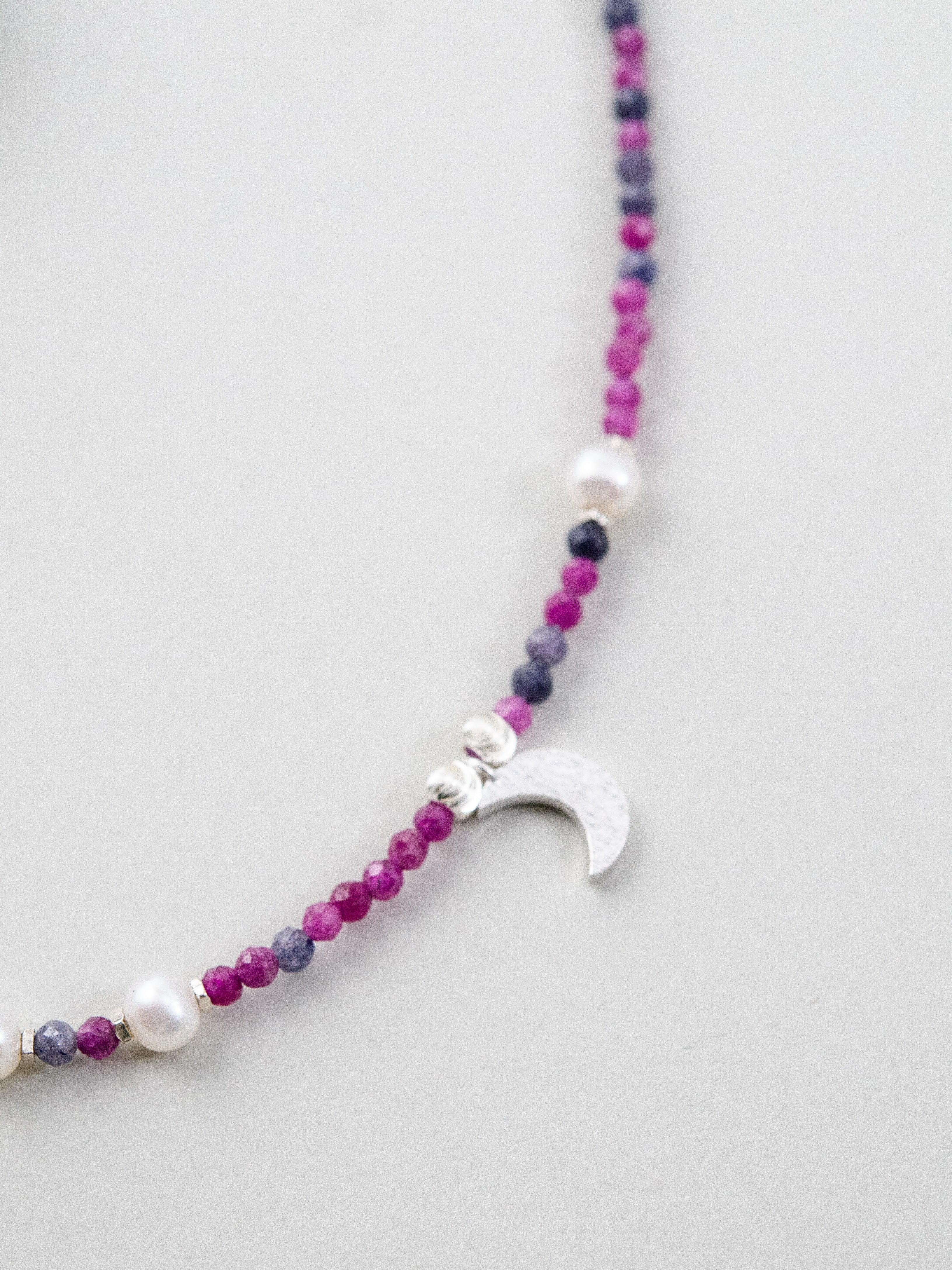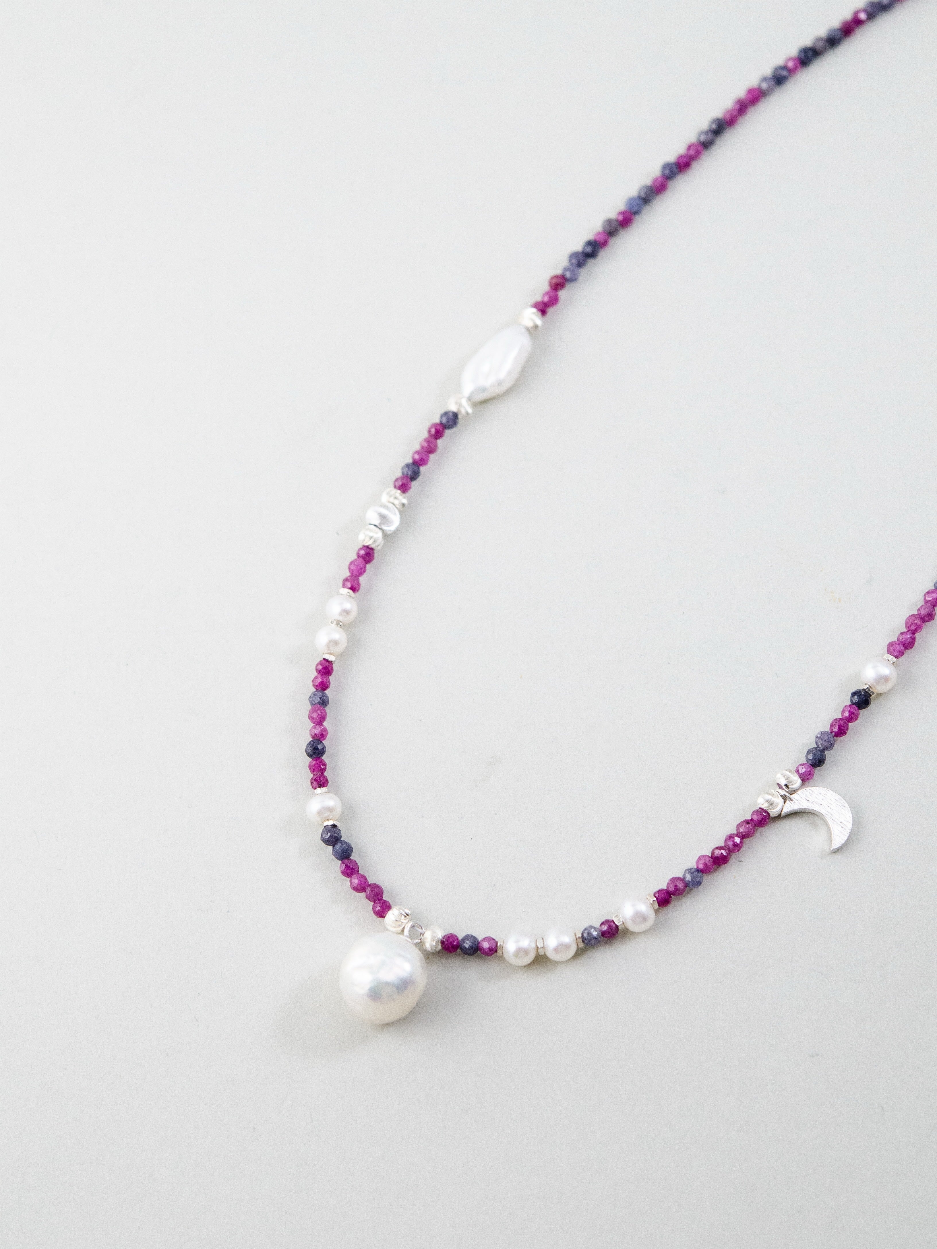 赤とブルーが交差するバイカラーサファイアを贅沢に使用したネックレスです。小粒パールとシルバームーンチャームをあわせ、夜空のような幻想的な雰囲気を演出。上品さと個性を兼ね備え、デイリーから特別なシーンまで幅広く活躍します。