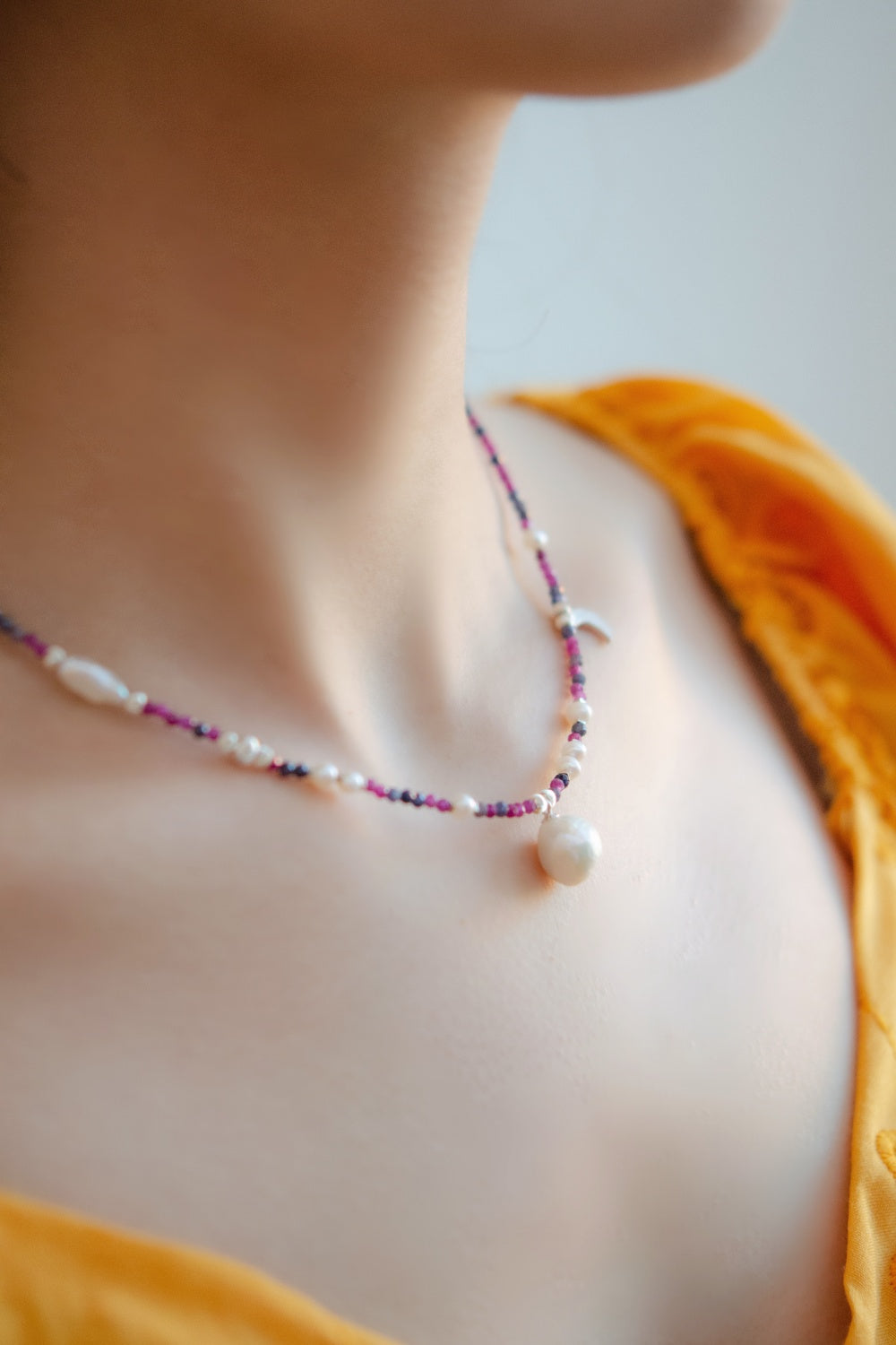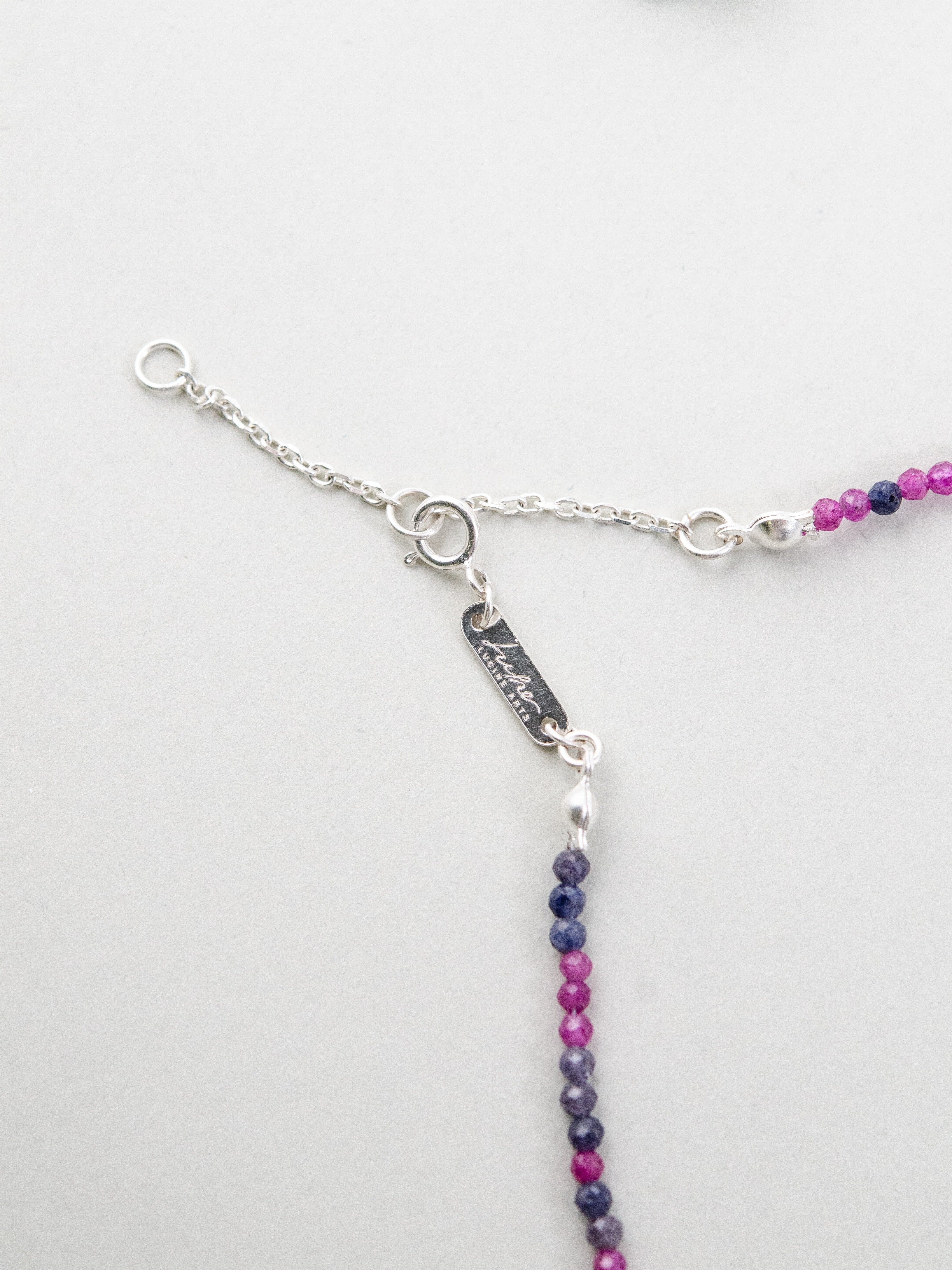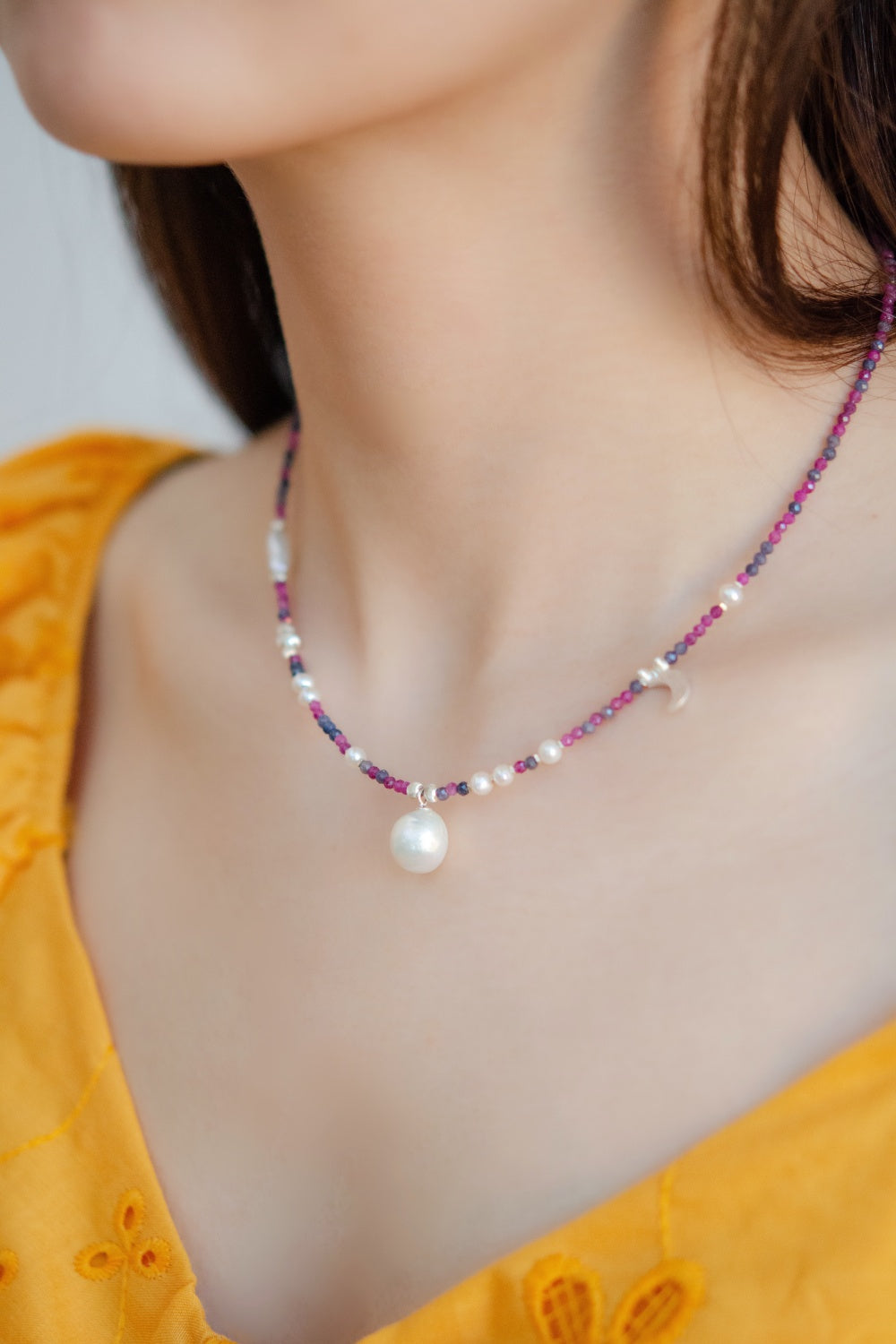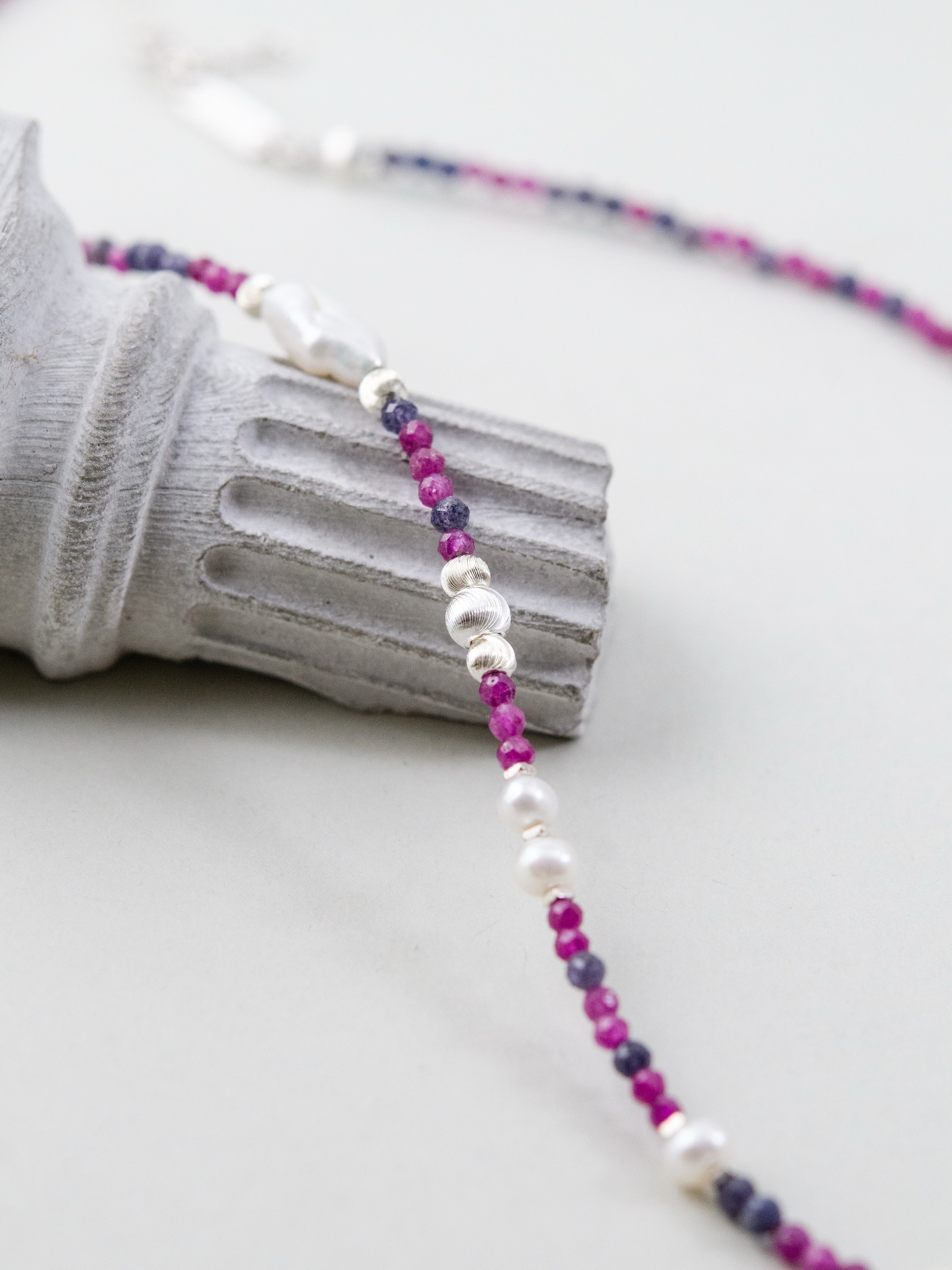 赤とブルーが交差するバイカラーサファイアを贅沢に使用したネックレスです。小粒パールとシルバームーンチャームをあわせ、夜空のような幻想的な雰囲気を演出。上品さと個性を兼ね備え、デイリーから特別なシーンまで幅広く活躍します。