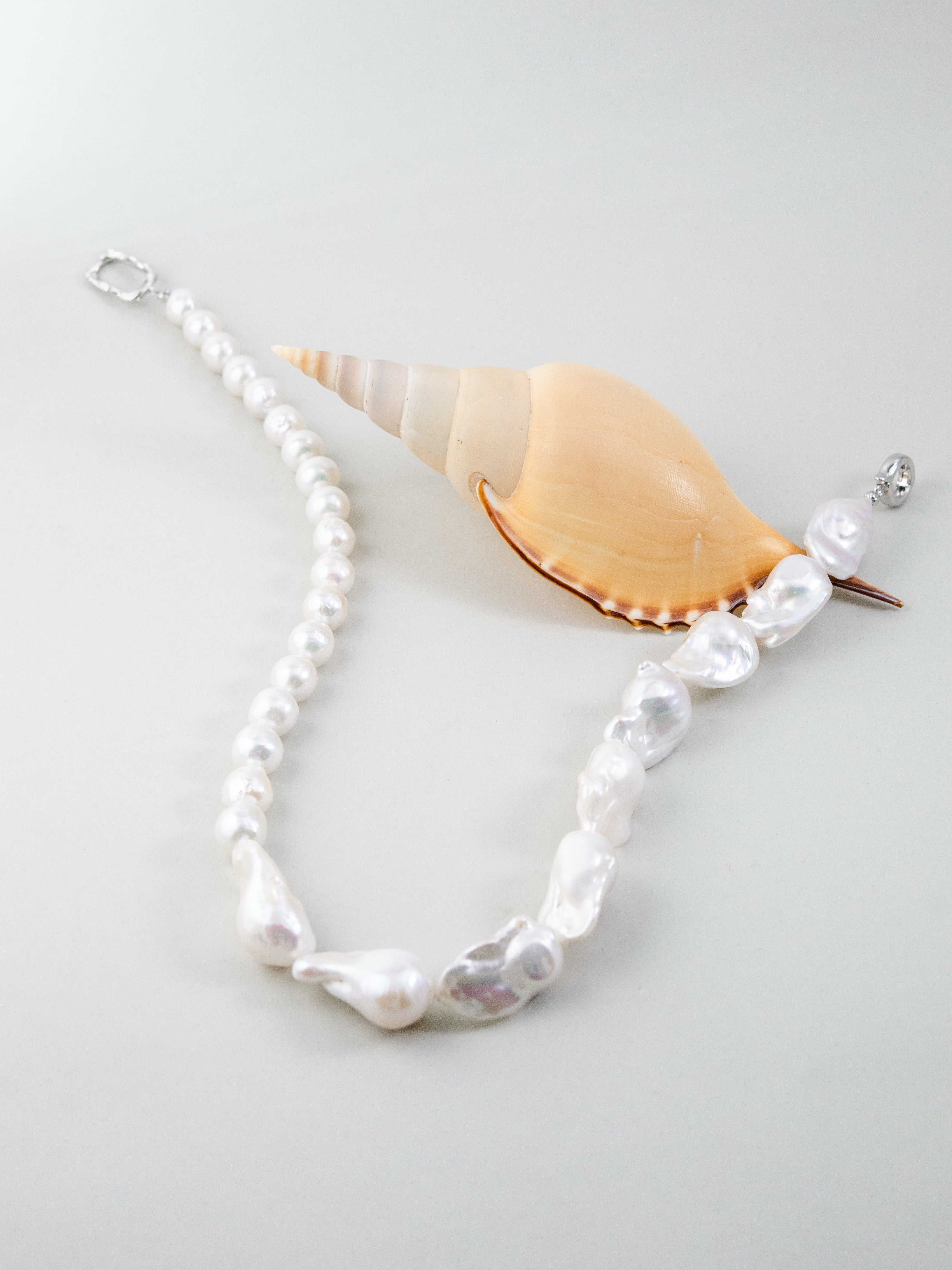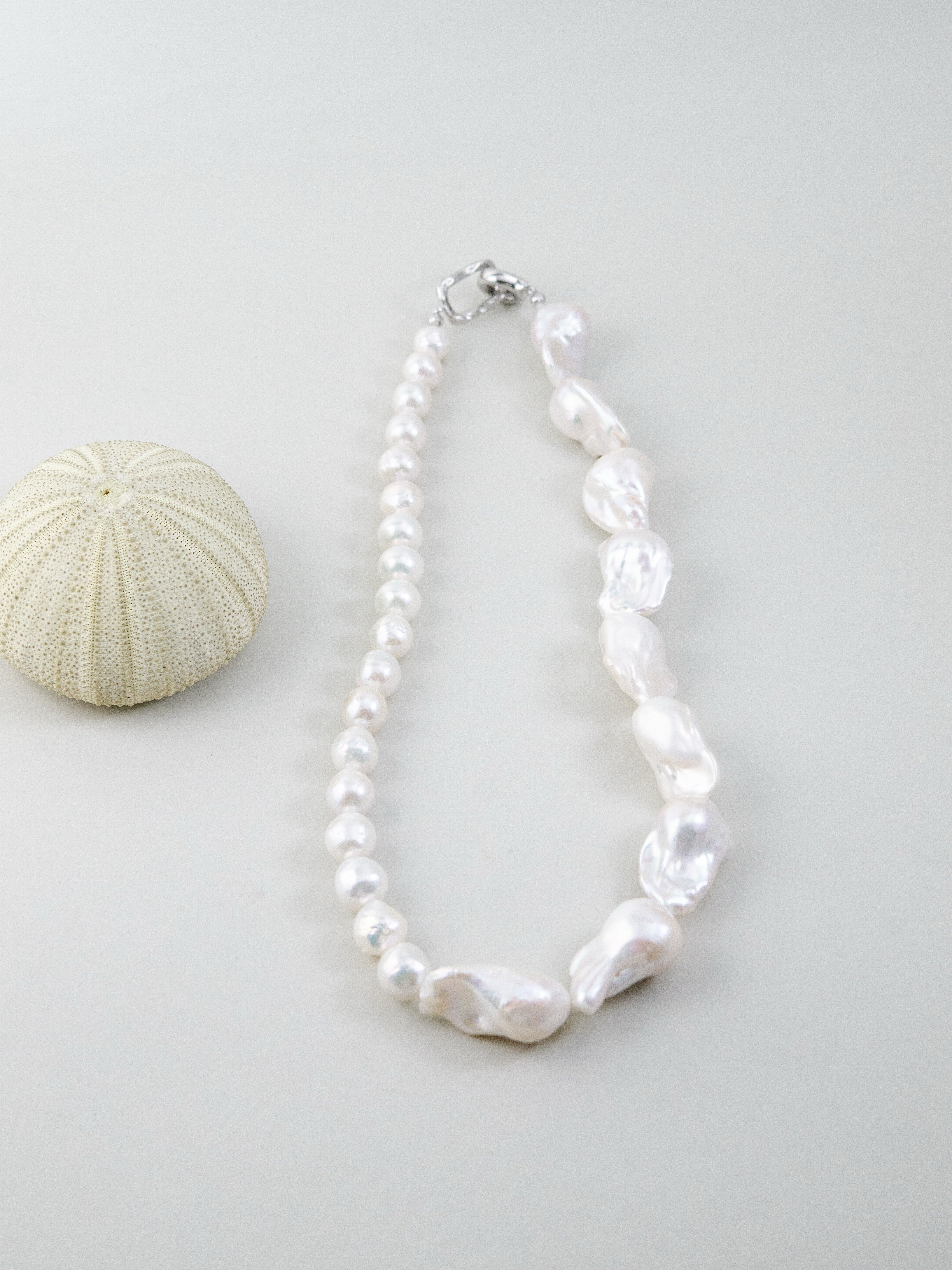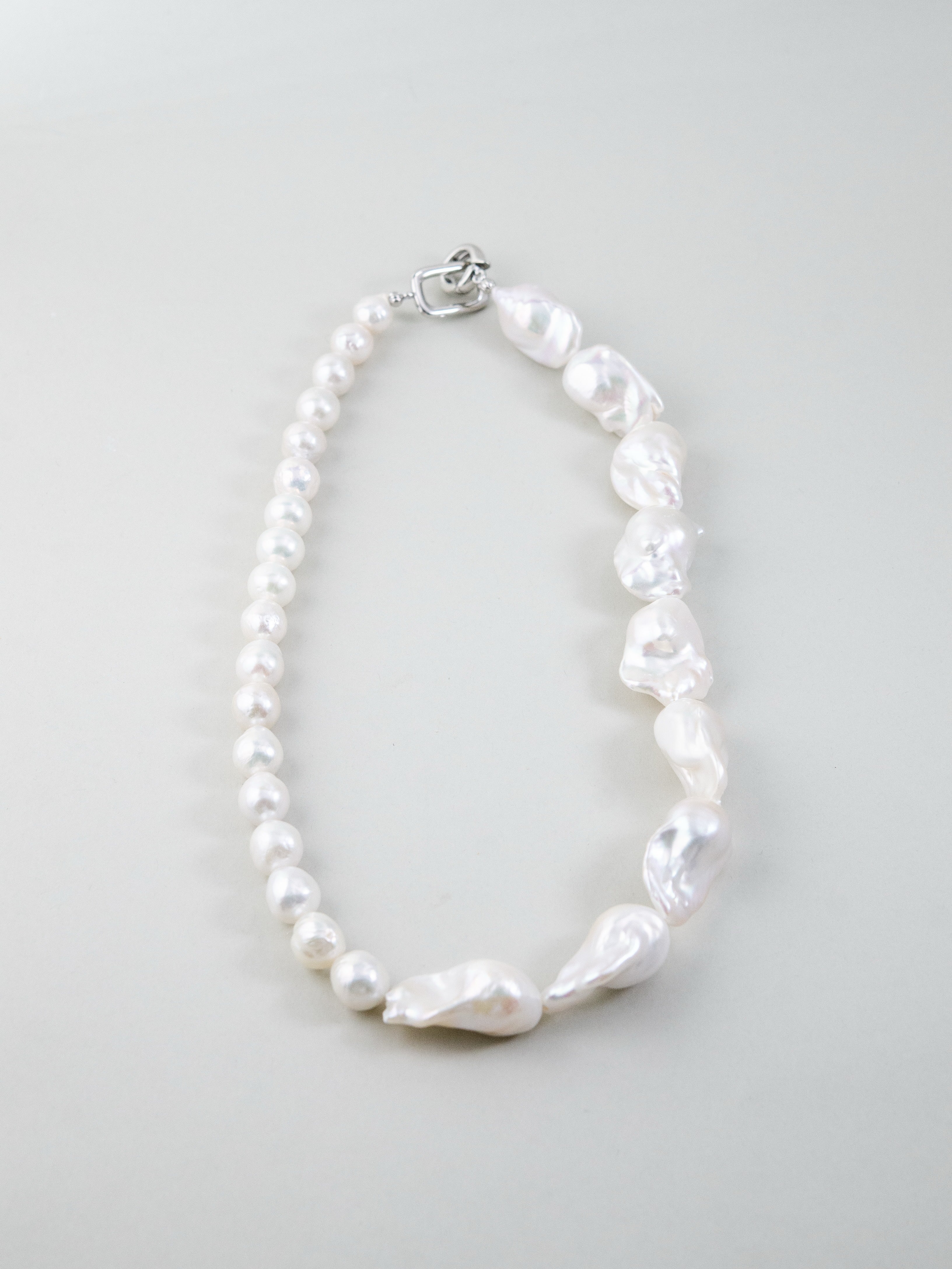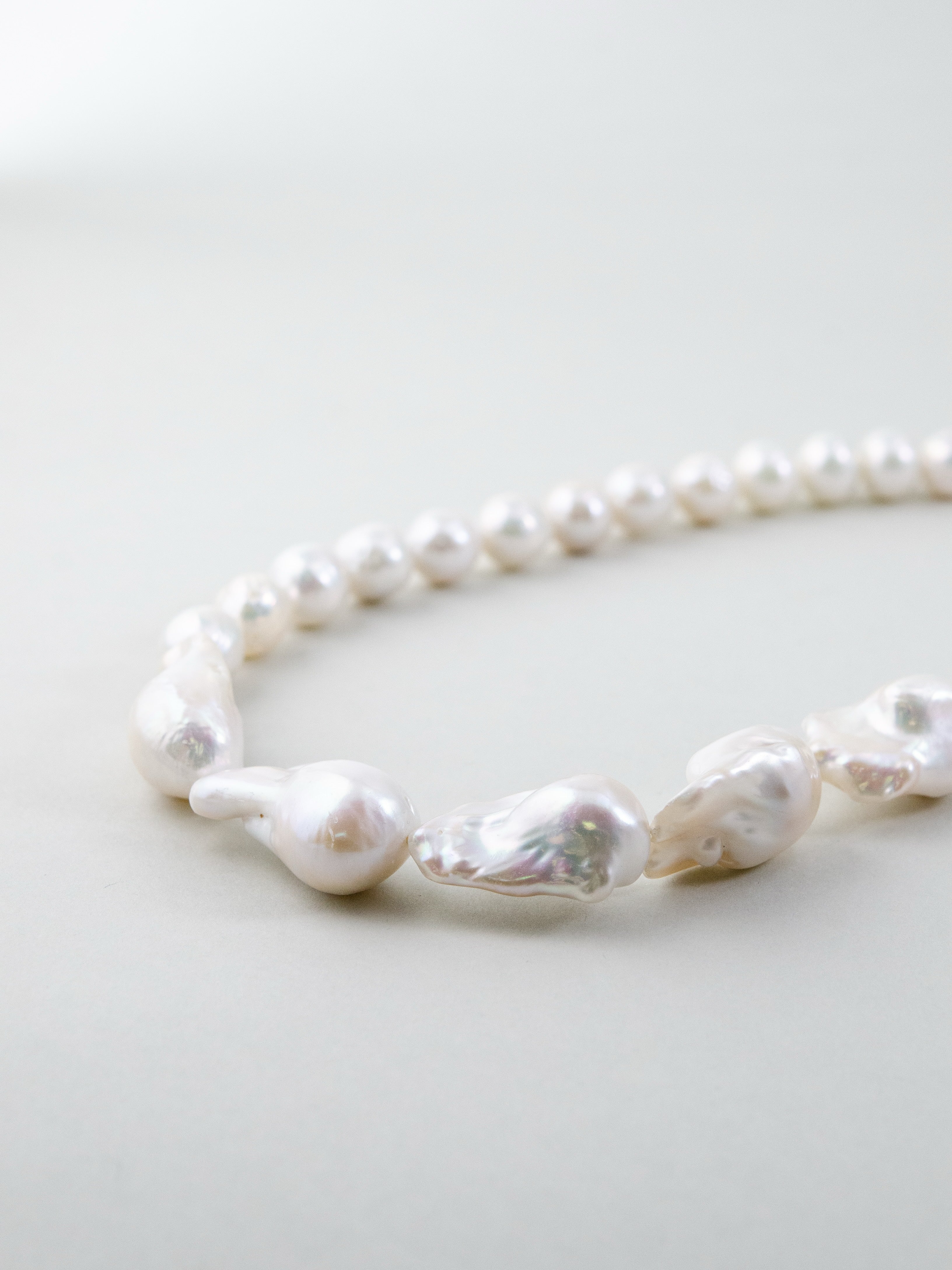 半分は小粒の淡水パール、半分は個性的な形の大ぶりなバロックパールを組み合わせたネックレスです。「純粋」と「守護」の力を持つとされるパールは、心を清らかに保ち、人間関係に優しさと調和をもたらすとも言われています。