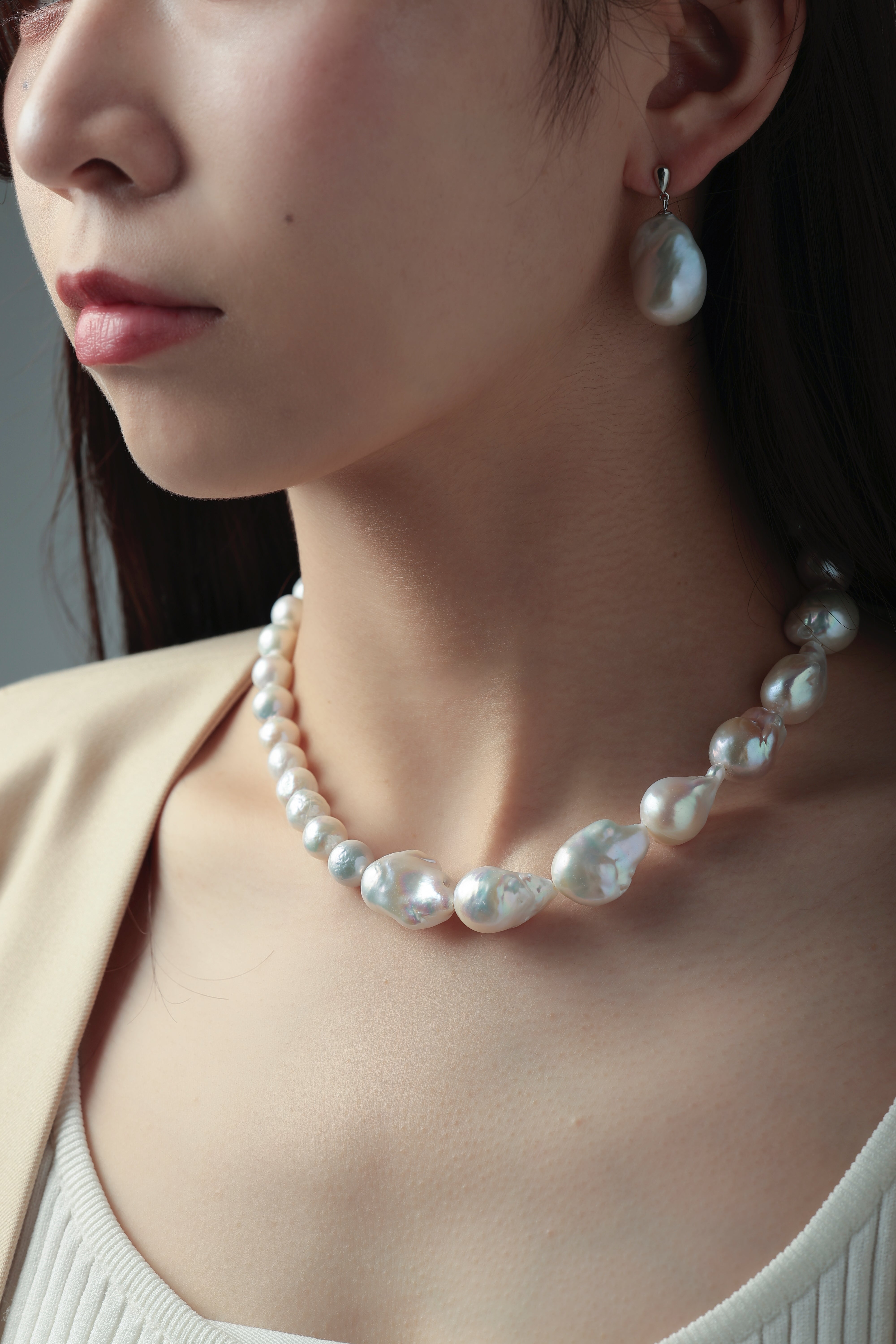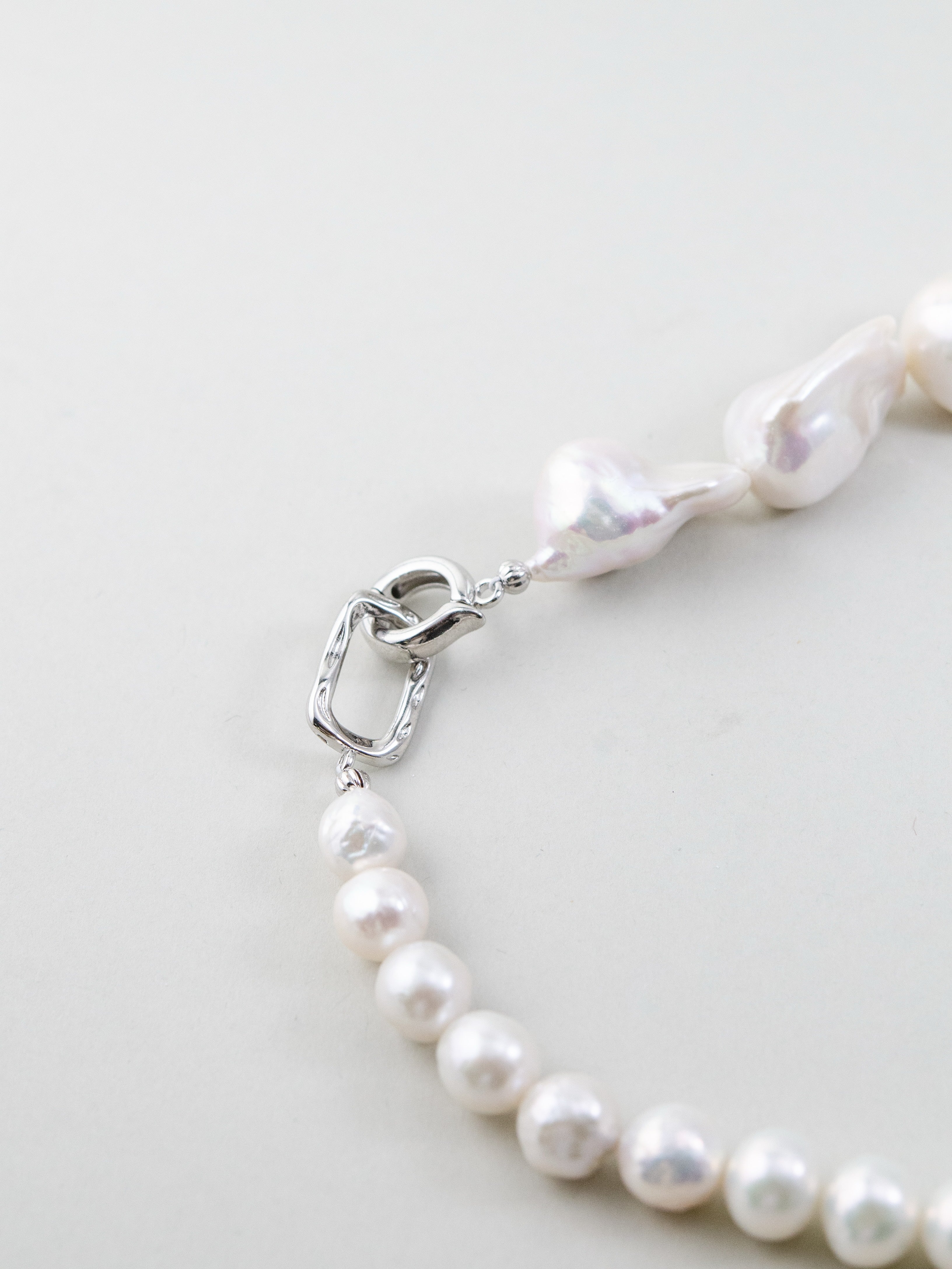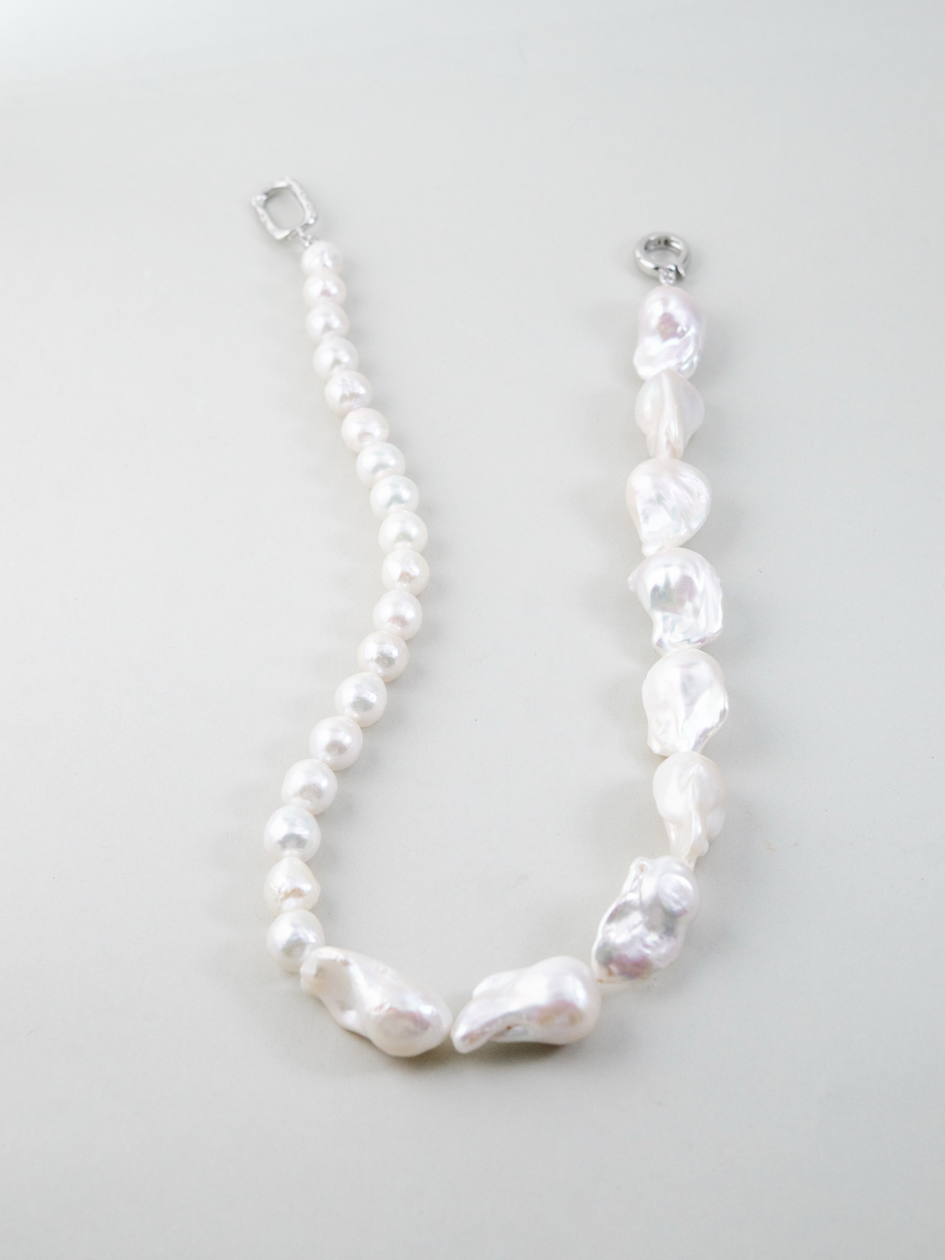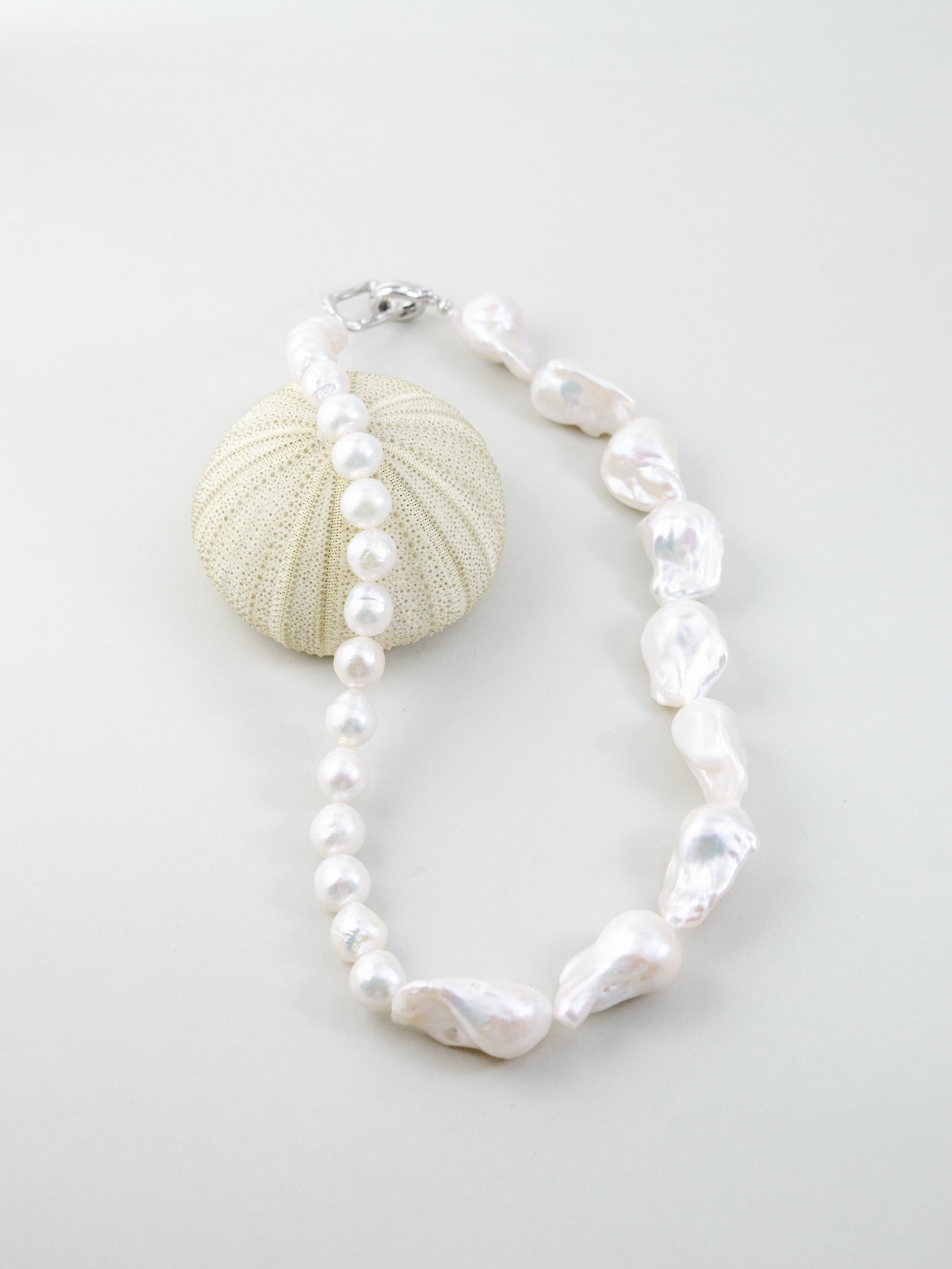 半分は小粒の淡水パール、半分は個性的な形の大ぶりなバロックパールを組み合わせたネックレスです。「純粋」と「守護」の力を持つとされるパールは、心を清らかに保ち、人間関係に優しさと調和をもたらすとも言われています。