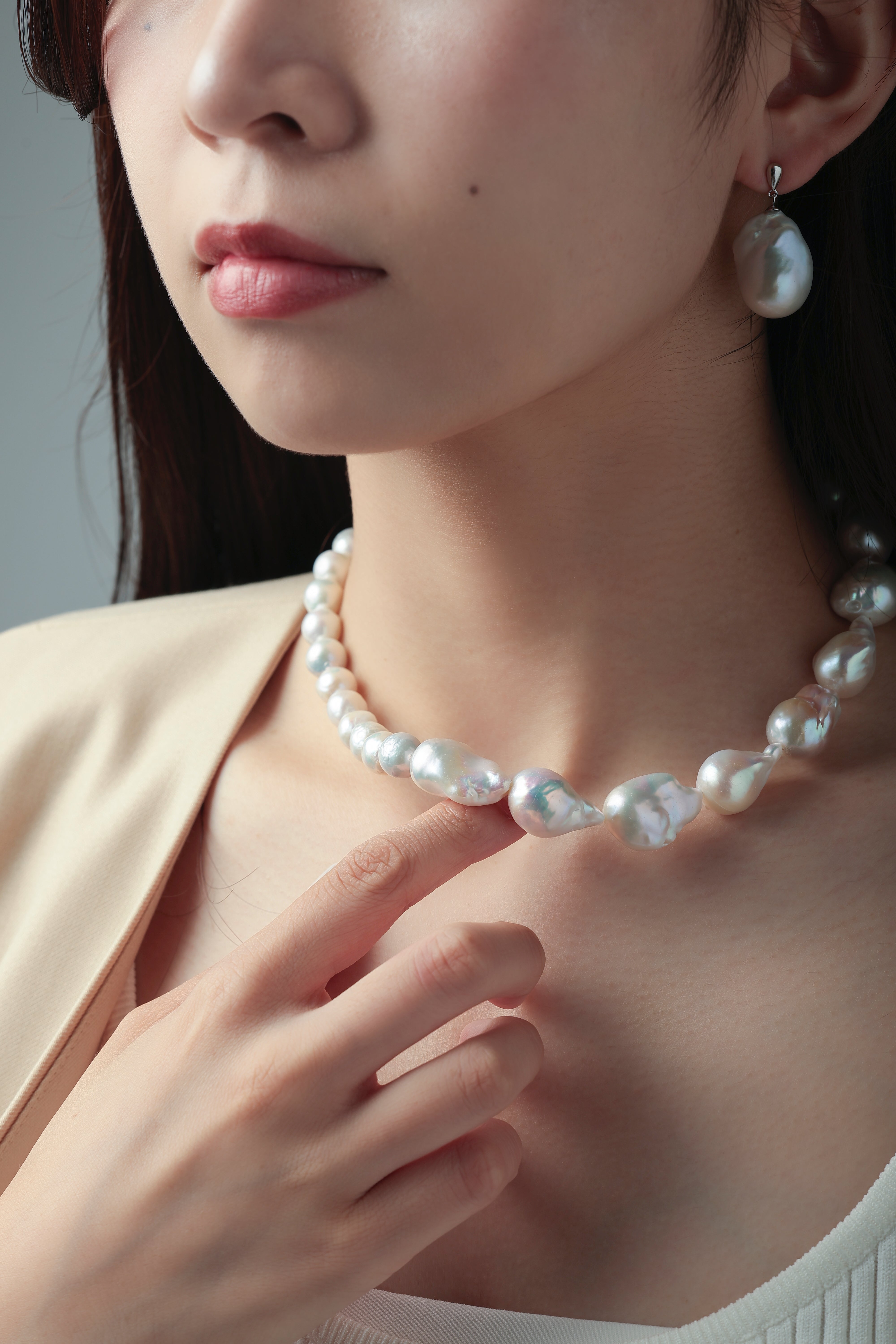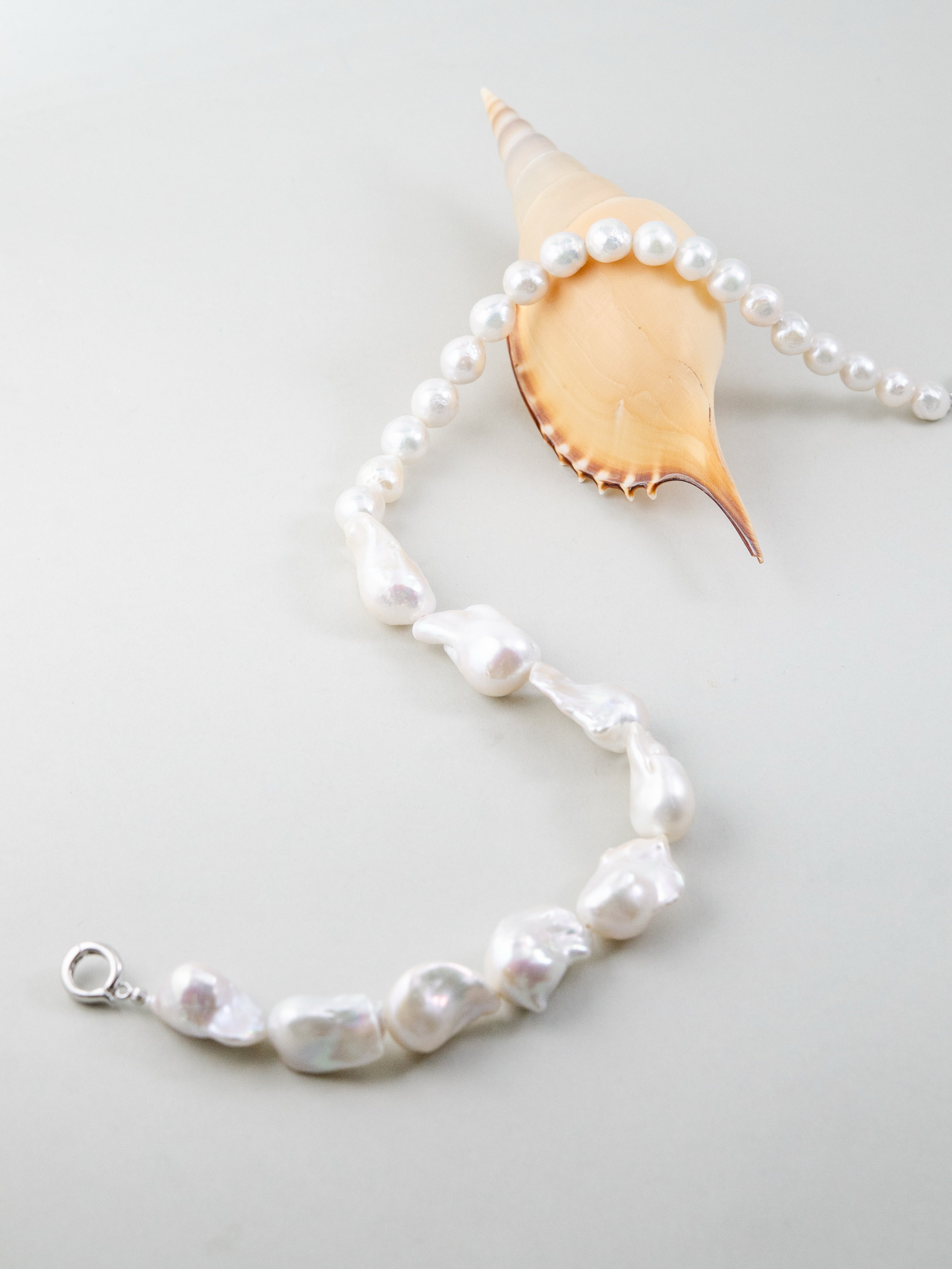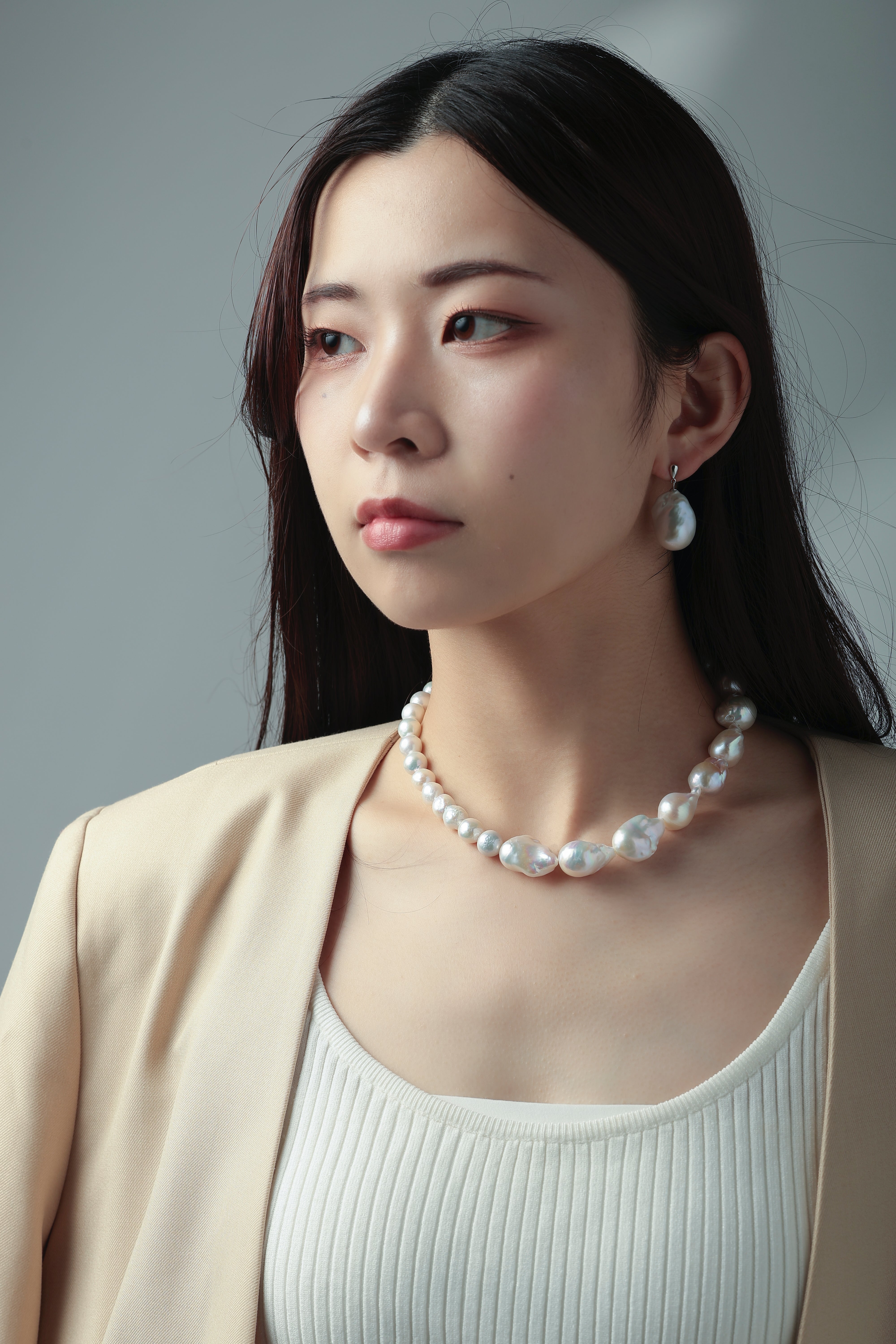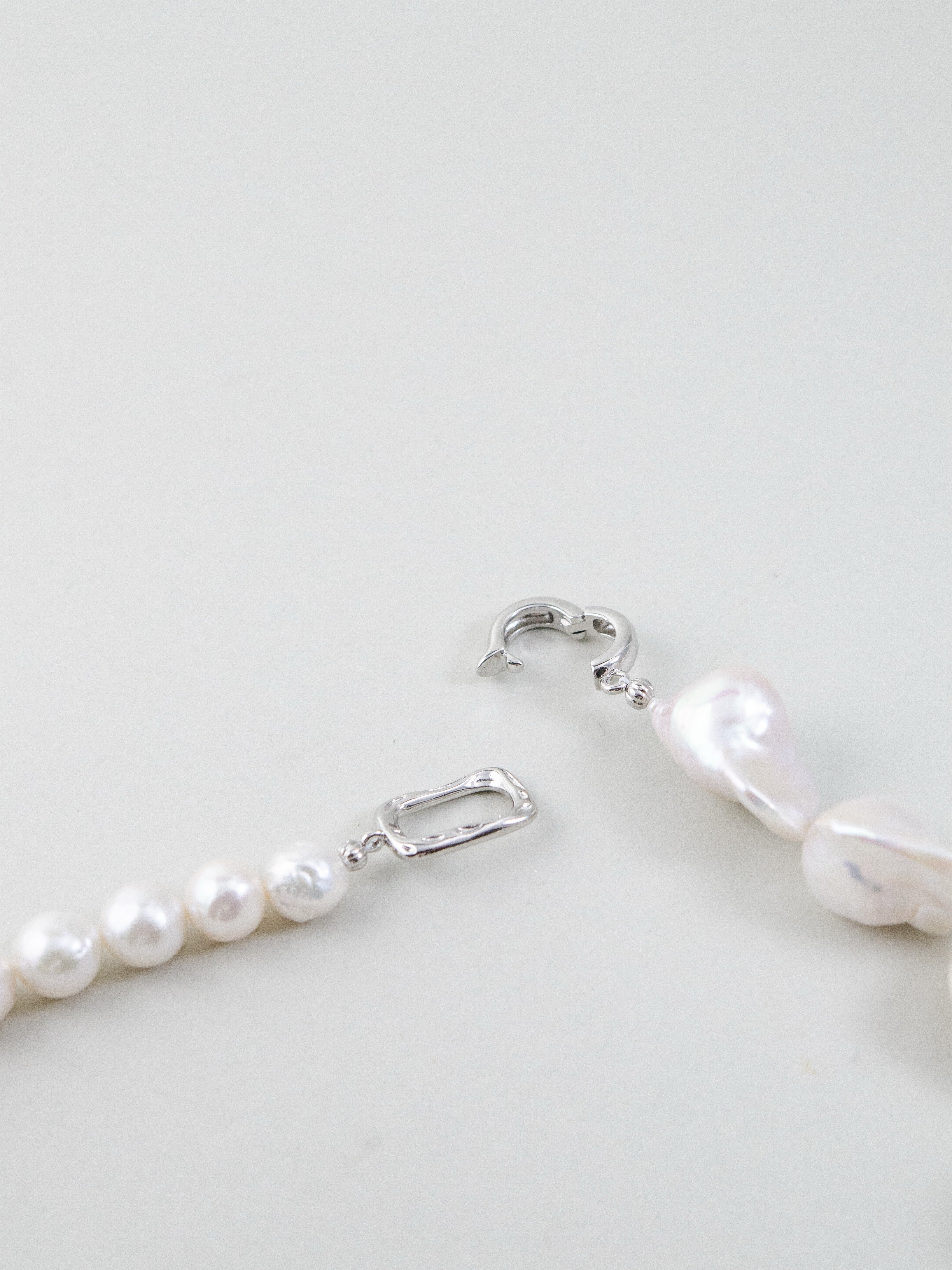 半分は小粒の淡水パール、半分は個性的な形の大ぶりなバロックパールを組み合わせたネックレスです。「純粋」と「守護」の力を持つとされるパールは、心を清らかに保ち、人間関係に優しさと調和をもたらすとも言われています。