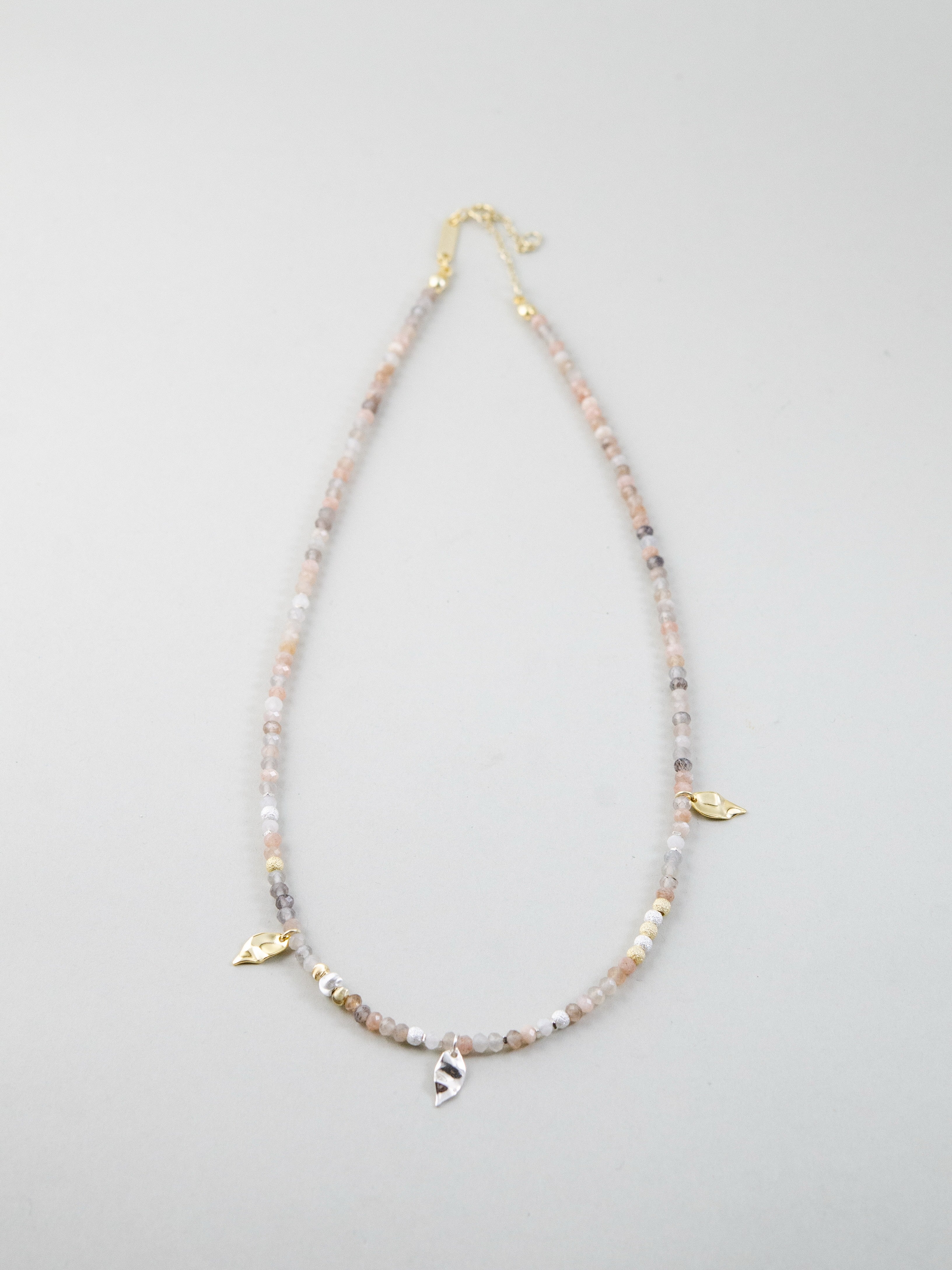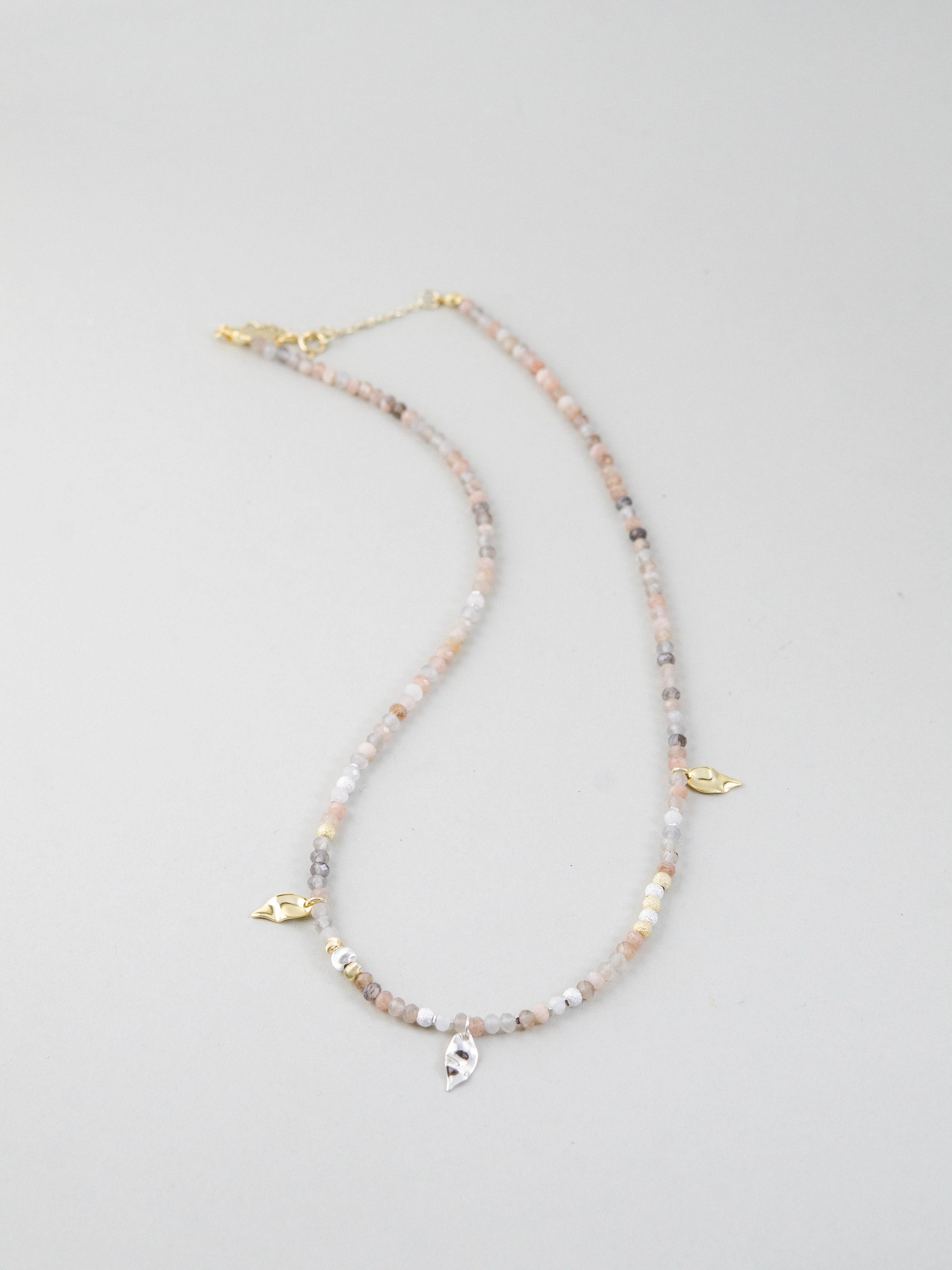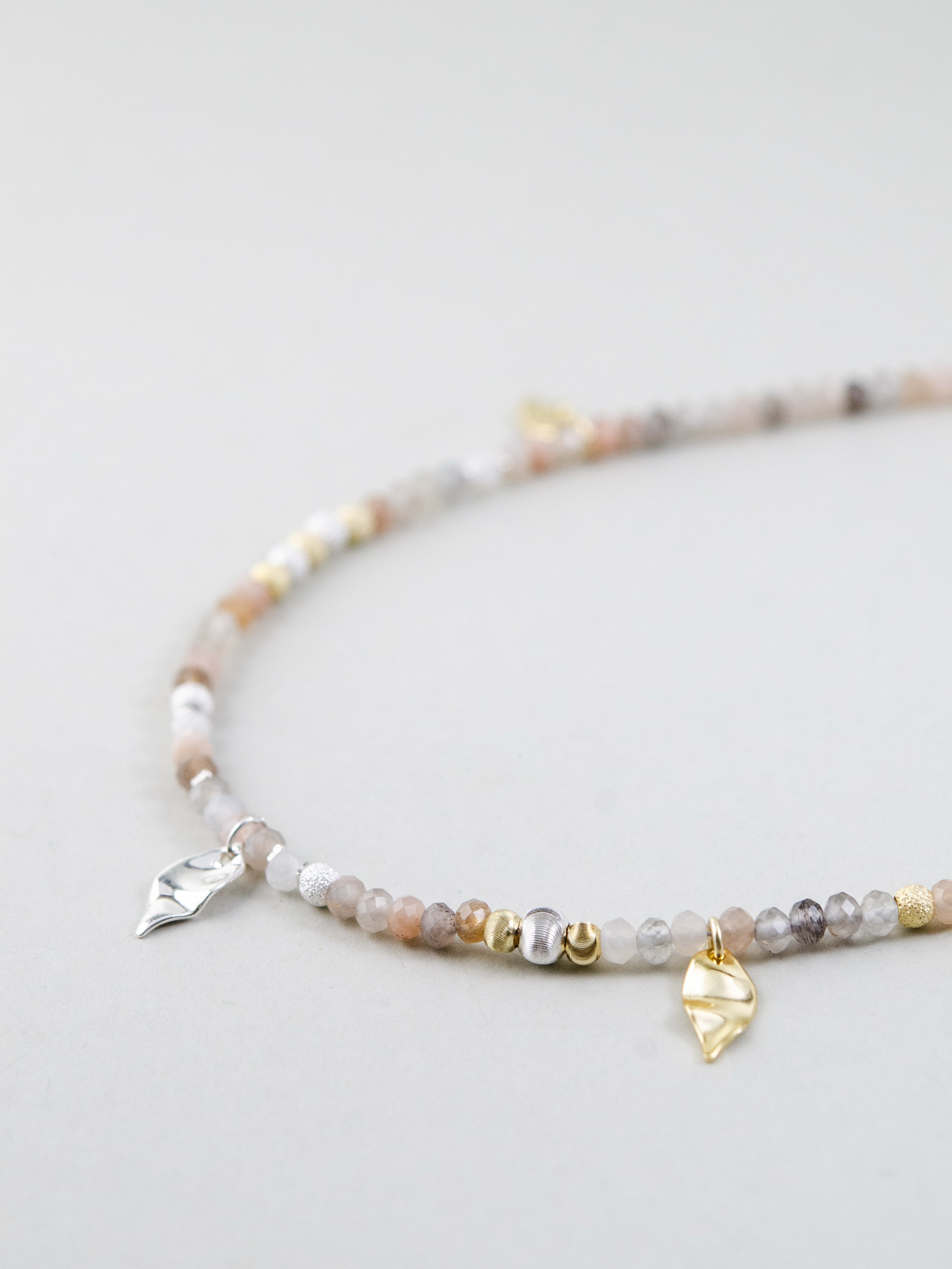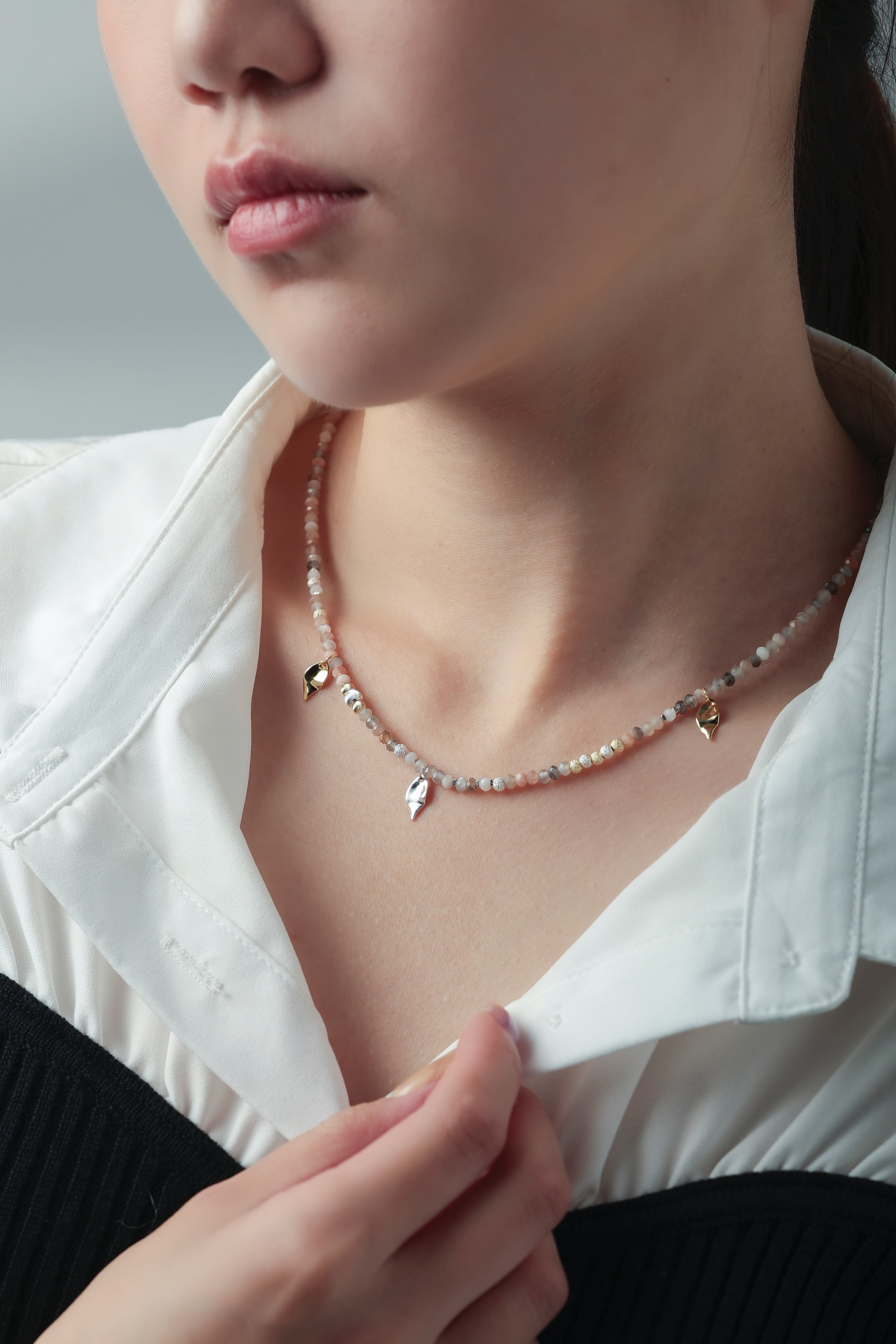 幻想的なブルーやピンクの光を放つレインボームーンストーンを使用したネックレスです。ひと粒ひと粒に繊細な輝きが宿り、動きに合わせてさりげなく表情を変えます。ゴールド&シルバーのリーフチャームがアクセントとなり、ナチュラルで凛とした印象に。普段使いはもちろん、心を整えるひとときにも寄り添う一本です。
