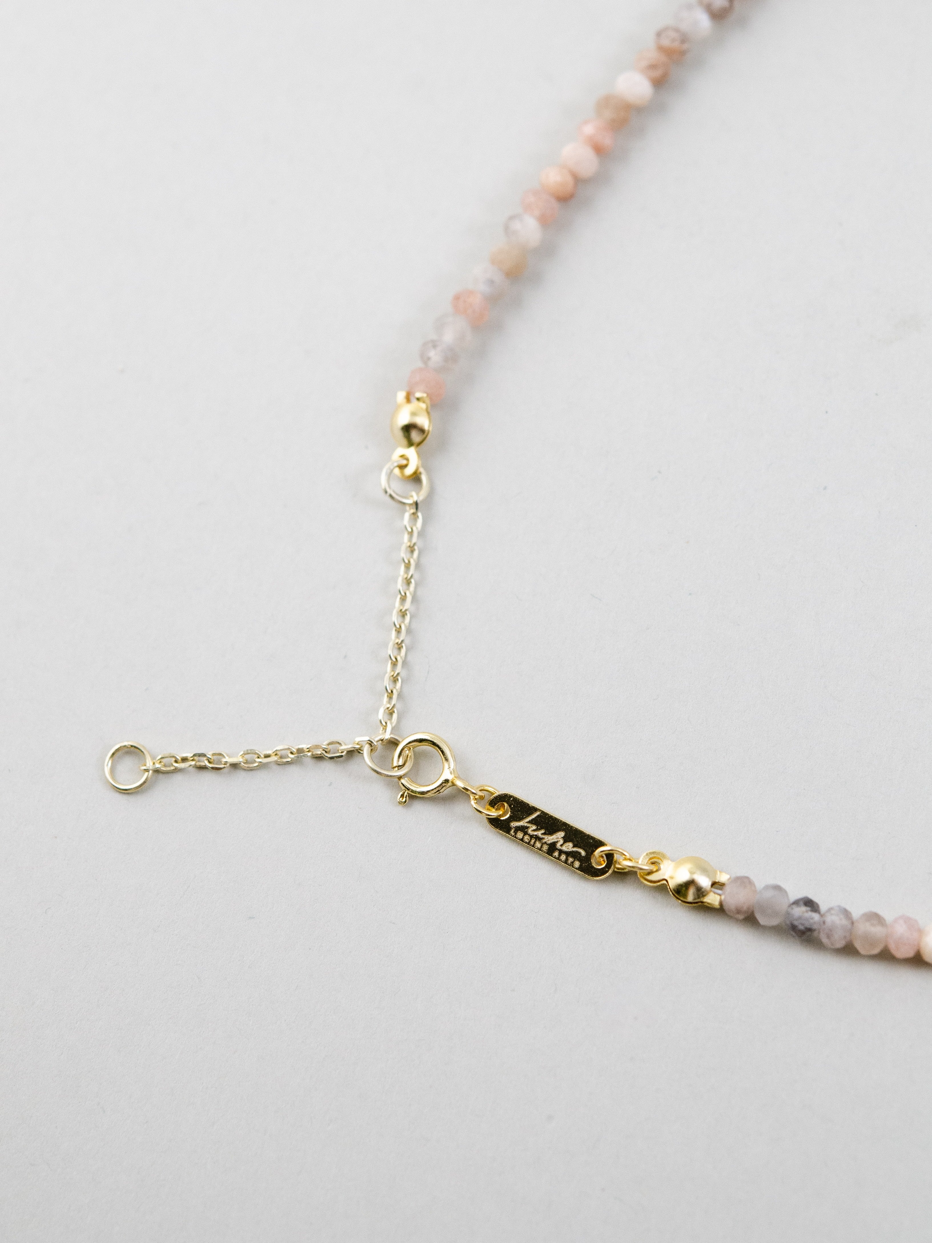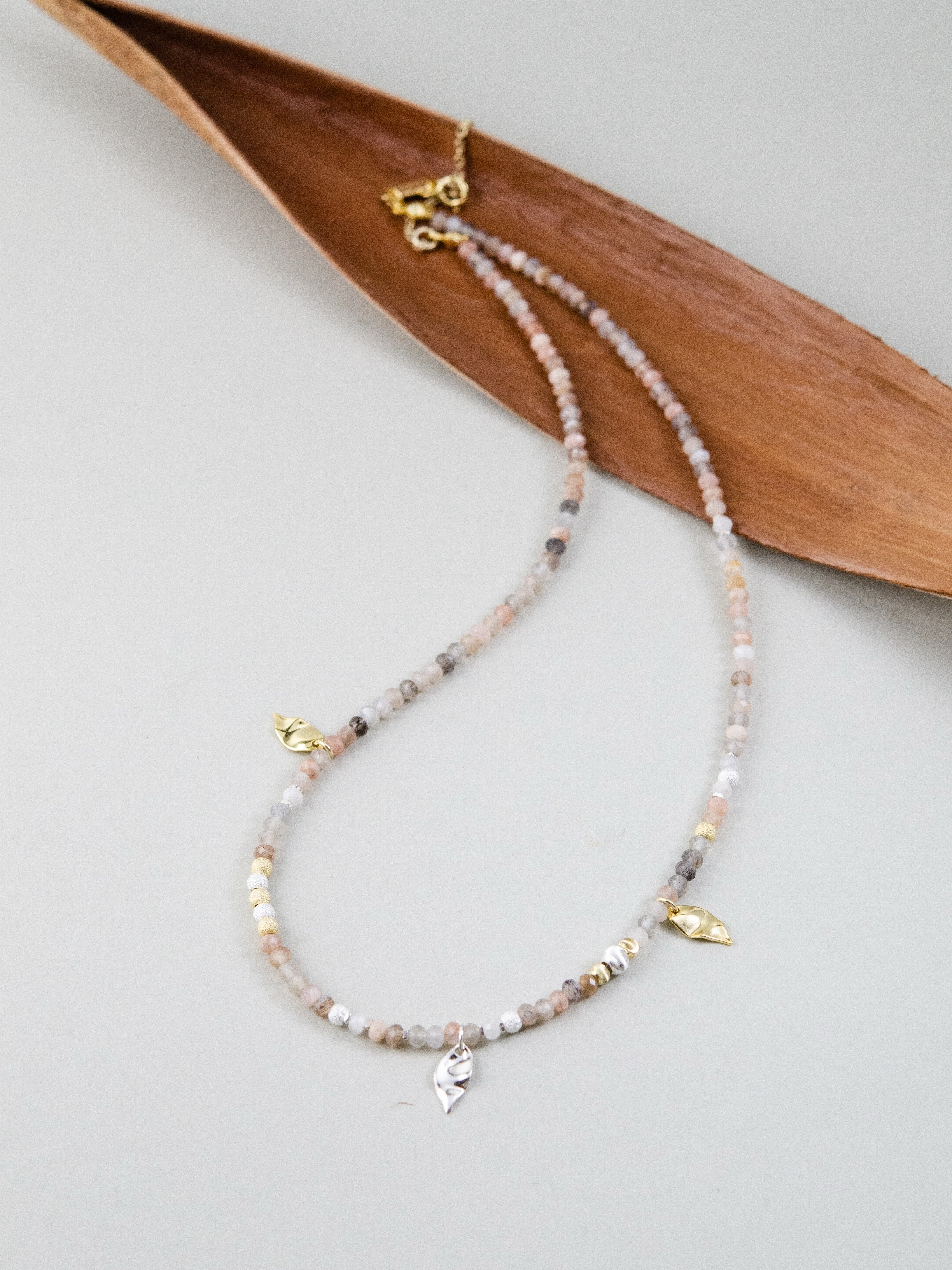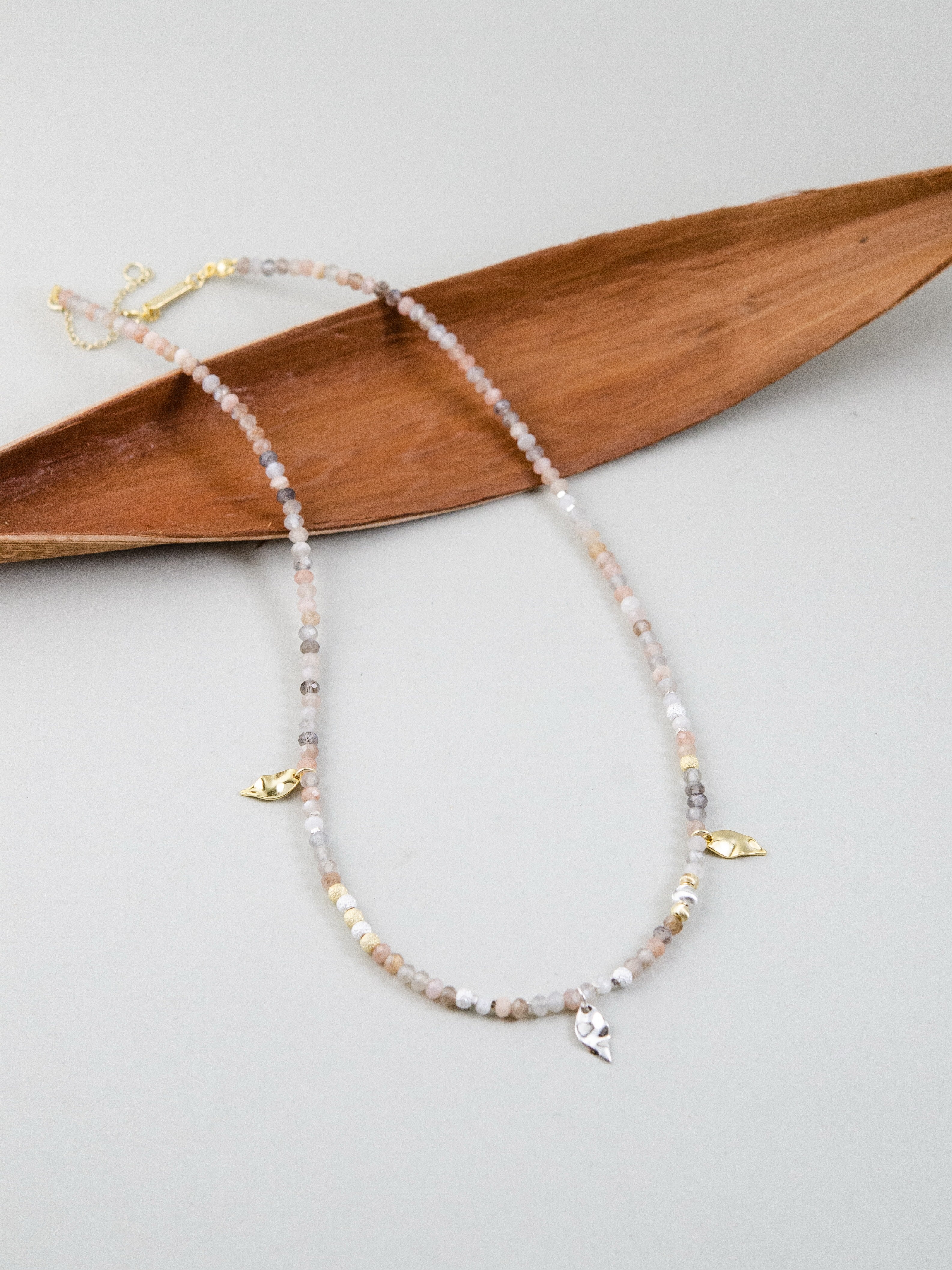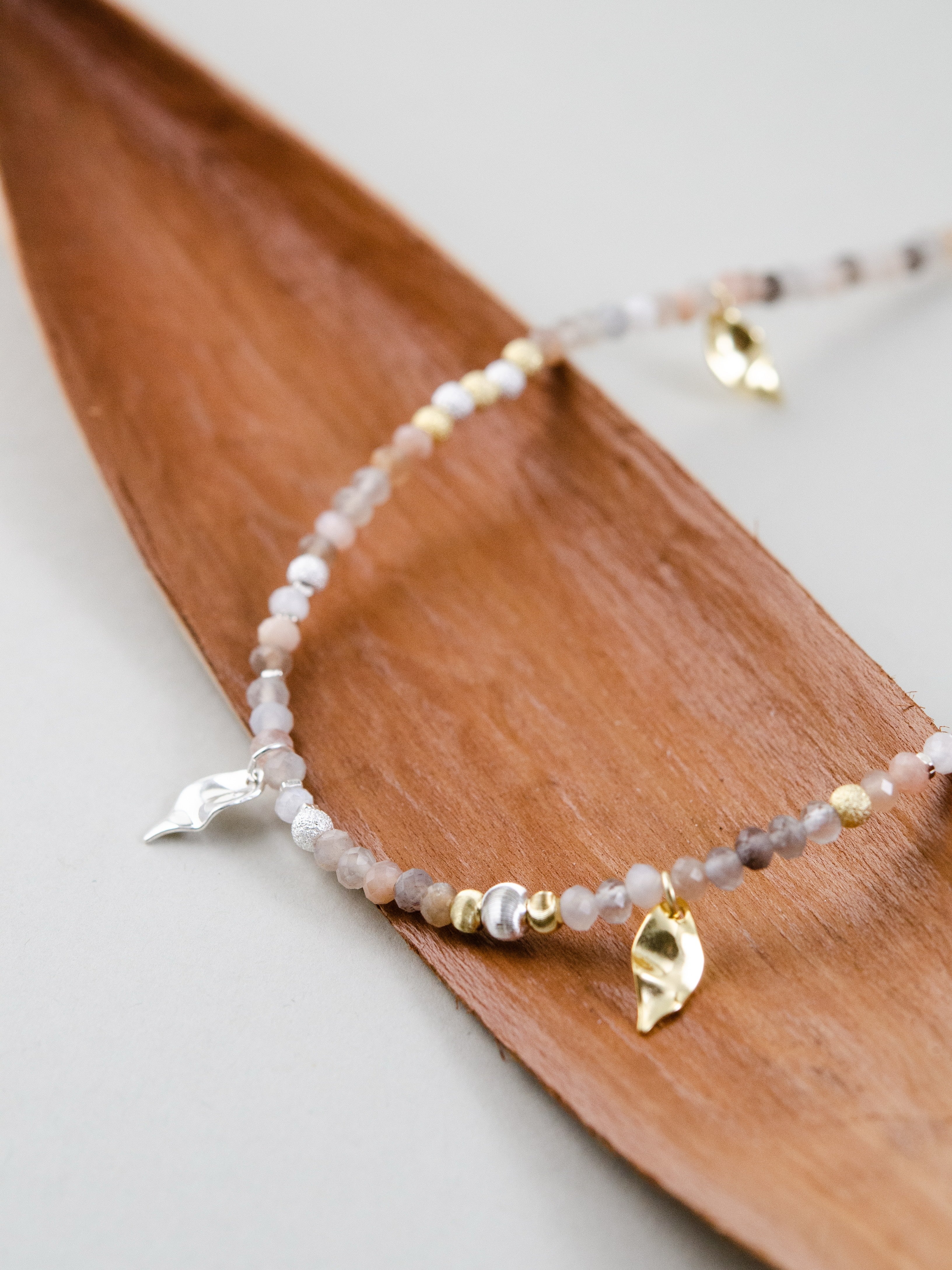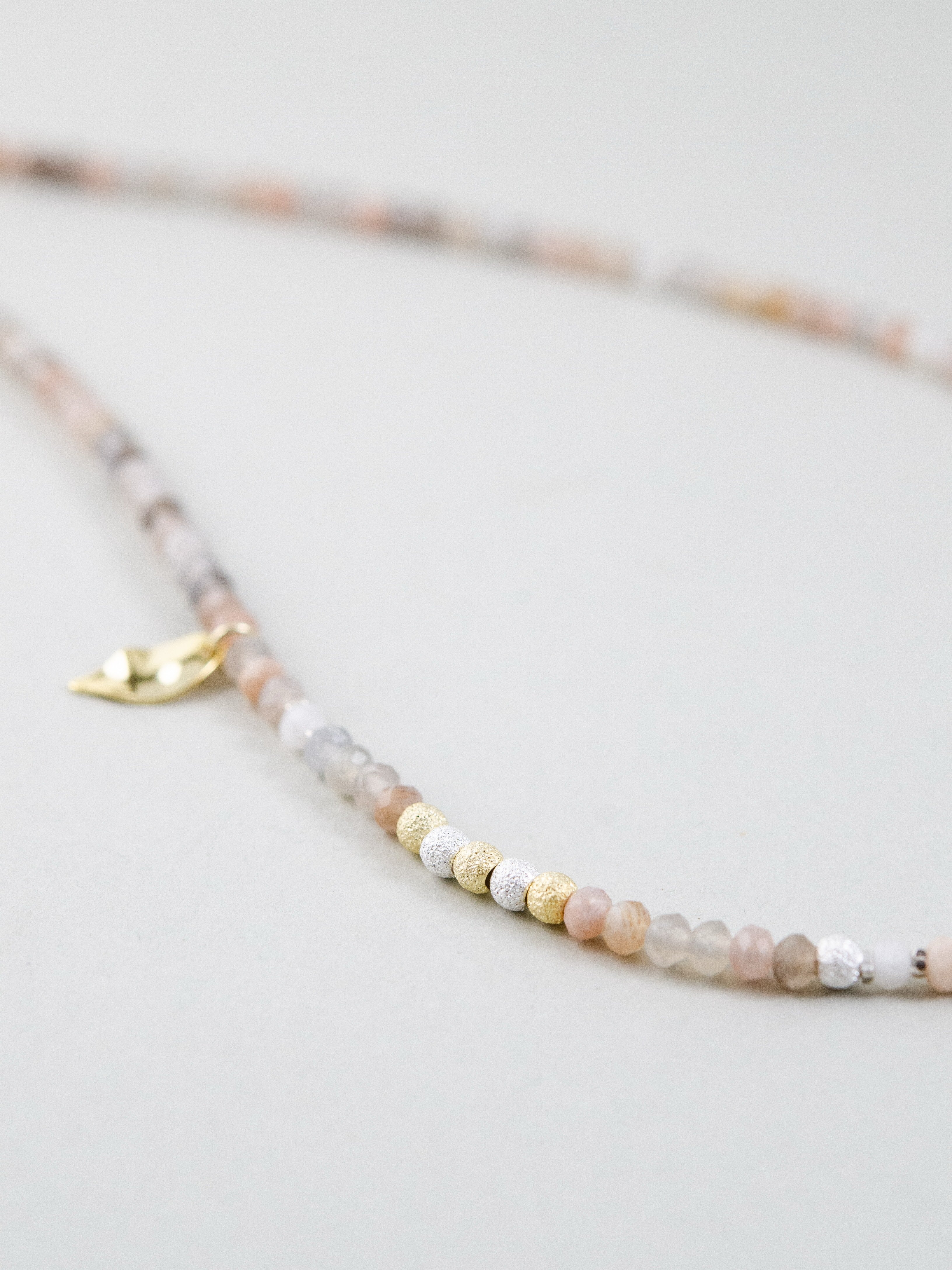 幻想的なブルーやピンクの光を放つレインボームーンストーンを使用したネックレスです。ひと粒ひと粒に繊細な輝きが宿り、動きに合わせてさりげなく表情を変えます。ゴールド&シルバーのリーフチャームがアクセントとなり、ナチュラルで凛とした印象に。普段使いはもちろん、心を整えるひとときにも寄り添う一本です。