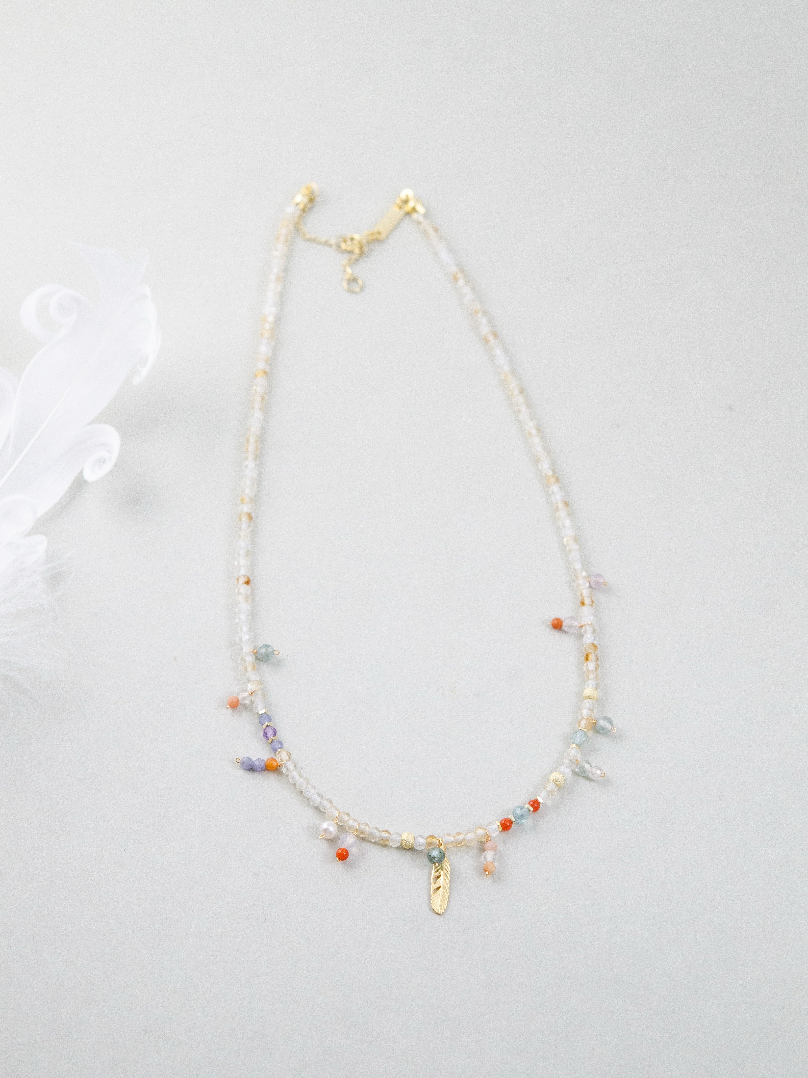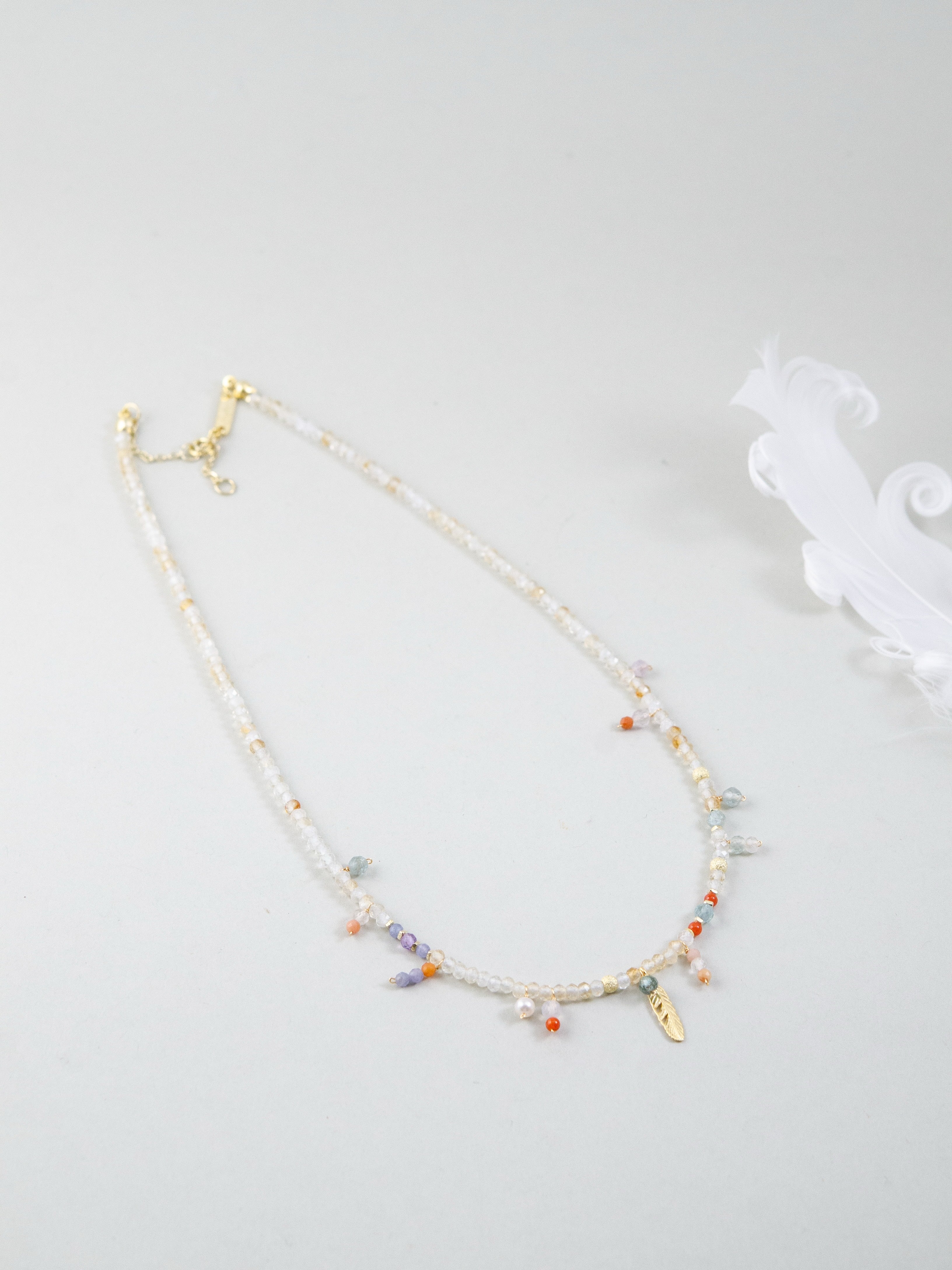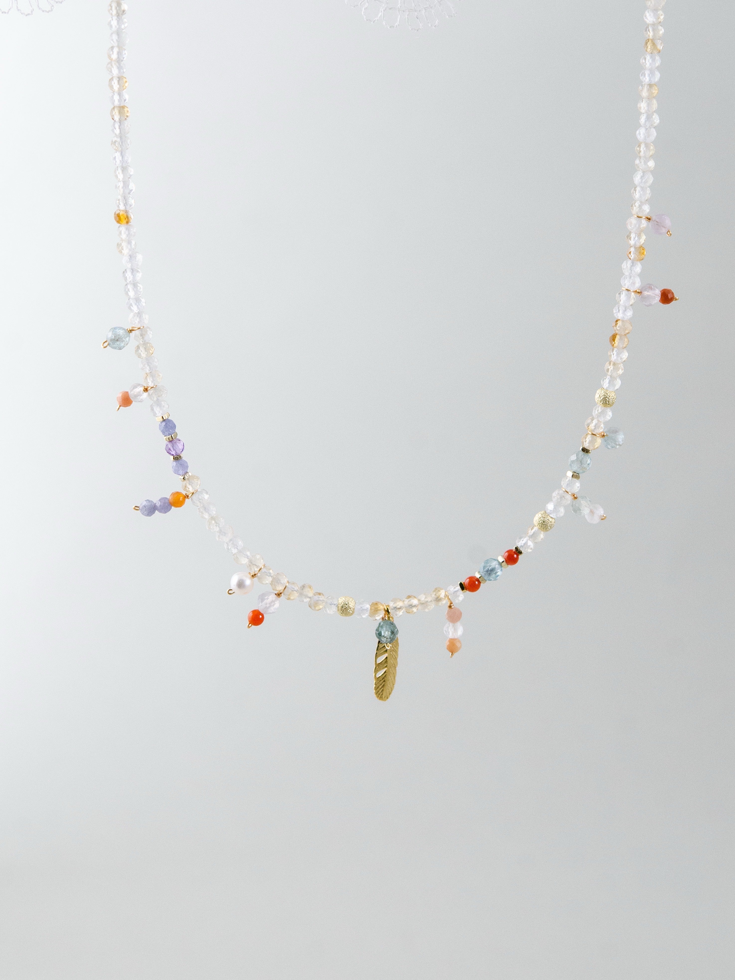 淡いゴールドトーンのシトリンをベースに、カラフルな天然石をちりばめたネックレスです。胸元でゆらめくゴールドの羽モチーフが自由で個性的な雰囲気を演出し、一粒一粒の天然石が旅先で拾った思い出のように小さなストーリーを添えます。