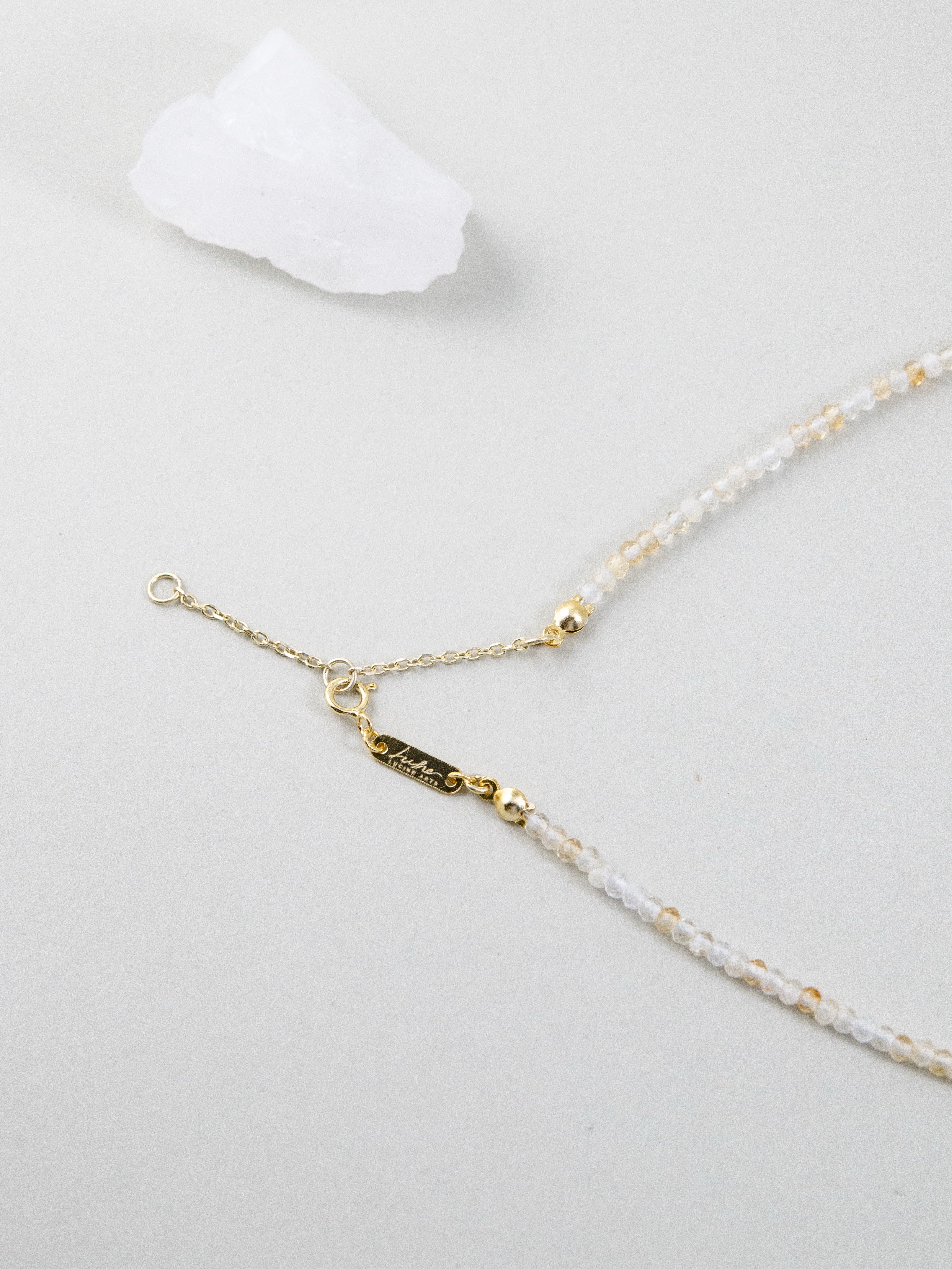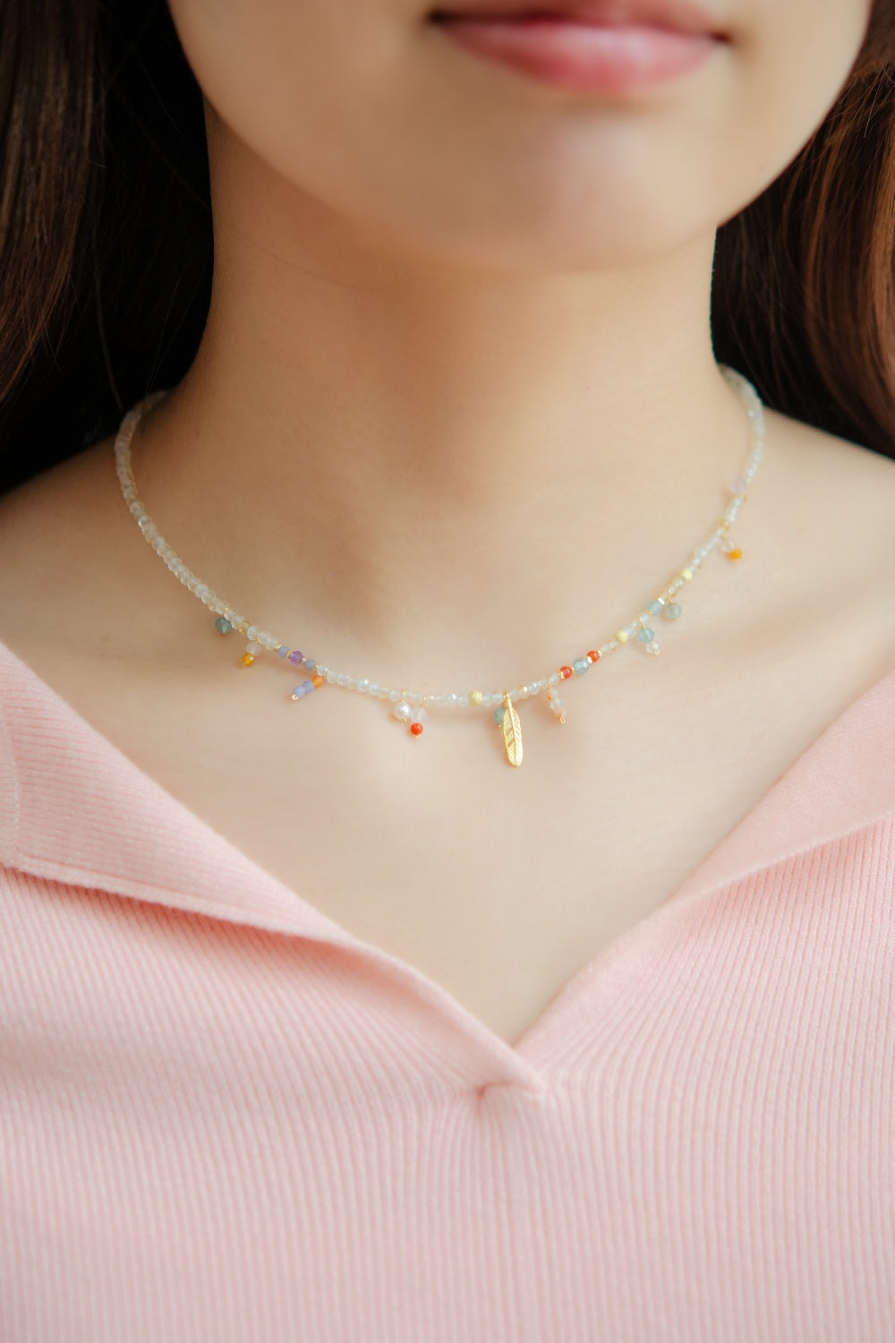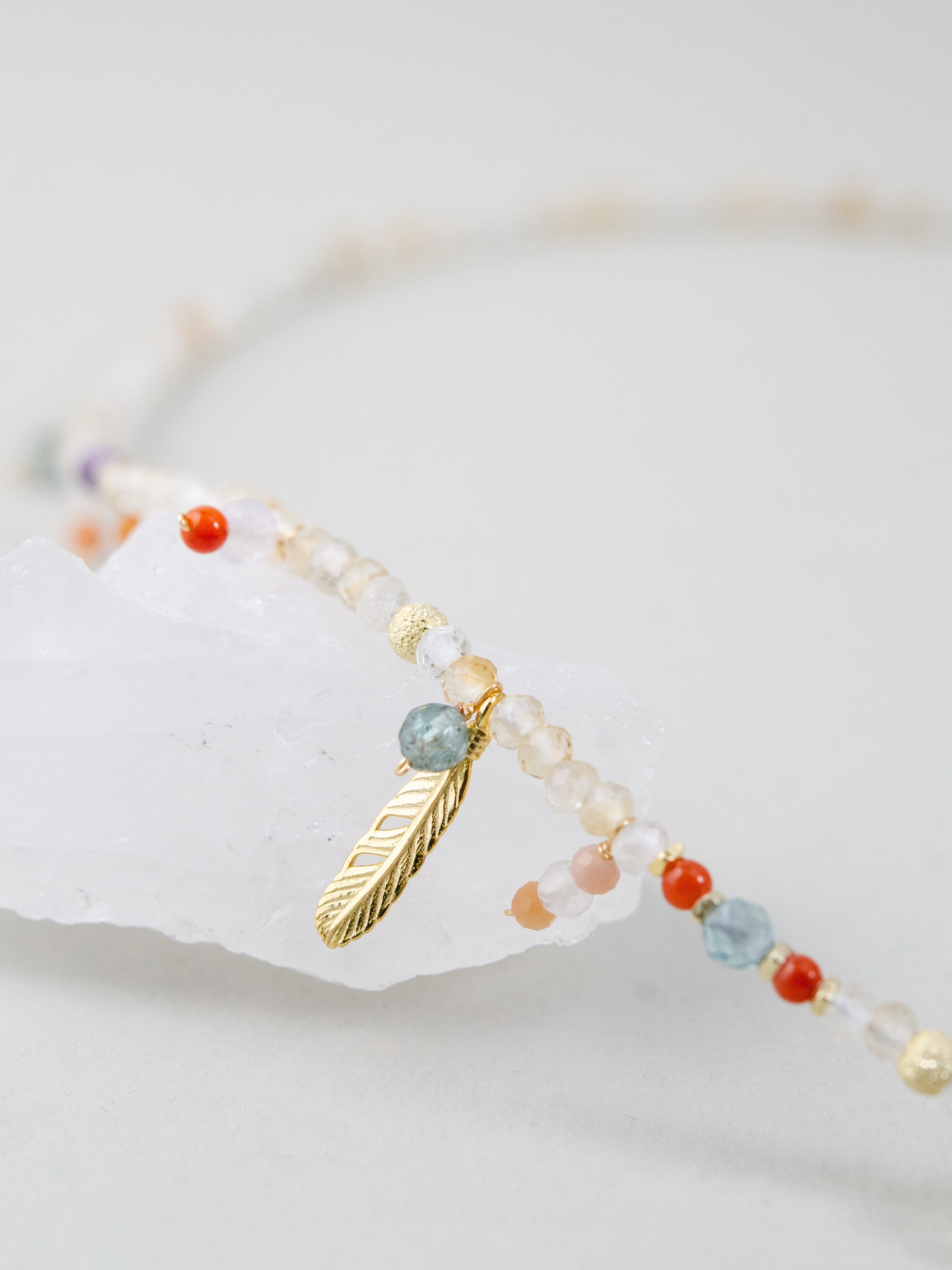 淡いゴールドトーンのシトリンをベースに、カラフルな天然石をちりばめたネックレスです。胸元でゆらめくゴールドの羽モチーフが自由で個性的な雰囲気を演出し、一粒一粒の天然石が旅先で拾った思い出のように小さなストーリーを添えます。
