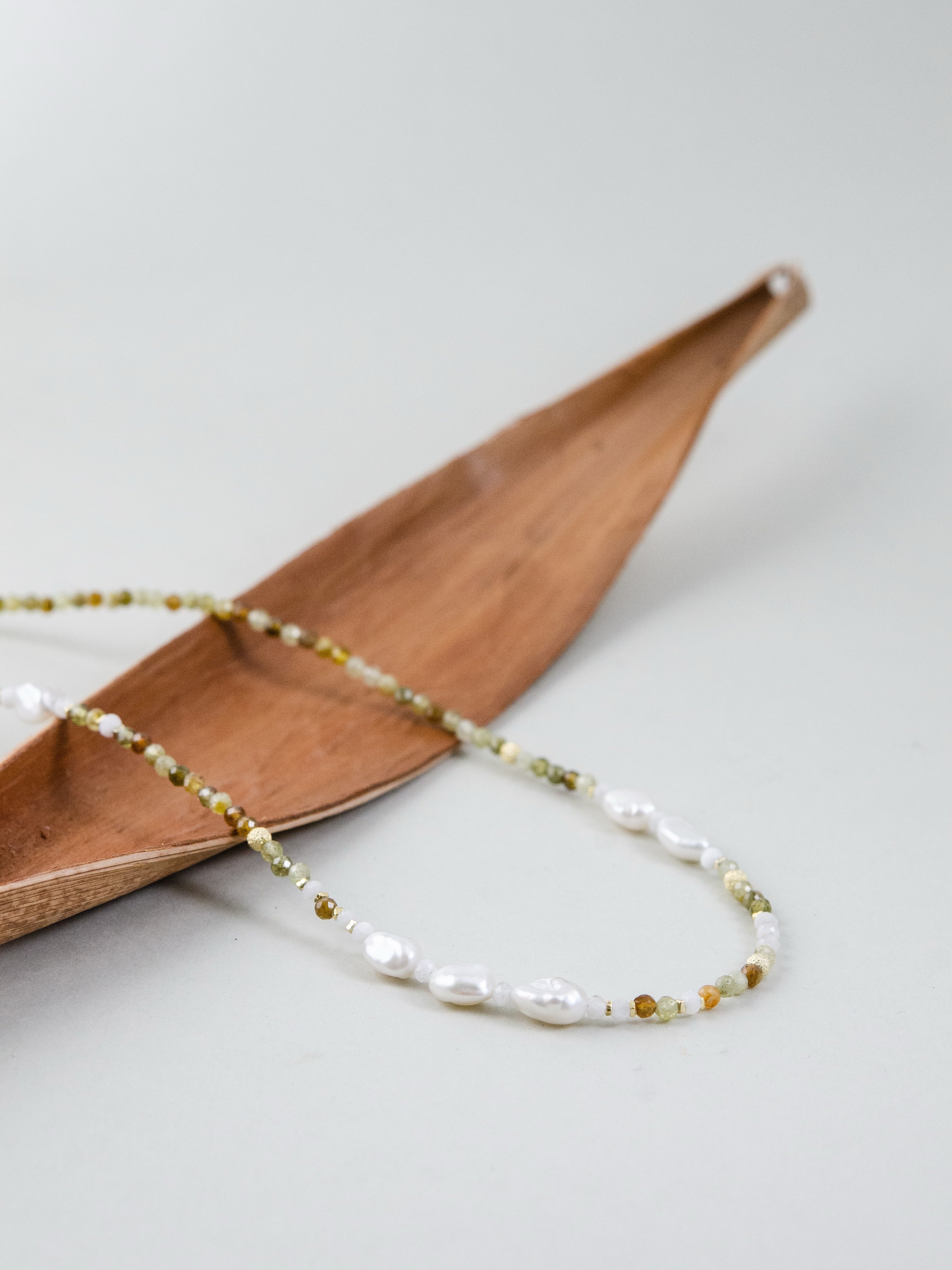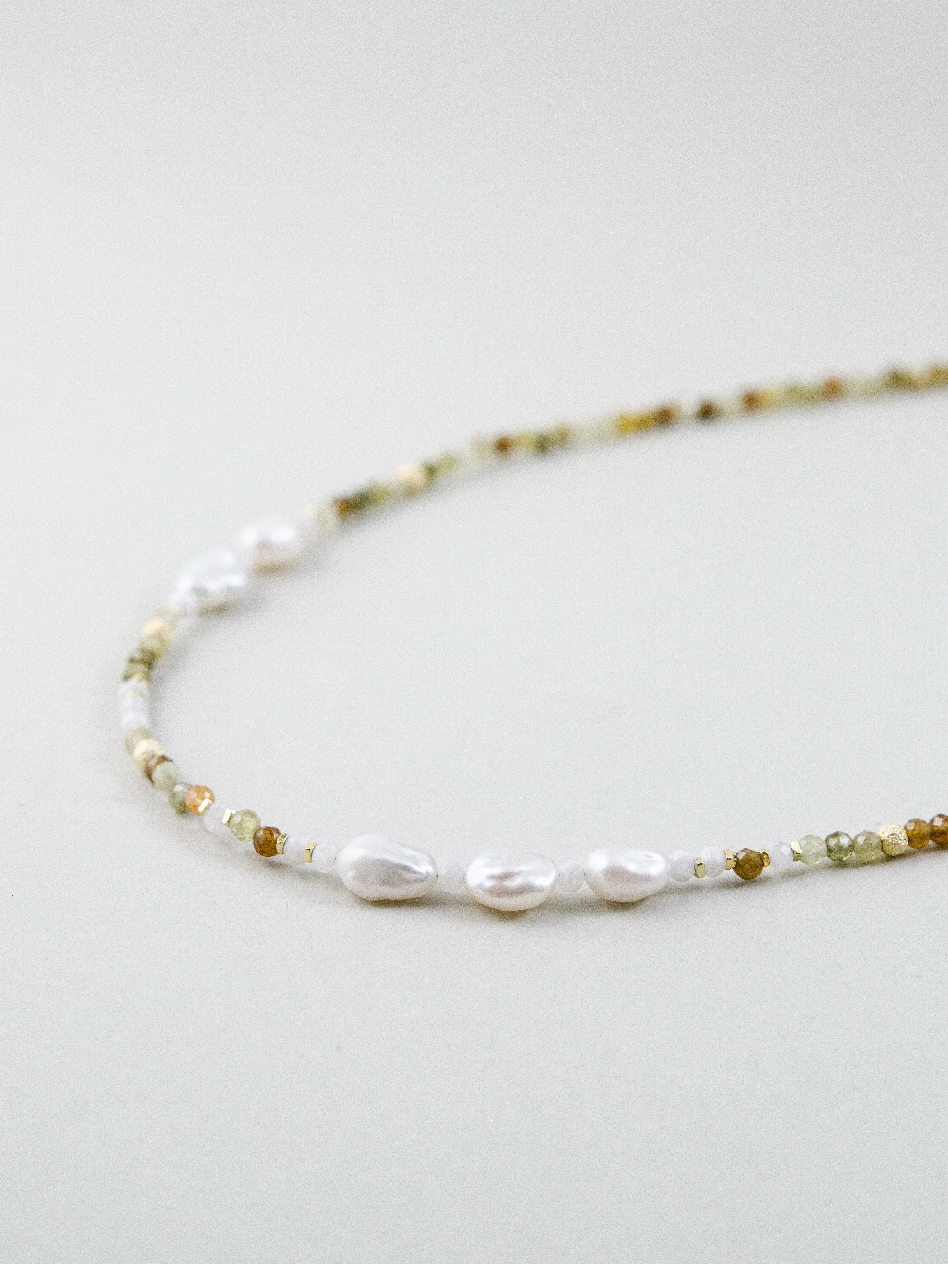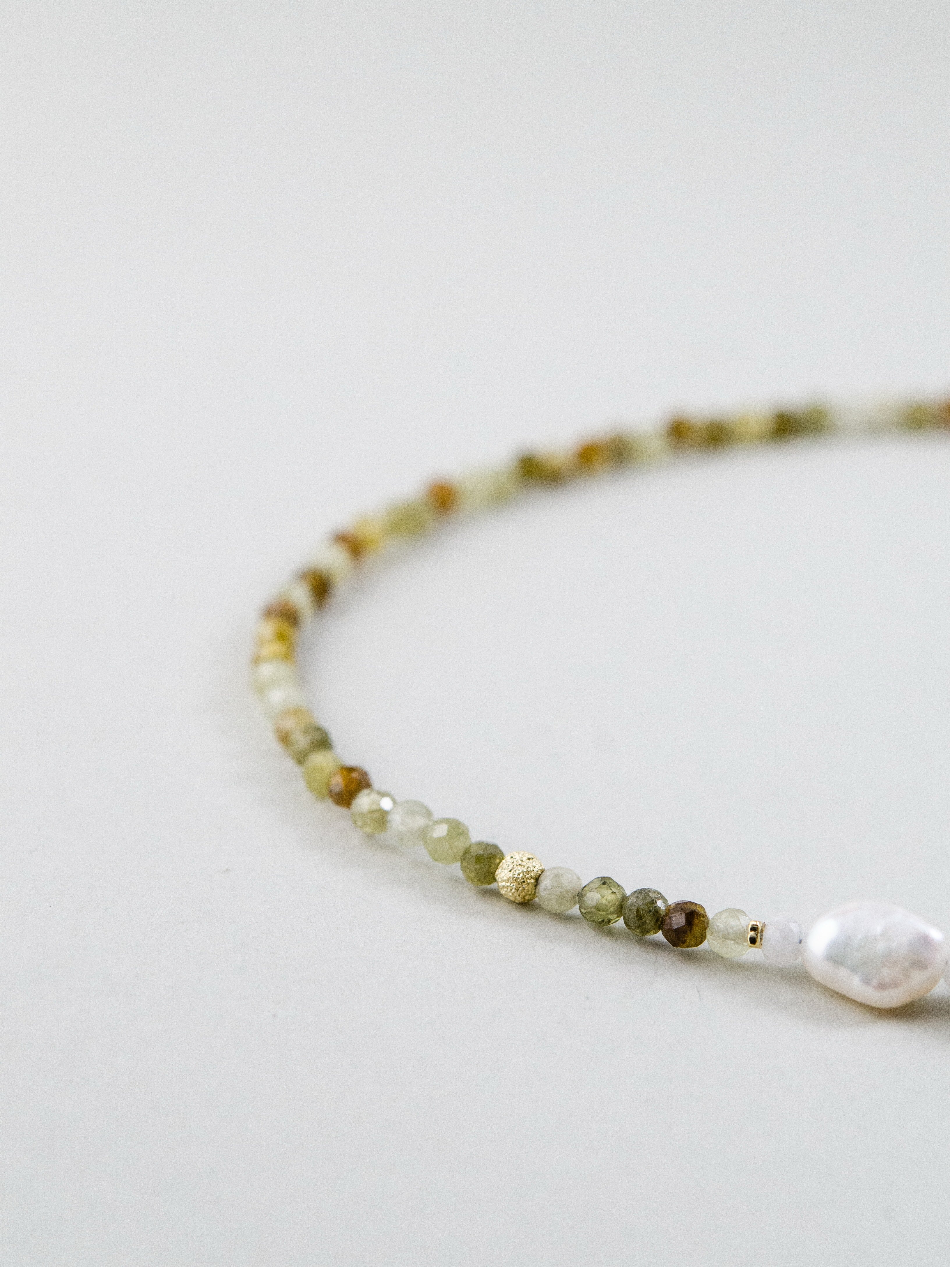 森に差し込む朝の光をイメージしたネックレスです。グラデーションが美しいツァボライト(グリーンガーネット)に、ナチュラルな形の淡水パールを合わせ、自然そのものの美しさを表現しました。グリーンは生命や癒しを、パールはやわらかな光と調和を象徴。落ち着いた中にも華やかさを添え、ナチュラル系やリネンスタイルとの相性も抜群です。
