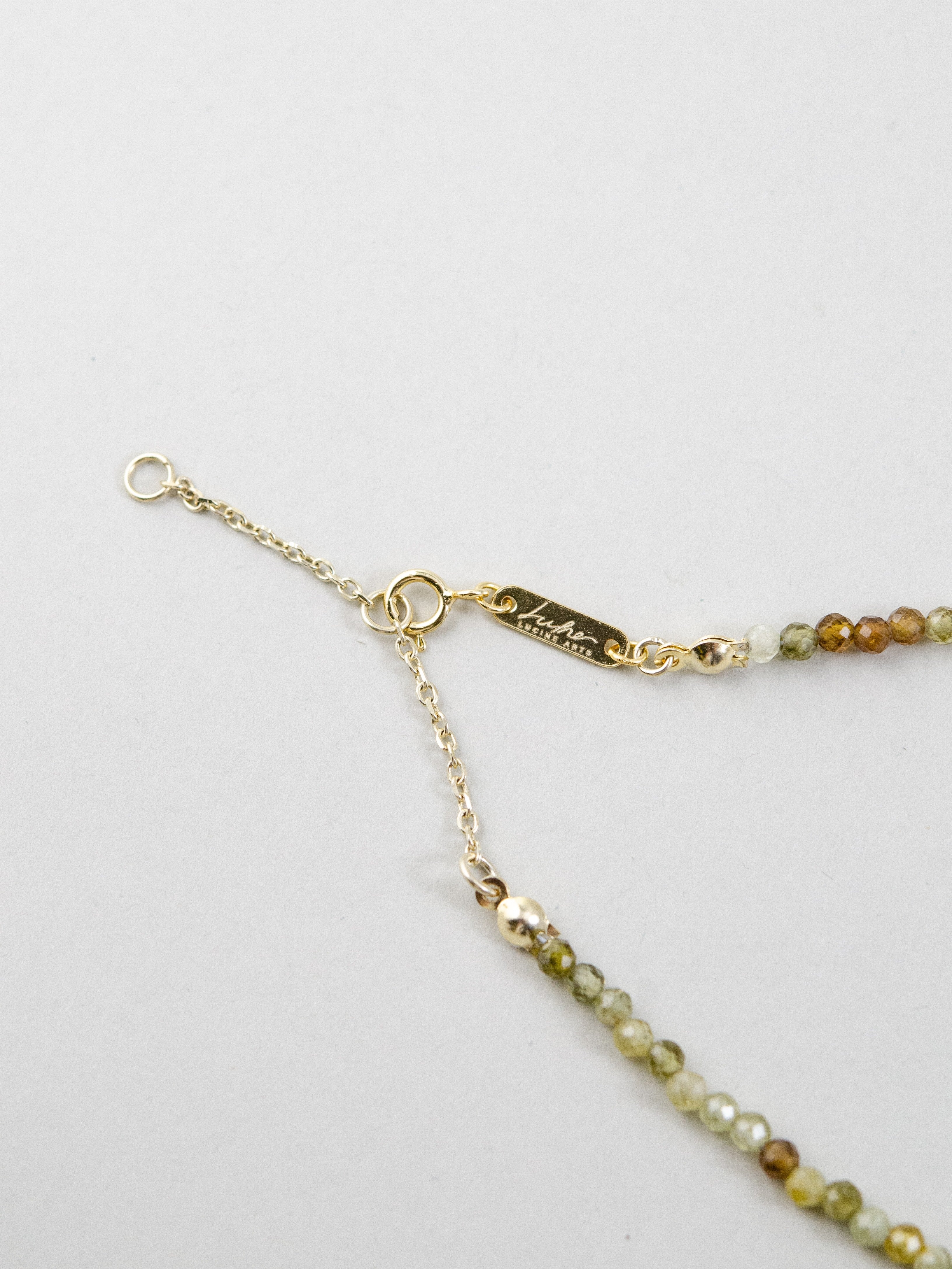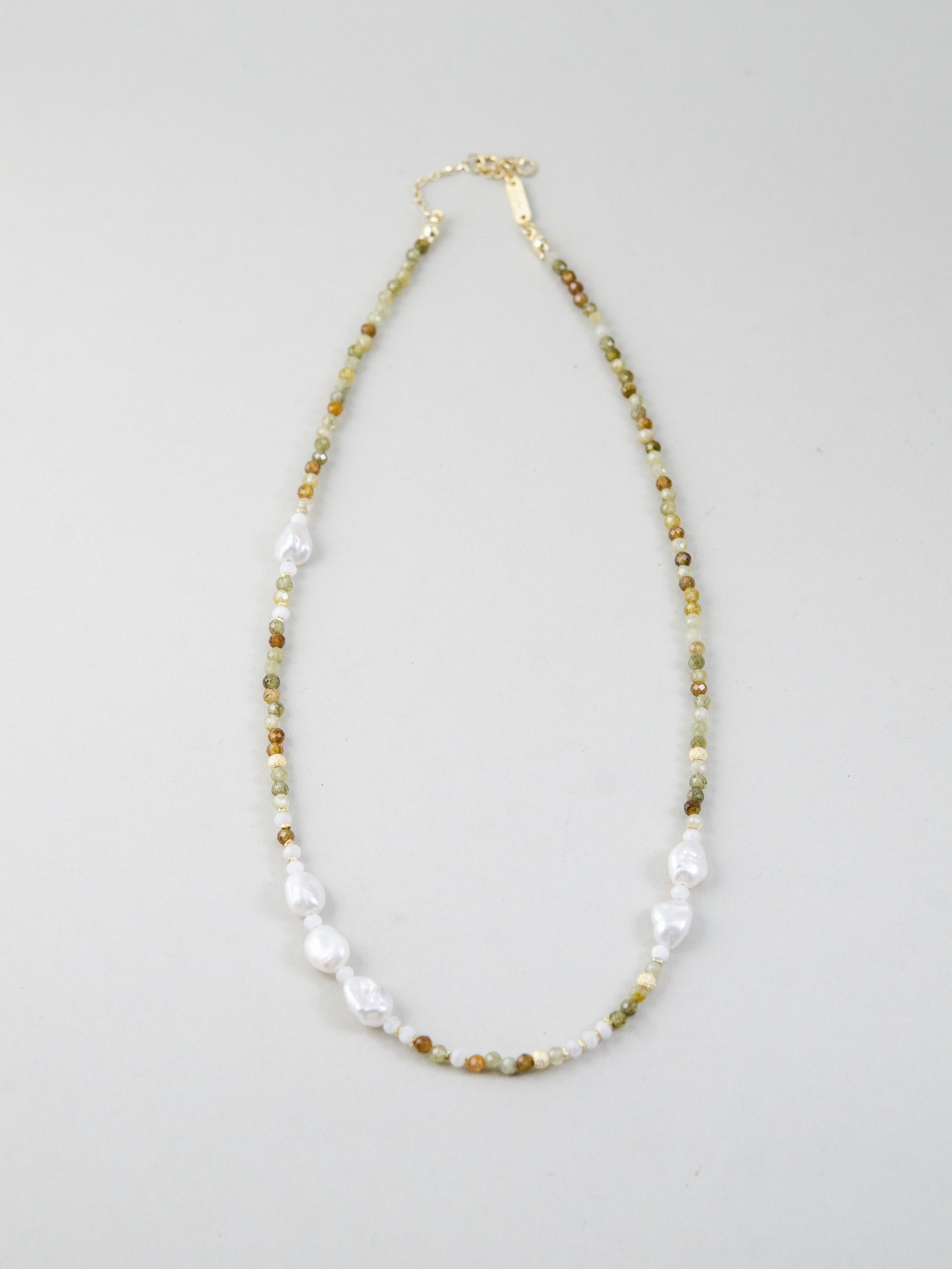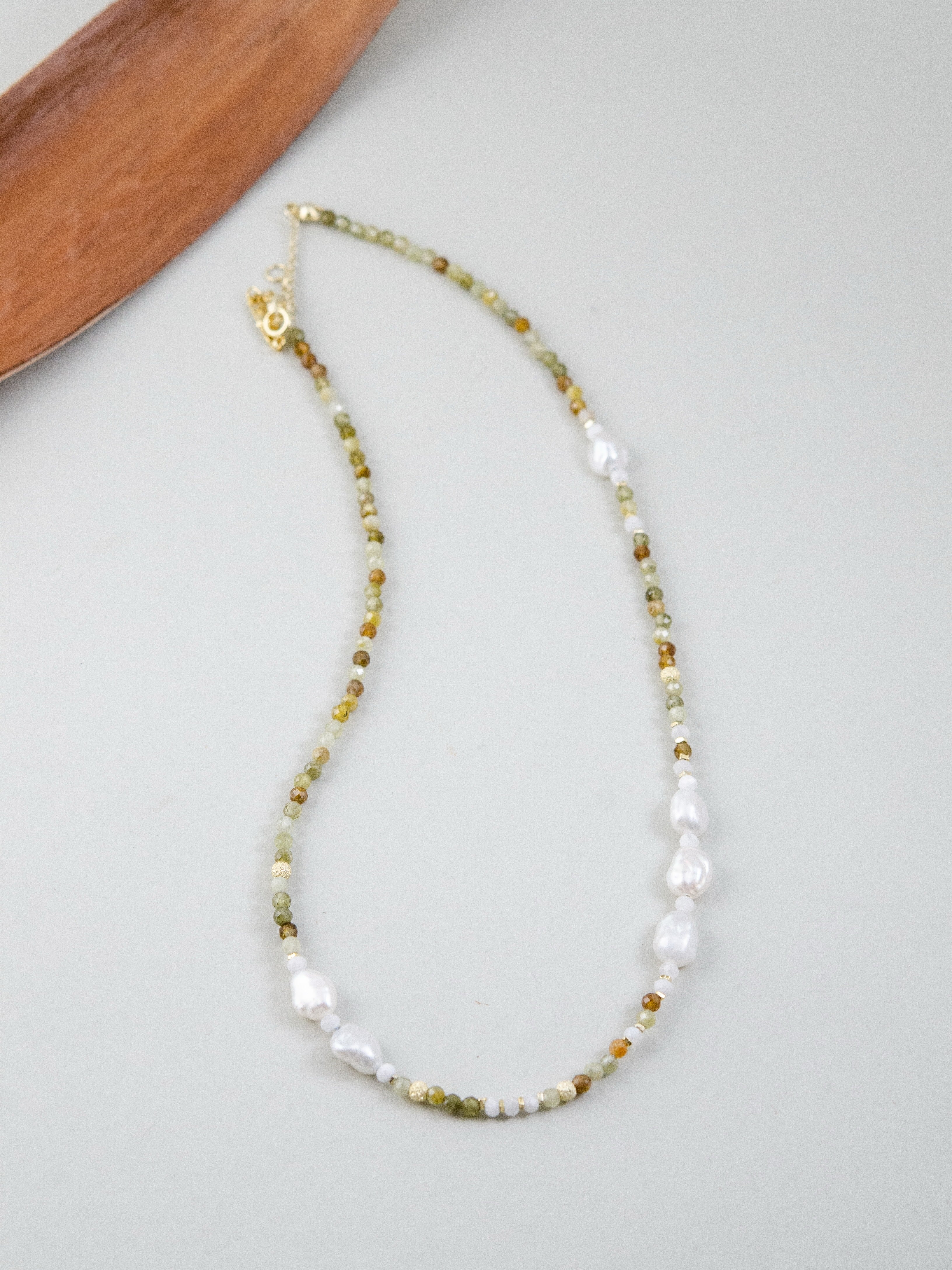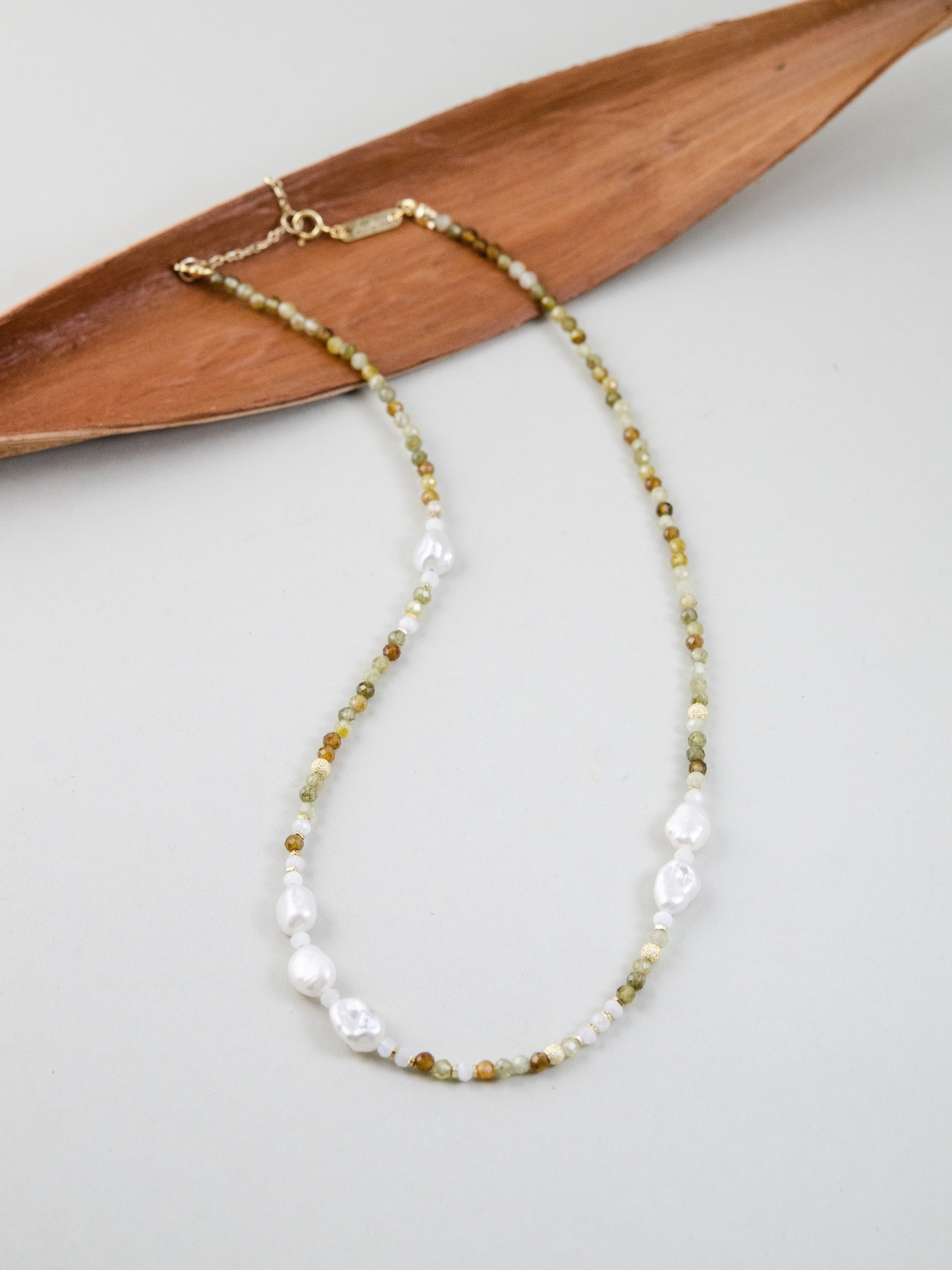 森に差し込む朝の光をイメージしたネックレスです。グラデーションが美しいツァボライト(グリーンガーネット)に、ナチュラルな形の淡水パールを合わせ、自然そのものの美しさを表現しました。グリーンは生命や癒しを、パールはやわらかな光と調和を象徴。落ち着いた中にも華やかさを添え、ナチュラル系やリネンスタイルとの相性も抜群です。
