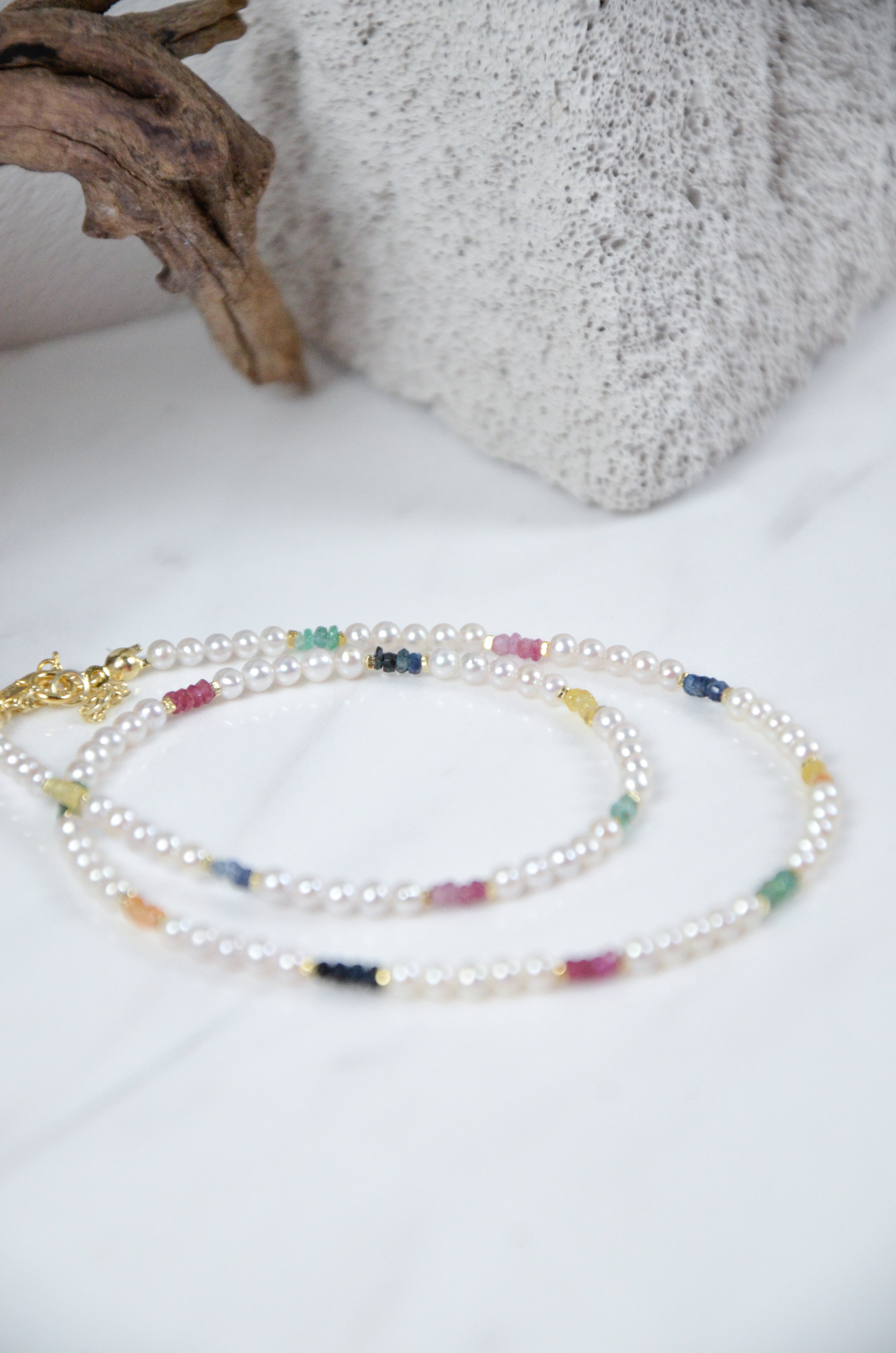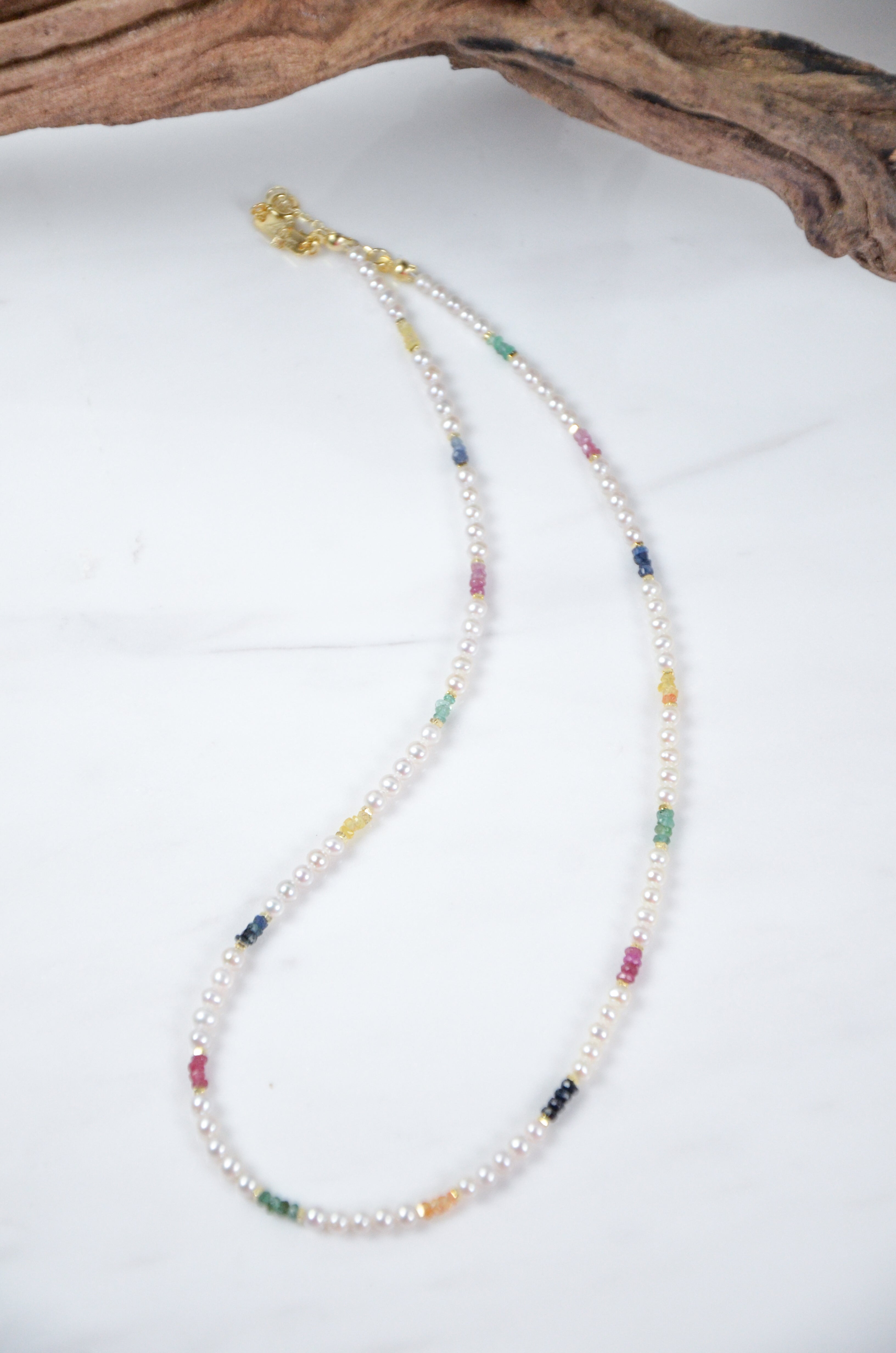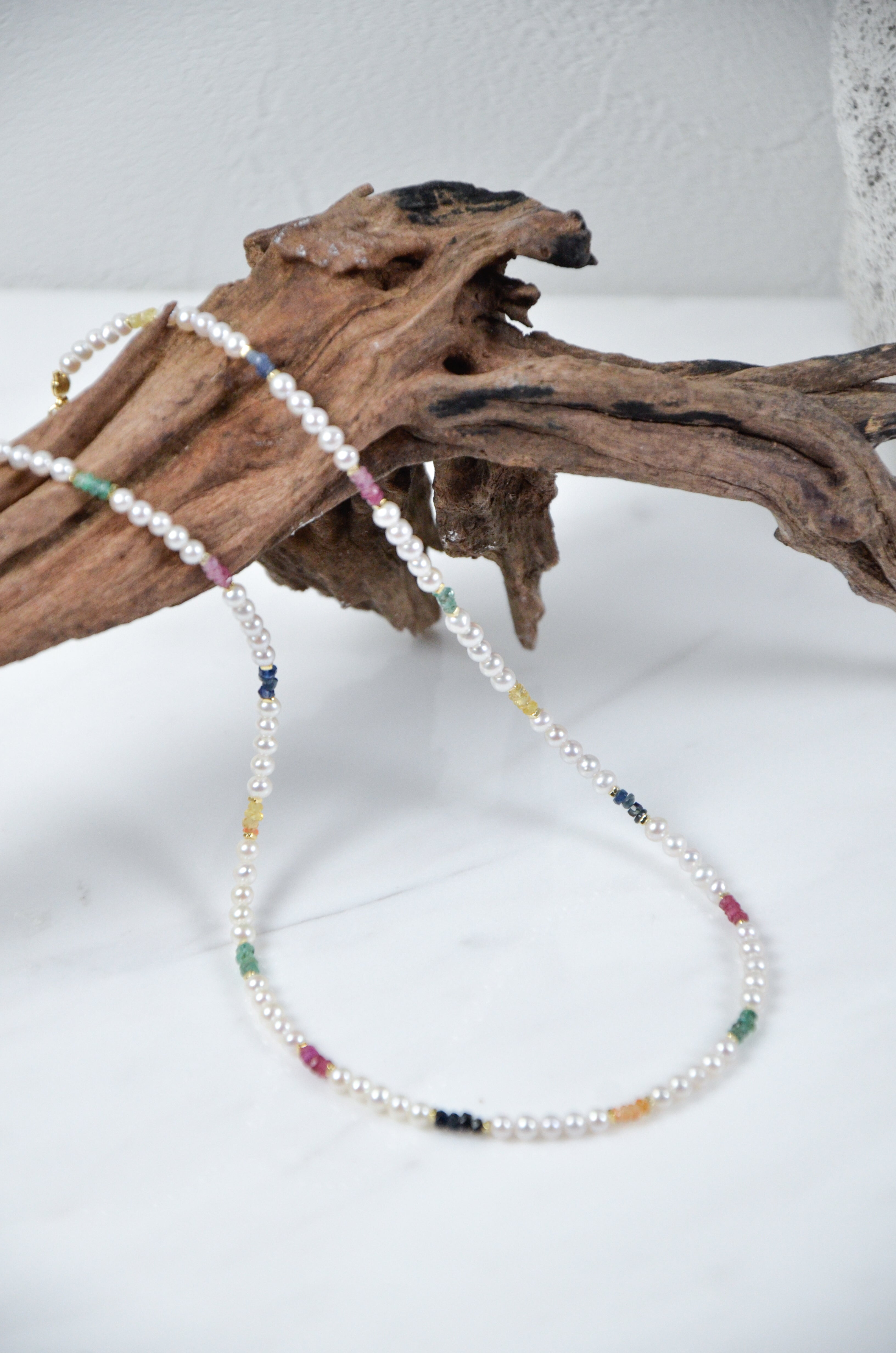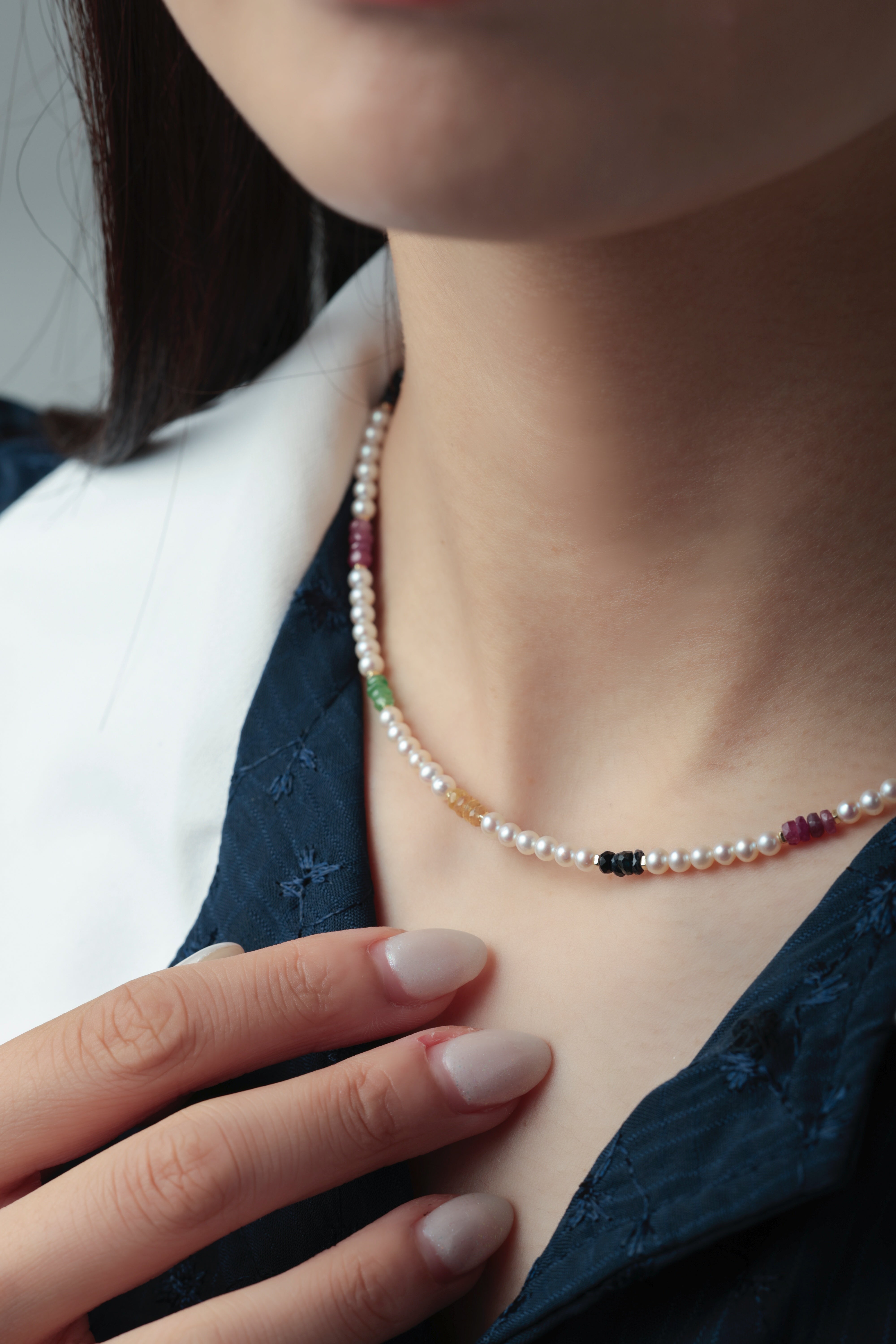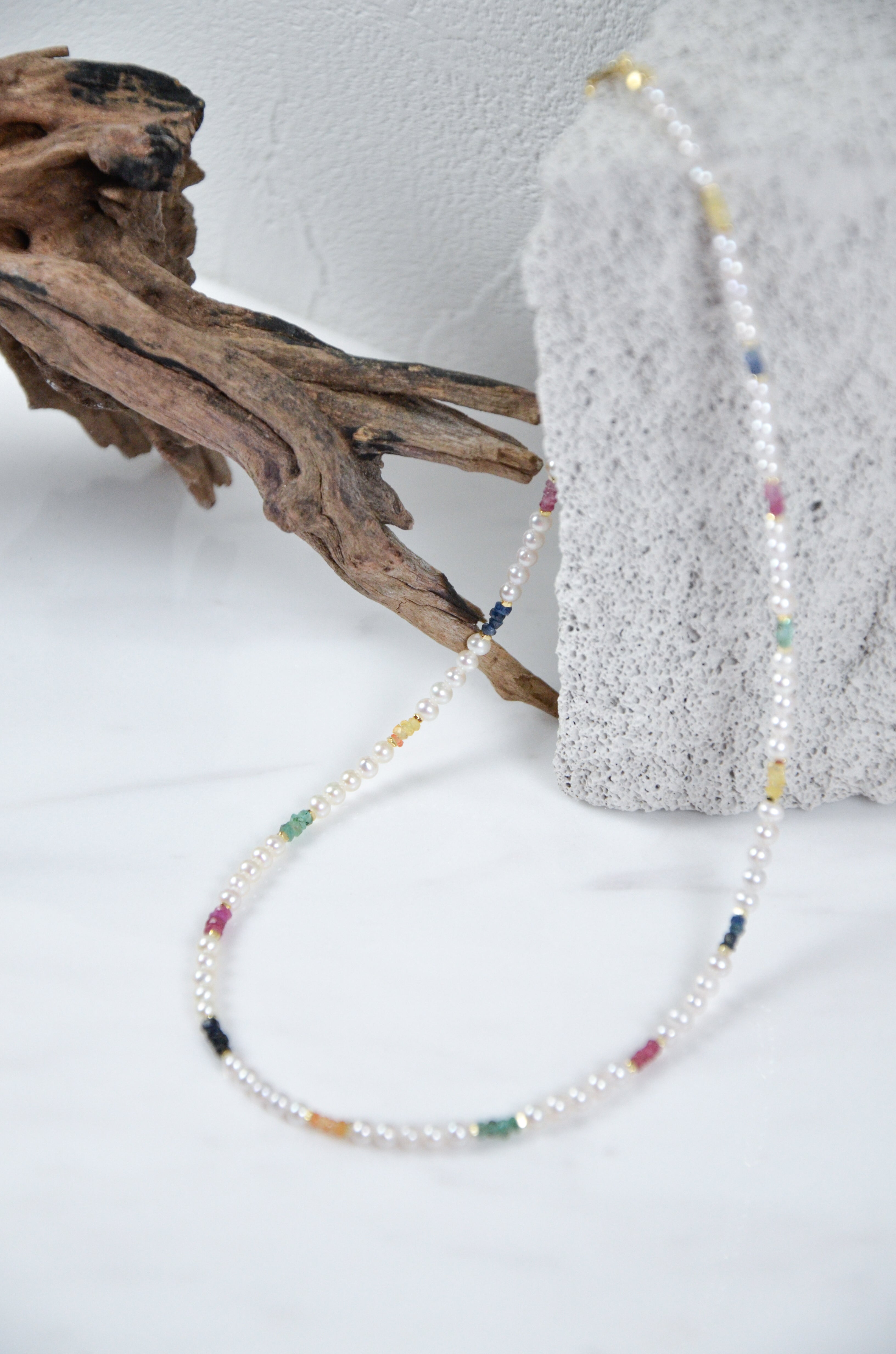 艶やかな淡水パールをベースに、色とりどりのカットストーンをリズムよく配置したネックレスです。日常の中にふと現れる幸せの瞬間や、光・水・草花・街角の彩りを、パールの上品さの中に散りばめました。整ったスクエア型の天然石が控えめながら華やかに輝き、落ち着きと遊び心をあわせ持つデザインに仕上げています。