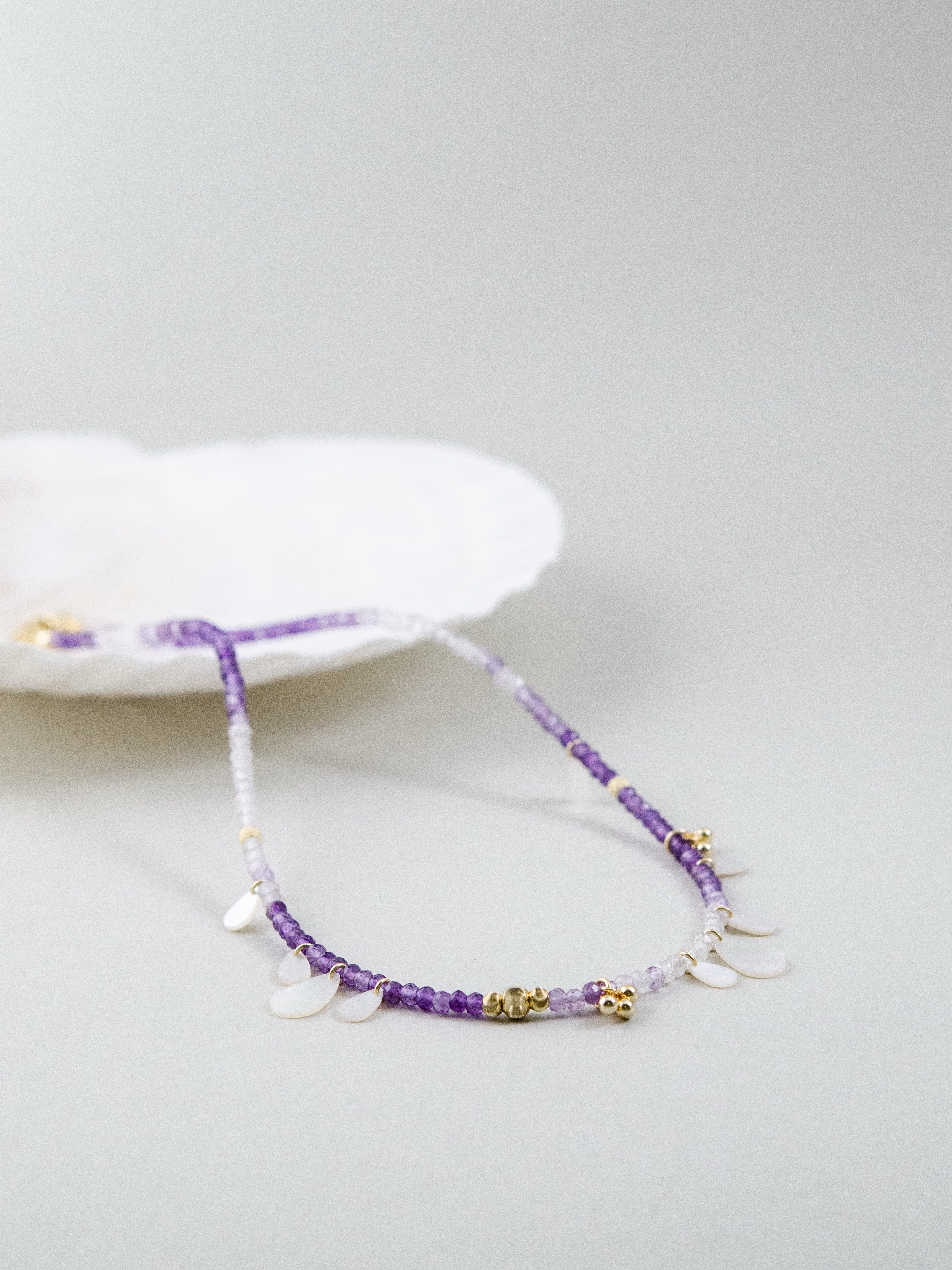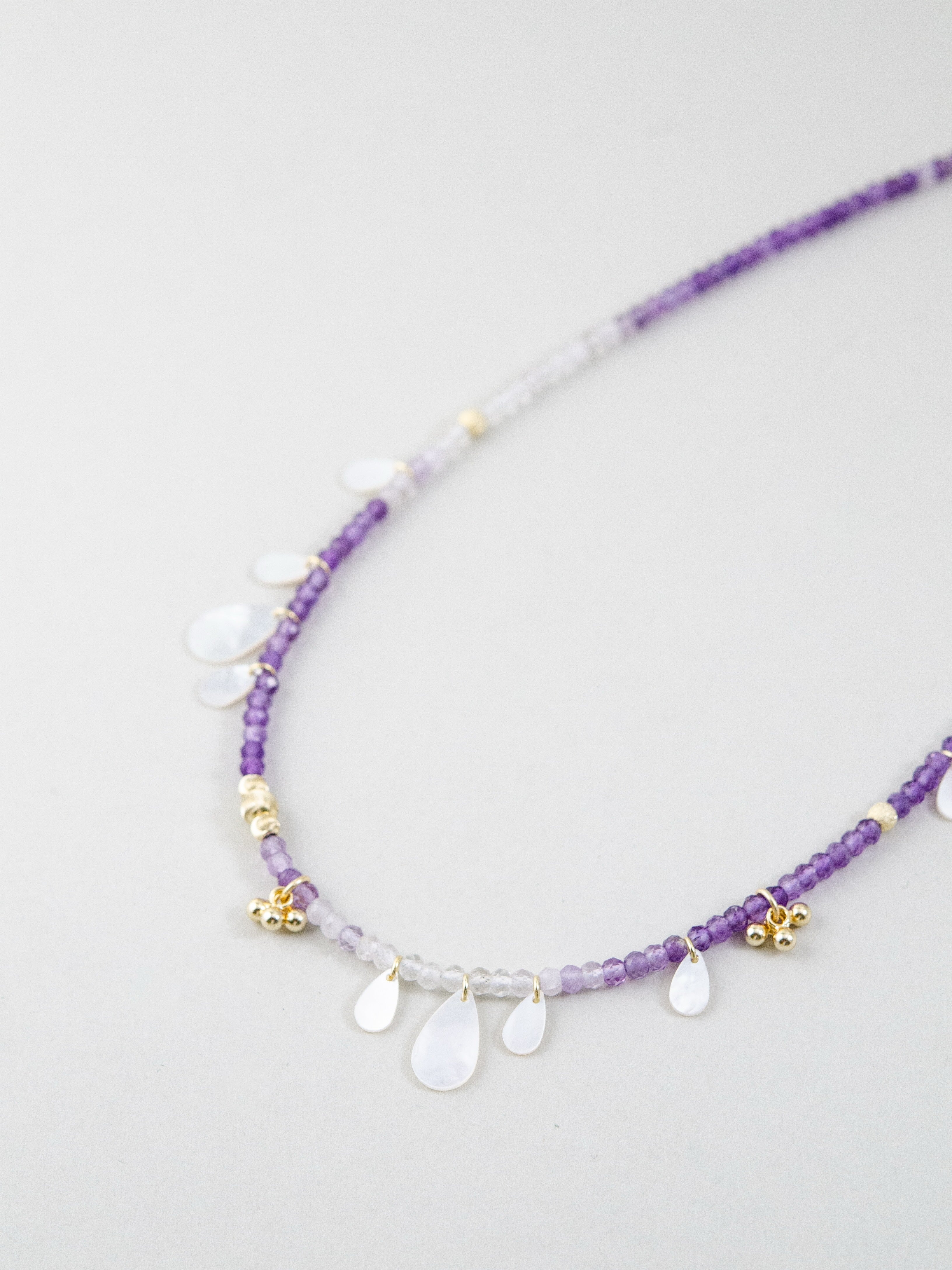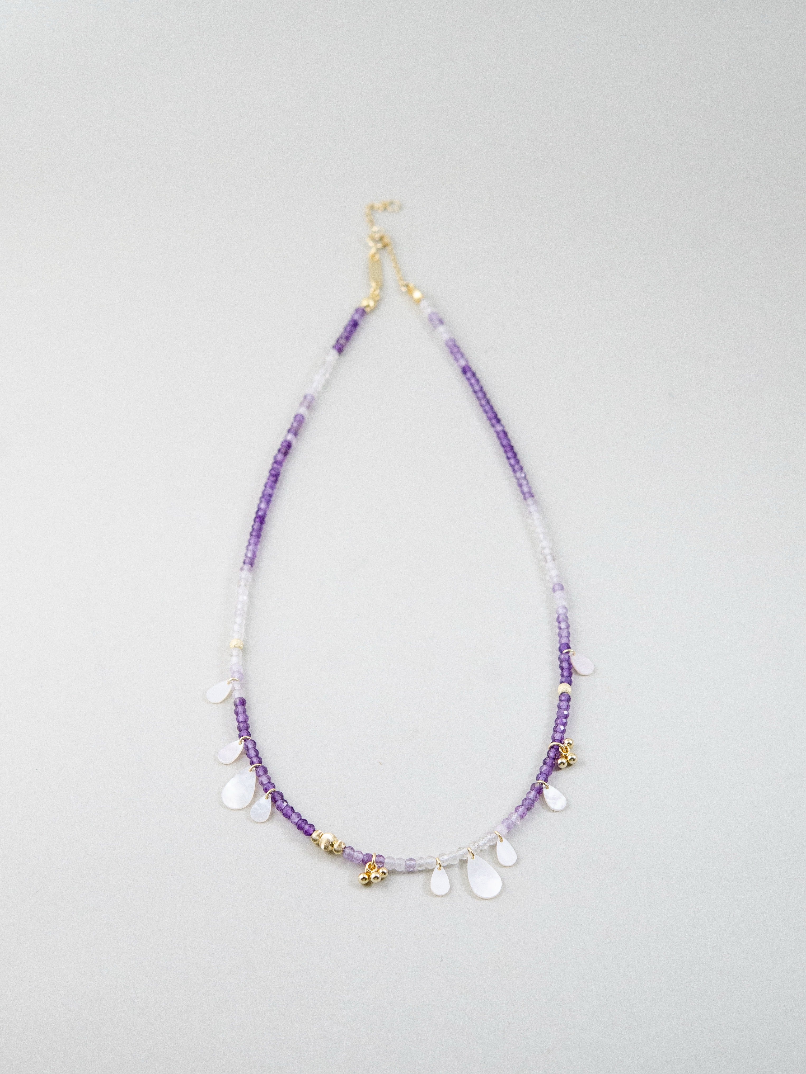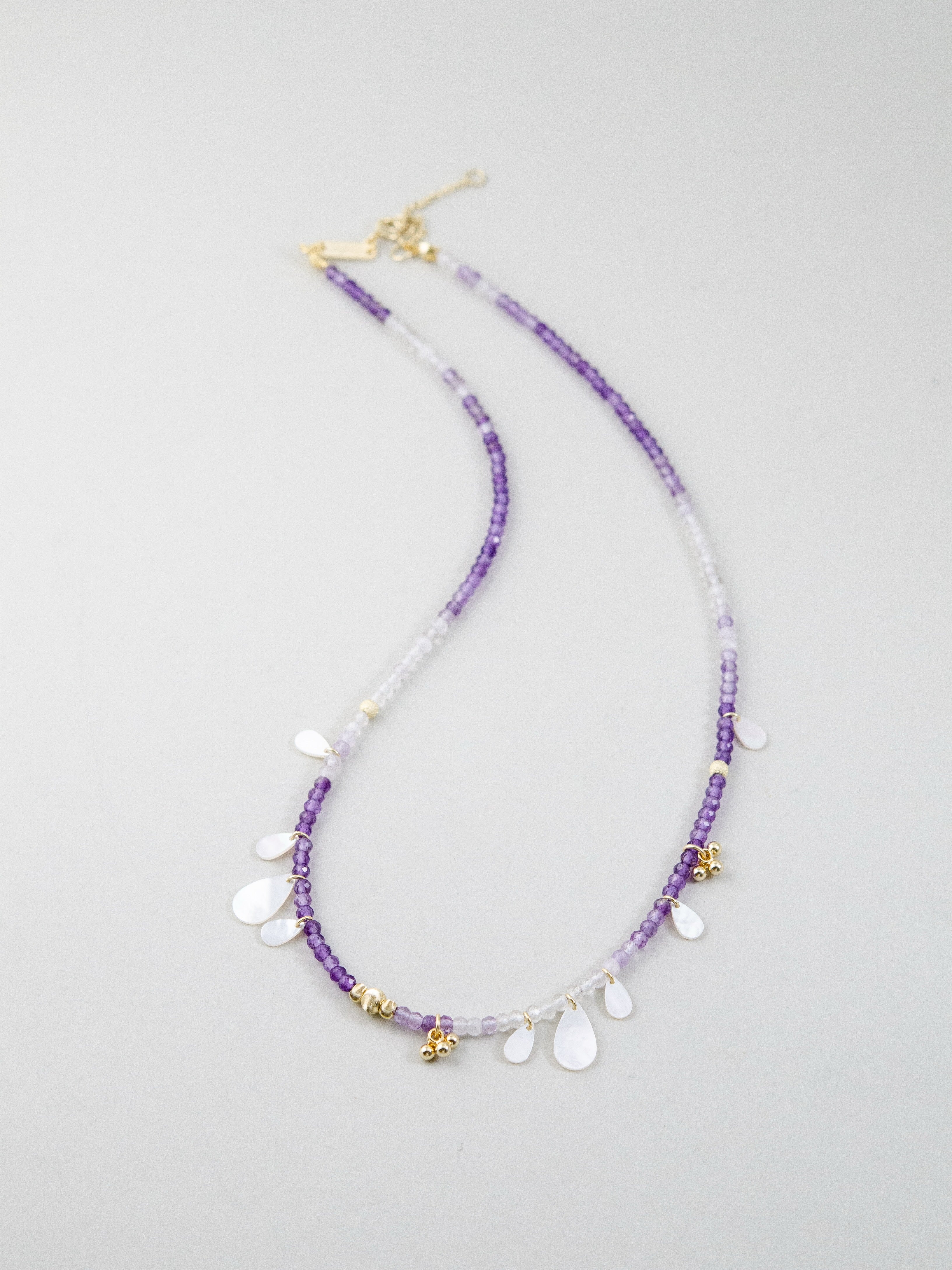 ラベンダーとホワイトのグラデーションが、移ろう空の色のように優しく広がるネックレスです。紫水晶を中心に、淡く透明感のあるストーンとシェルチャームをリズムよく配置し、滴るように揺れるシェルが光を受けて静かに輝きます。小さなゴールドパーツがアクセントとなり、華美ではないのに目を引く上品な存在感。