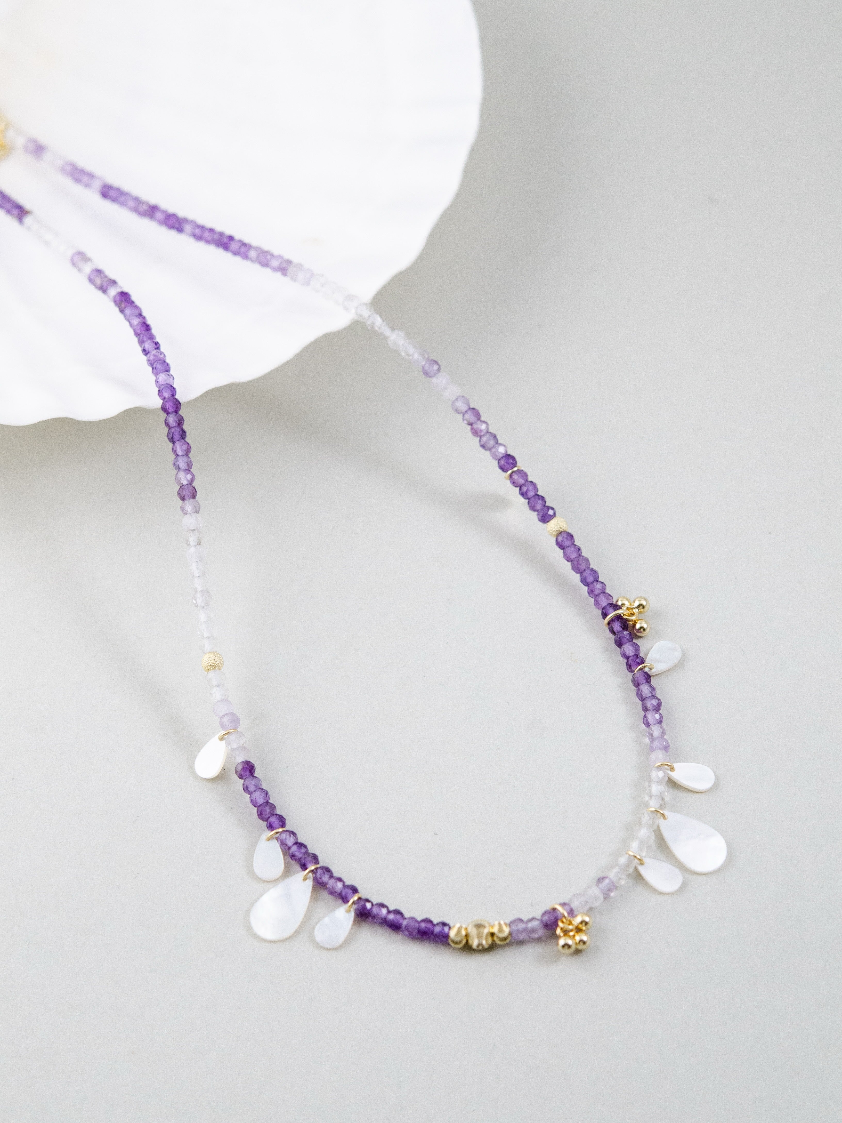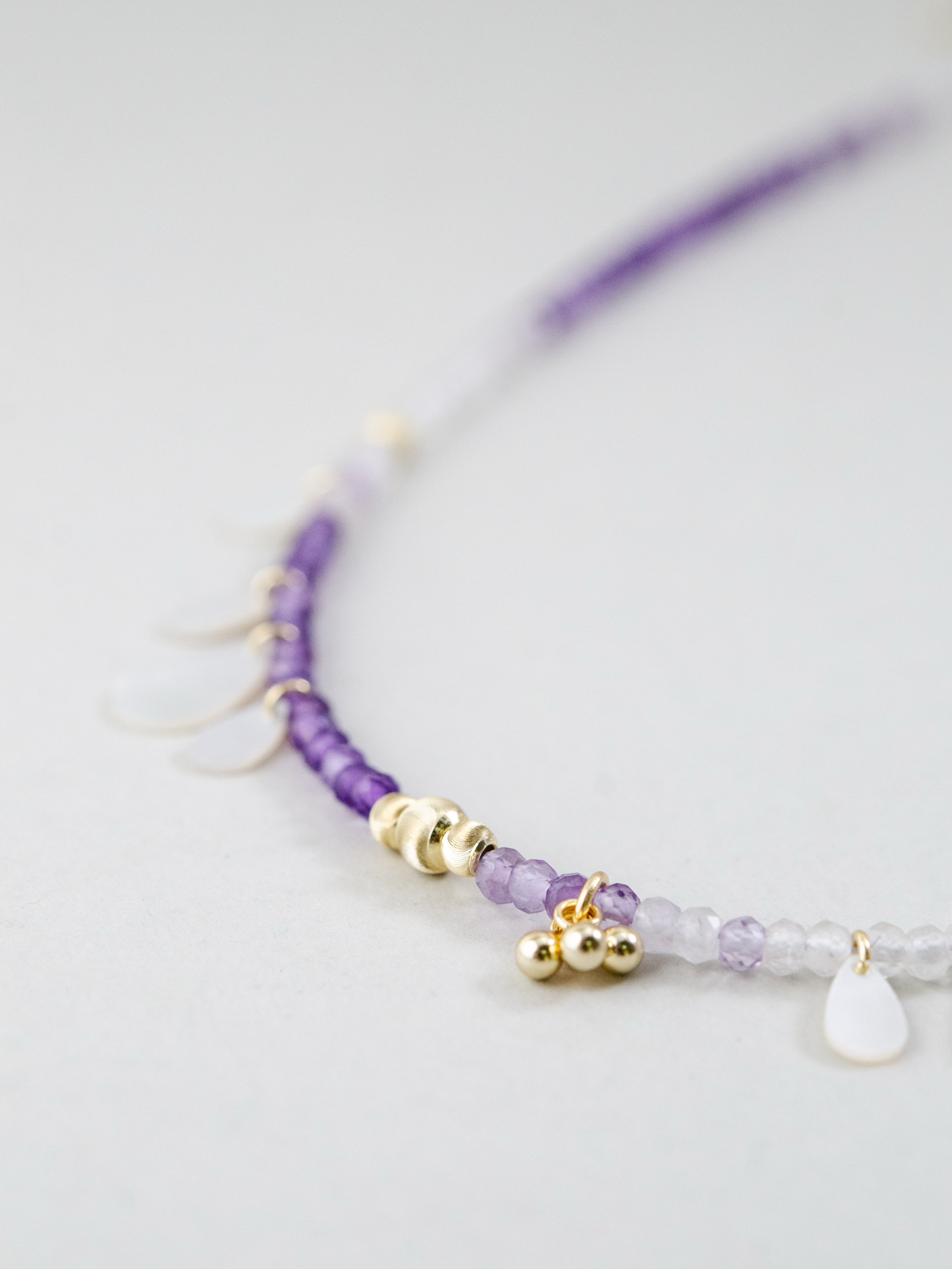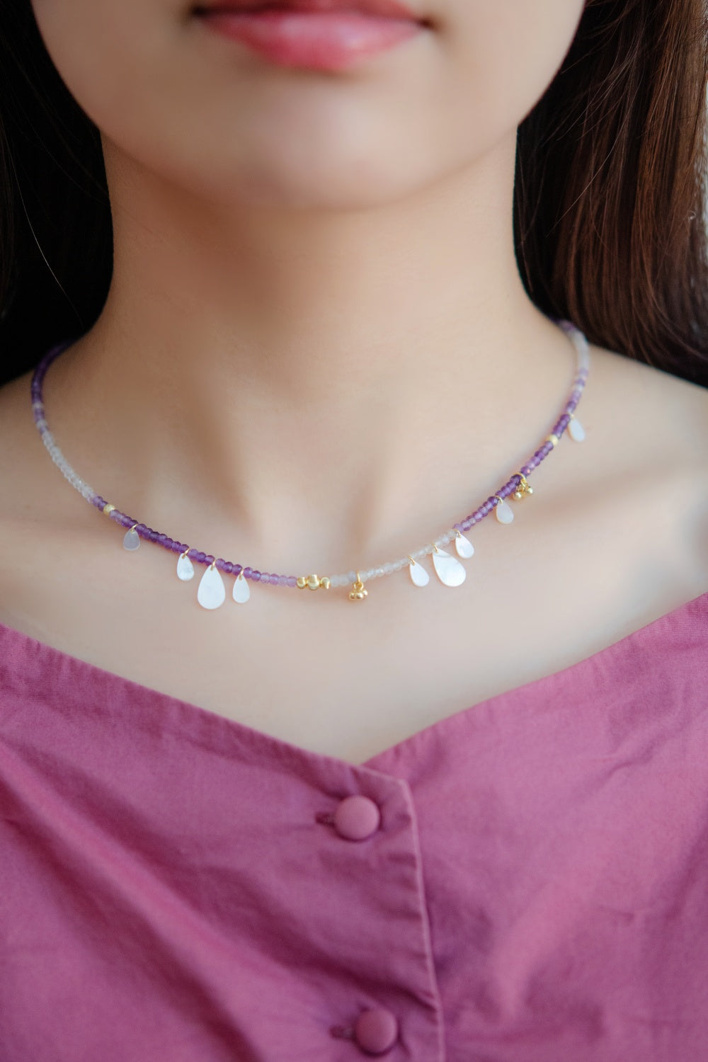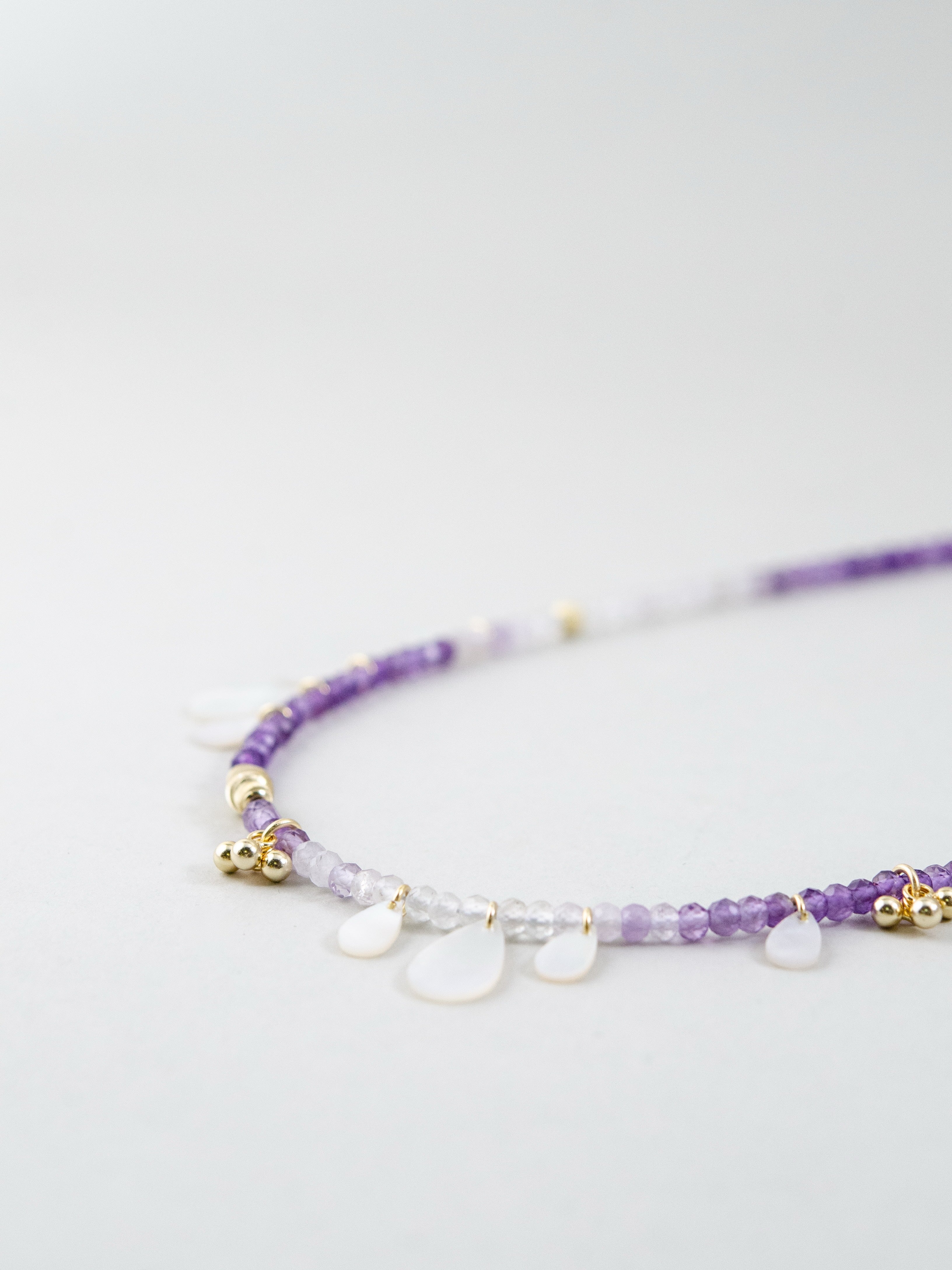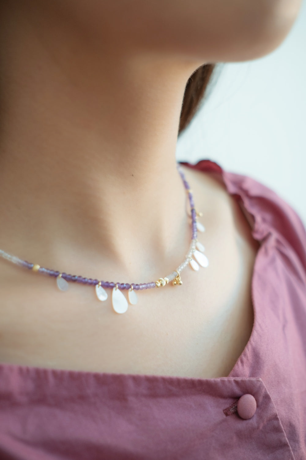 ラベンダーとホワイトのグラデーションが、移ろう空の色のように優しく広がるネックレスです。紫水晶を中心に、淡く透明感のあるストーンとシェルチャームをリズムよく配置し、滴るように揺れるシェルが光を受けて静かに輝きます。小さなゴールドパーツがアクセントとなり、華美ではないのに目を引く上品な存在感。