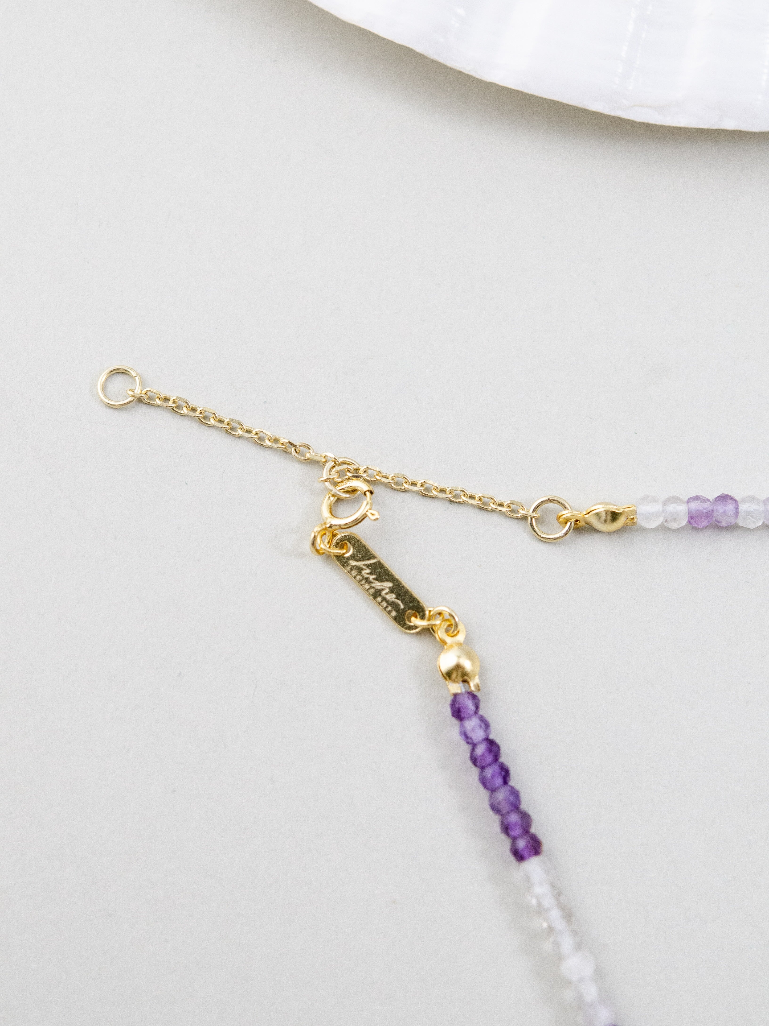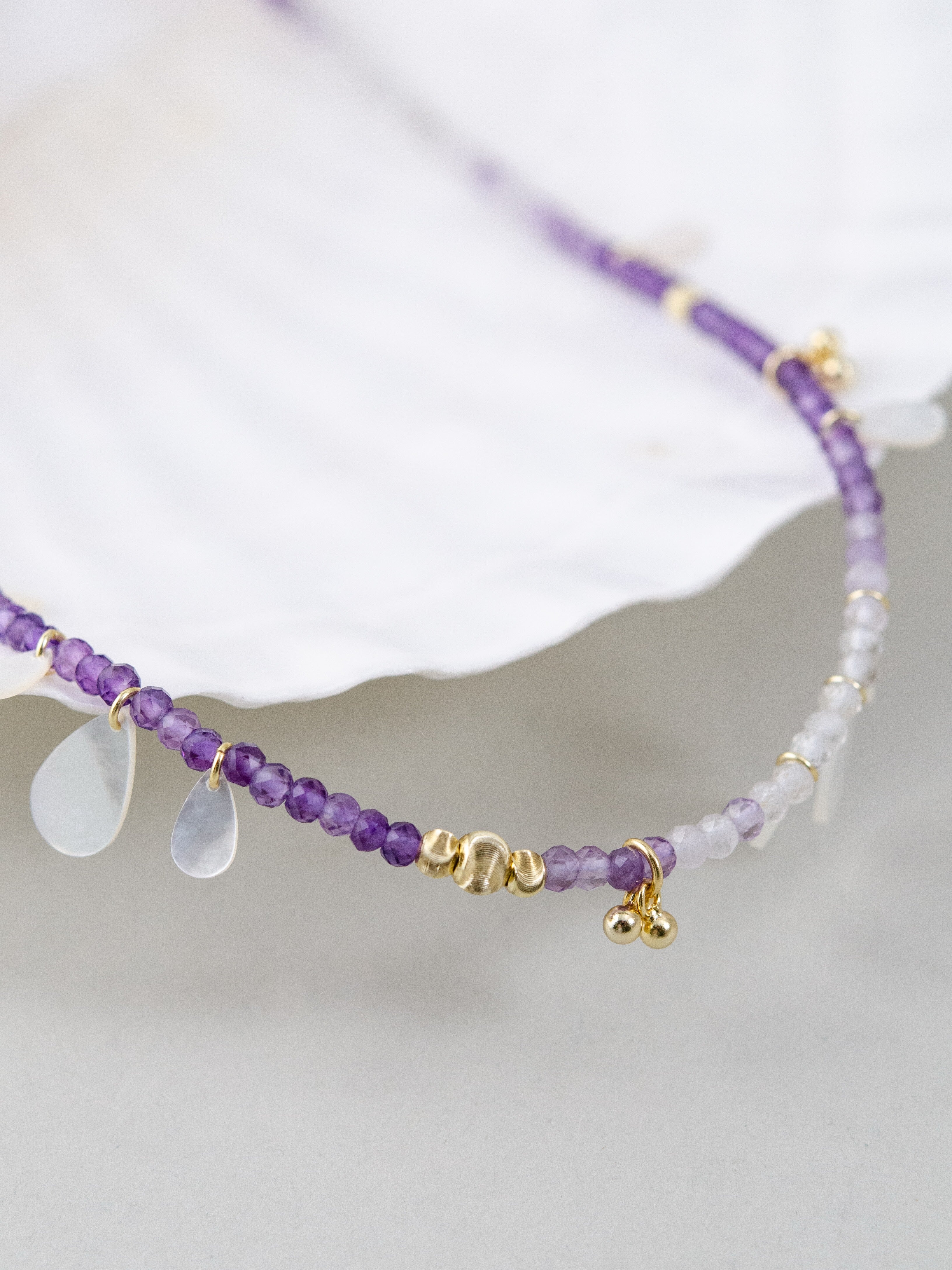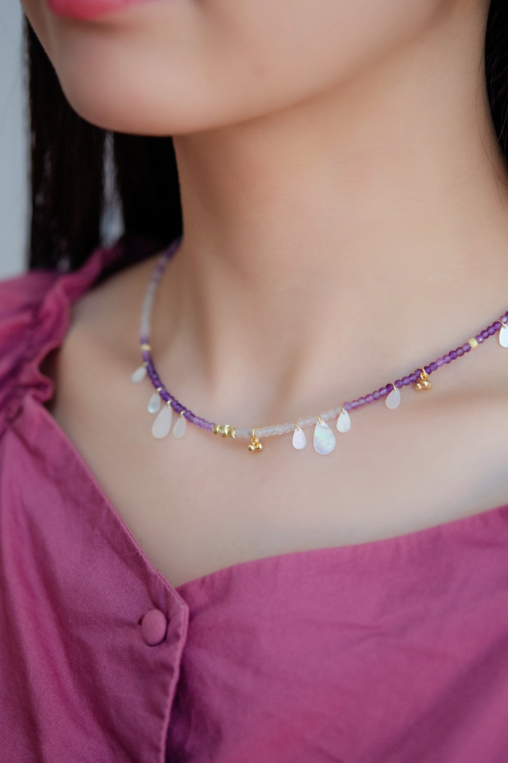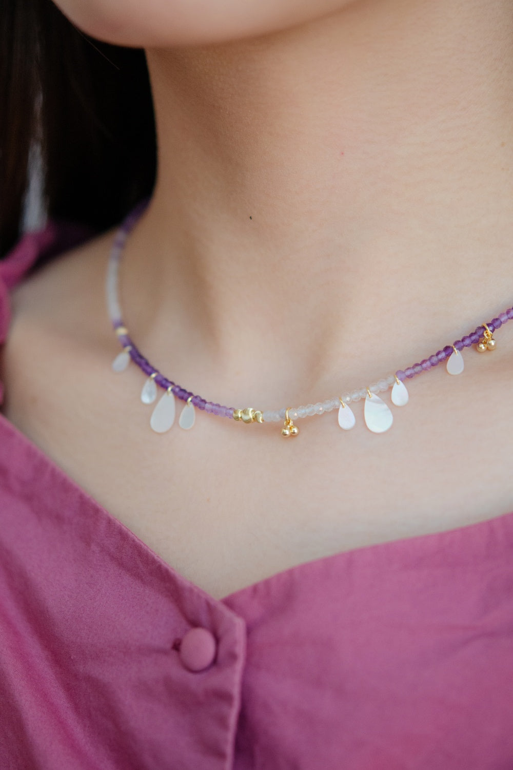 ラベンダーとホワイトのグラデーションが、移ろう空の色のように優しく広がるネックレスです。紫水晶を中心に、淡く透明感のあるストーンとシェルチャームをリズムよく配置し、滴るように揺れるシェルが光を受けて静かに輝きます。小さなゴールドパーツがアクセントとなり、華美ではないのに目を引く上品な存在感。