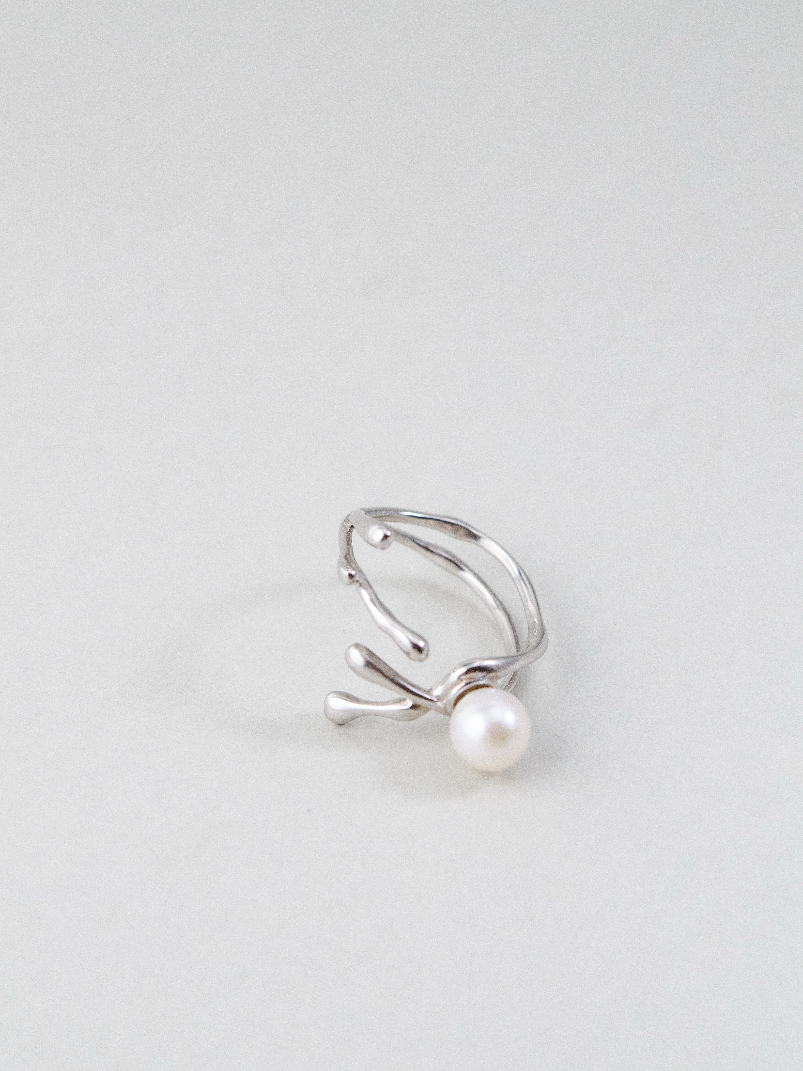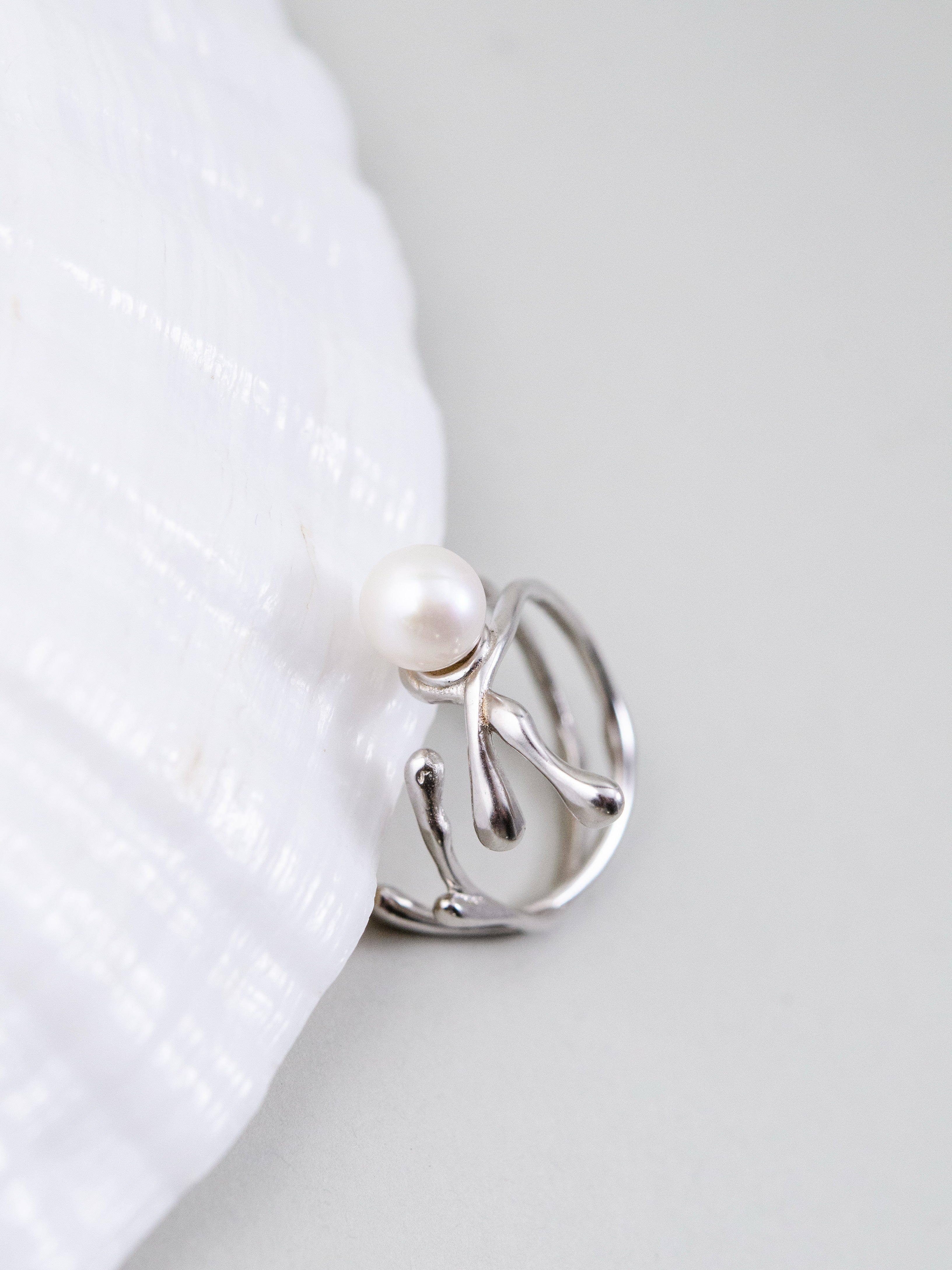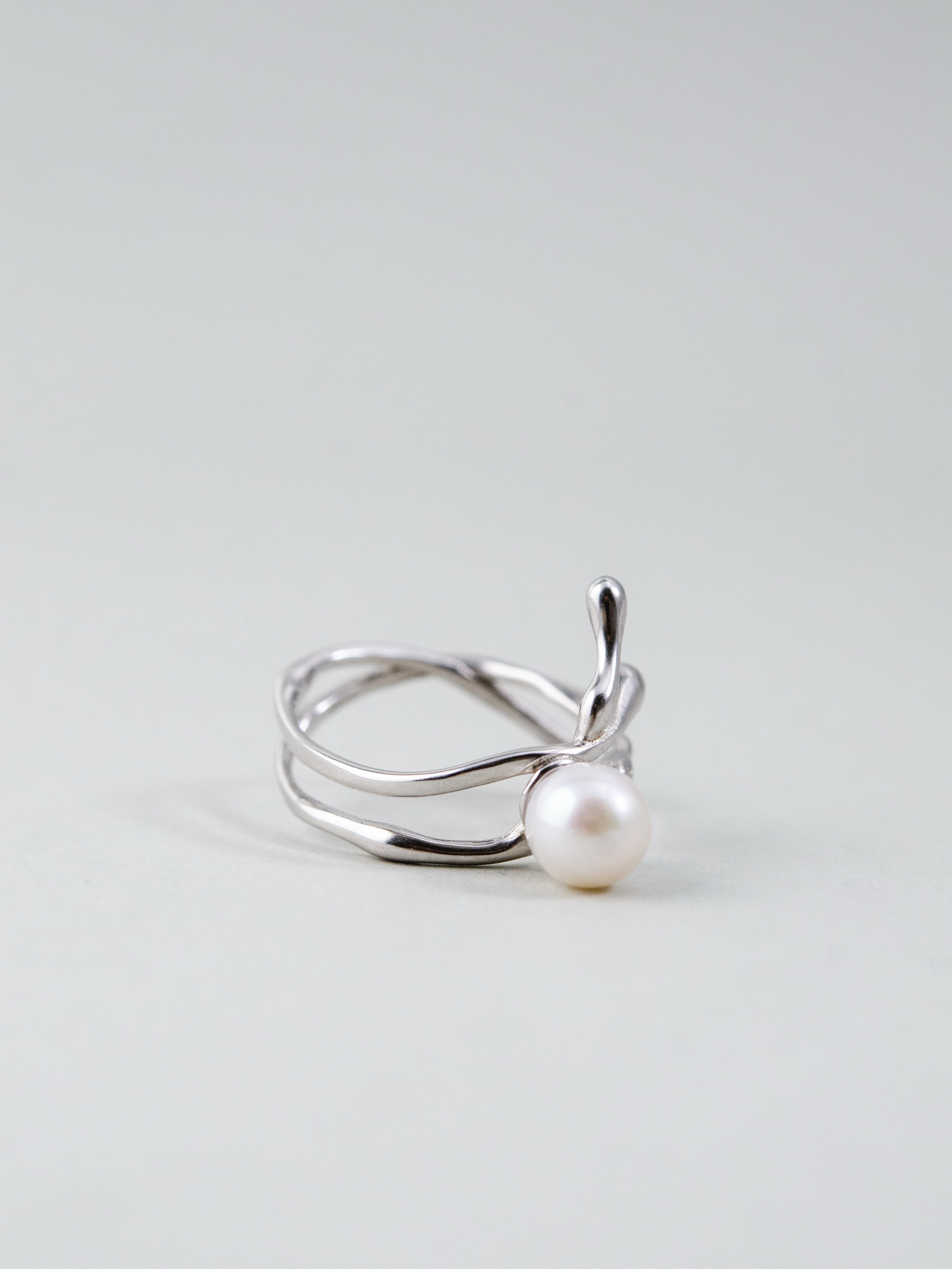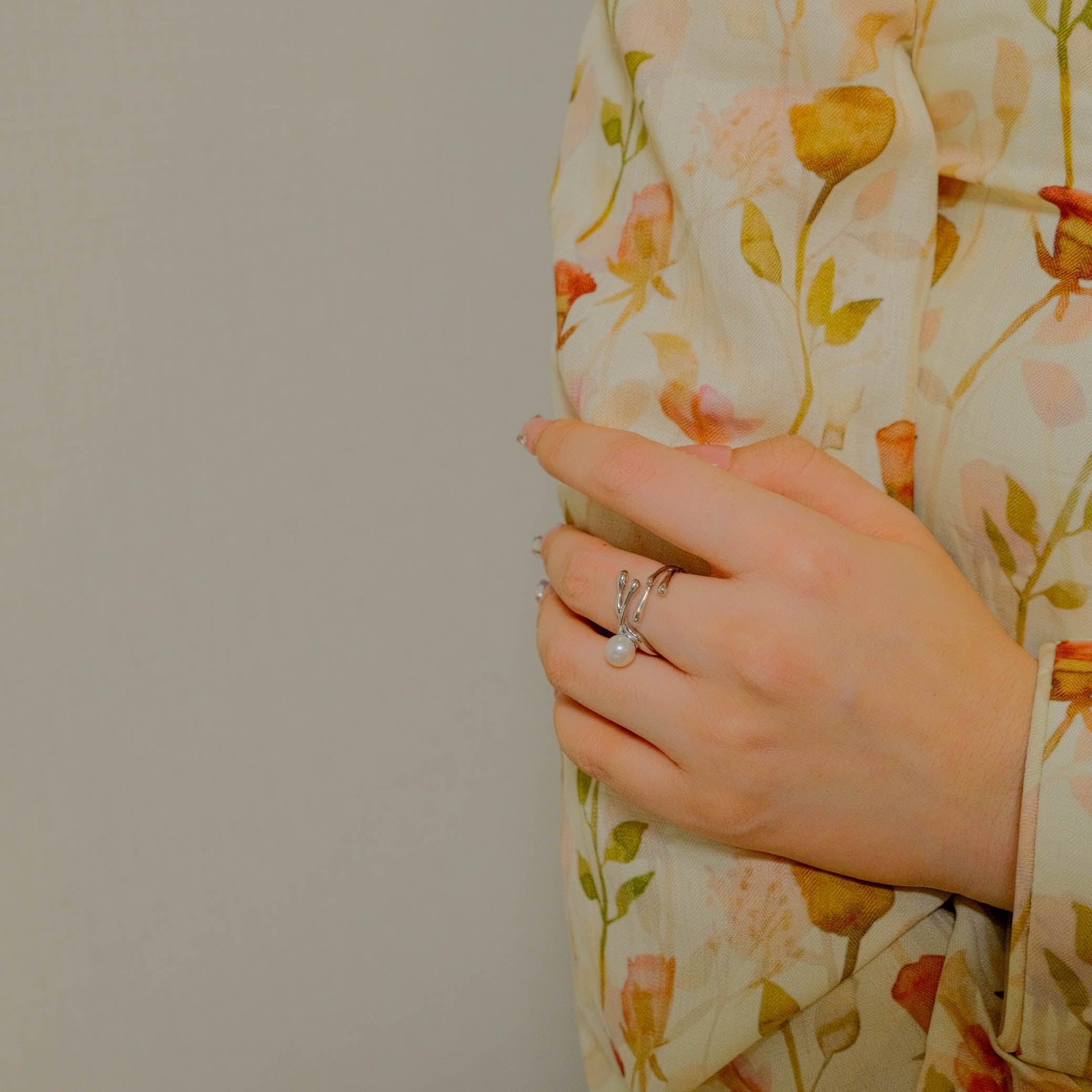 自然を思わせる流れるようなフォルムが印象的なリング。一粒の高品質パールを中心にあしらい、シルバーの光沢とパールの柔らかな輝きが絶妙に調和します。繊細ながら存在感のあるデザインは、手元に上品さと個性を添え、日常を特別なものに変えるアクセントとして活躍します。