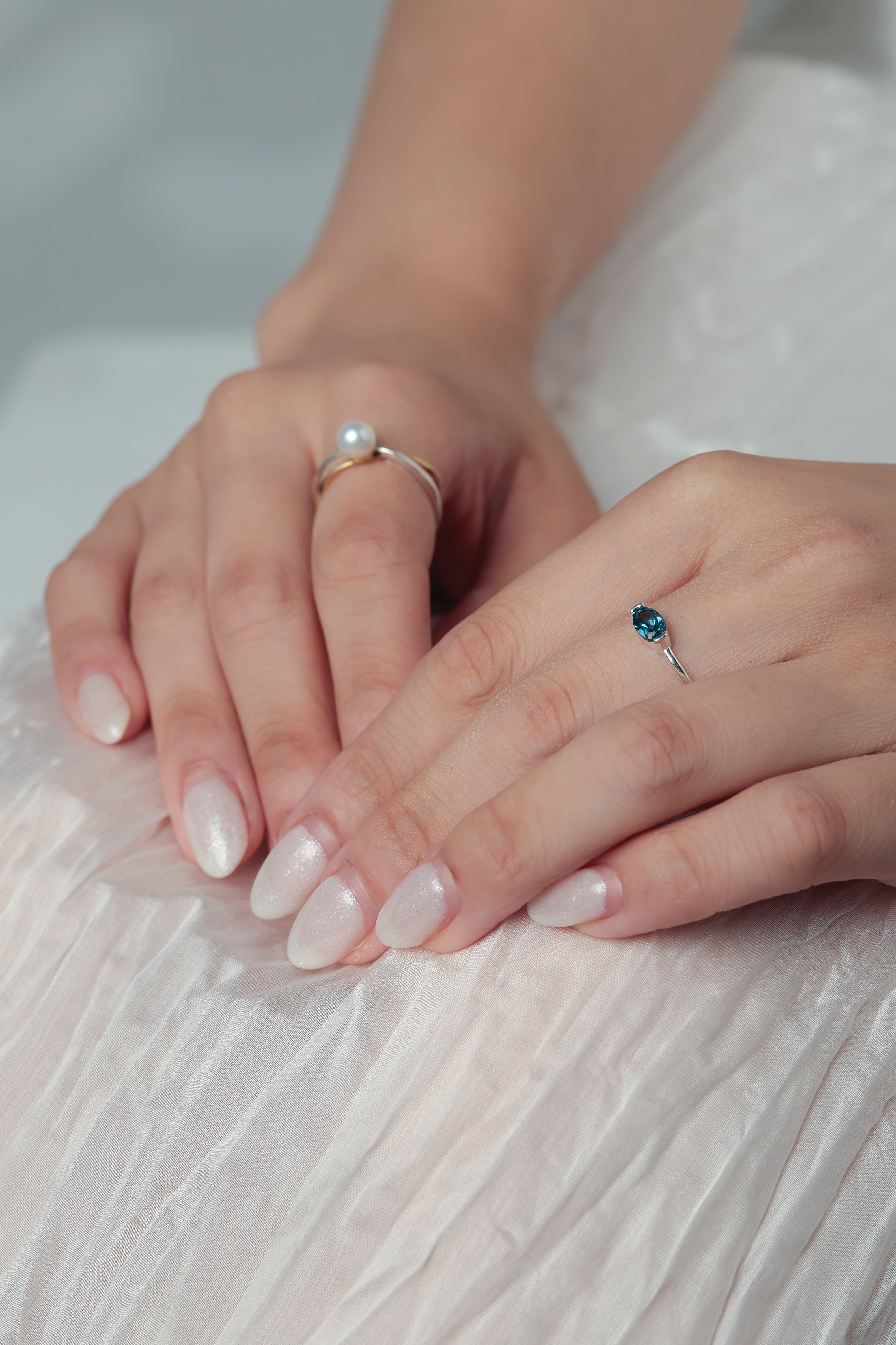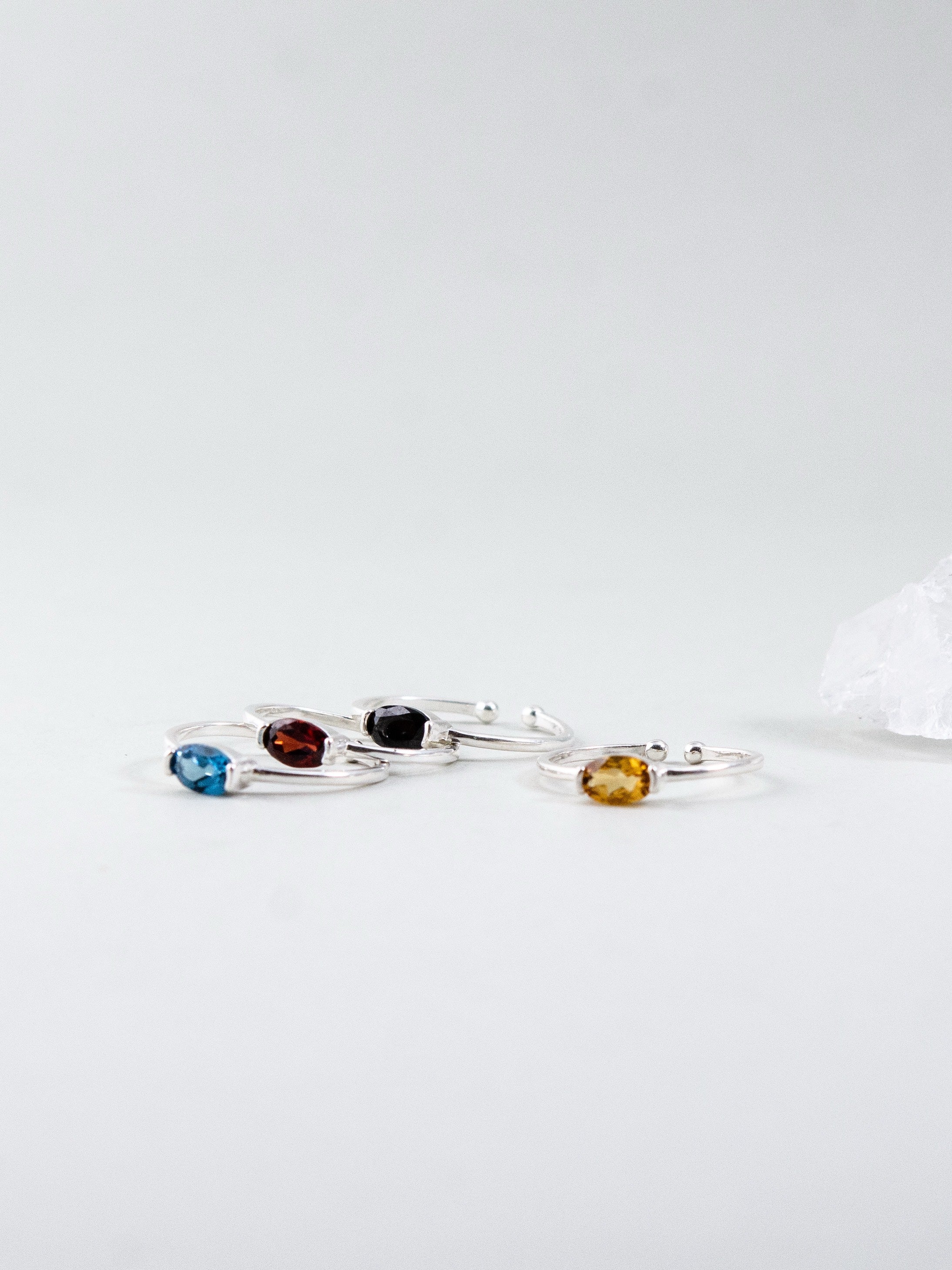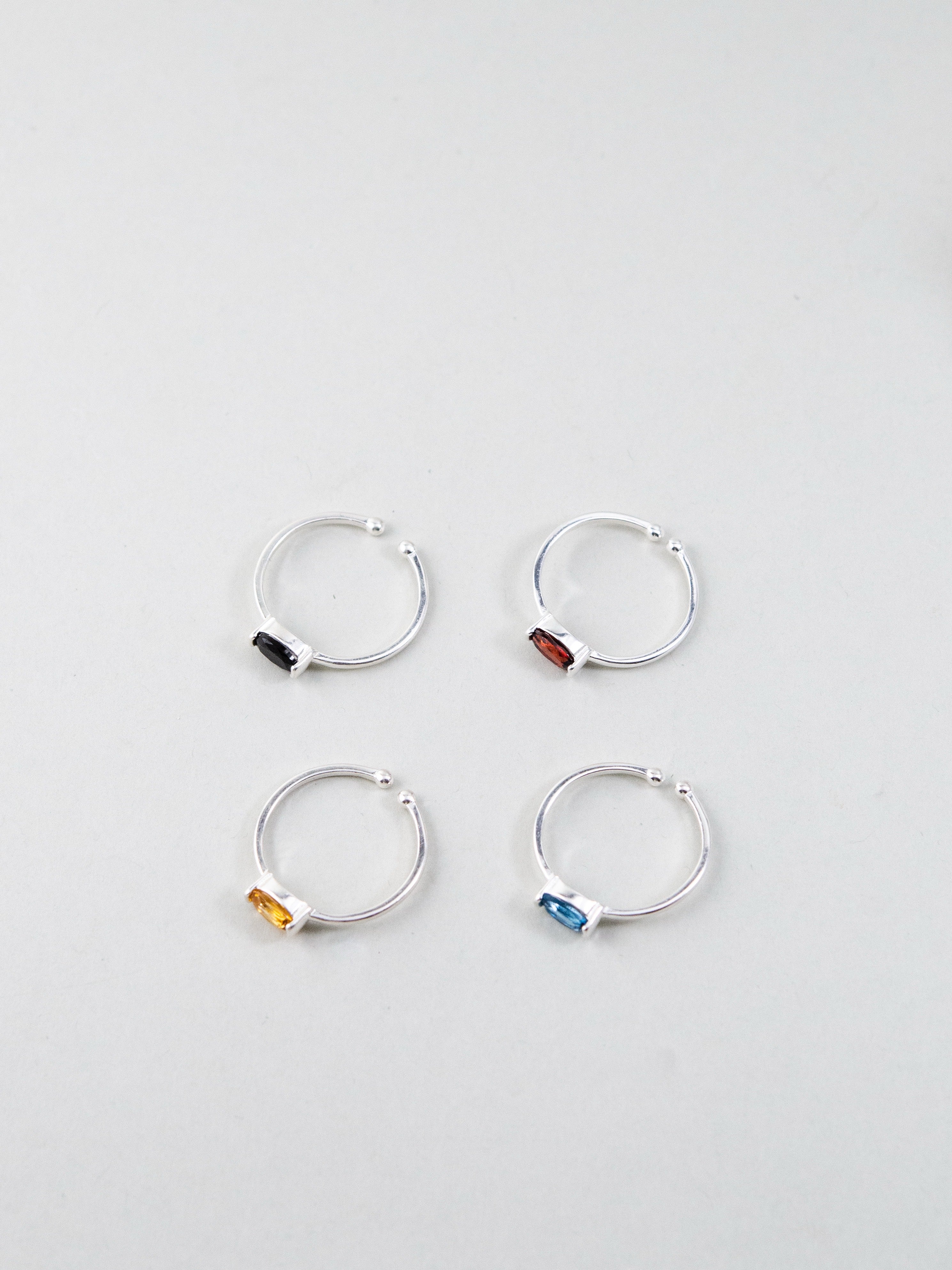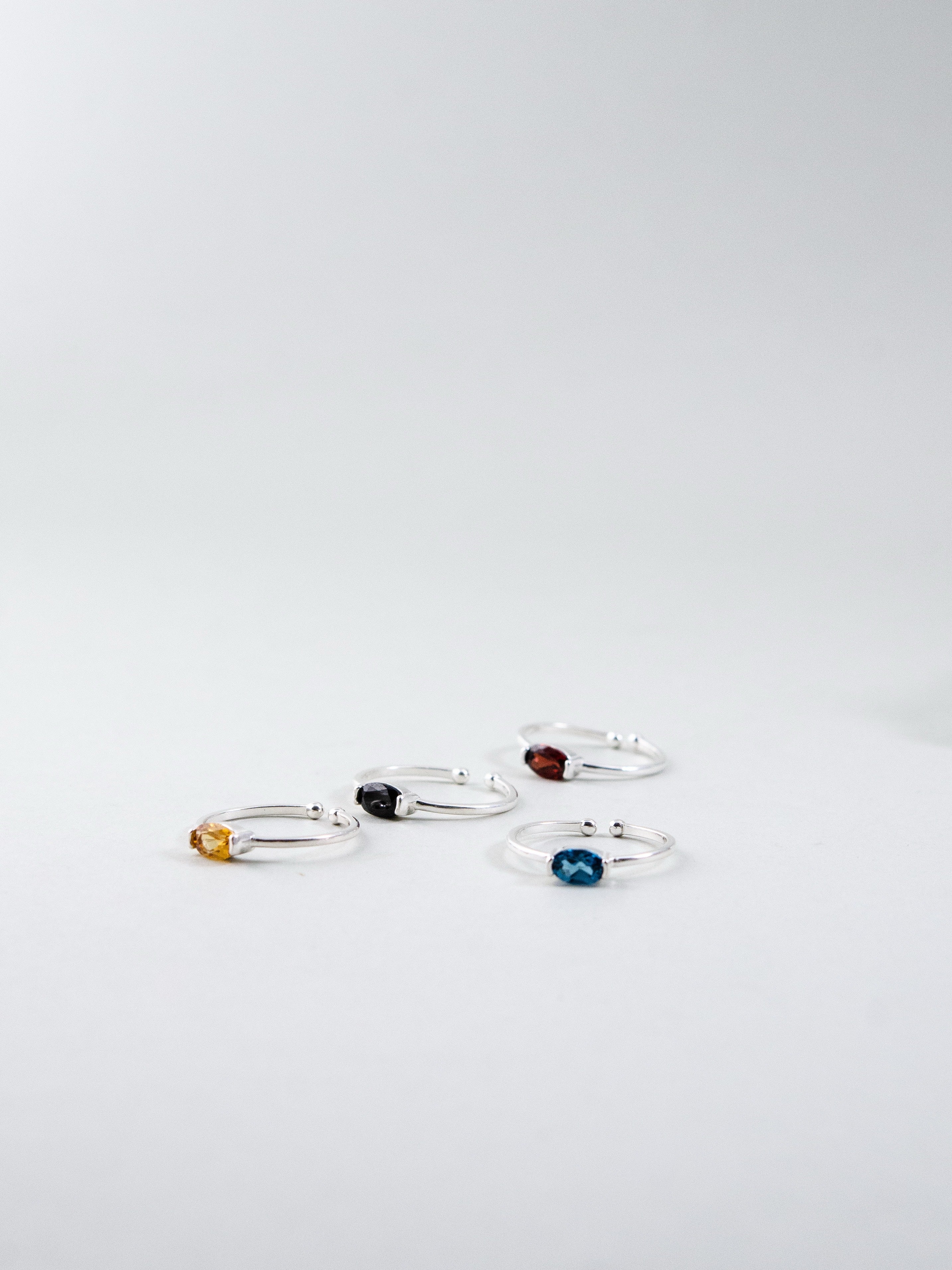色とりどりの天然石―ブルートパーズ、ガーネット、スピネル、シトリン、トルマリン―をひと粒ずつセッティングしたミニマルで華やかなリング。シルバーの細身リングが宝石の透明感と色彩を引き立て、単品でも重ね付けでも楽しめます。日常から特別な日まで、手元にさりげない個性と上品な抜け感を添えるデザインです。