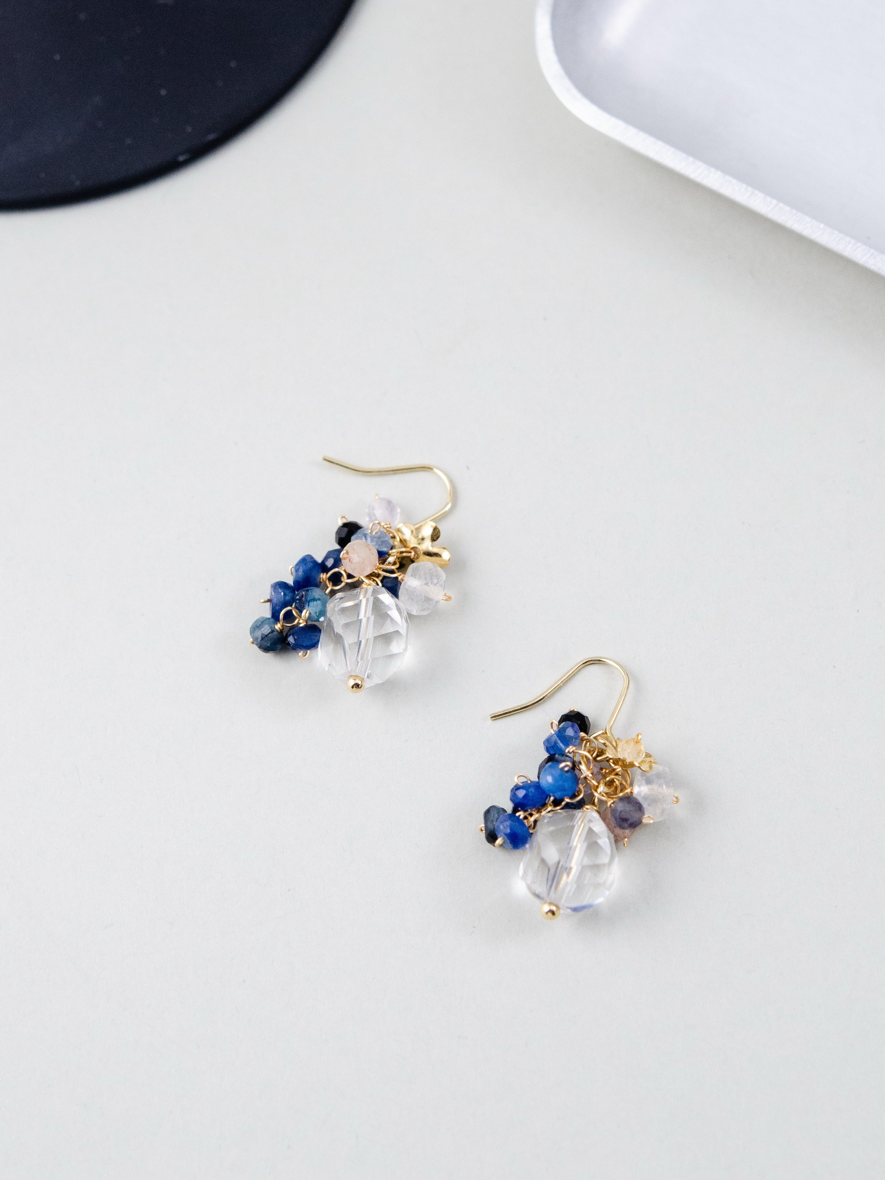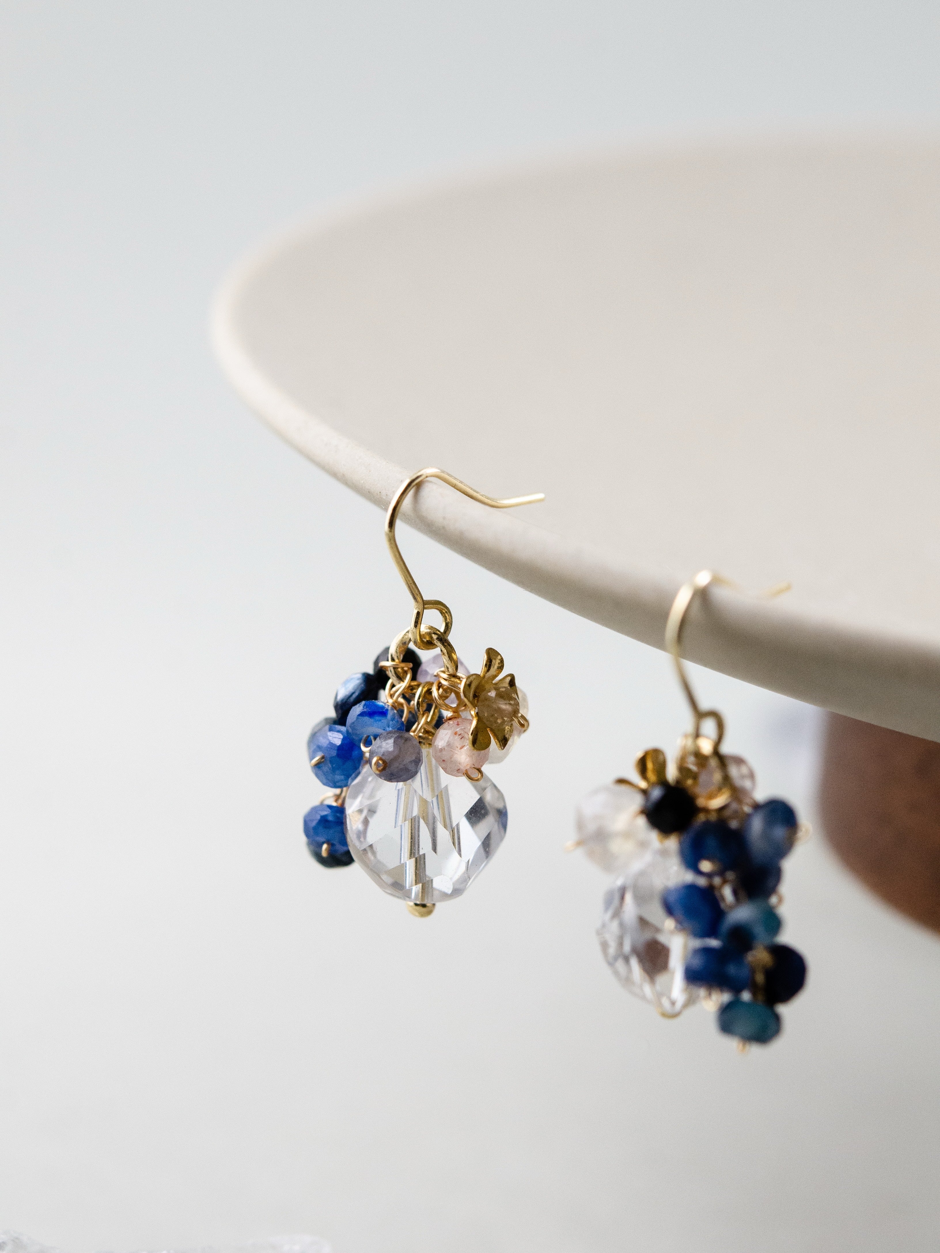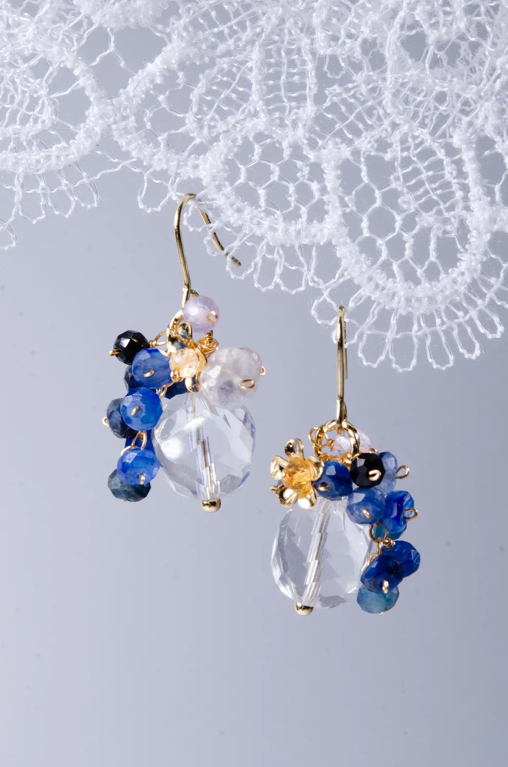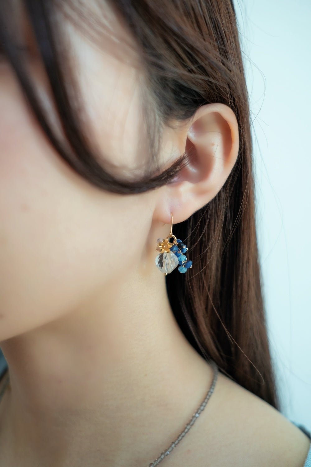 透明感あふれるクリスタルクォーツと、深海のようなブルーカイヤナイトを組み合わせたイヤリング。大粒のファセットカットクリスタルが光を受けてきらめき、ブルーカイヤナイトの自然なグラデーションが凛とした清らかさを演出します。小さなゴールドフラワーパーツがアクセントとなり、軽やかで大人の可愛らしさを添えます。