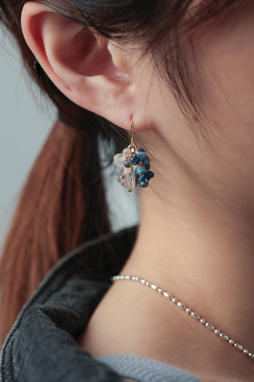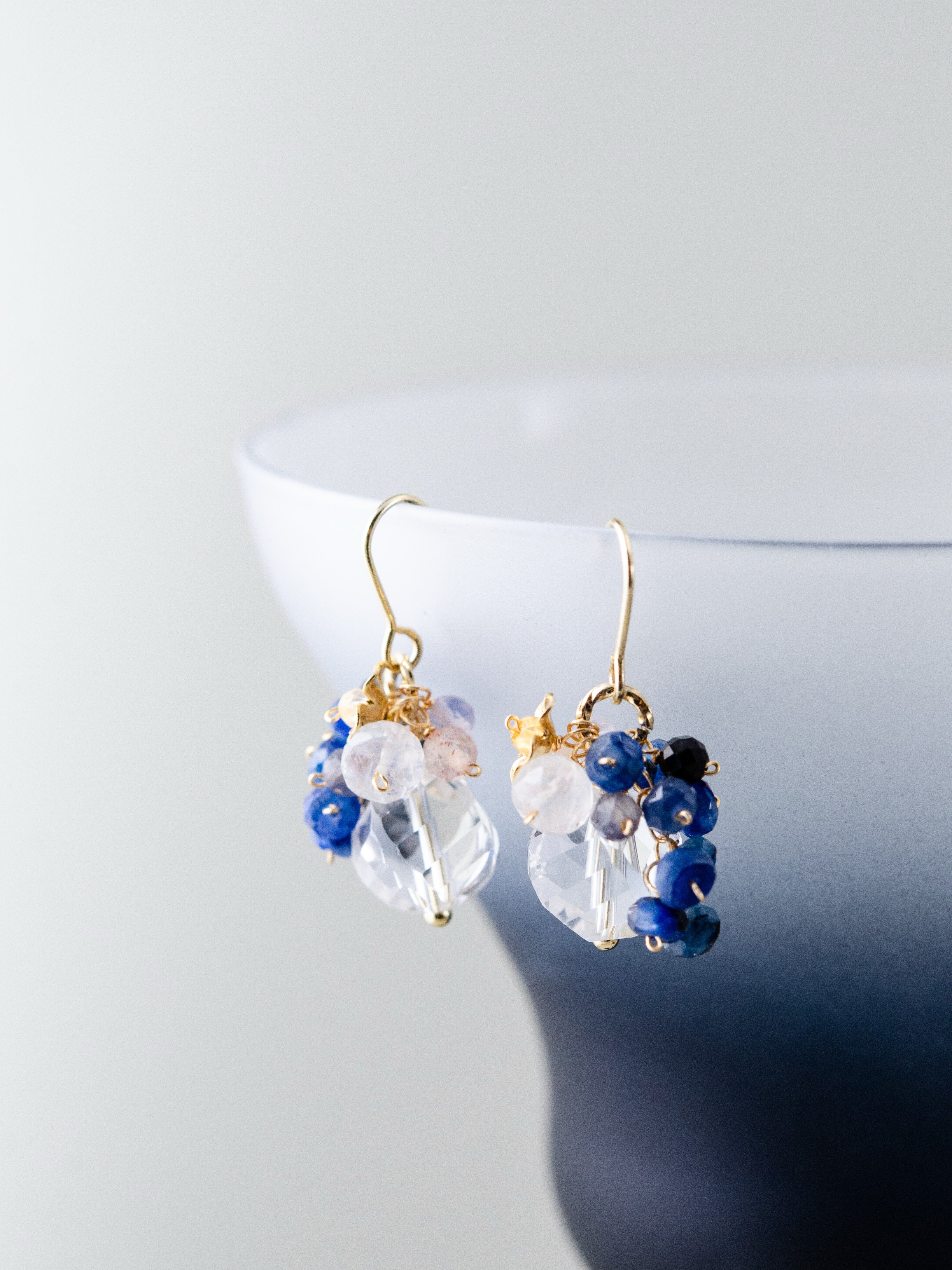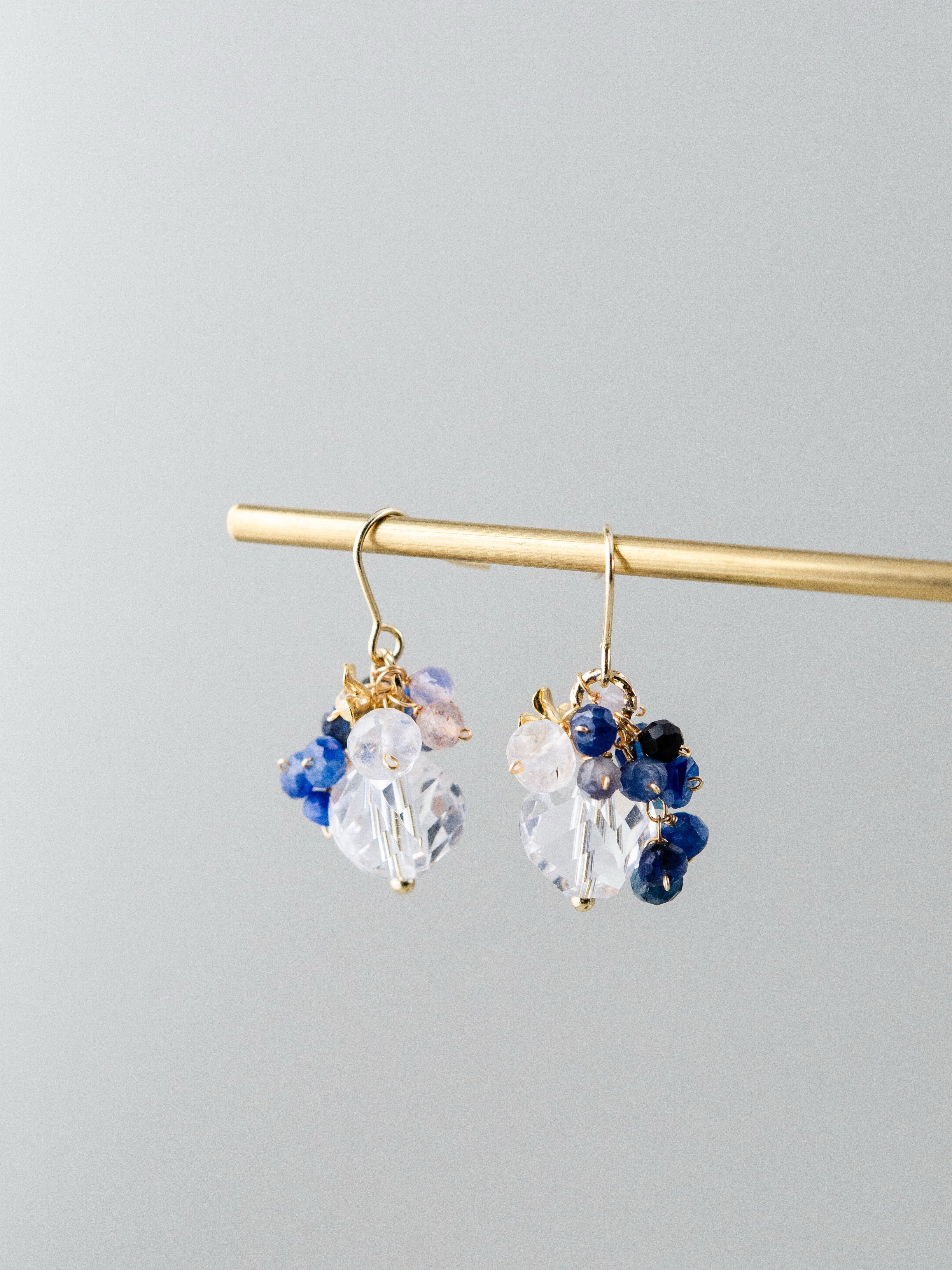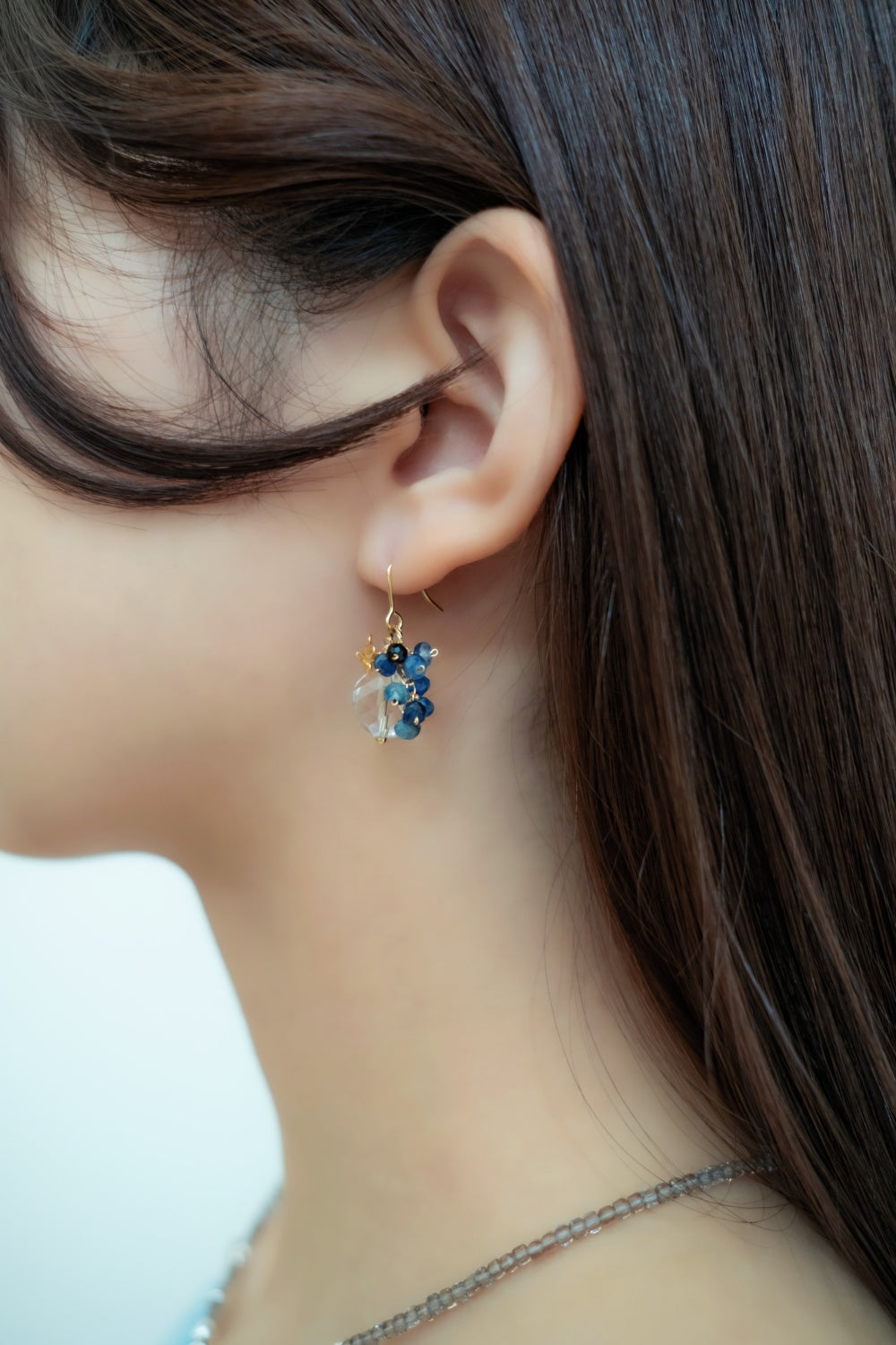 透明感あふれるクリスタルクォーツと、深海のようなブルーカイヤナイトを組み合わせたイヤリング。大粒のファセットカットクリスタルが光を受けてきらめき、ブルーカイヤナイトの自然なグラデーションが凛とした清らかさを演出します。小さなゴールドフラワーパーツがアクセントとなり、軽やかで大人の可愛らしさを添えます。