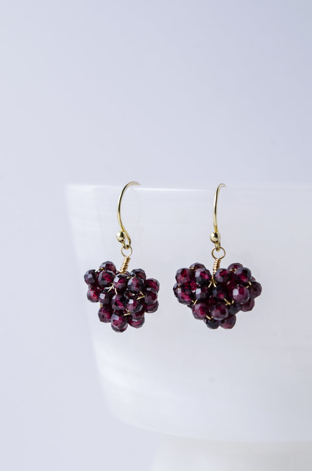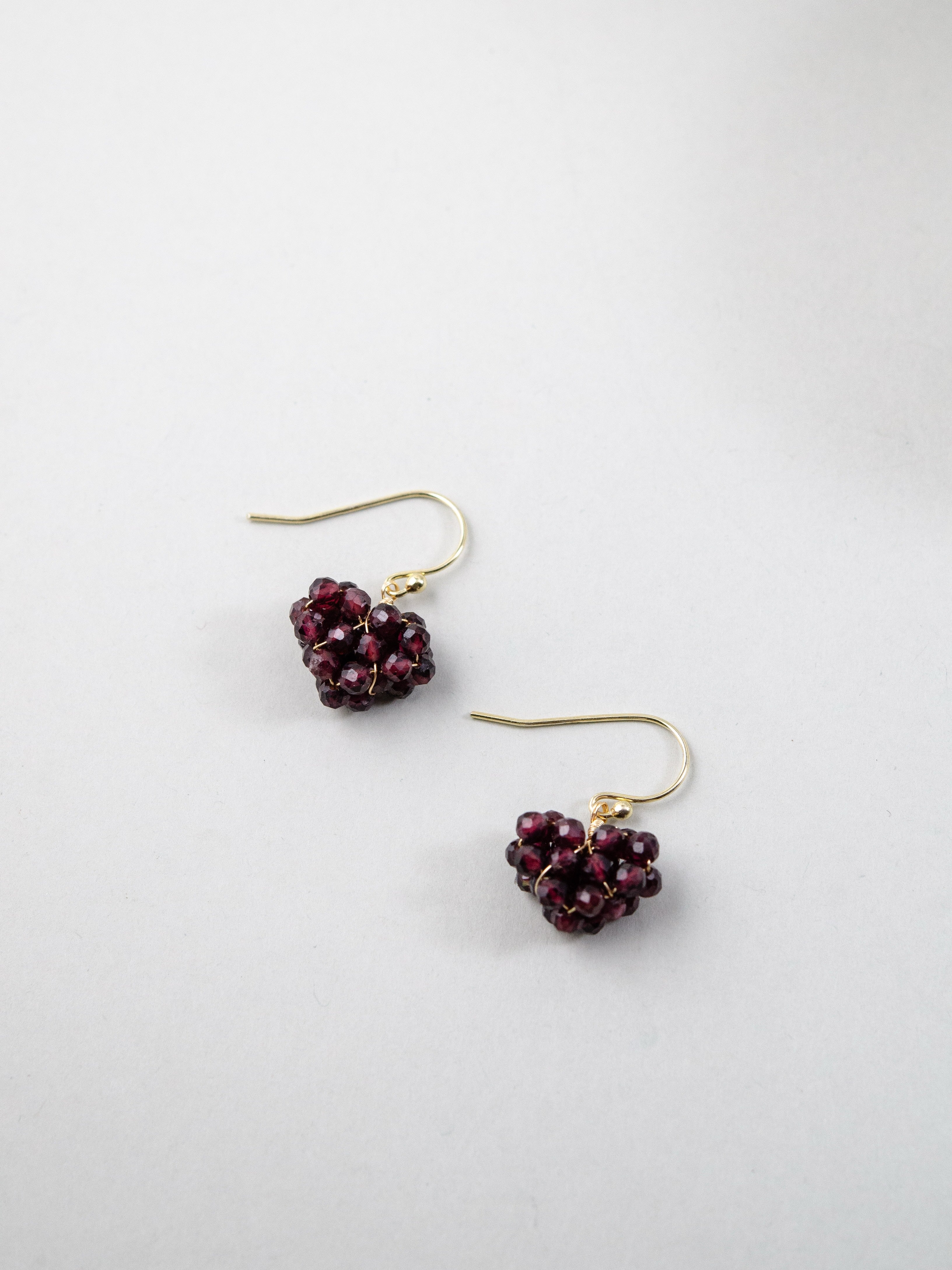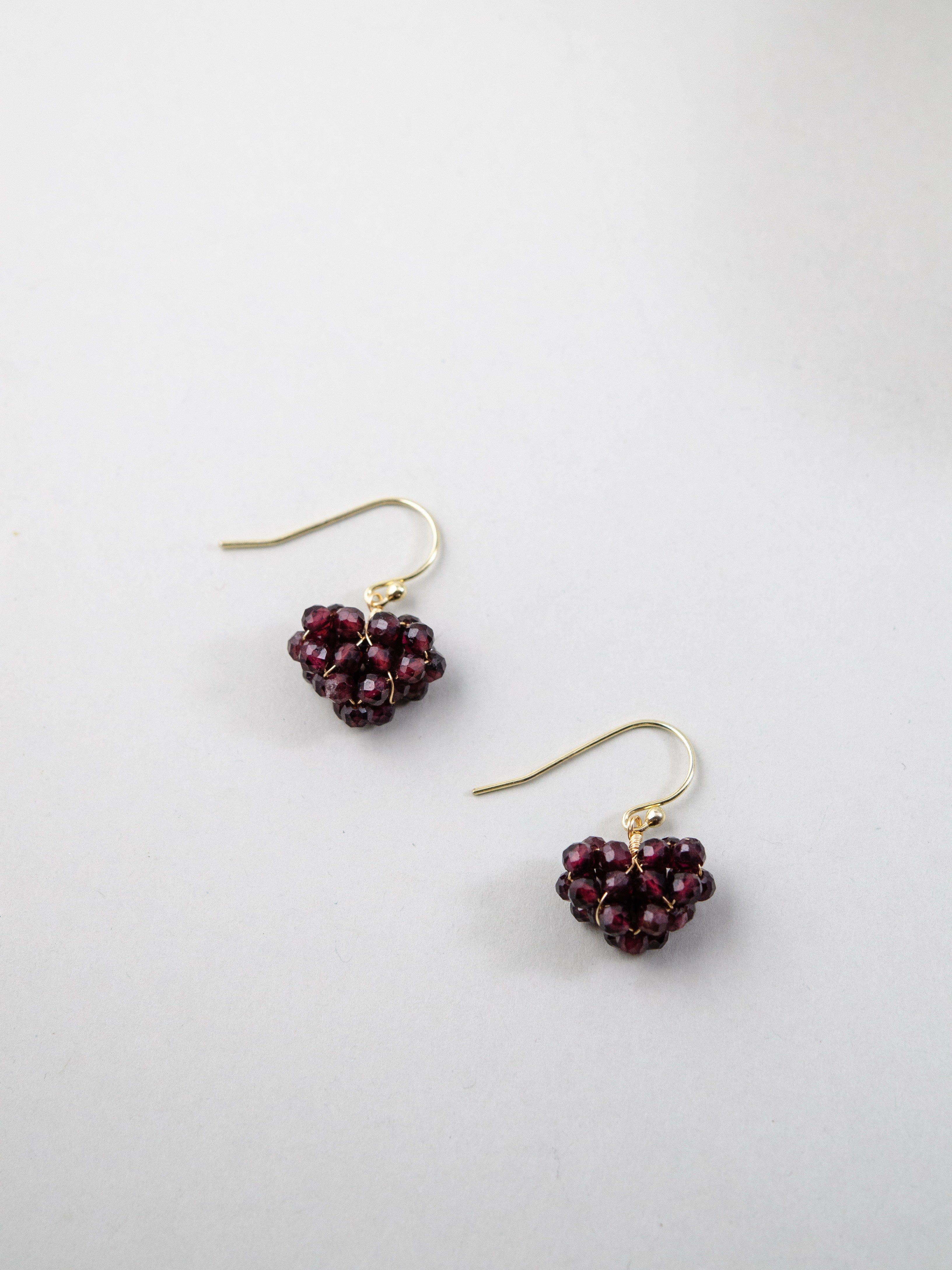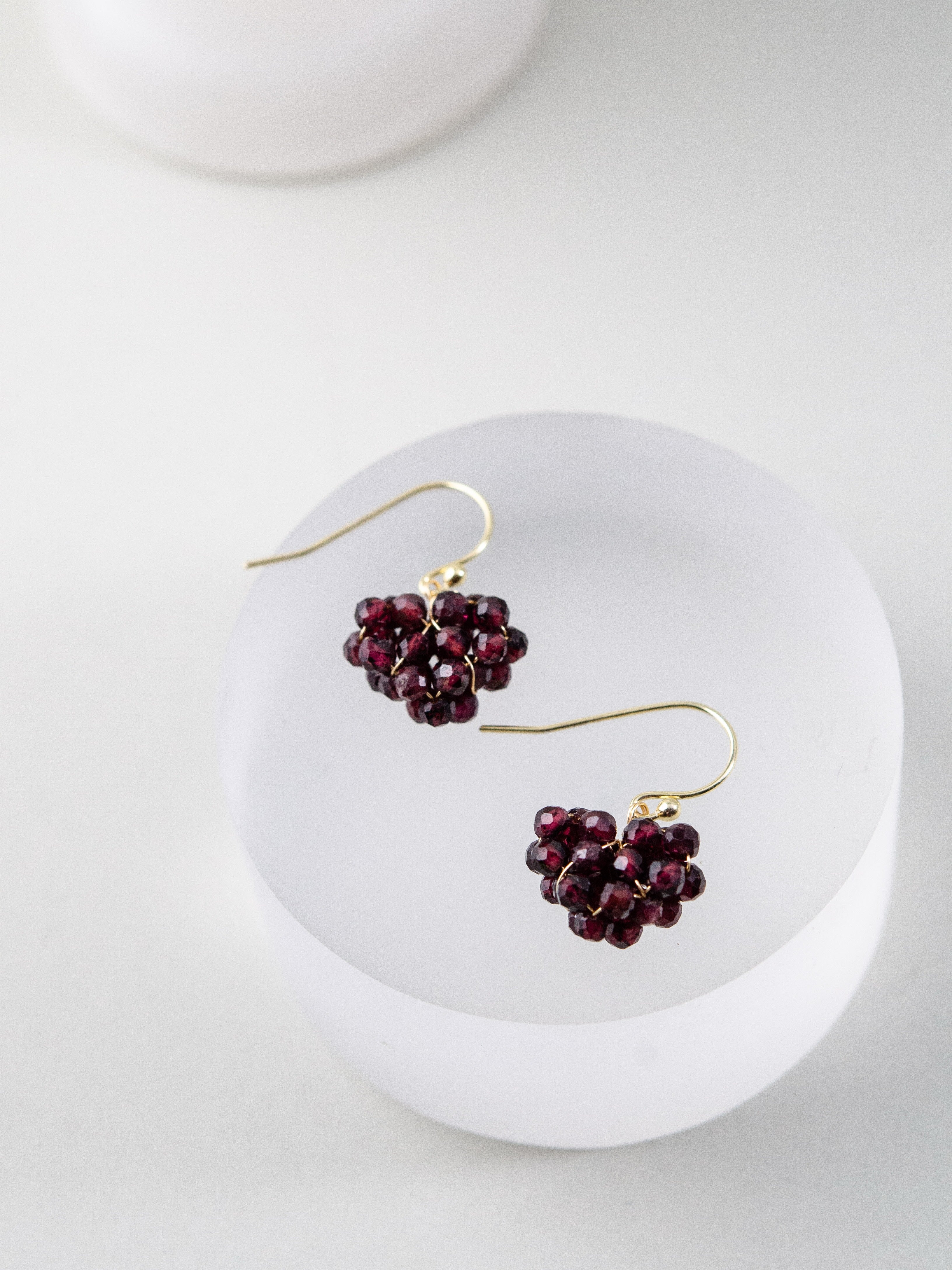 艶やかなガーネットを丁寧に束ね、ふんわりとしたハートのシルエットに仕上げたピアス。深みのある赤色ところんとした立体感が相まって、耳元に可愛らしさを添えます。シンプルなコーディネートにそっと華やぎをプラスしてくれる、毎日に寄り添うデザインです。
