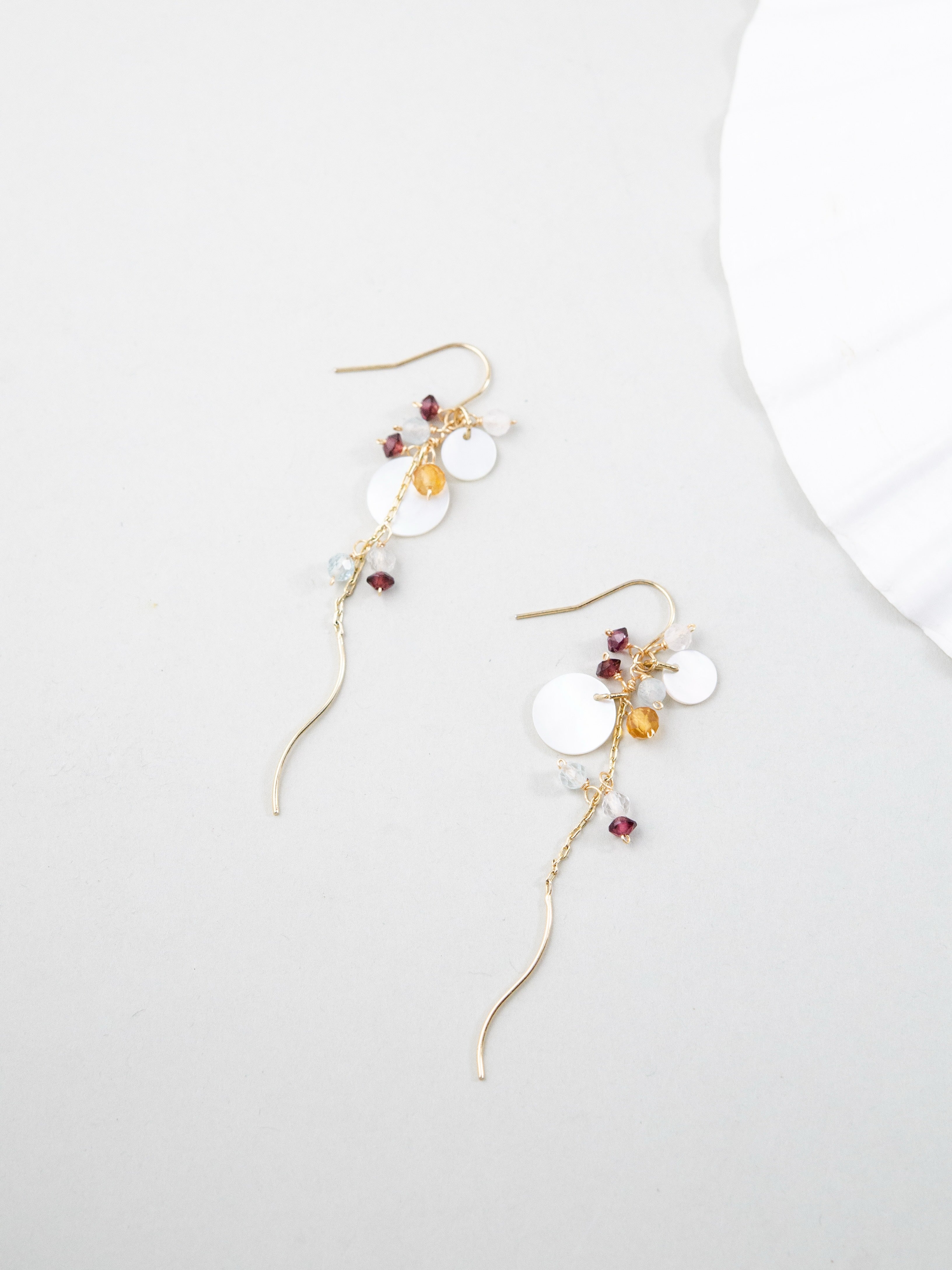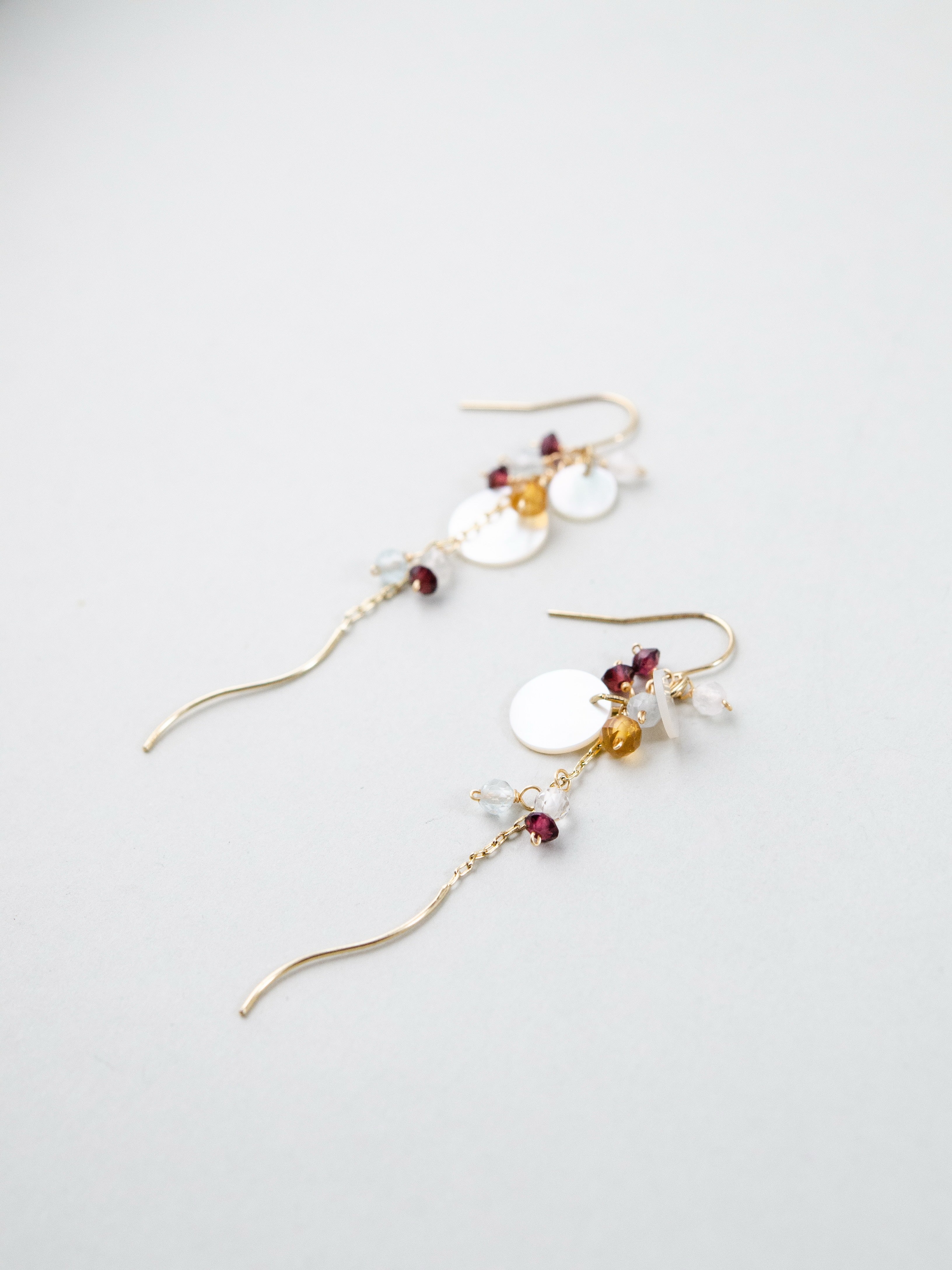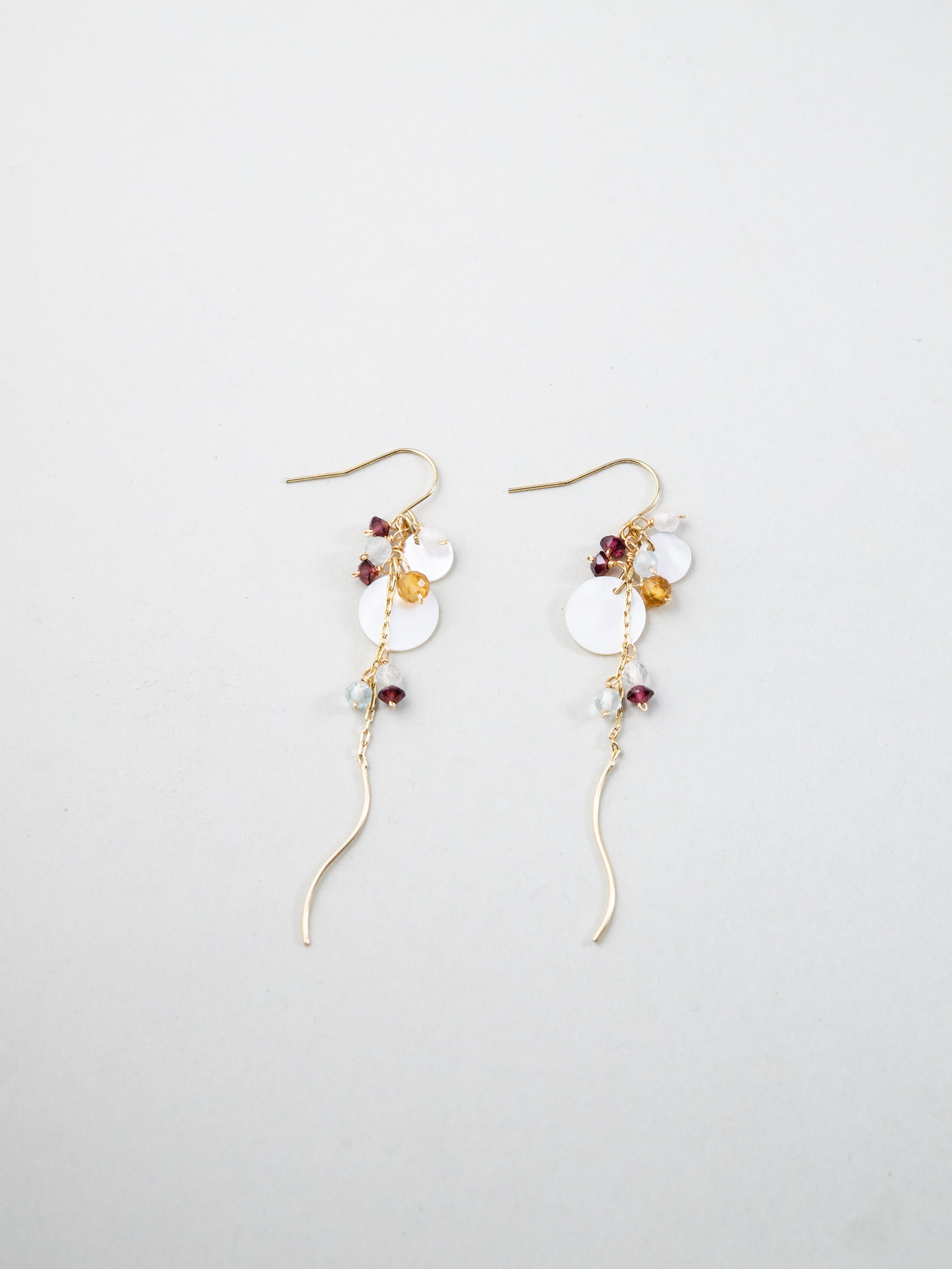繊細なチェーンに天然石とシェルを散りばめ、動くたびにふわりと揺れる透明感あふれるイヤリング。光をやさしく反射するラウンドシェルと、フローライトの淡い色合いが耳元に軽やかな彩りを添え、ガーネットの深い赤がアクセントとなってやわらかな中にも印象を残します。風に揺れる草花のように、日常に静かな美しさを添える一点です。