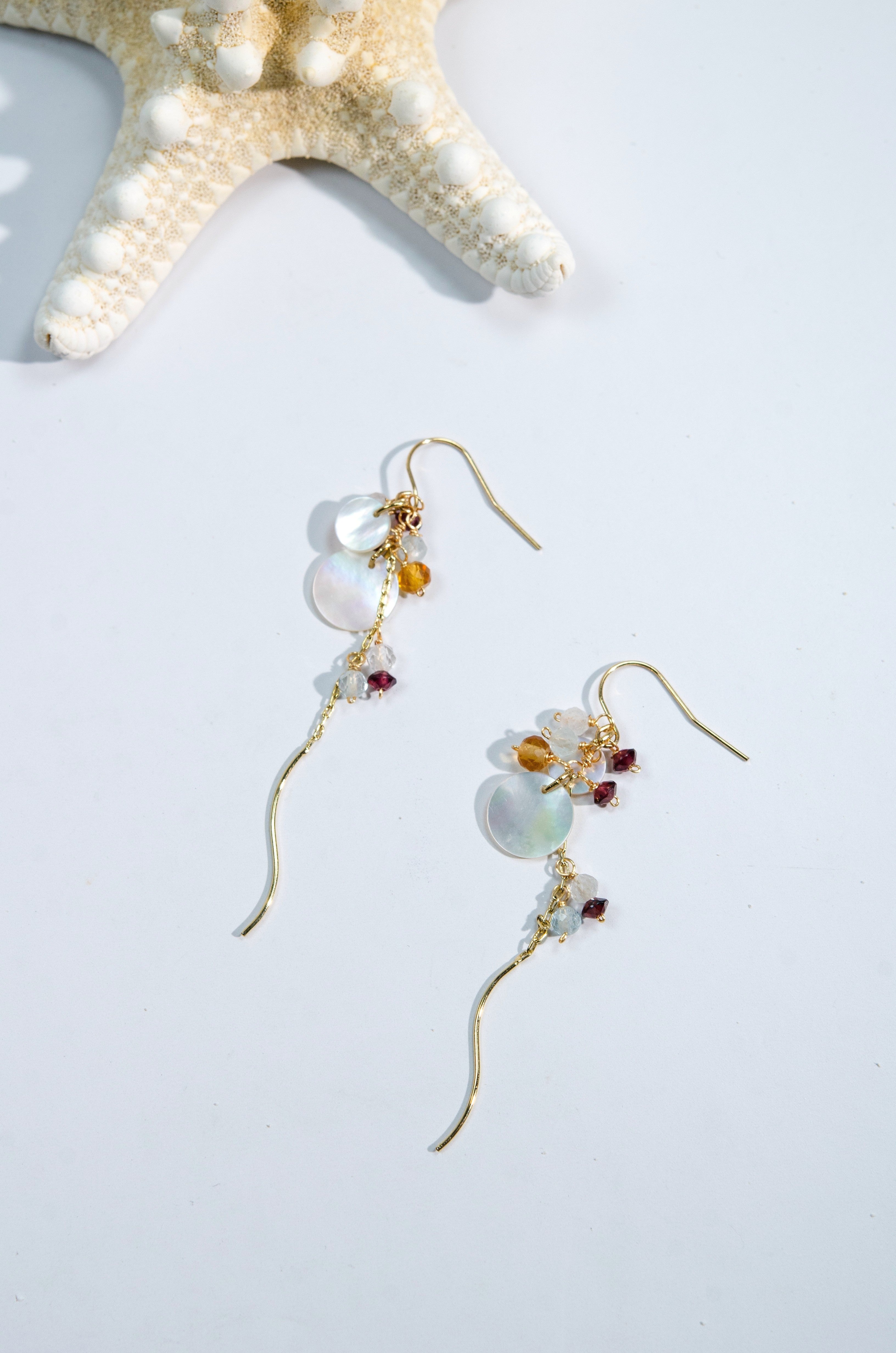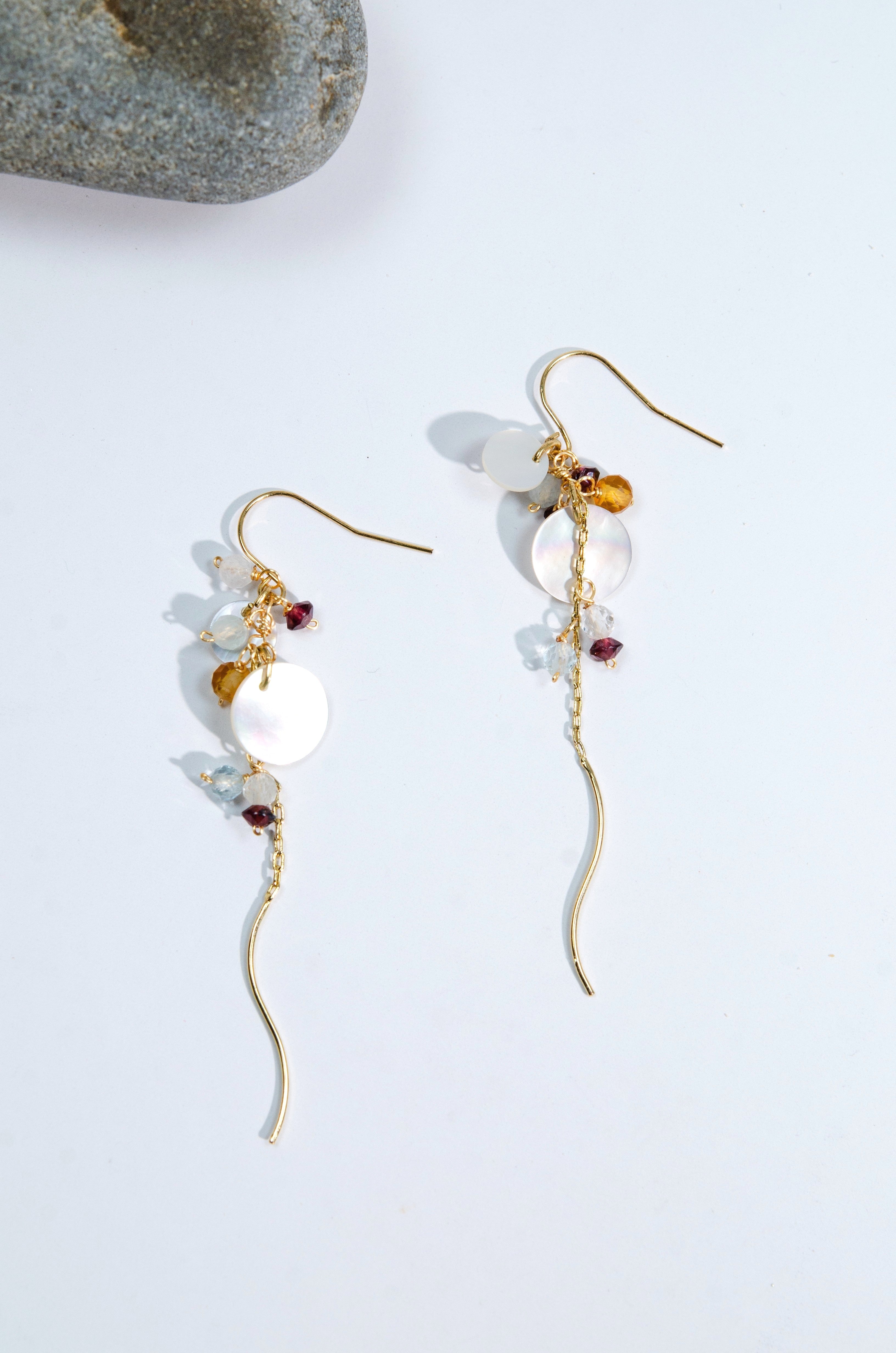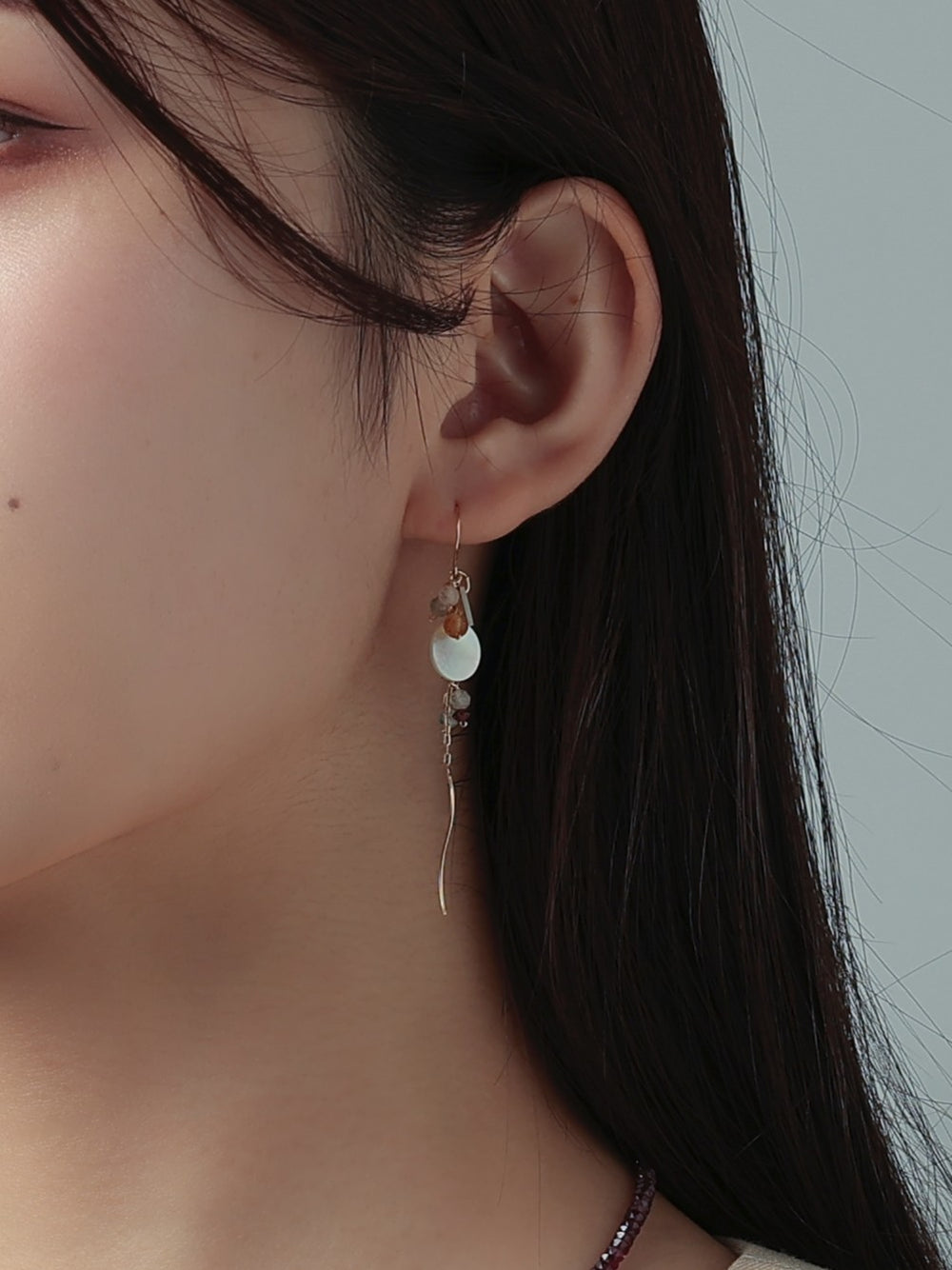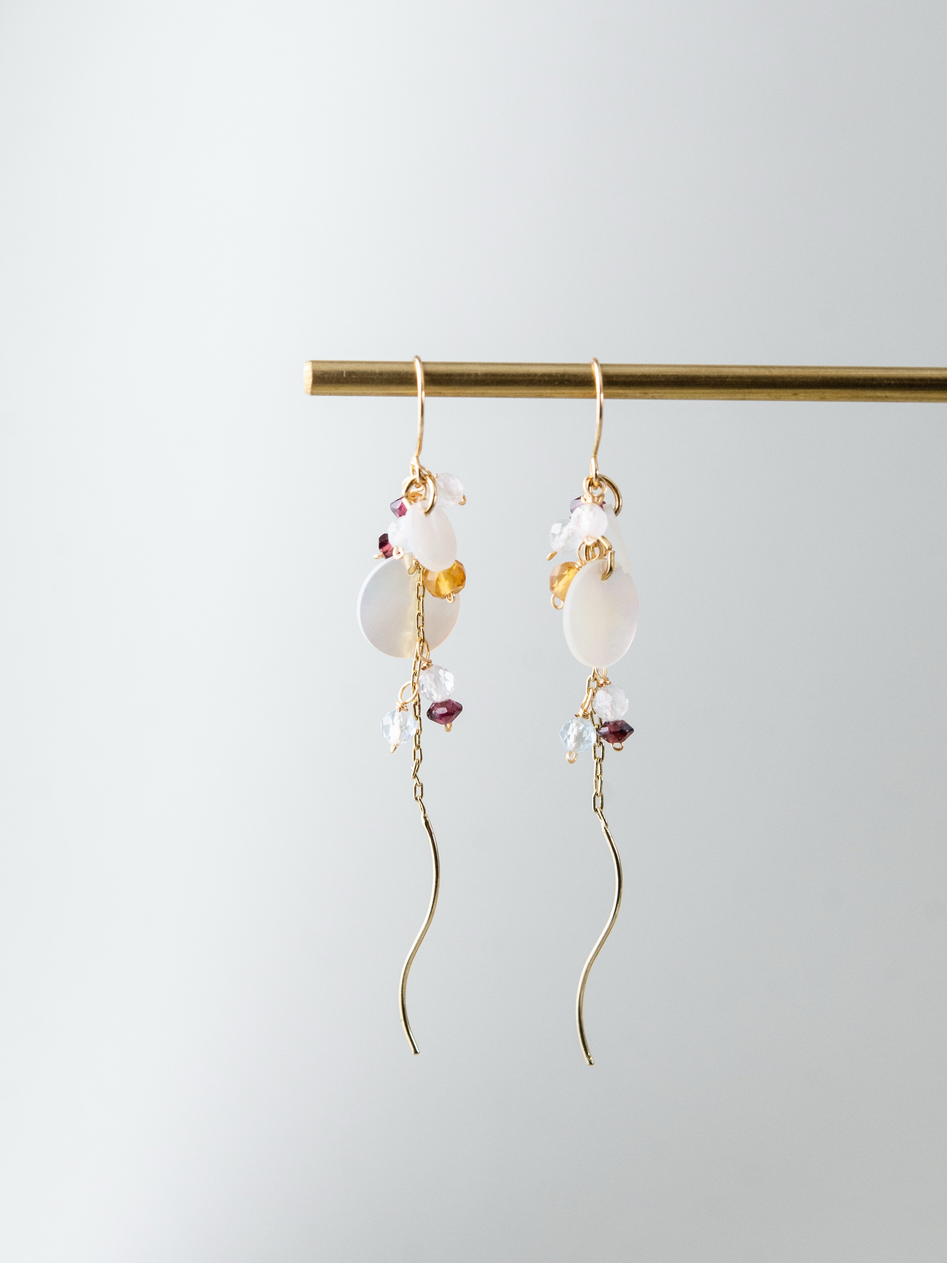 繊細なチェーンに天然石とシェルを散りばめ、動くたびにふわりと揺れる透明感あふれるイヤリング。光をやさしく反射するラウンドシェルと、フローライトの淡い色合いが耳元に軽やかな彩りを添え、ガーネットの深い赤がアクセントとなってやわらかな中にも印象を残します。風に揺れる草花のように、日常に静かな美しさを添える一点です。