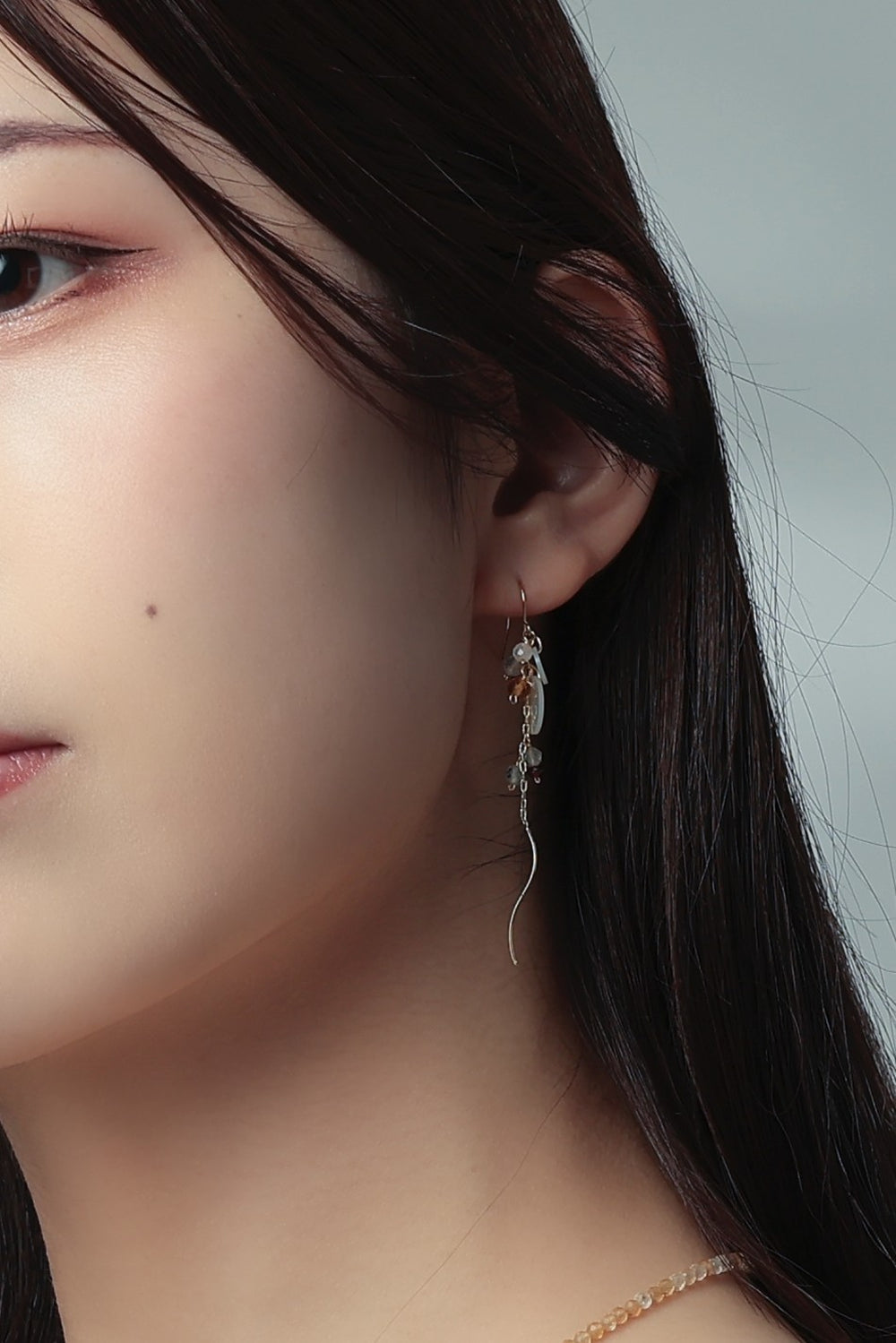 透明感のある上品な装いを演出したいシーンに最適。軽やかに揺れるチェーンと天然石の彩りで、ナチュラルで洗練された印象を好む方や、幻想的な雰囲気が好きな方にもおすすめ。
