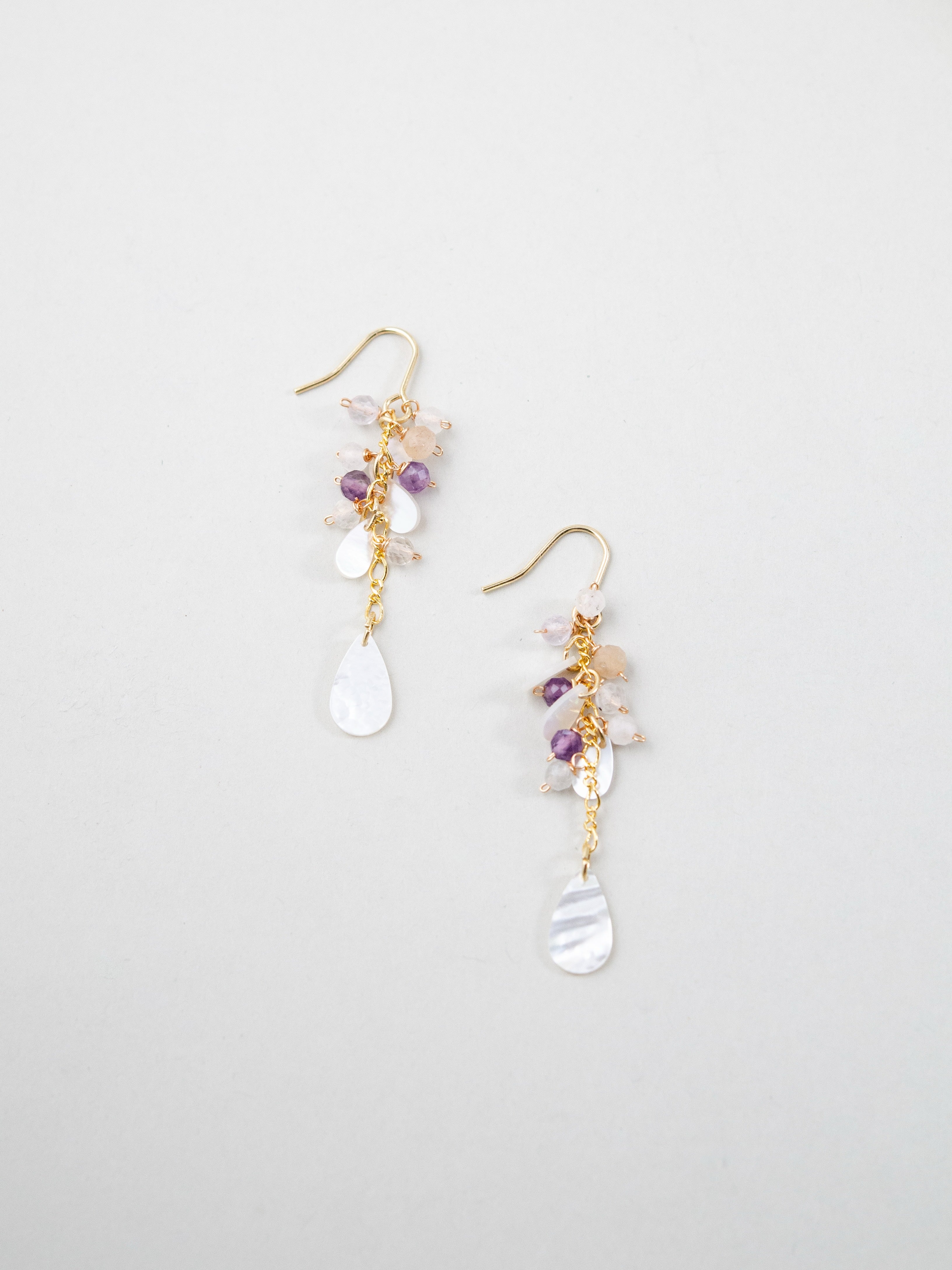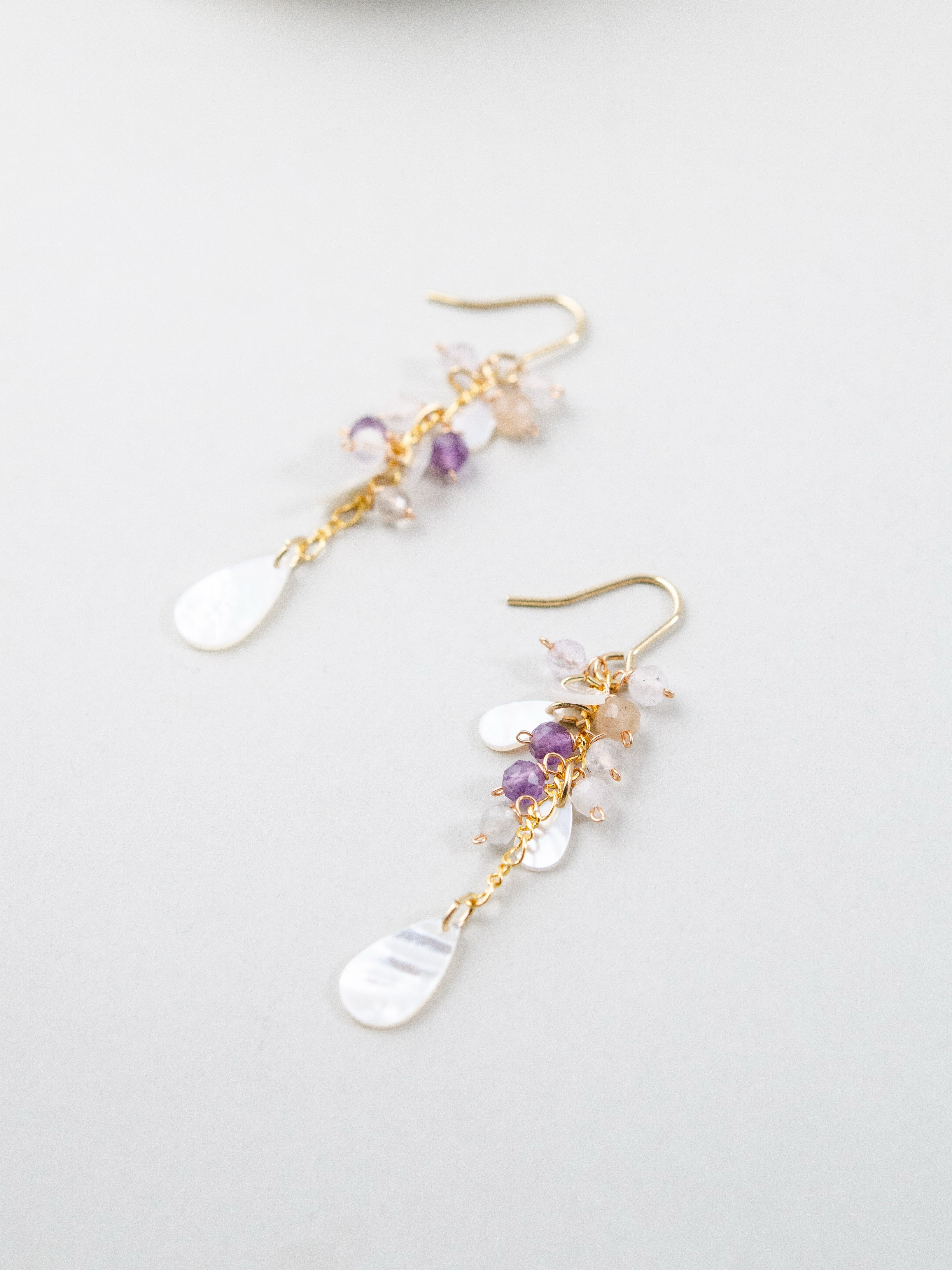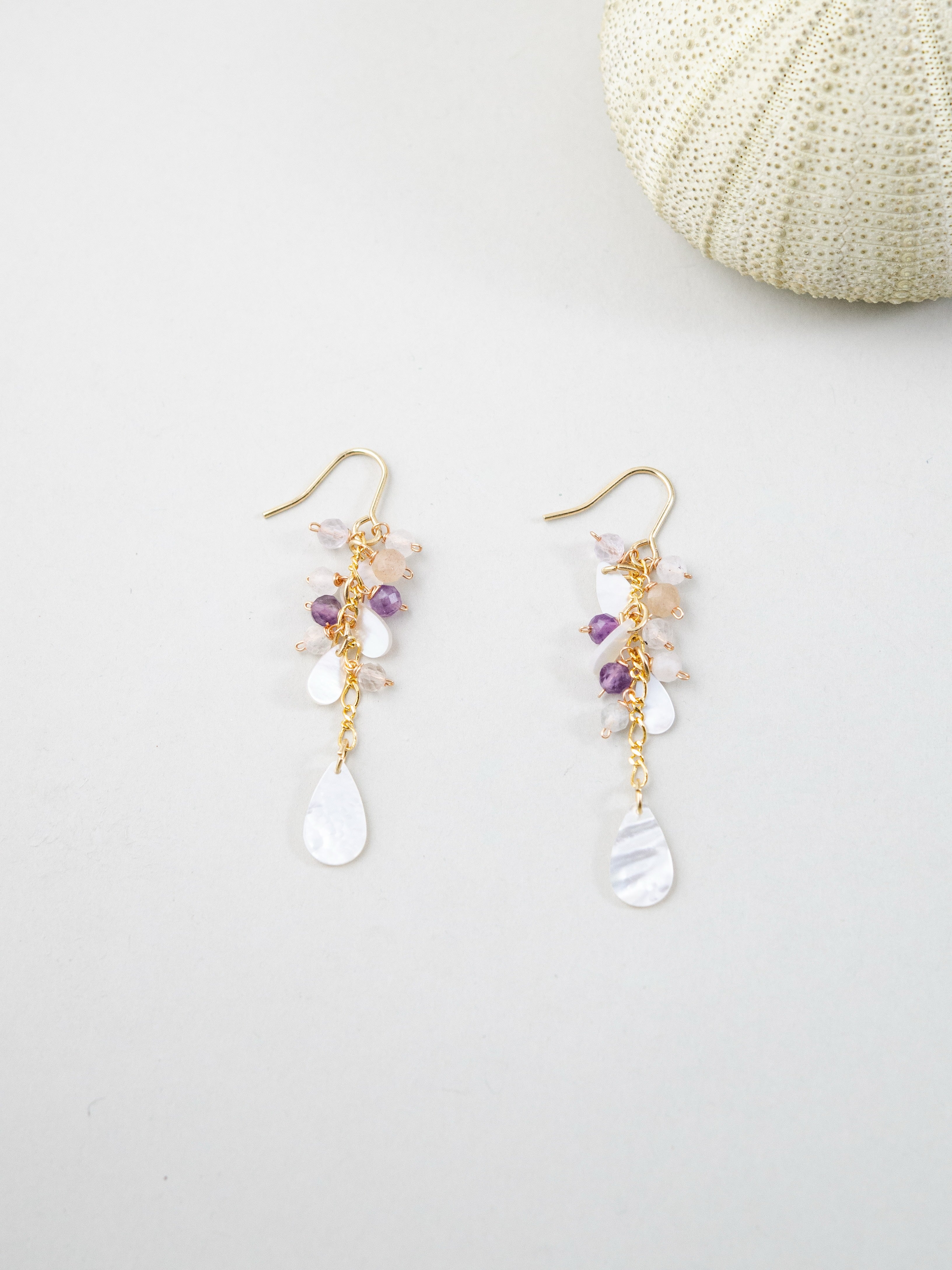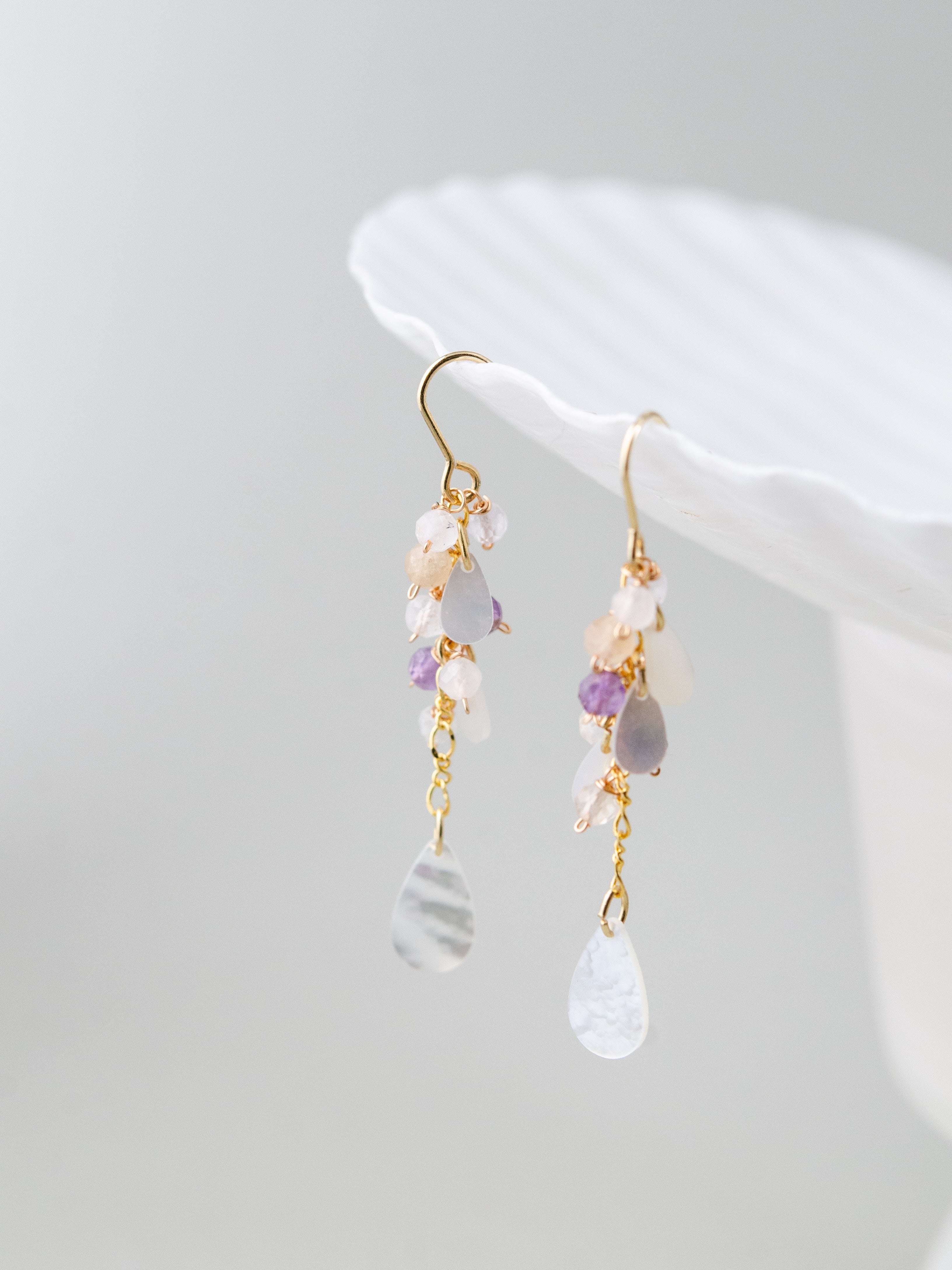 滴るようなシルエットのドロップ型シェルを主役に、淡く透けるフローライトと深みのあるアメジストを散りばめた幻想的なピアス。軽やかに揺れるたびに、天然石たちが光を受けて優しく煌めきます。水滴型のシェルの繊細な輝きと、フローライト・アメジストの淡い彩りが耳元に透明感と詩的な華やかさを添えます。