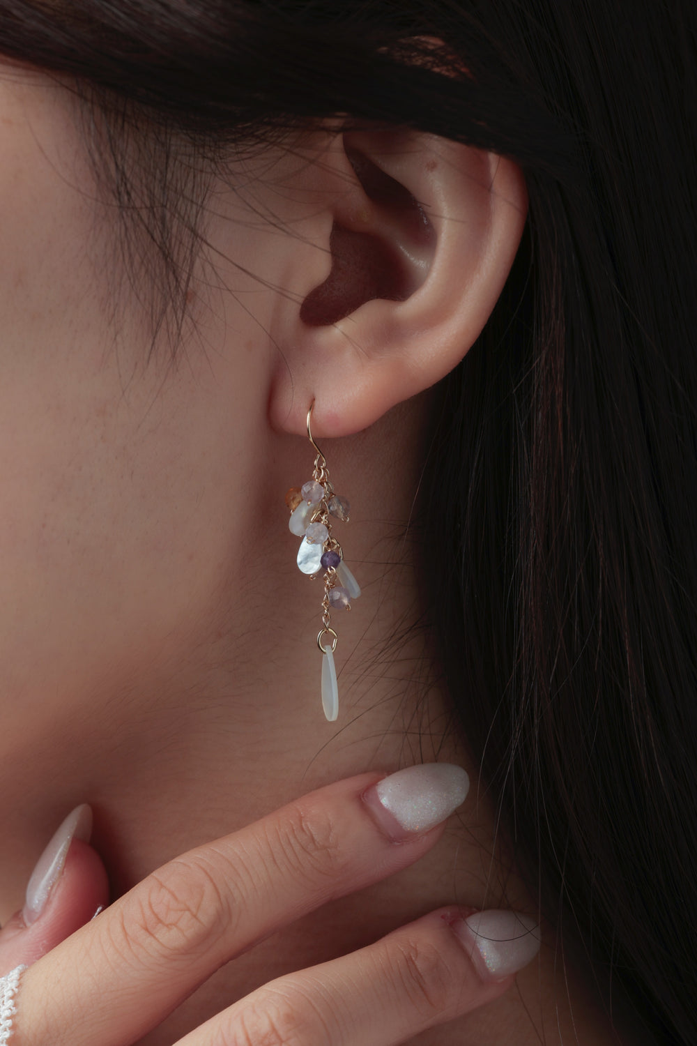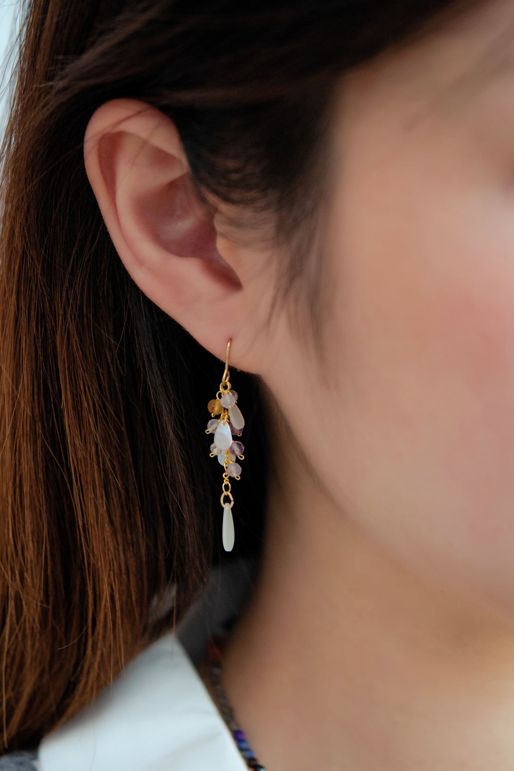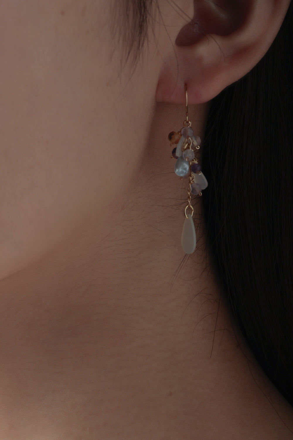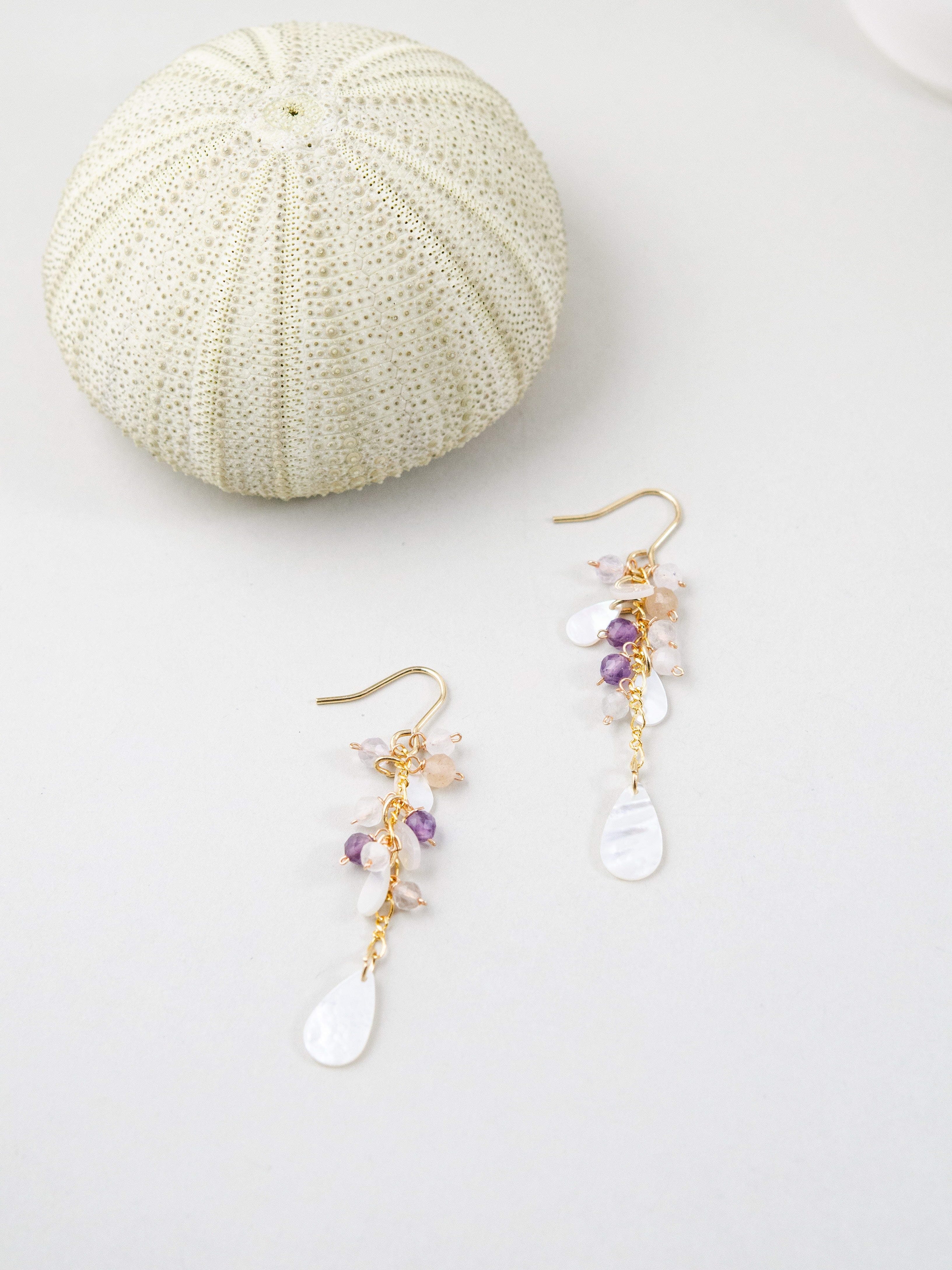 滴るようなシルエットのドロップ型シェルを主役に、淡く透けるフローライトと深みのあるアメジストを散りばめた幻想的なピアス。軽やかに揺れるたびに、天然石たちが光を受けて優しく煌めきます。水滴型のシェルの繊細な輝きと、フローライト・アメジストの淡い彩りが耳元に透明感と詩的な華やかさを添えます。